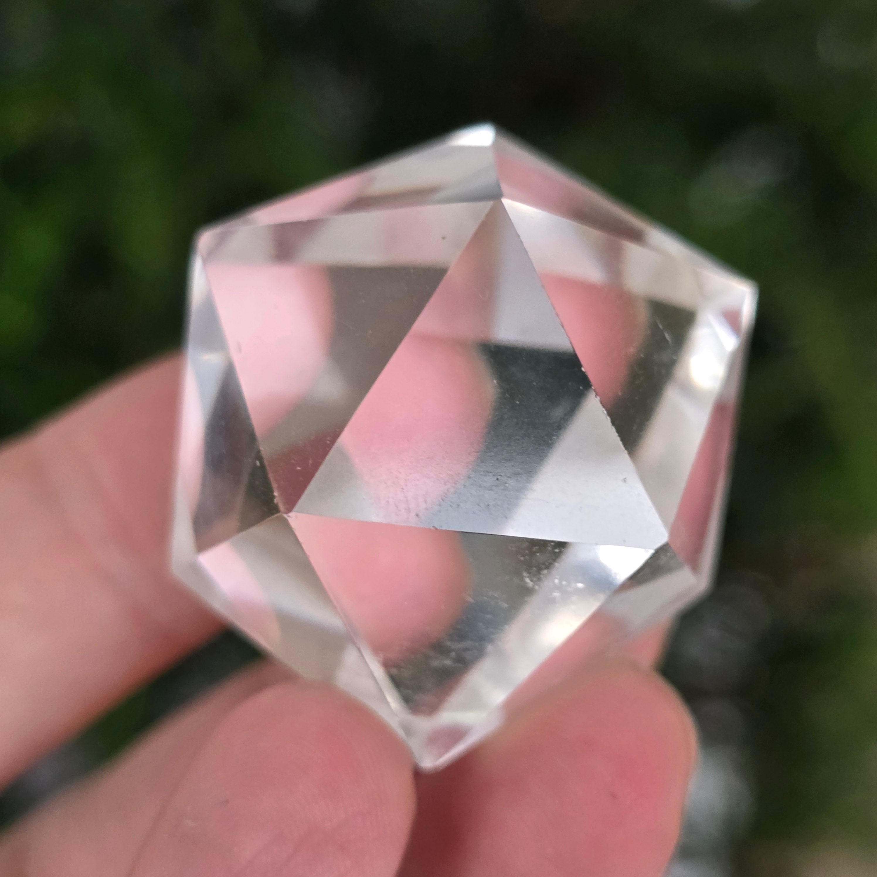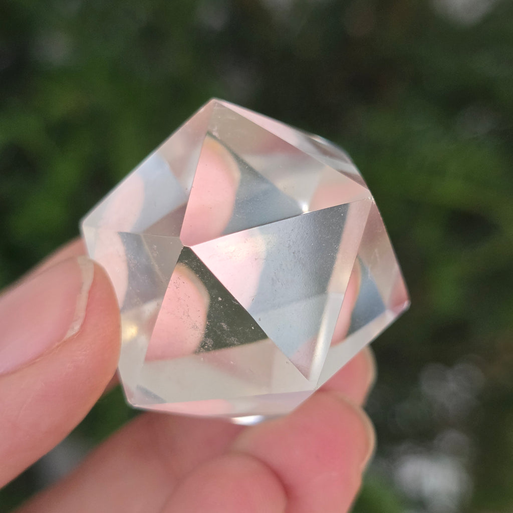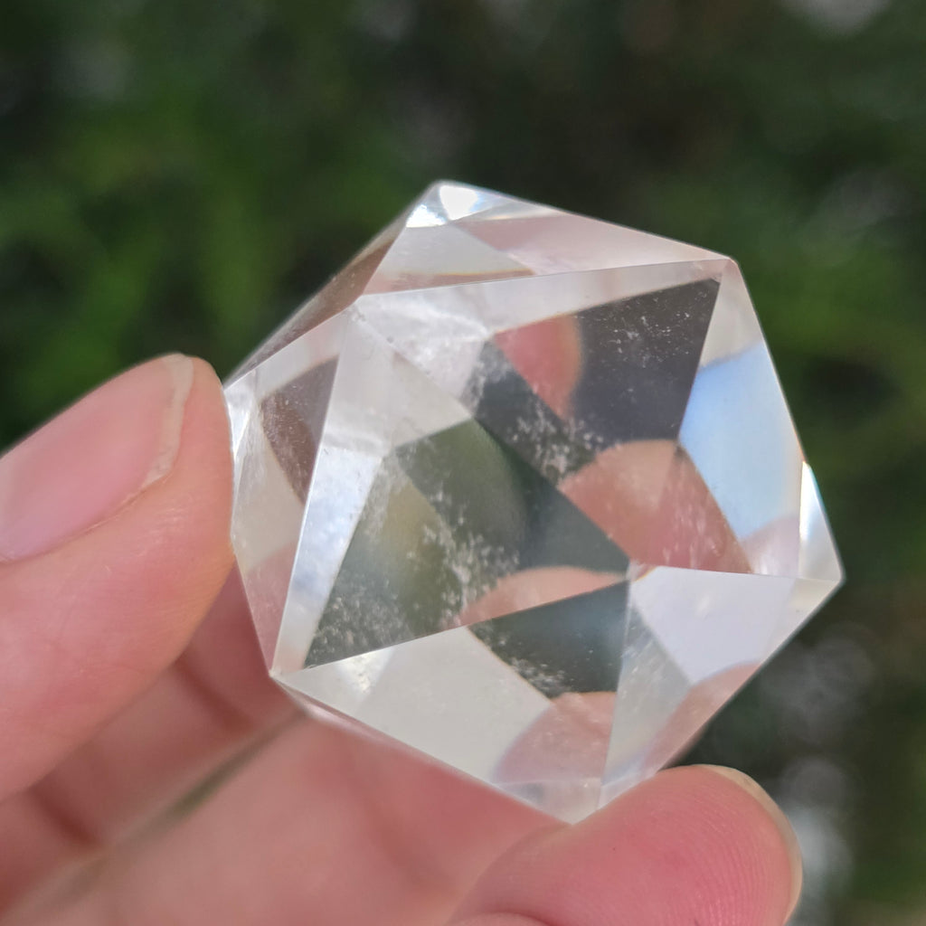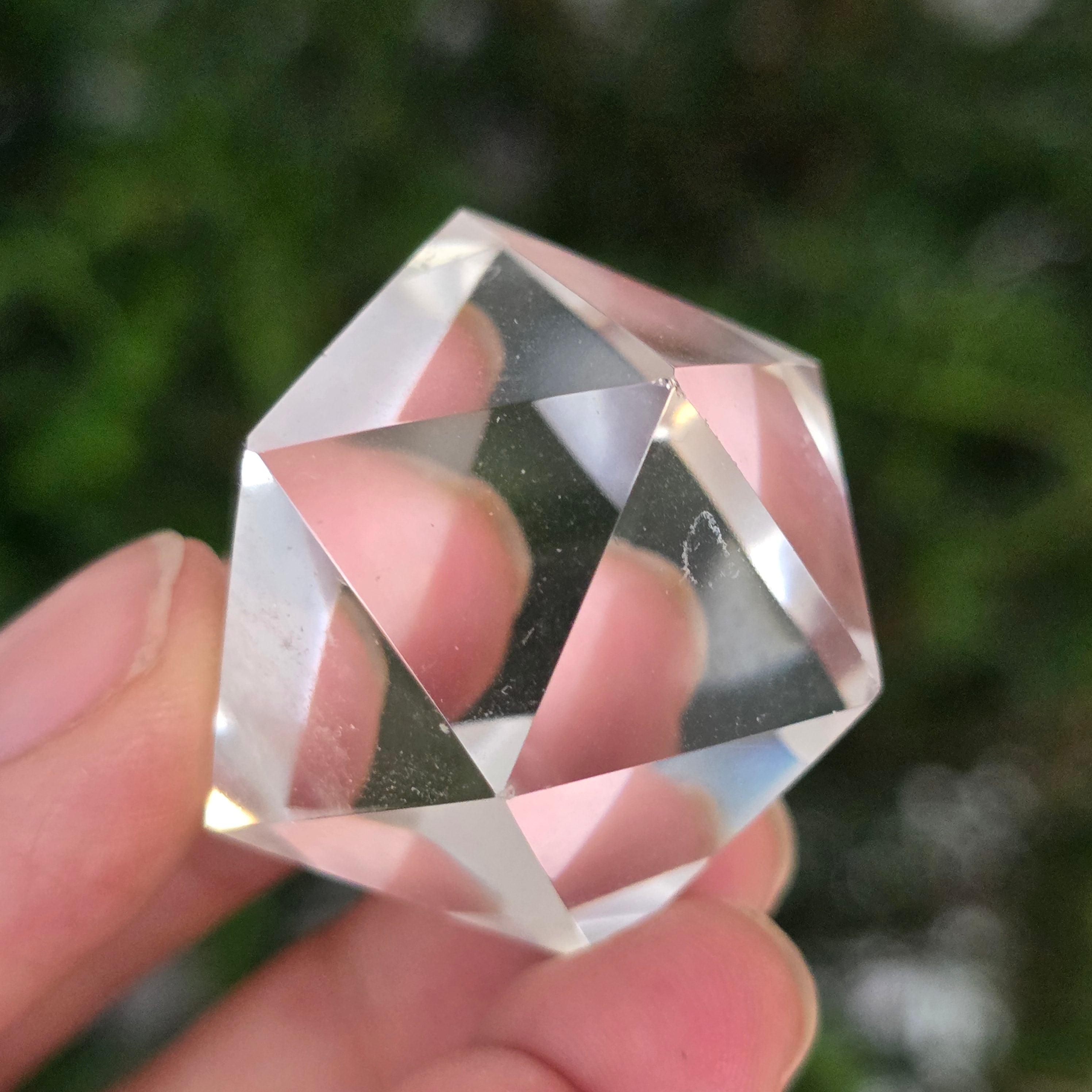 Farbloser Quarz-Ikosaeder (Bergkristall), präzisionspoliert in Form eines platonischen Körpers mit 20 gleichseitigen dreieckigen Flächen.
