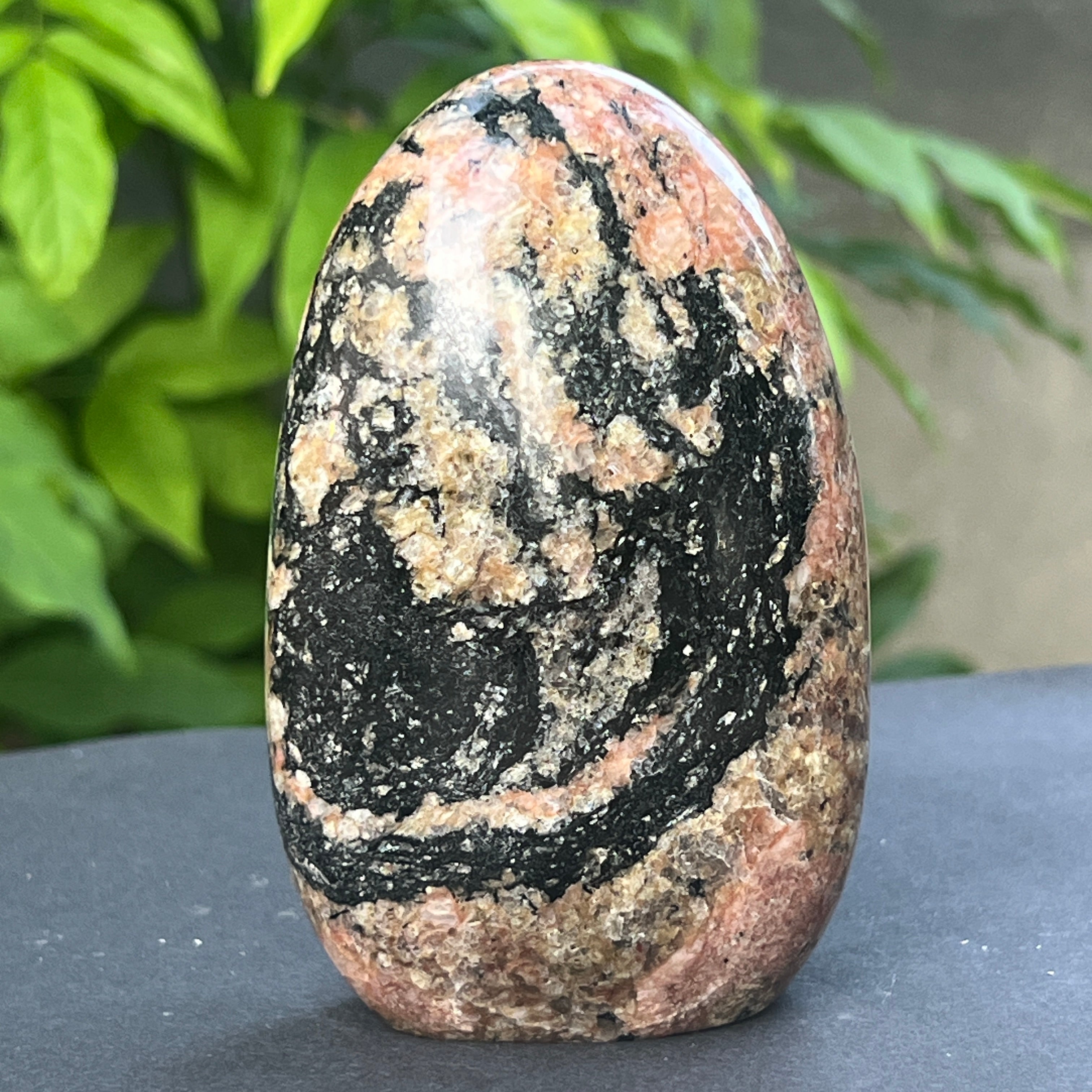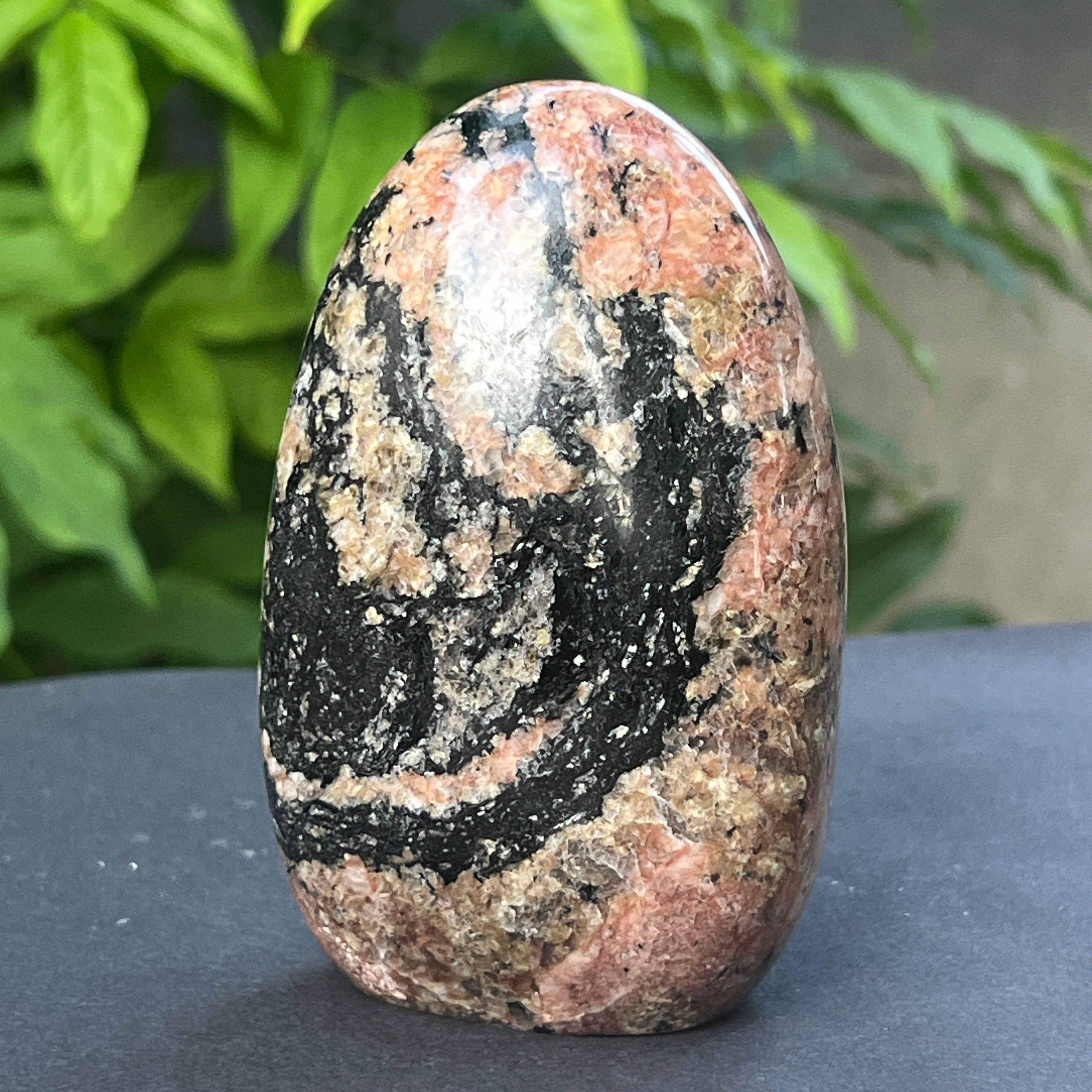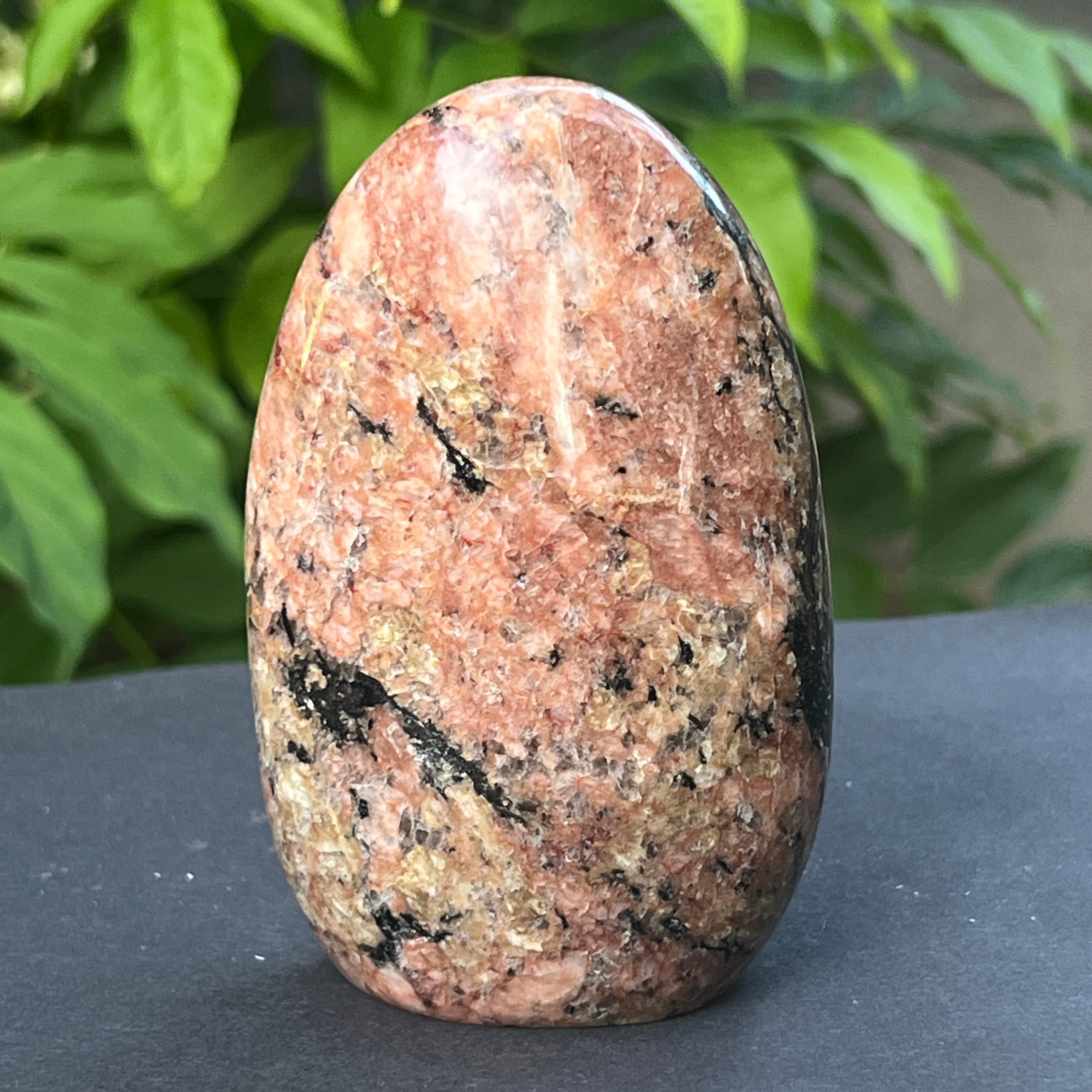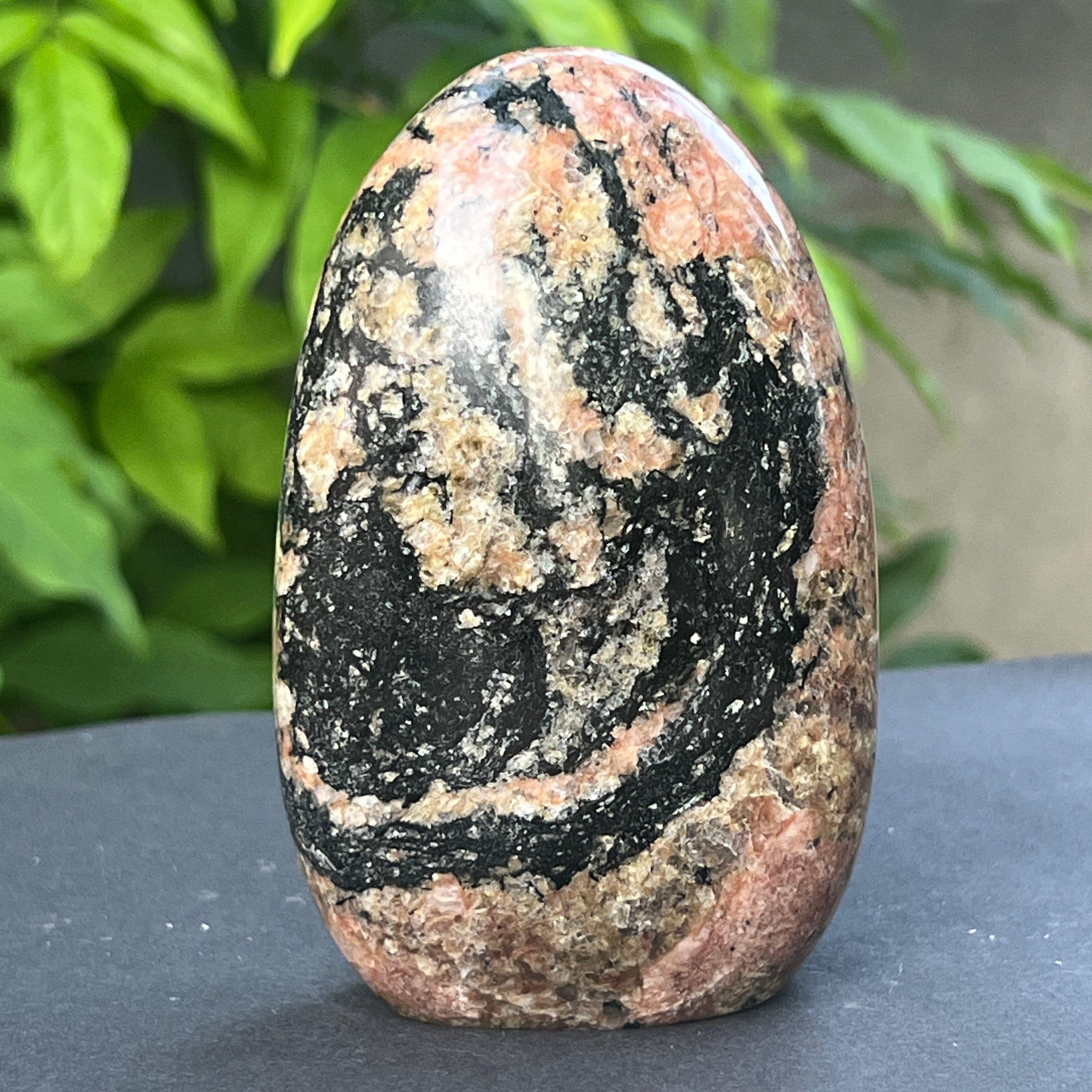 Dieser bemerkenswerte Naturstein kombiniert die Stärke und Klarheit des Feldspats mit der lebendigen und intensiv gefärbten Energie des Turmalins. Feldspat bietet mit seinen warmen, oft beige, weißen oder rosafarbenen Nuancen einen ruhigen, seidigen und stabilen Hintergrund. Im Gegensatz dazu erscheint Turmalin in Form von schwarzen oder mehrfarbigen Massenkristallen - manchmal zart, manchmal perfekt umrissen, als Zeichen des inneren Feuer der Erde.