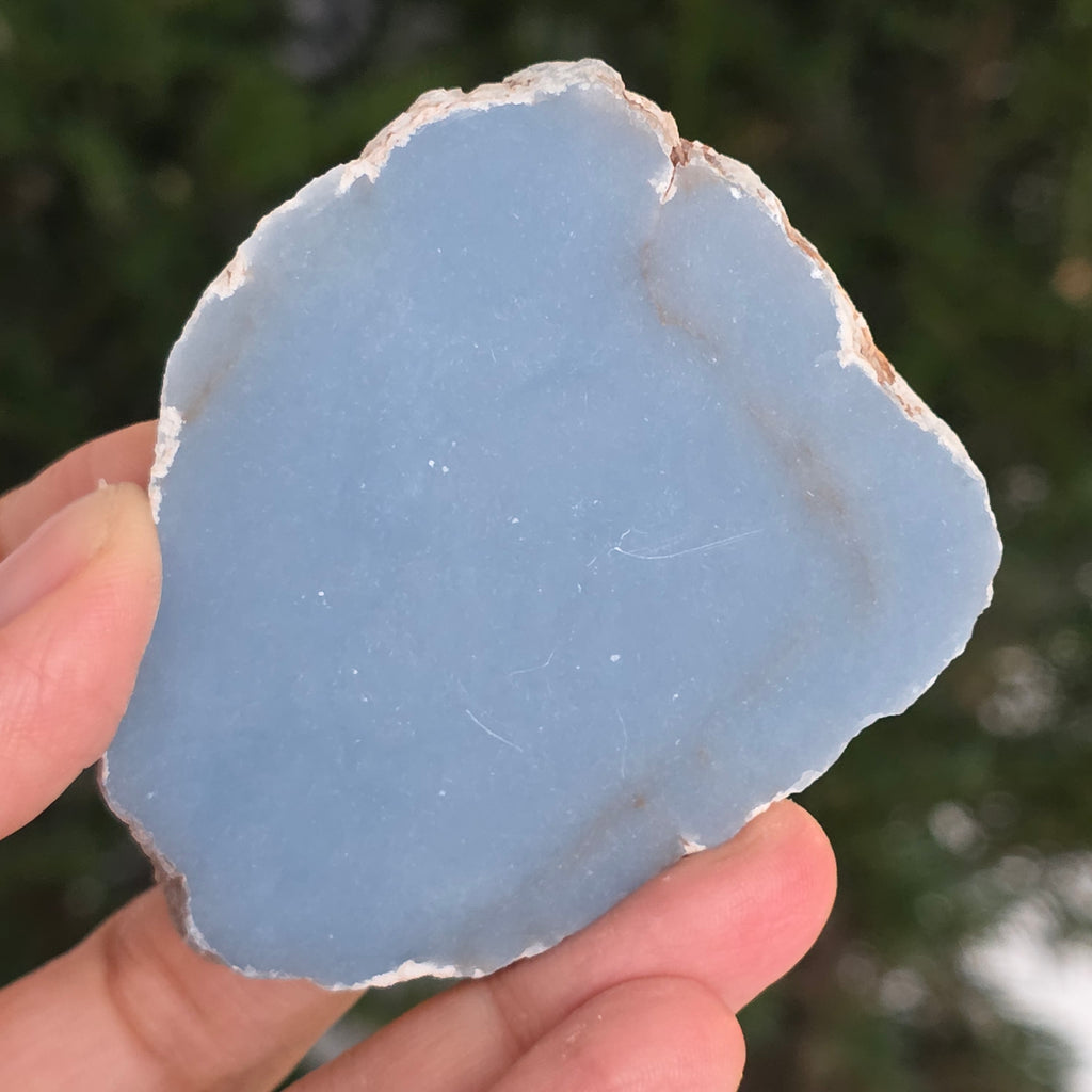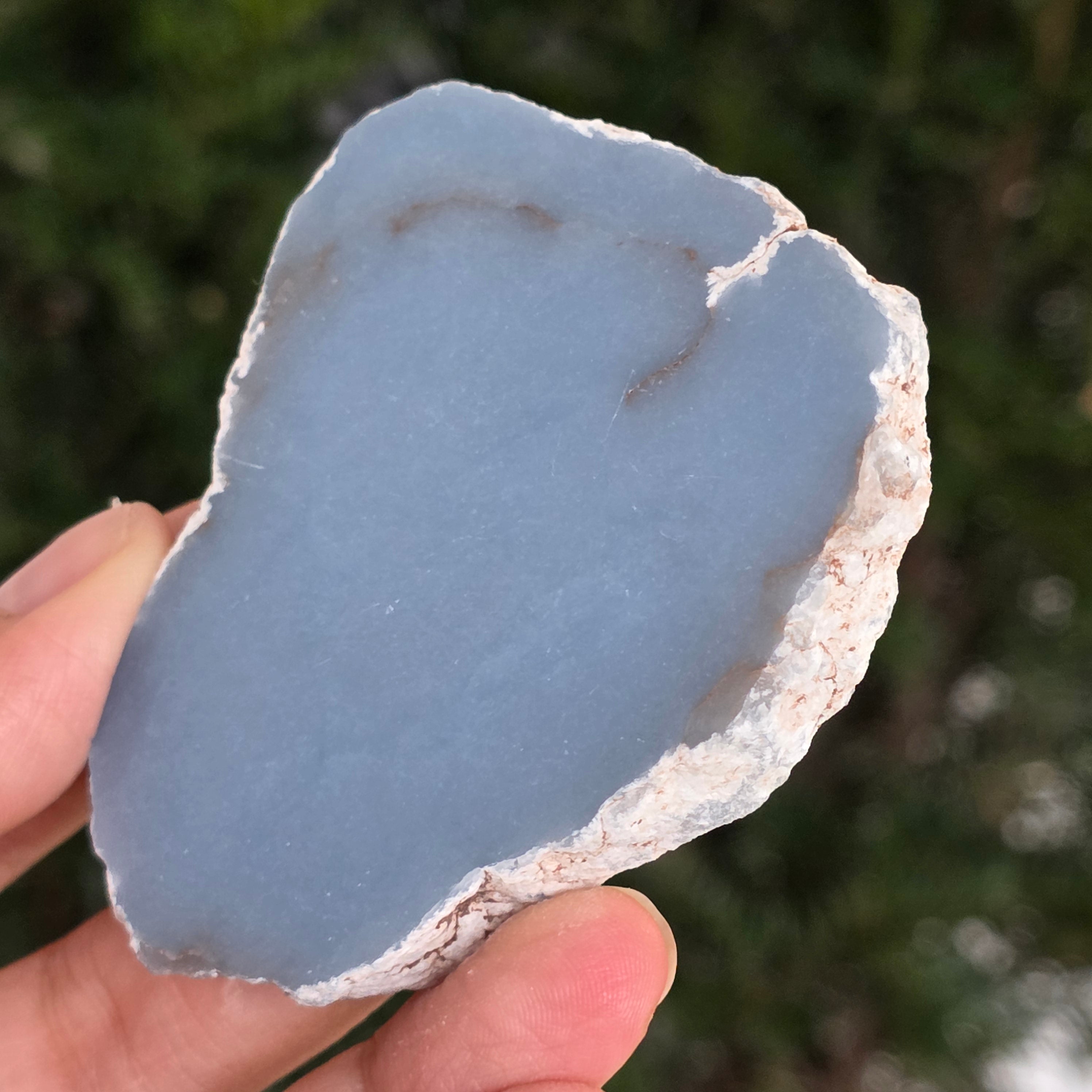 O piesă rară, ce pare desprinsă din seninul cerului. Această felie de angelit natural, dezvăluie un albastru delicat, lăptos, străbătut de nuanțe fine de gri și alb sidefat. Suprafața netedă și textura sa mată emană liniște și puritate – o bijuterie minerală a calmului și a echilibrului interior.