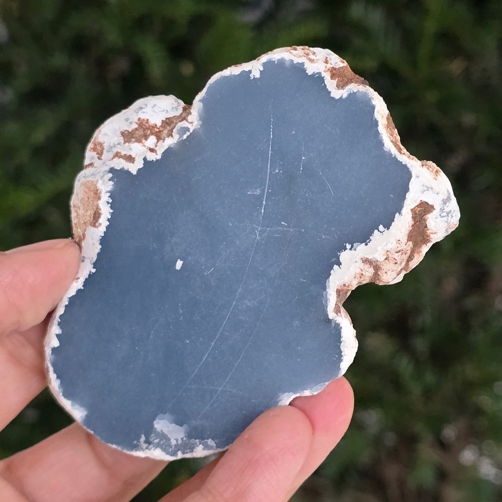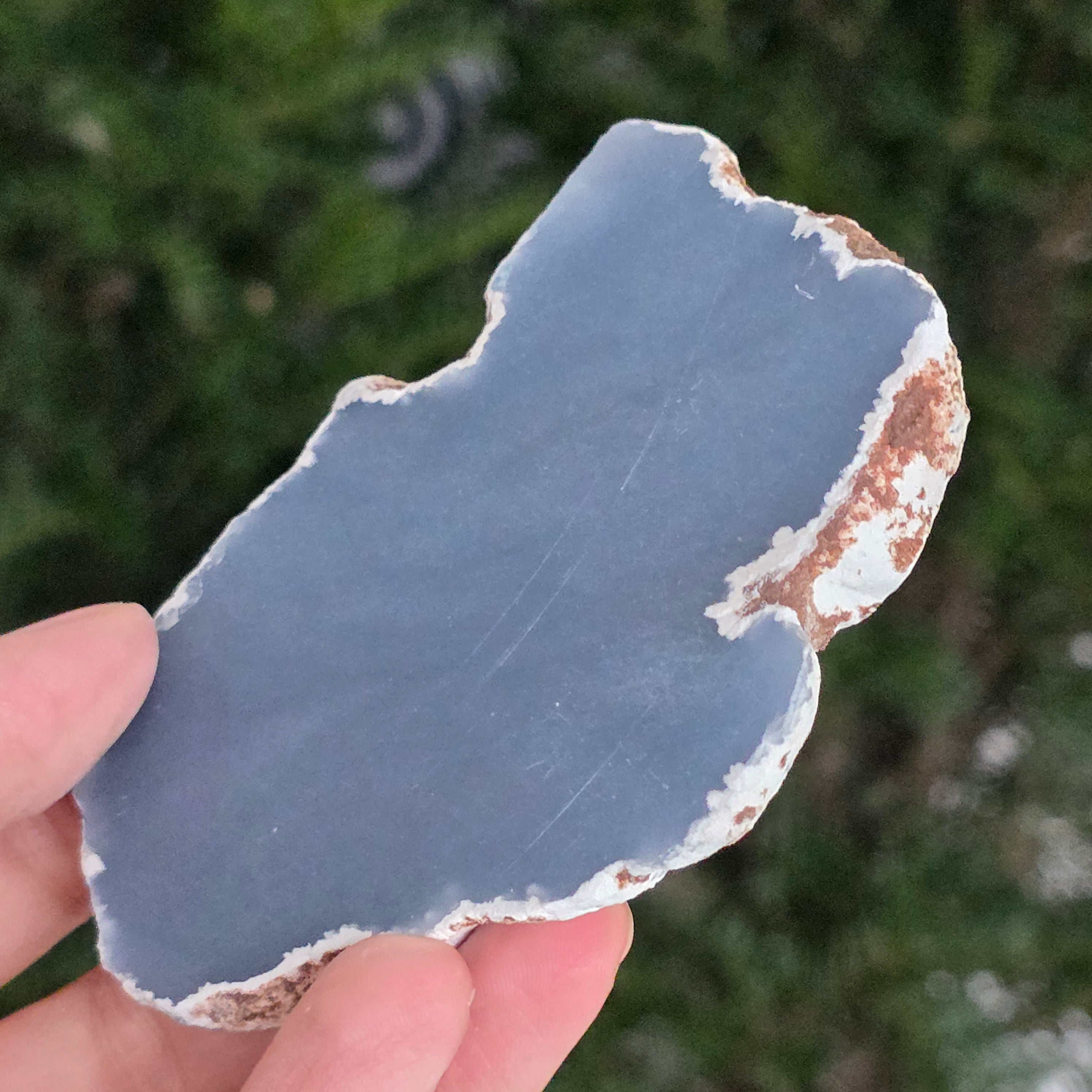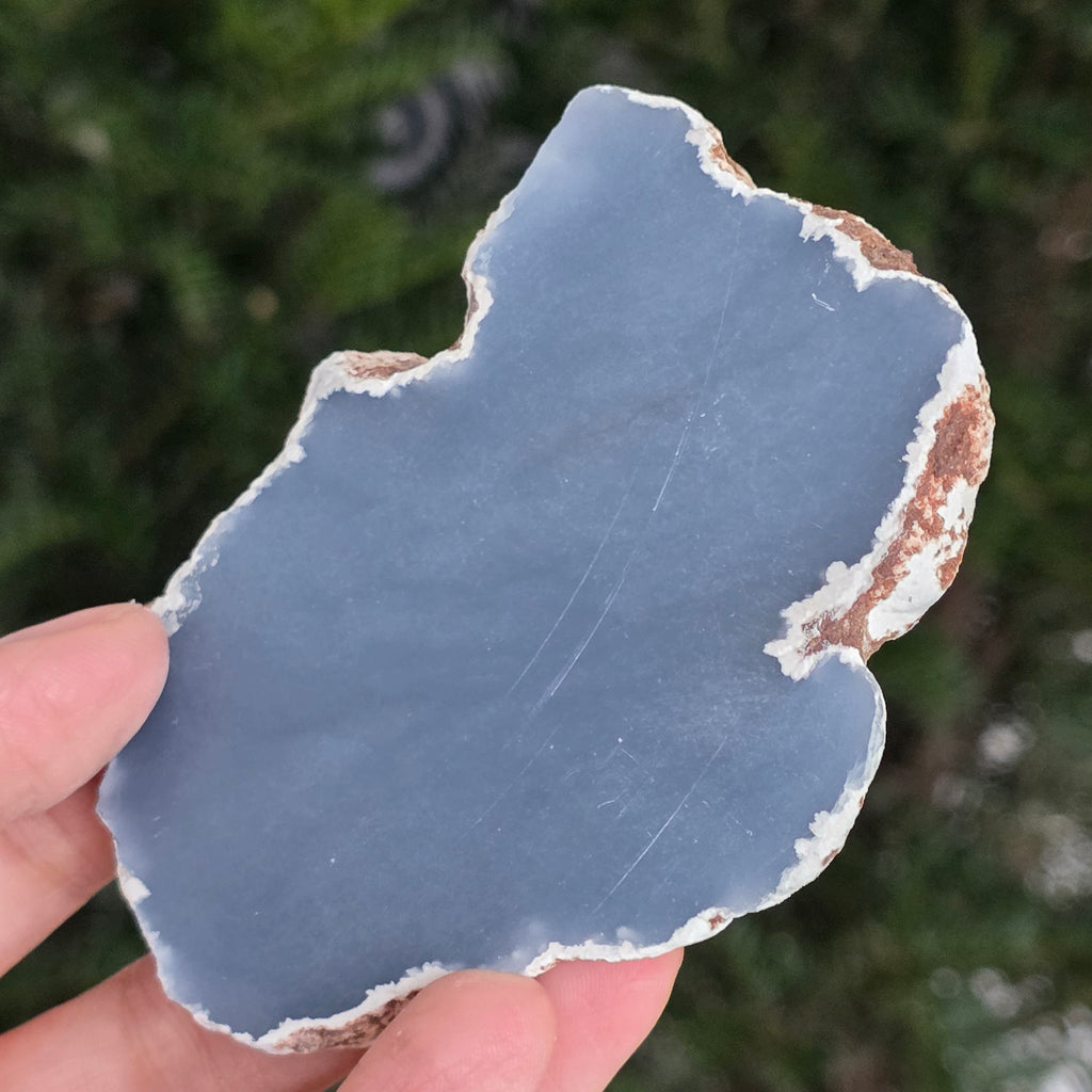 O piesă rară, ce pare desprinsă din seninul cerului. Această felie de angelit natural, dezvăluie un albastru delicat, lăptos, străbătut de nuanțe fine de gri și alb sidefat. Suprafața netedă și textura sa mată emană liniște și puritate – o bijuterie minerală a calmului și a echilibrului interior.