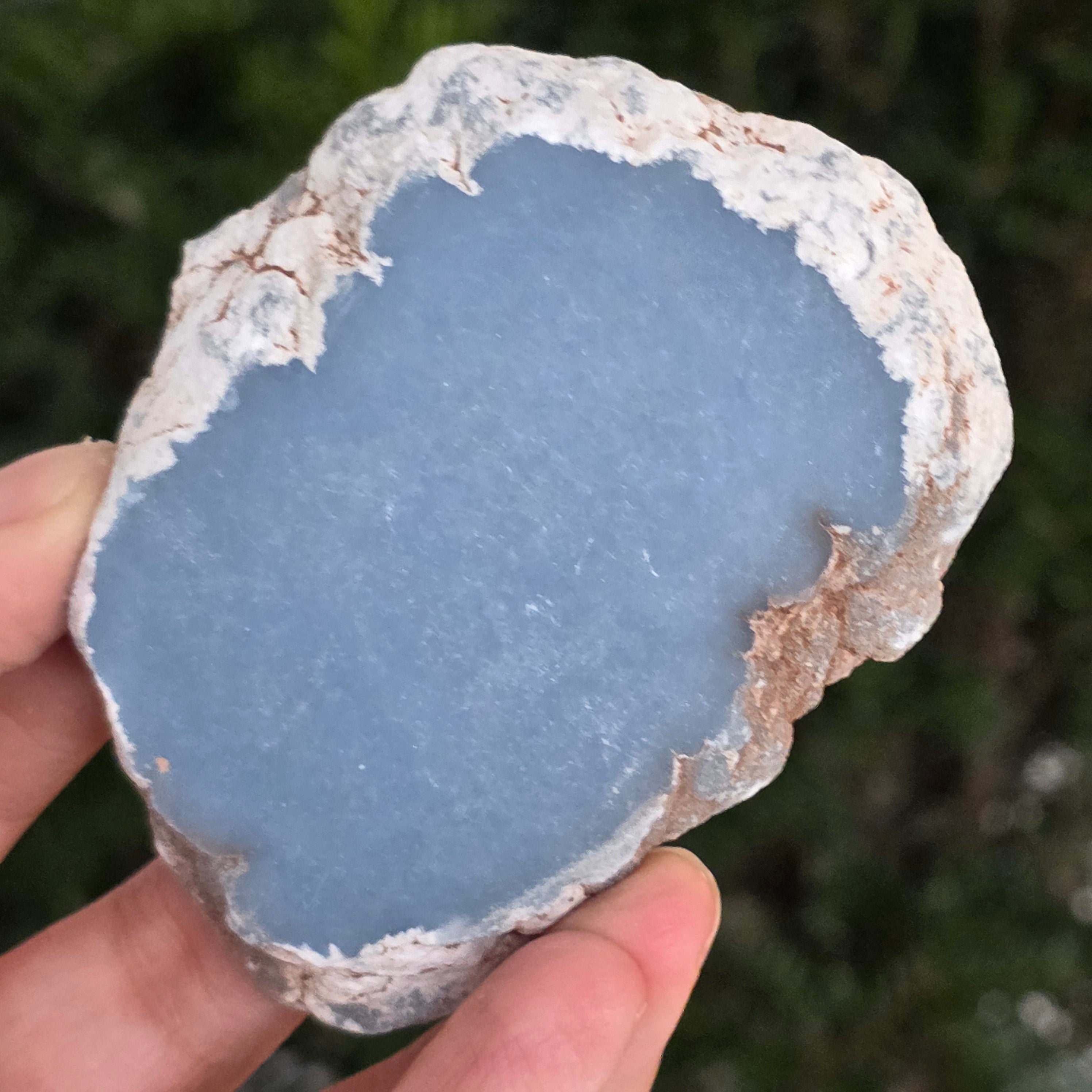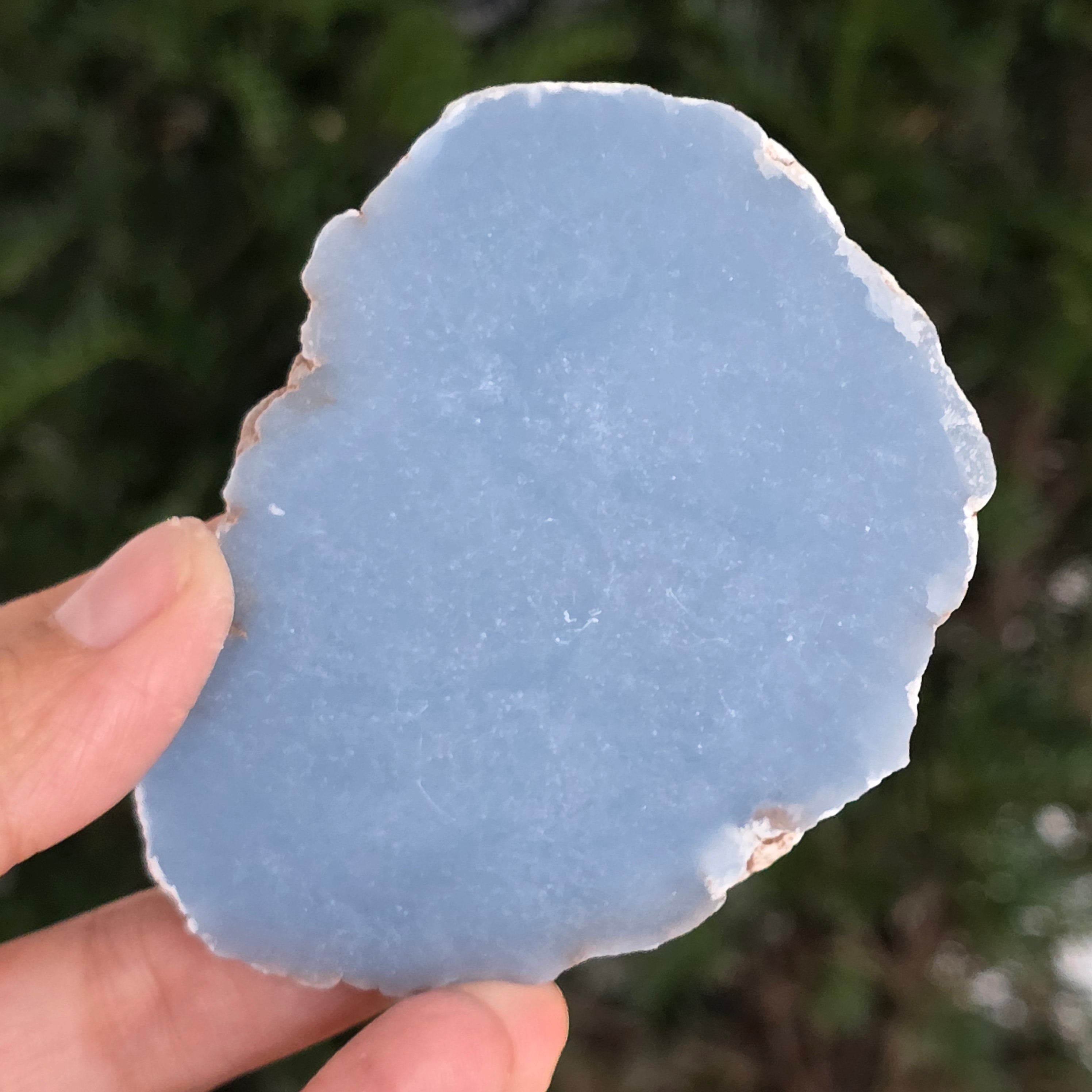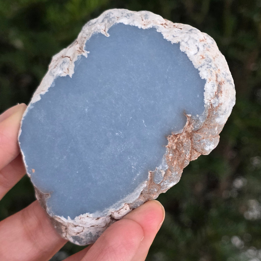 O piesă rară, ce pare desprinsă din seninul cerului. Această felie de angelit natural, dezvăluie un albastru delicat, lăptos, străbătut de nuanțe fine de gri și alb sidefat. Suprafața netedă și textura sa mată emană liniște și puritate – o bijuterie minerală a calmului și a echilibrului interior.