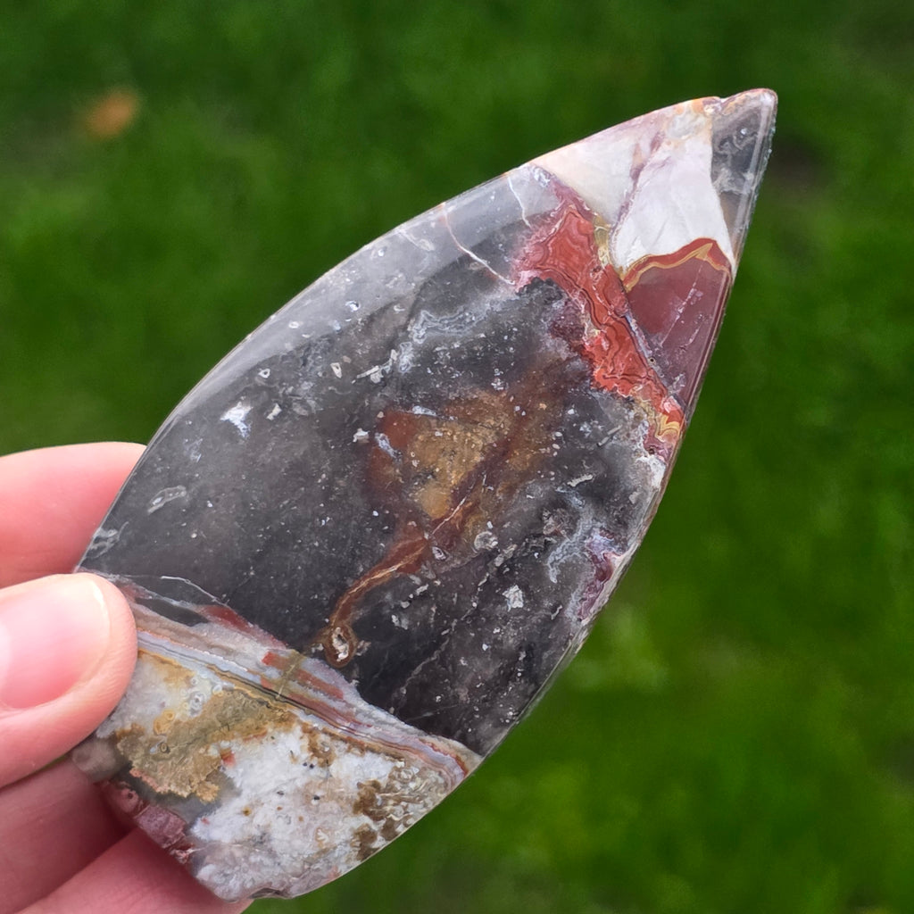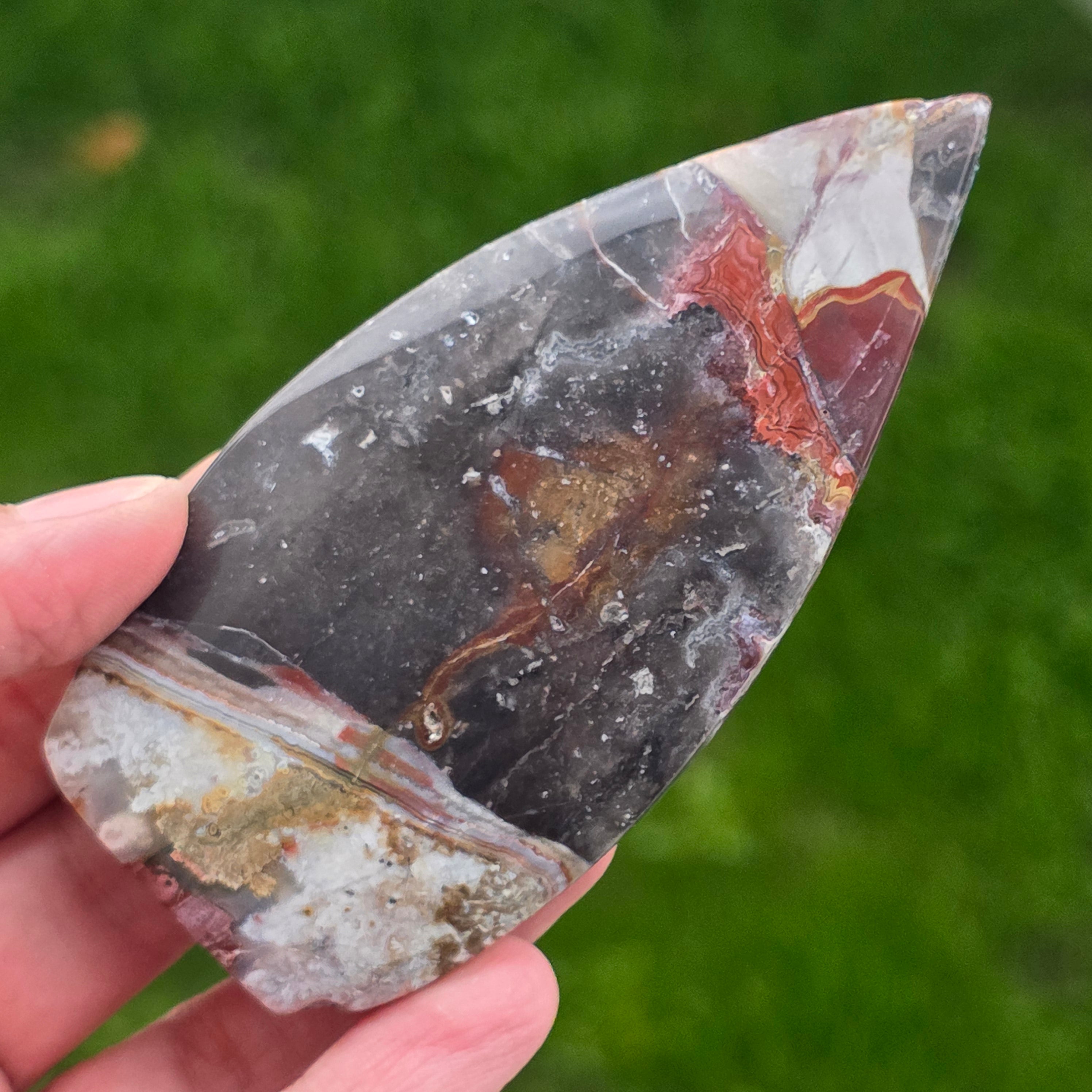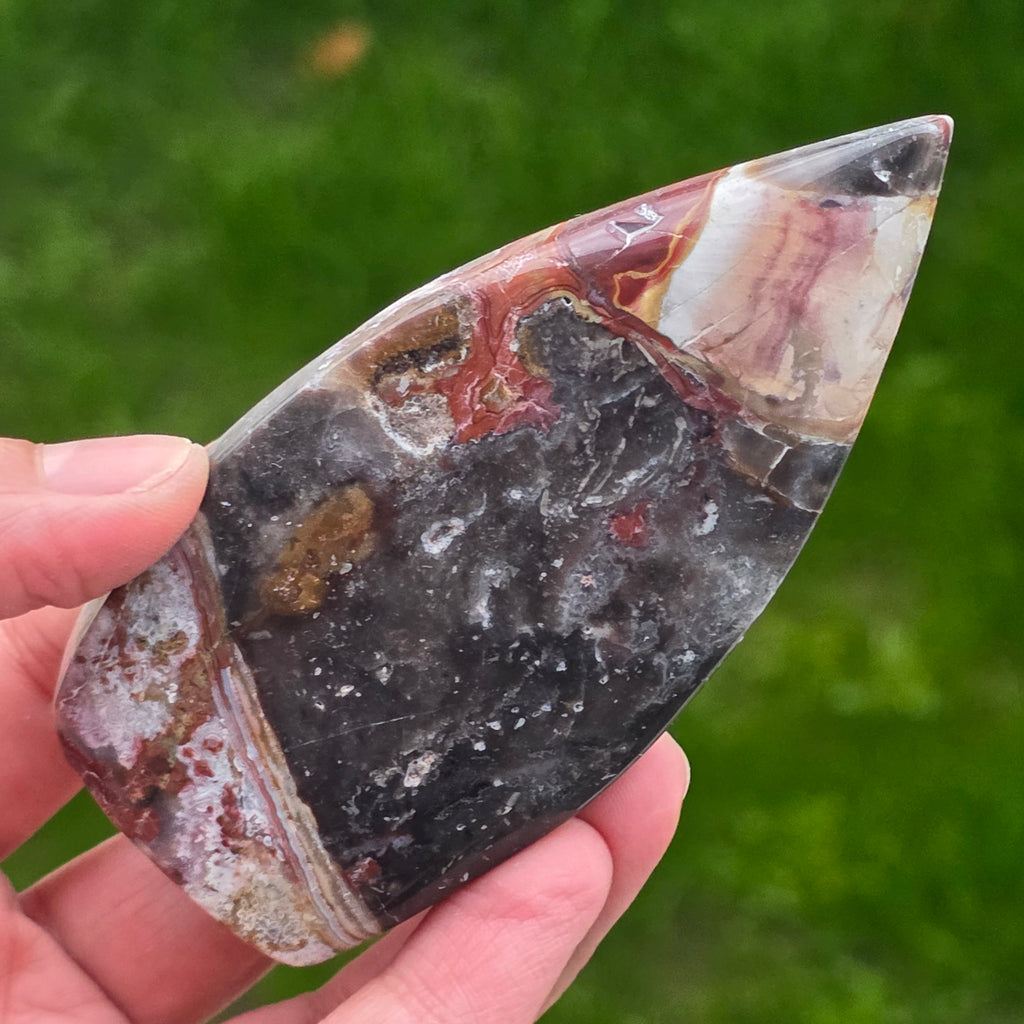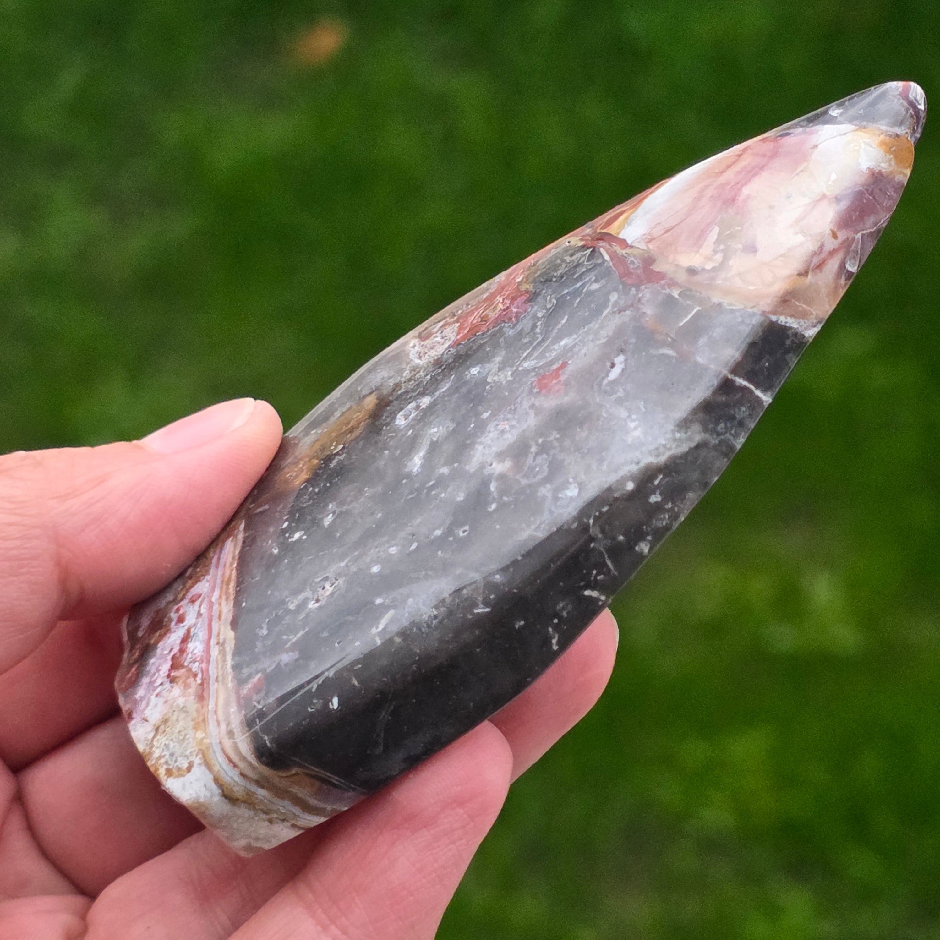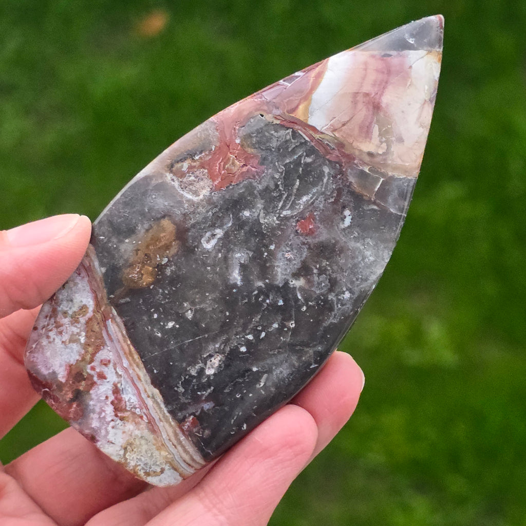 Agatul Crazy din Mexic este una dintre cele mai vibrante și spectaculoase varietăți de agat, celebru pentru liniile sale ondulate și jocurile nebunești de culori ce par desenate de o mână liberă, fără reguli. În această felie naturală, mică dar extrem de expresivă, se dezvăluie întreaga poveste a pietrei: straturi pământii, nuanțe calde de caramel, roșu aprins, portocaliu, gri și crem, amestecate în modele spiralate care par să pulseze cu viață.