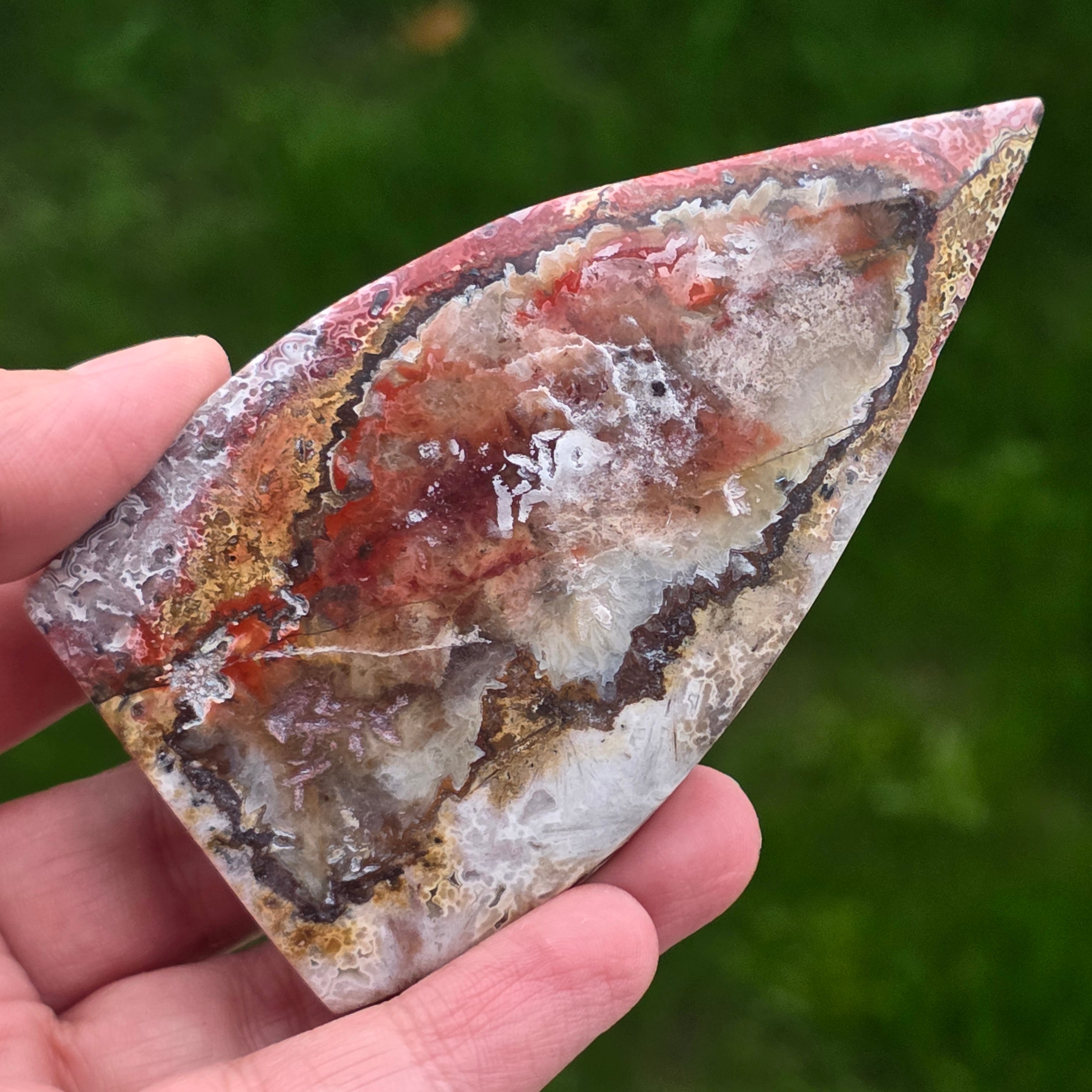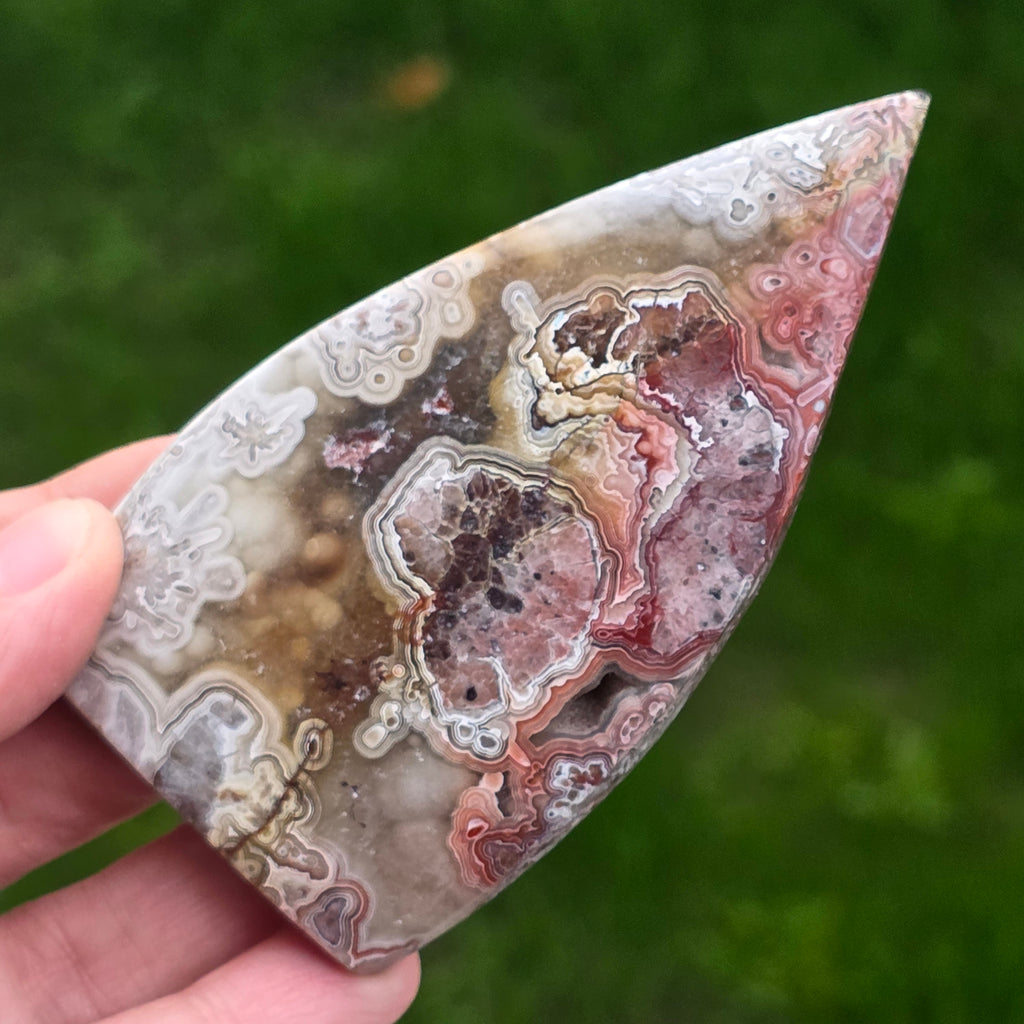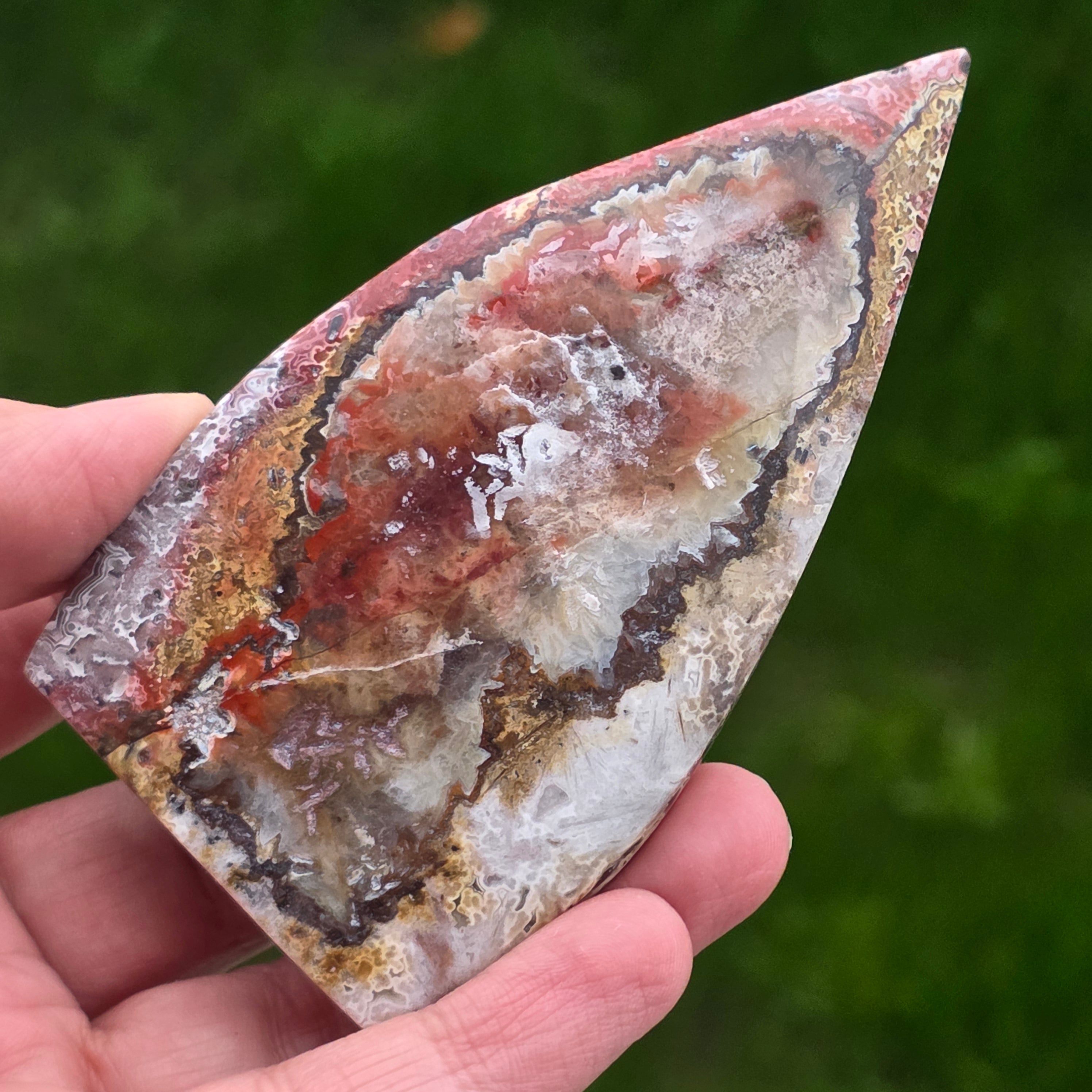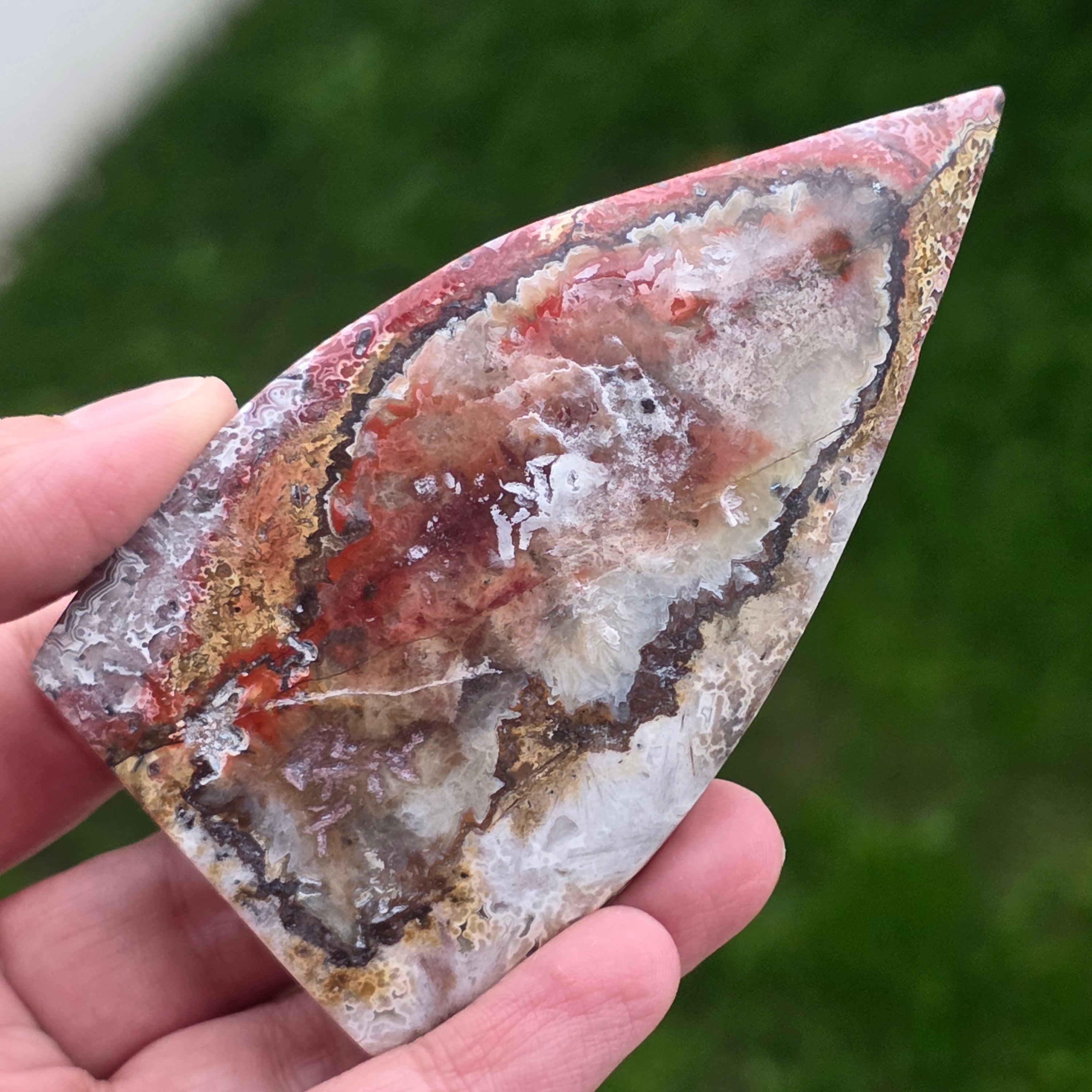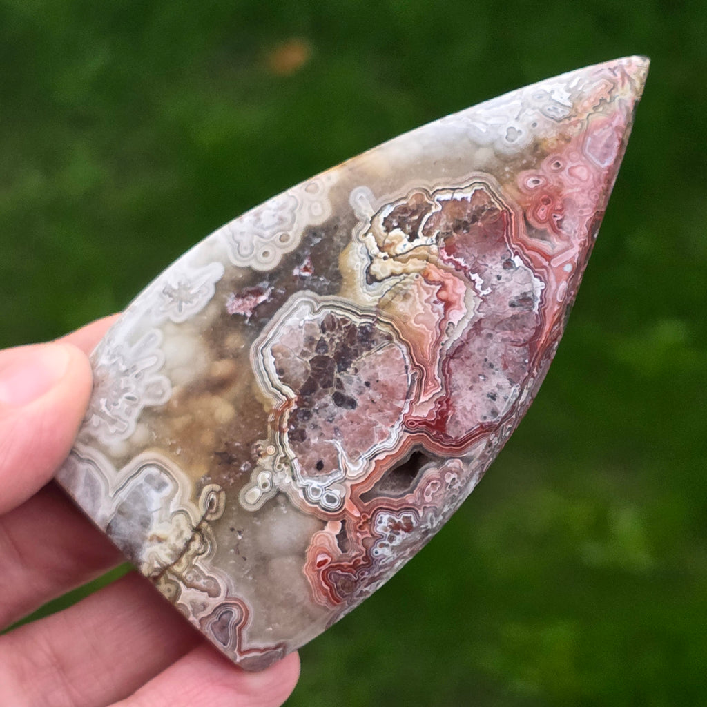 Agatul Crazy din Mexic este una dintre cele mai vibrante și spectaculoase varietăți de agat, celebru pentru liniile sale ondulate și jocurile nebunești de culori ce par desenate de o mână liberă, fără reguli. În această felie naturală, mică dar extrem de expresivă, se dezvăluie întreaga poveste a pietrei: straturi pământii, nuanțe calde de caramel, roșu aprins, portocaliu, gri și crem, amestecate în modele spiralate care par să pulseze cu viață.