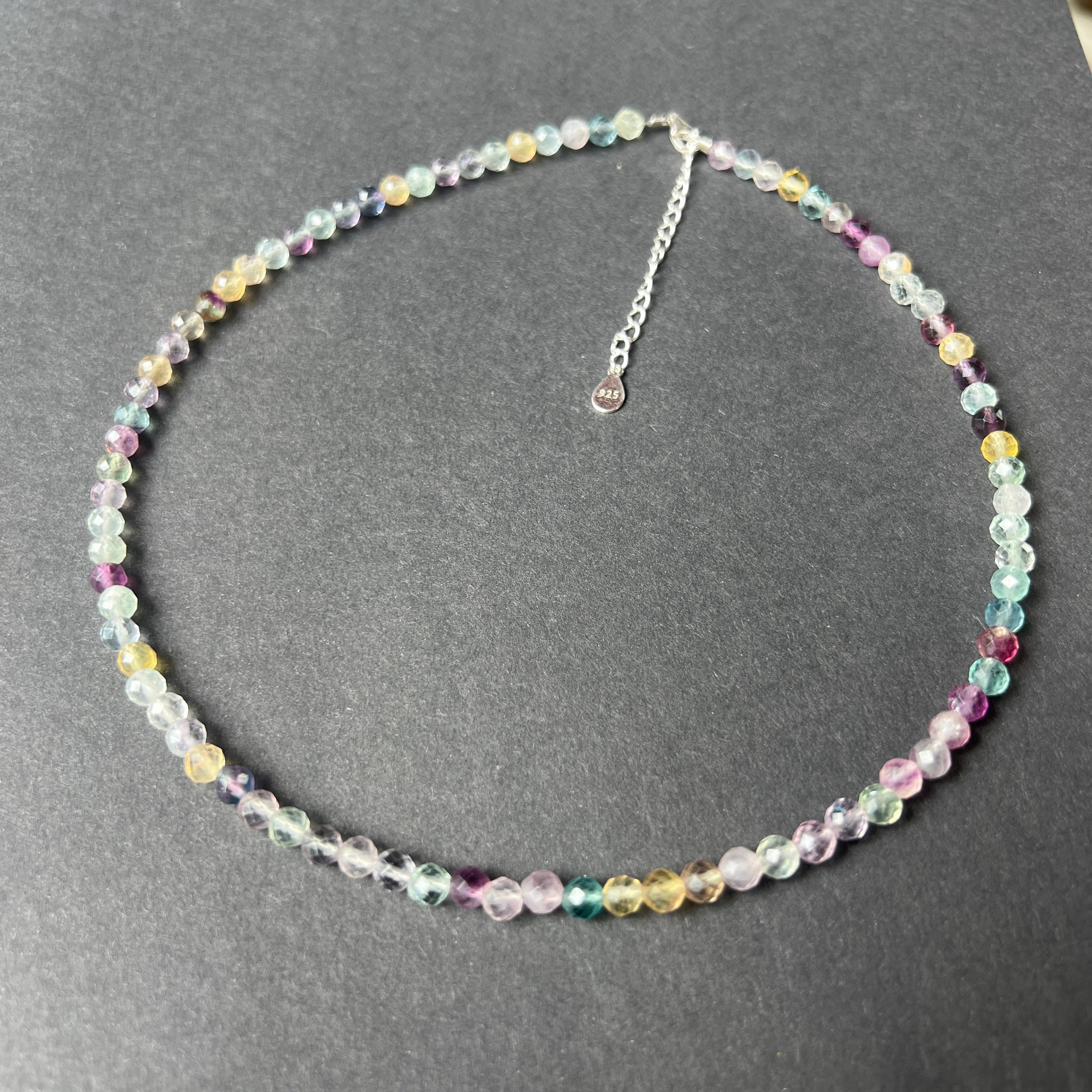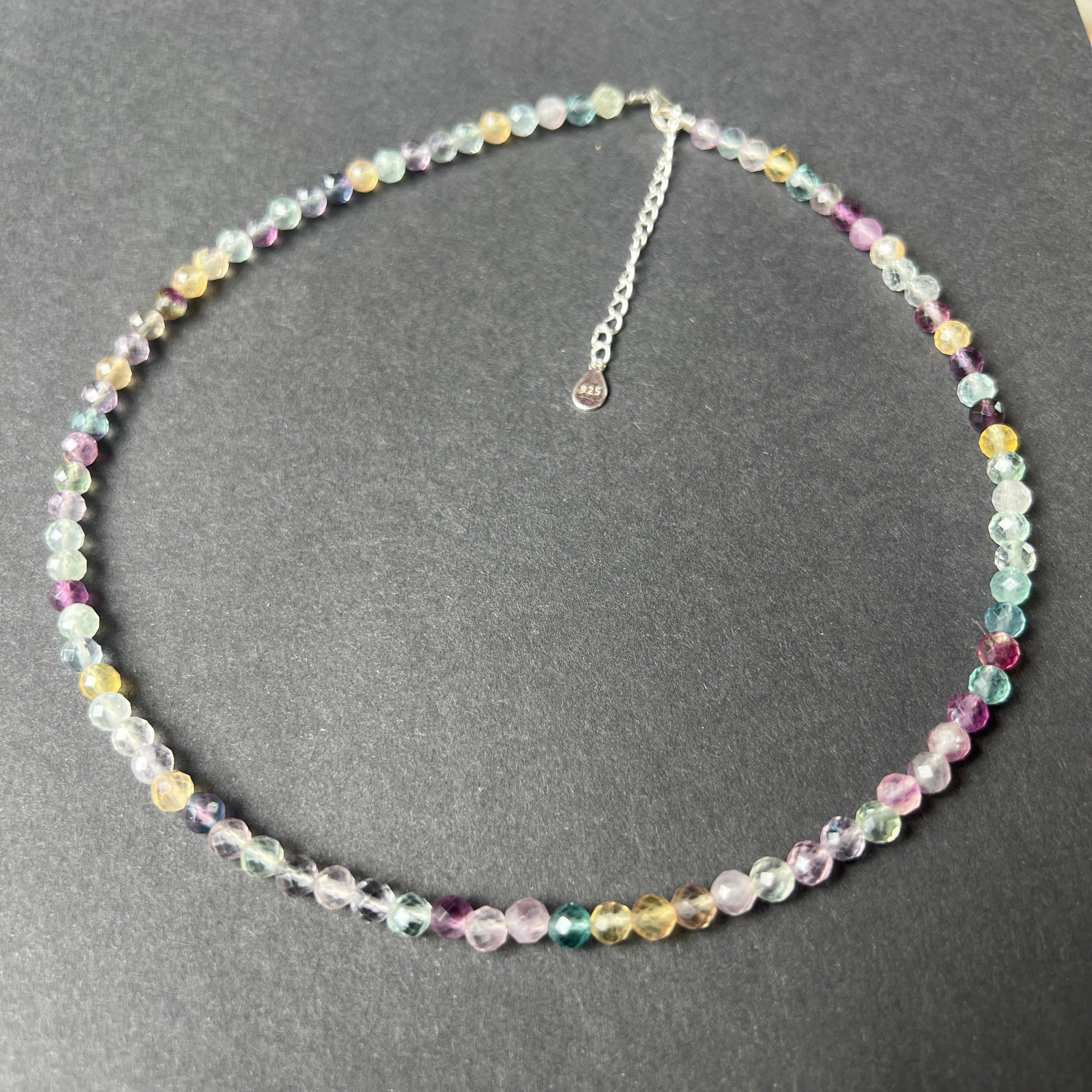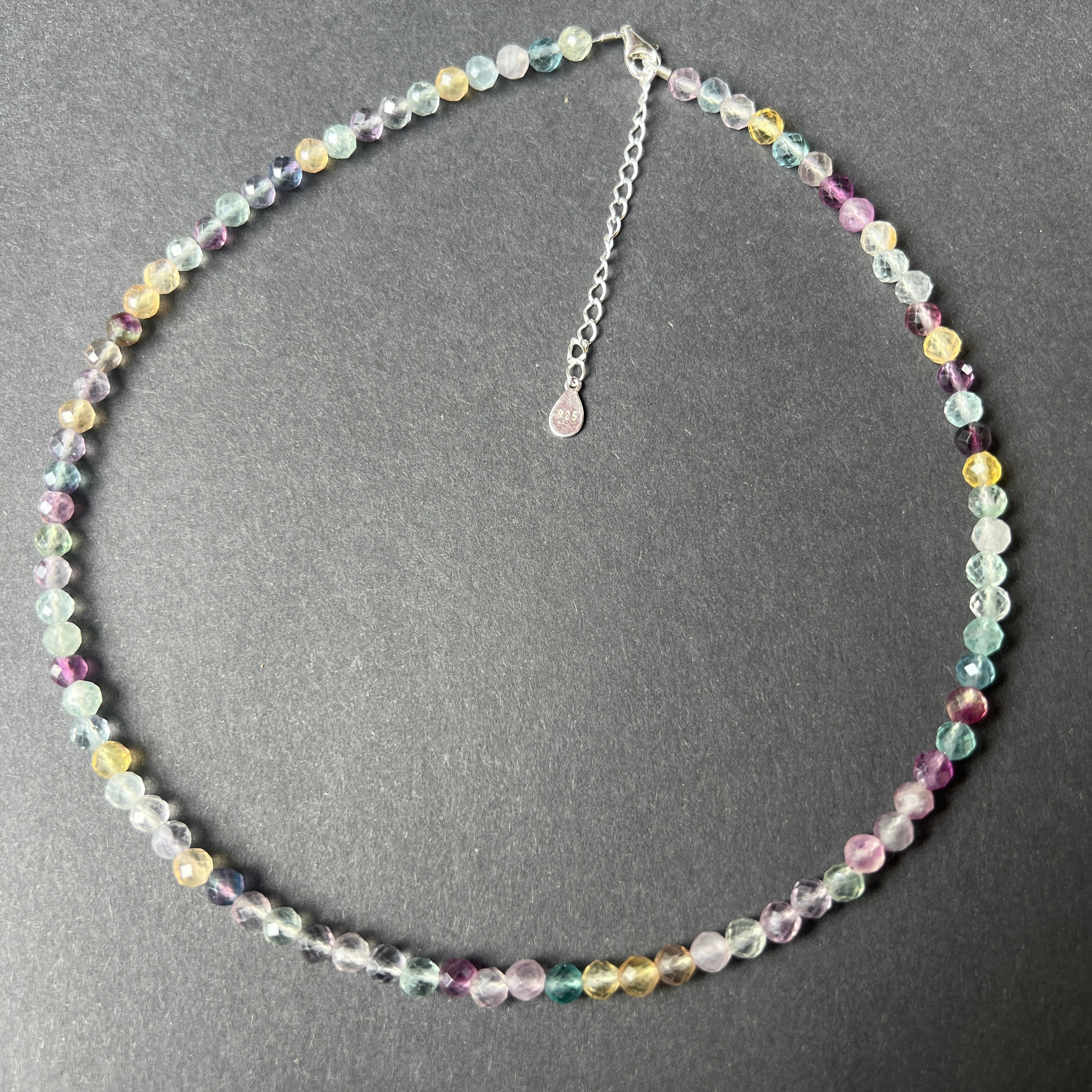 Eine Halskette wie ein für Licht geöffnetes Fenster - lebendig, klar, verspielt und gleichzeitig. Die Perlen aus Fluoritenfluorit von 6 mm leuchten in Schatten, die zwischen Lila, Grün, Blau und Rosa tanzen, wie eine Brücke zwischen Emotion und Vernunft, zwischen Traum und Klarheit.