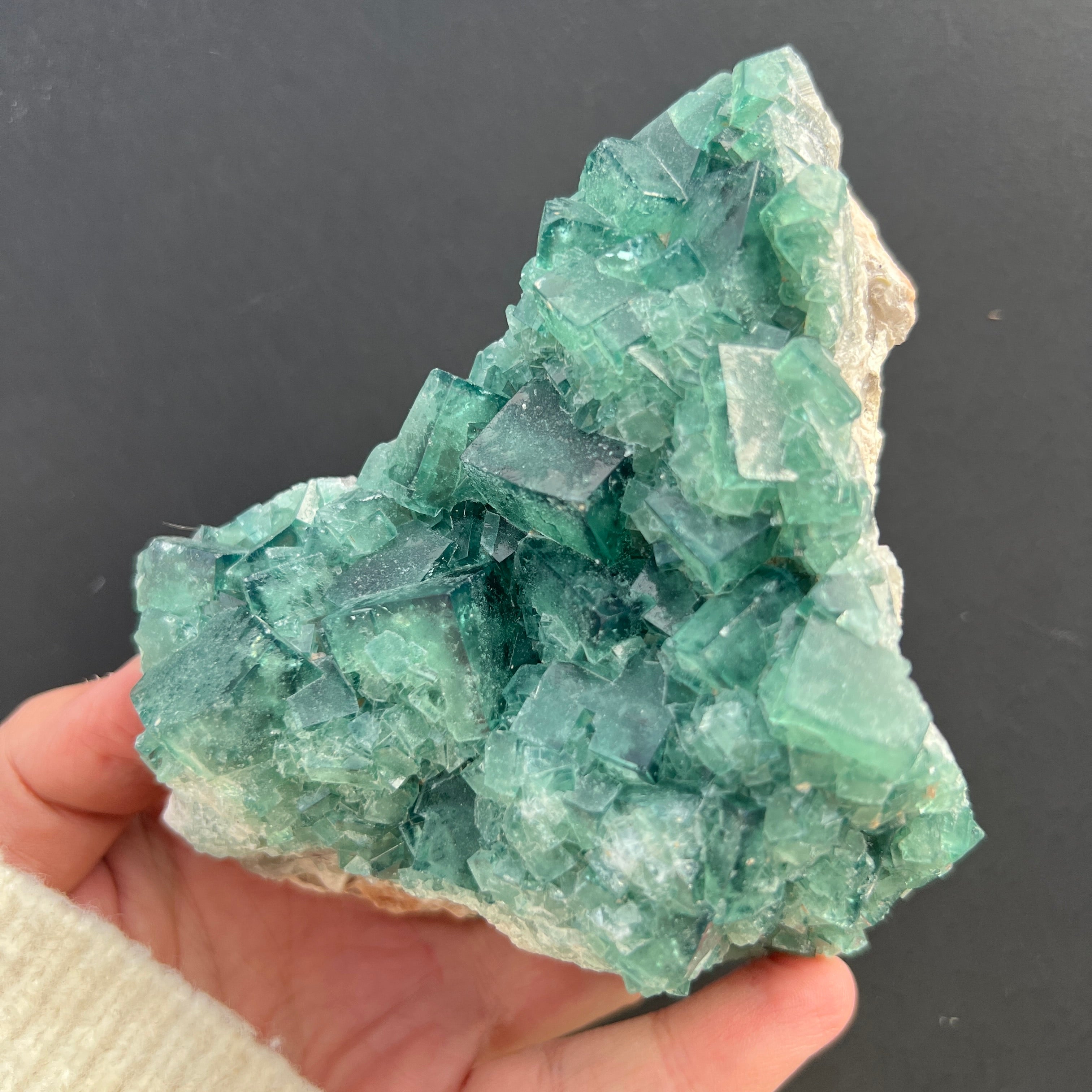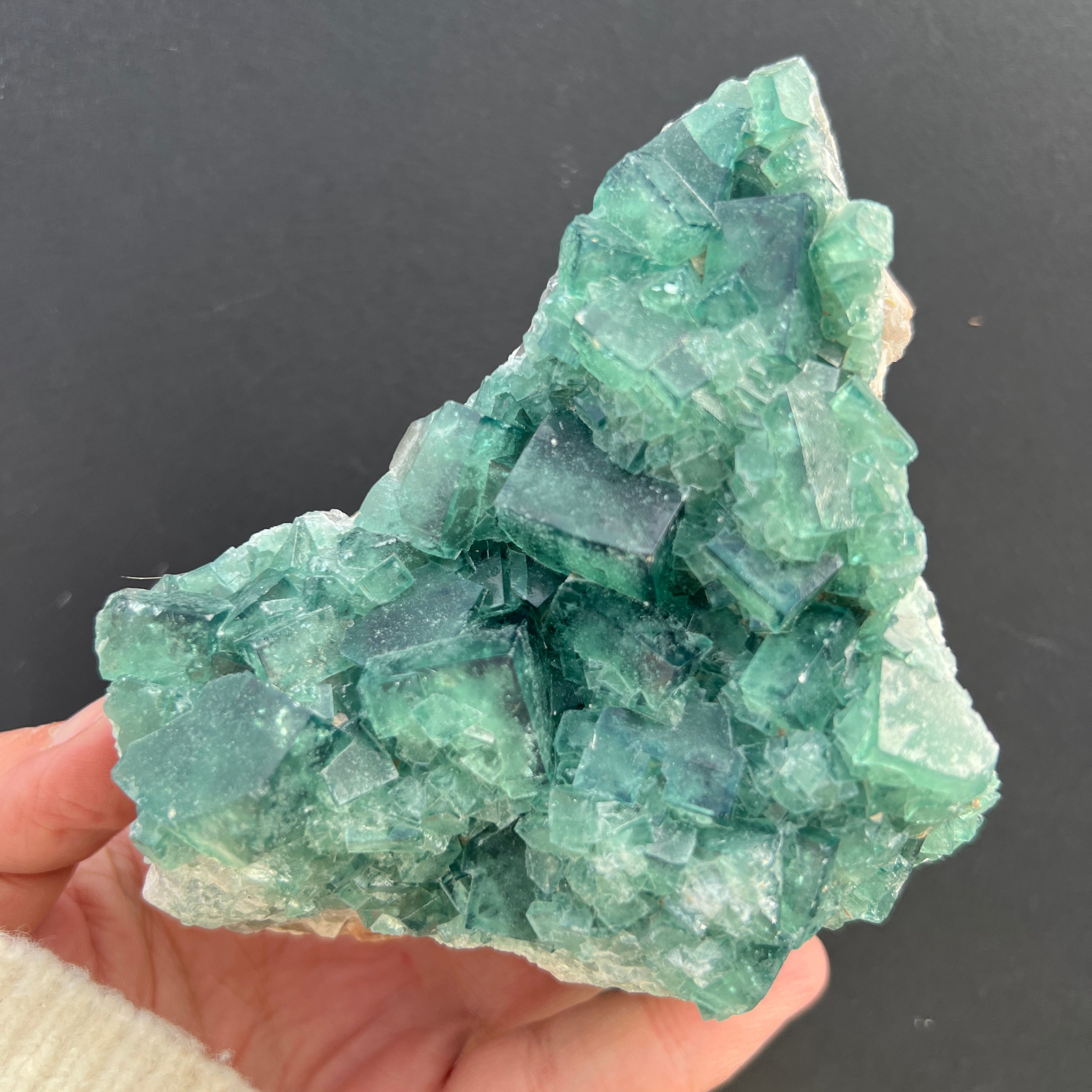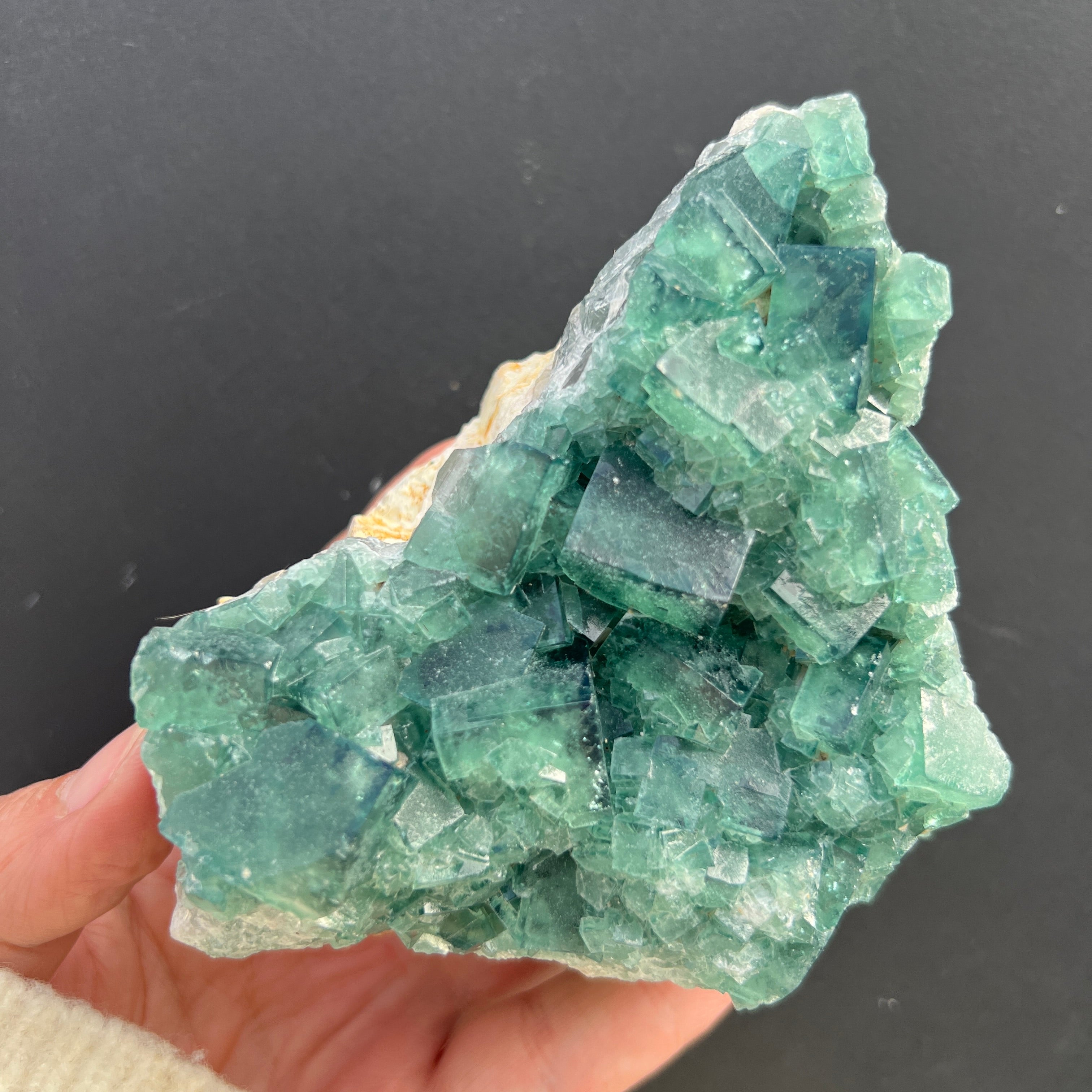 Dieses Exemplar zeigt die typischen Merkmale von Fluorit: perfekte kubische Form, teilweise Transparenz und einen Farbton, der subtil je nach chemischer Zusammensetzung und Kristallisationsbedingungen variiert. Das Vorhandensein von Farbe – sei es grün, violett, blau oder gelb – ist mit Einschlüsse und natürlichen Verunreinigungen wie Yttrium, Cer oder Spuren von Kohlenwasserstoffen verbunden, und die Farbzonierung liefert wertvolle Informationen über Veränderungen in der Entstehungsumgebung.