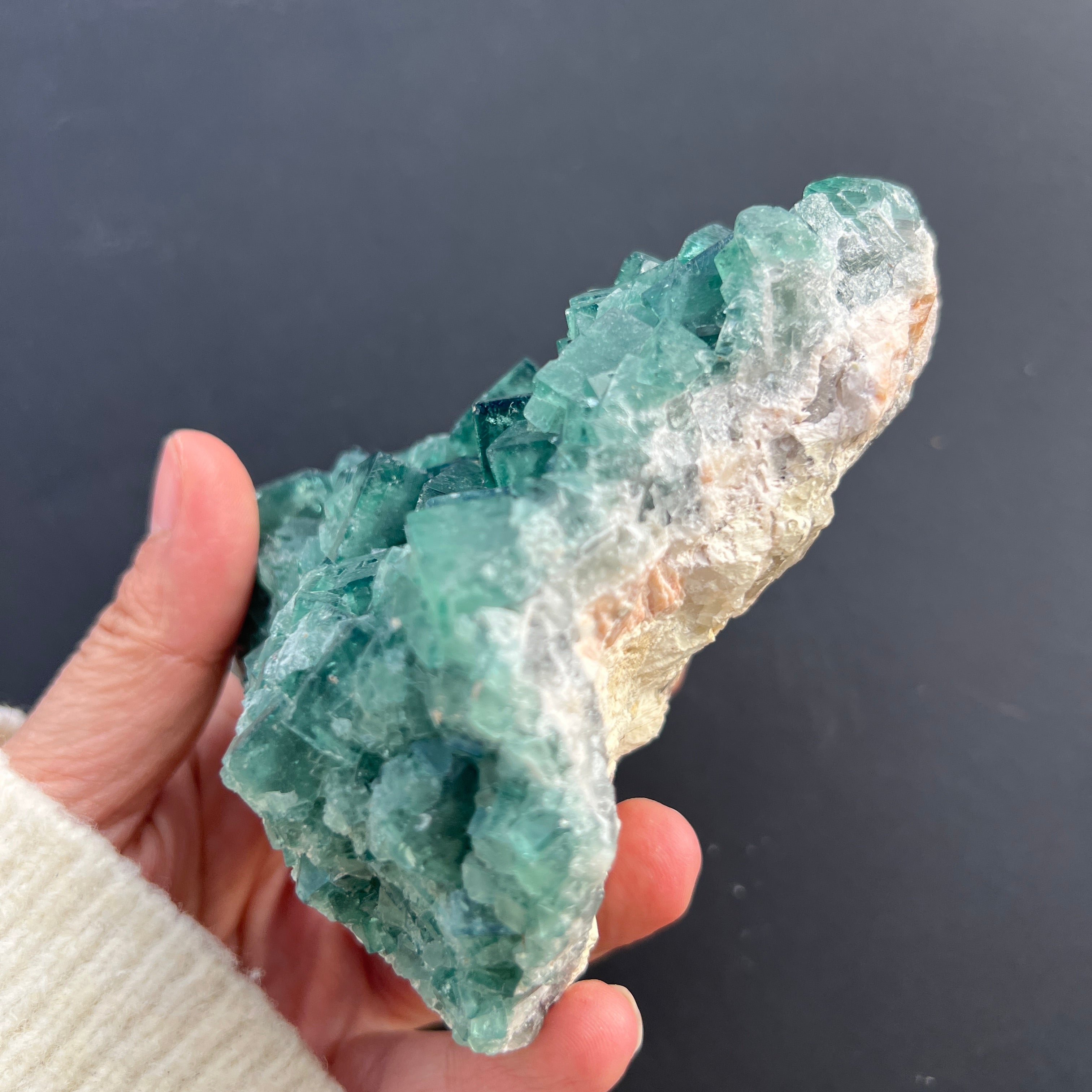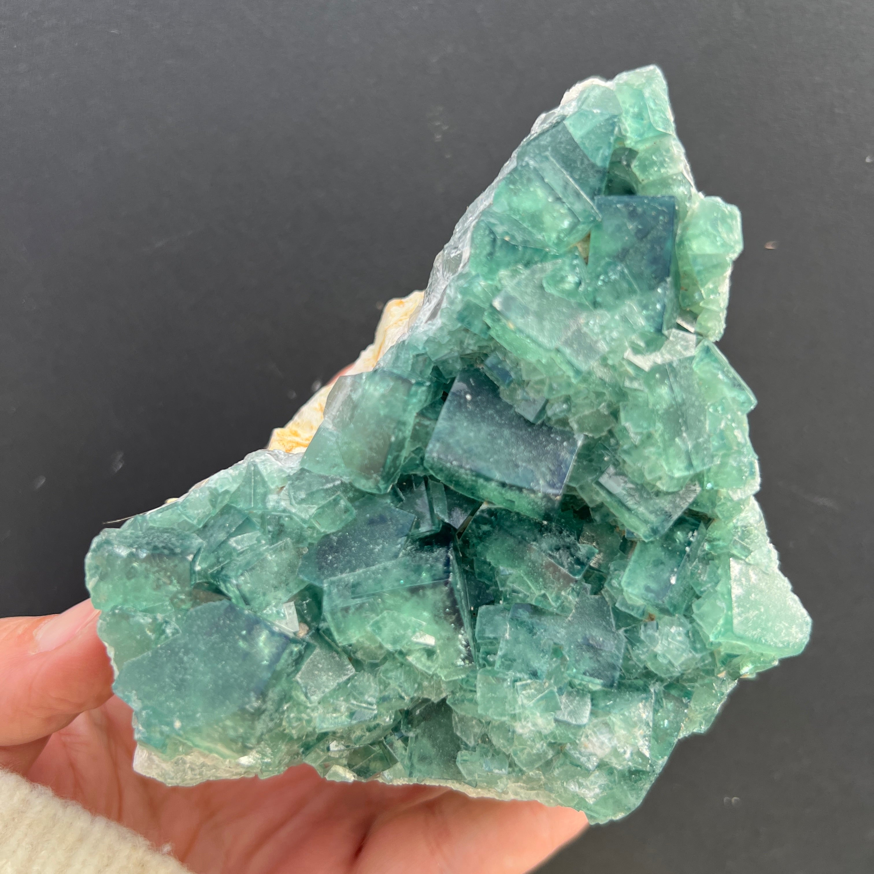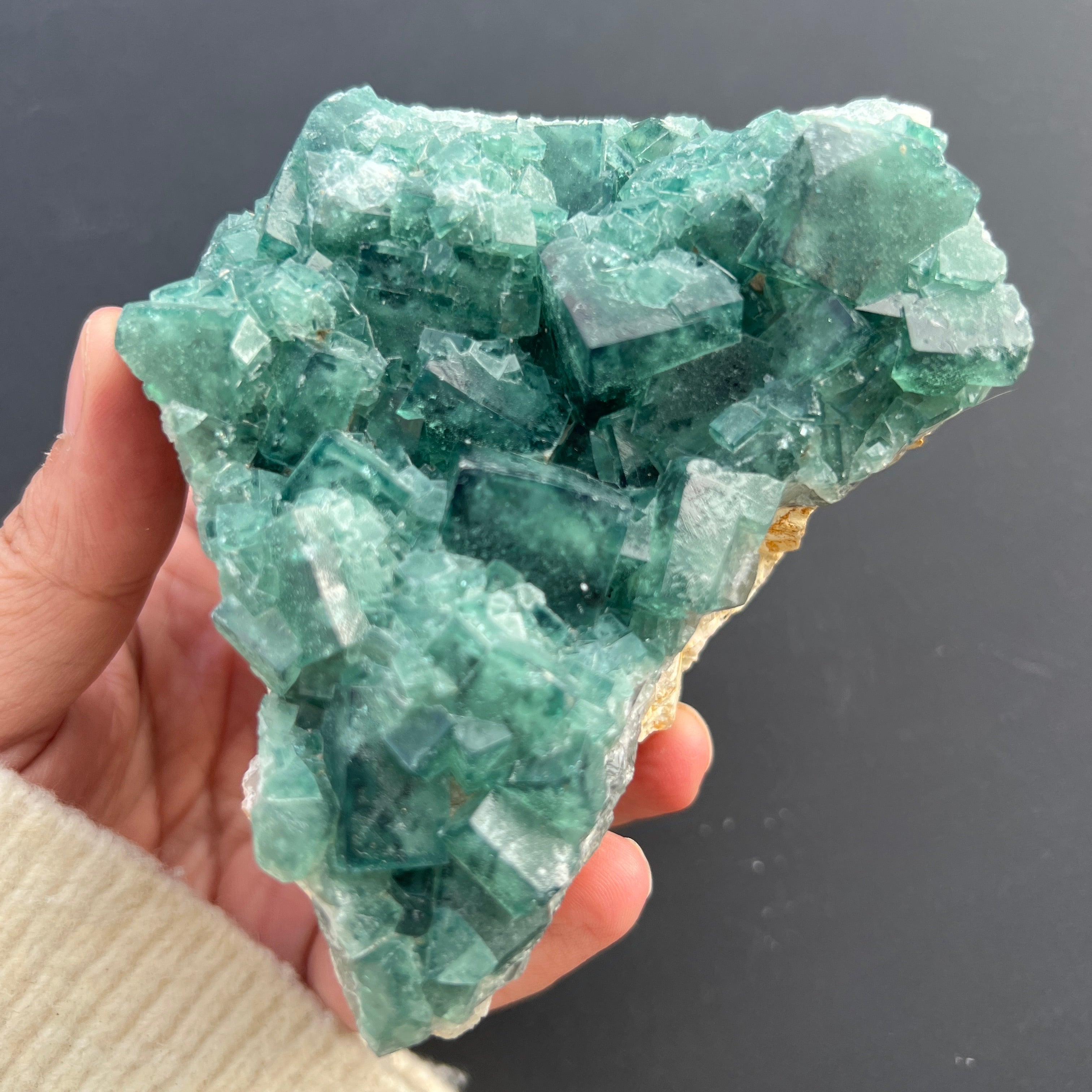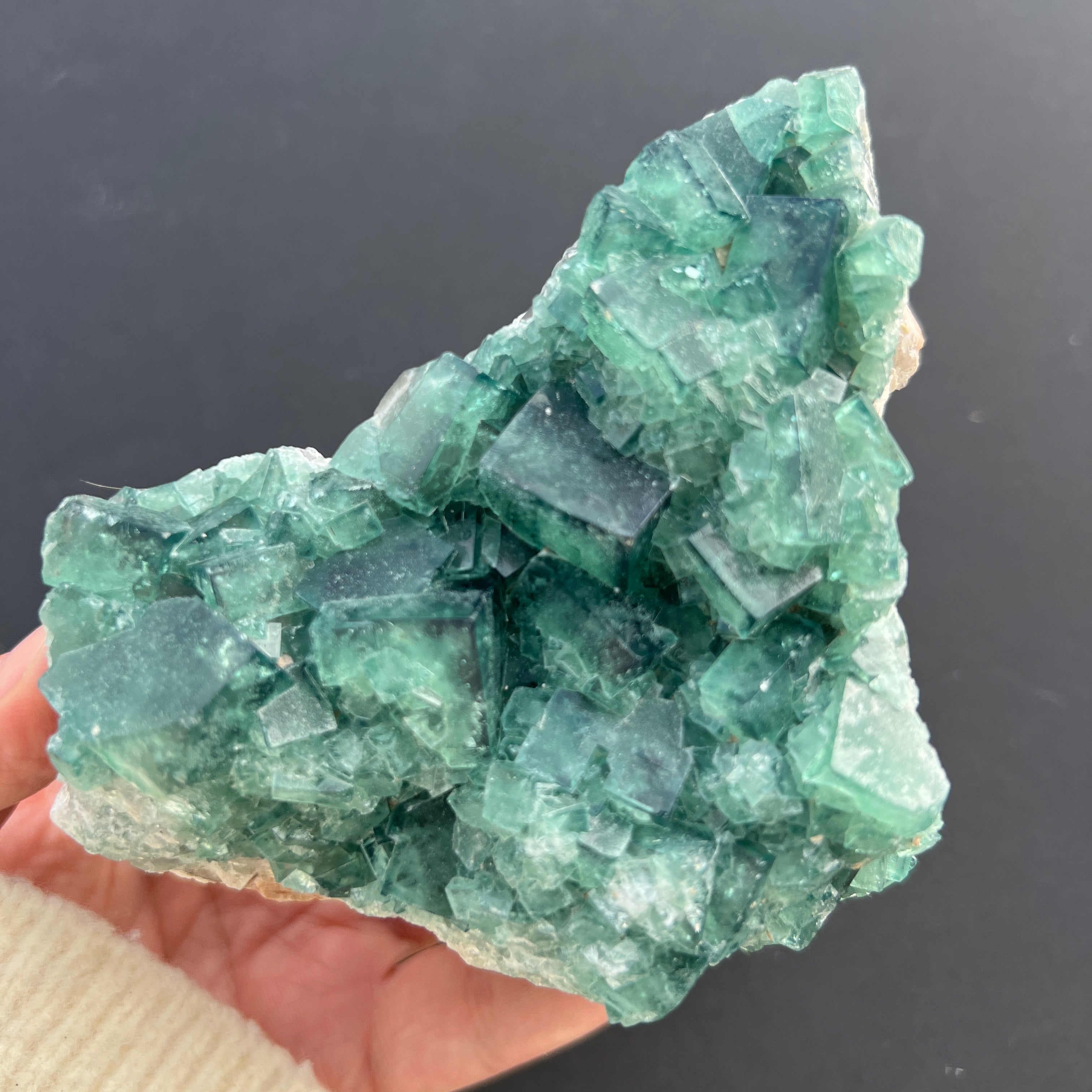 Dieses Exemplar zeigt die typischen Merkmale von Fluorit: perfekte kubische Form, teilweise Transparenz und einen Farbton, der subtil je nach chemischer Zusammensetzung und Kristallisationsbedingungen variiert. Das Vorhandensein von Farbe – sei es grün, violett, blau oder gelb – ist mit Einschlüsse und natürlichen Verunreinigungen wie Yttrium, Cer oder Spuren von Kohlenwasserstoffen verbunden, und die Farbzonierung liefert wertvolle Informationen über Veränderungen in der Entstehungsumgebung.