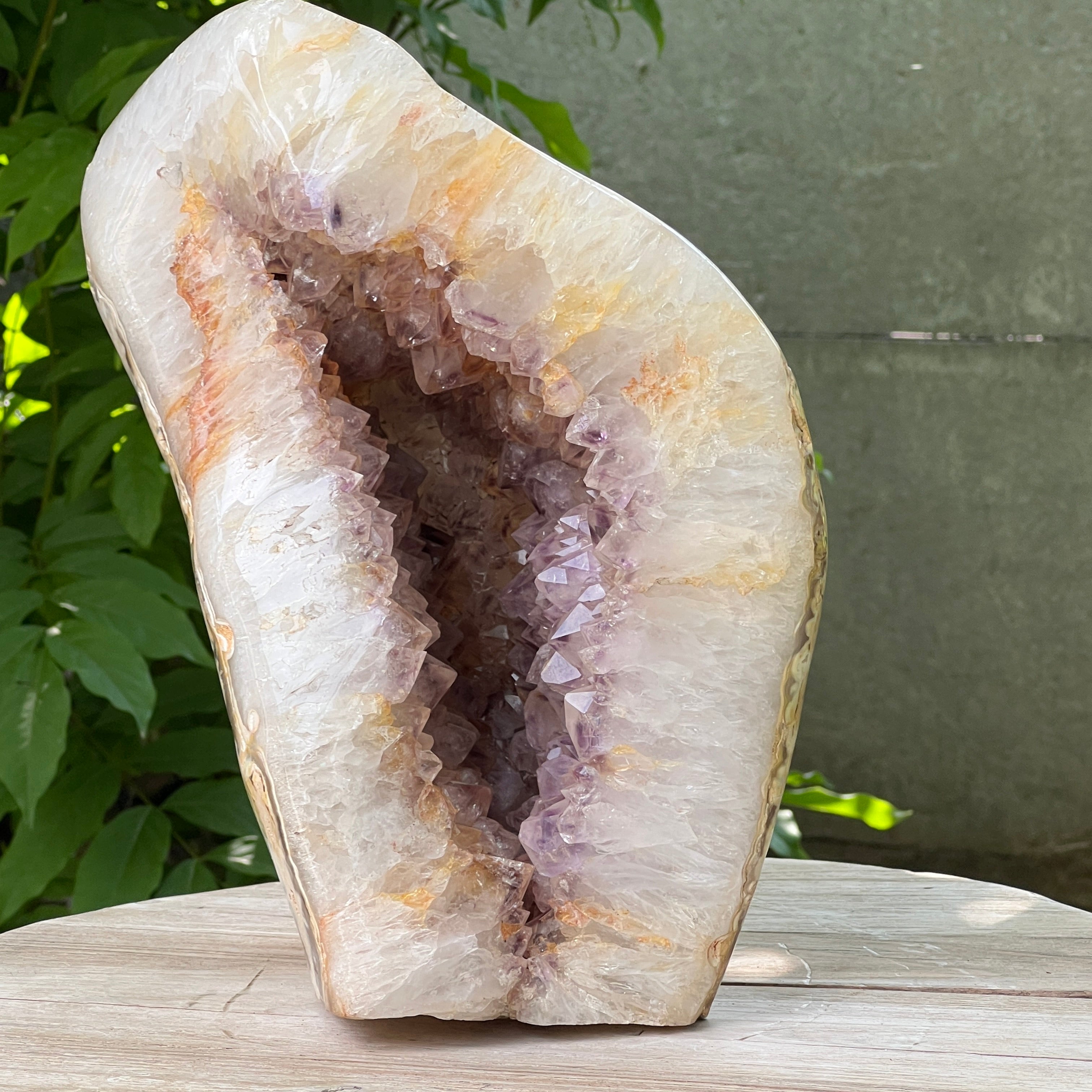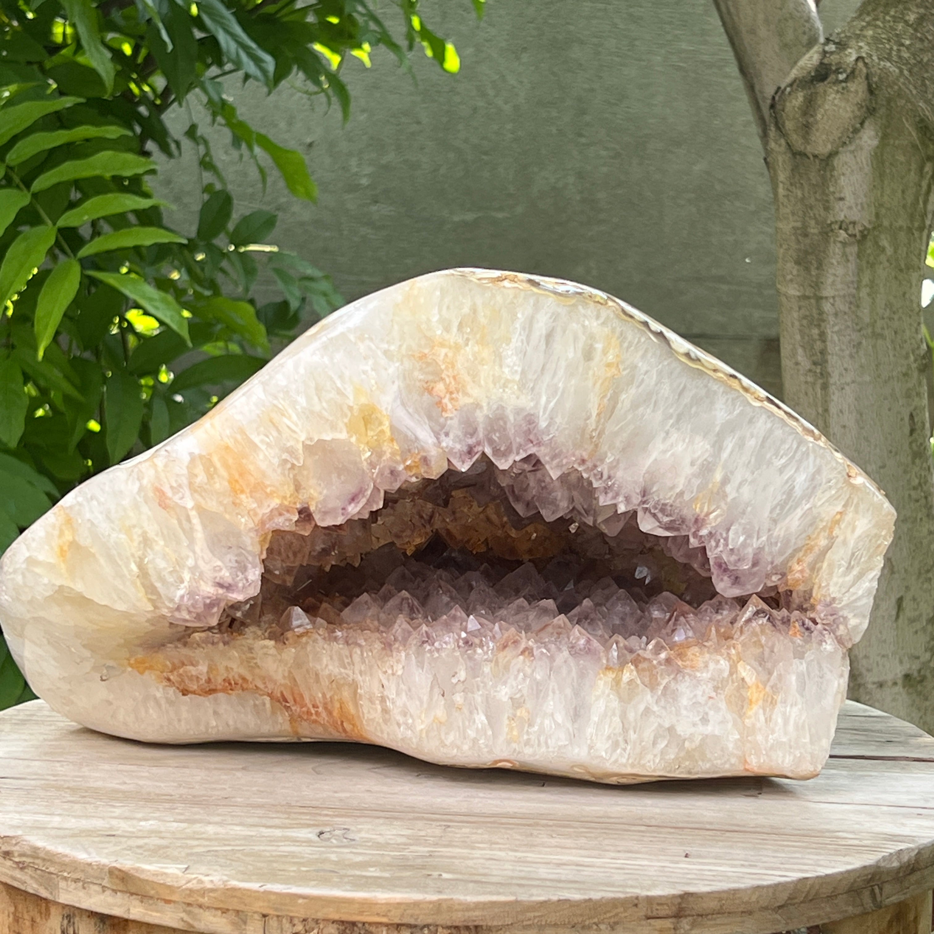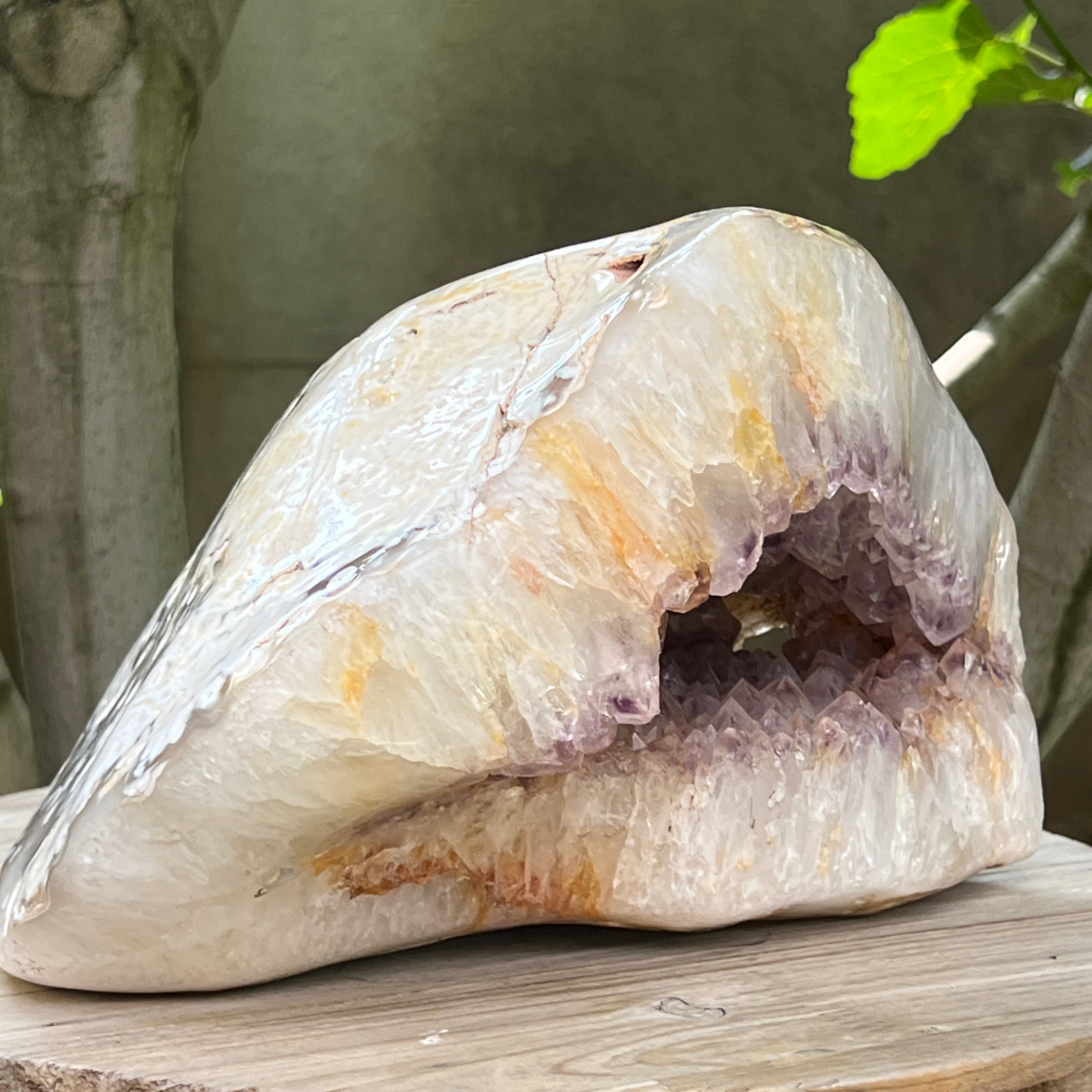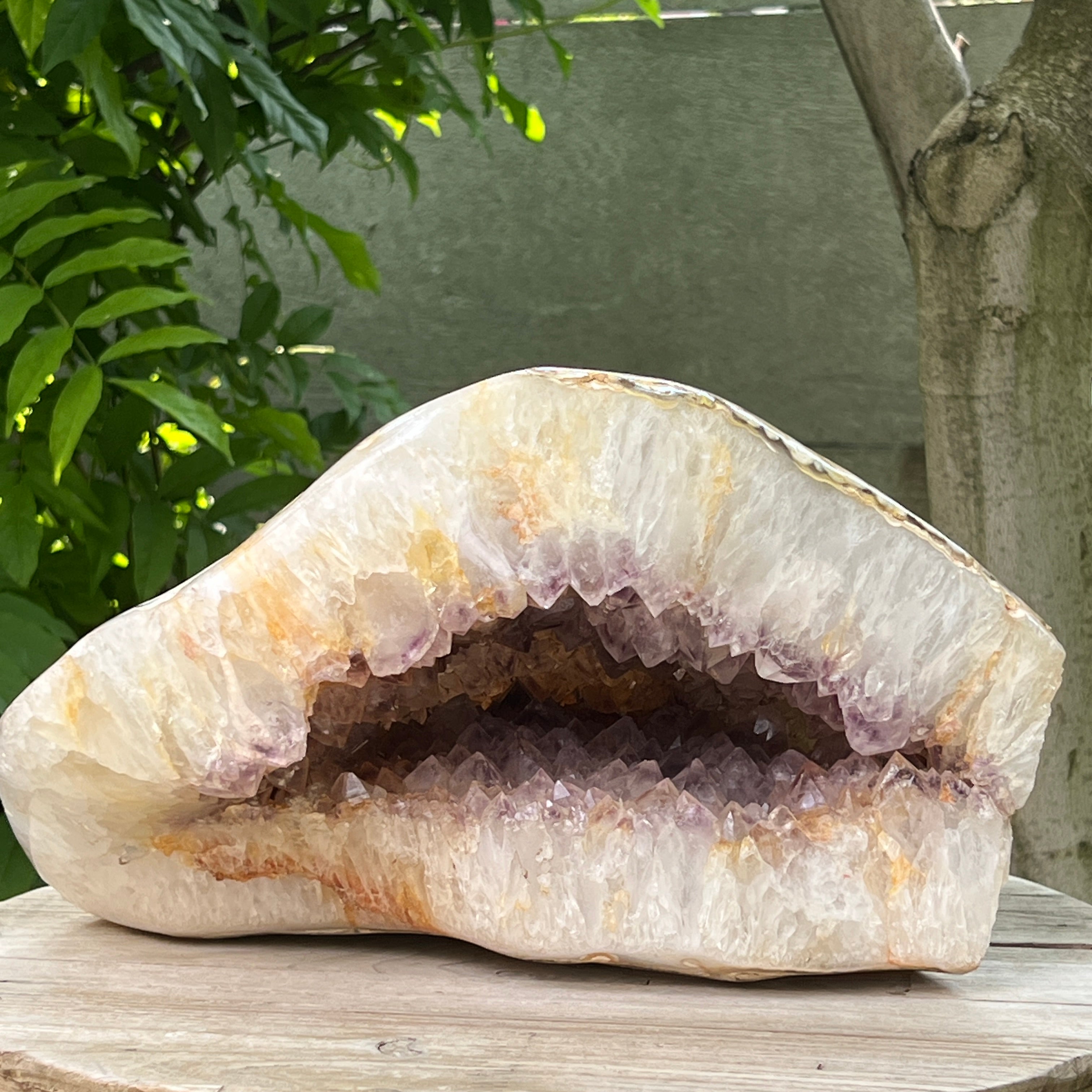 Diese spektakuläre Geode kombiniert das tiefe Geheimnis der Amethysten mit der geschichteten Ruhe des Achates und zeigt einen von Zeit und Energie geschnitzten Naturschatz. Jedes Detail seines versteckten Innenraums - helle Amethystkristalle in violetten Farbtönen - wird durch die feine und stabile Kontur des Achats als Herz hervorgehoben, die durch eine Weisheitsrinde geschützt ist.