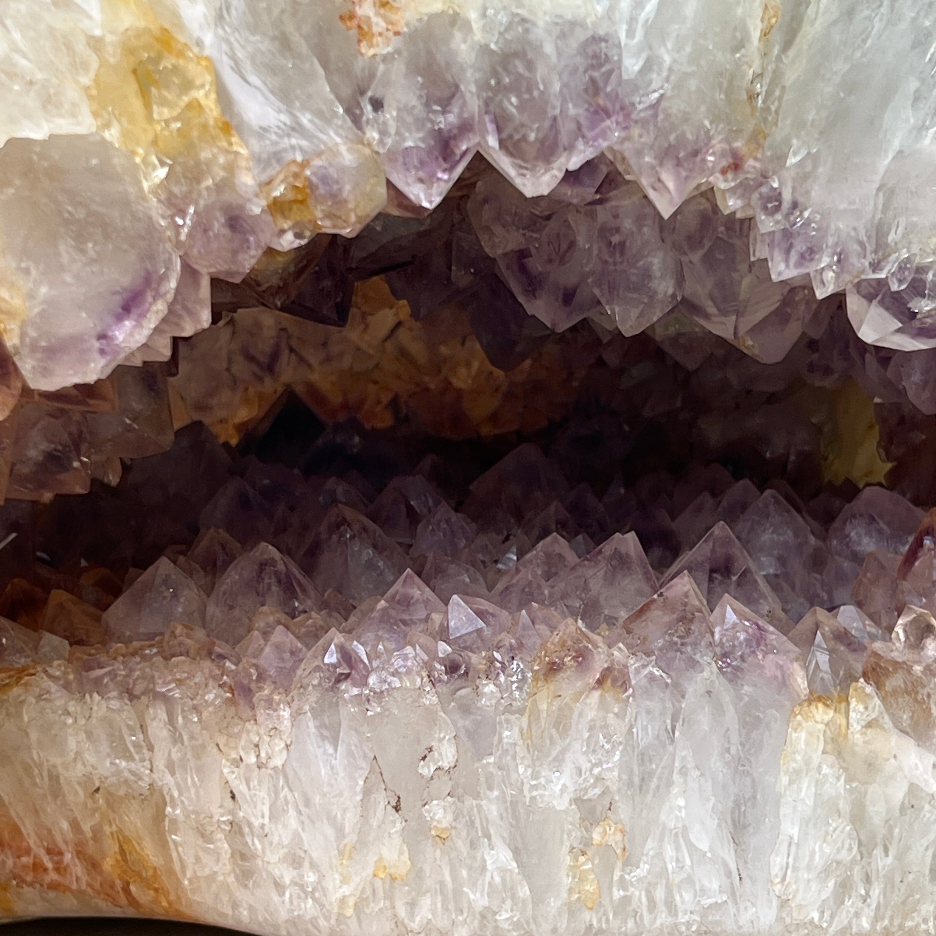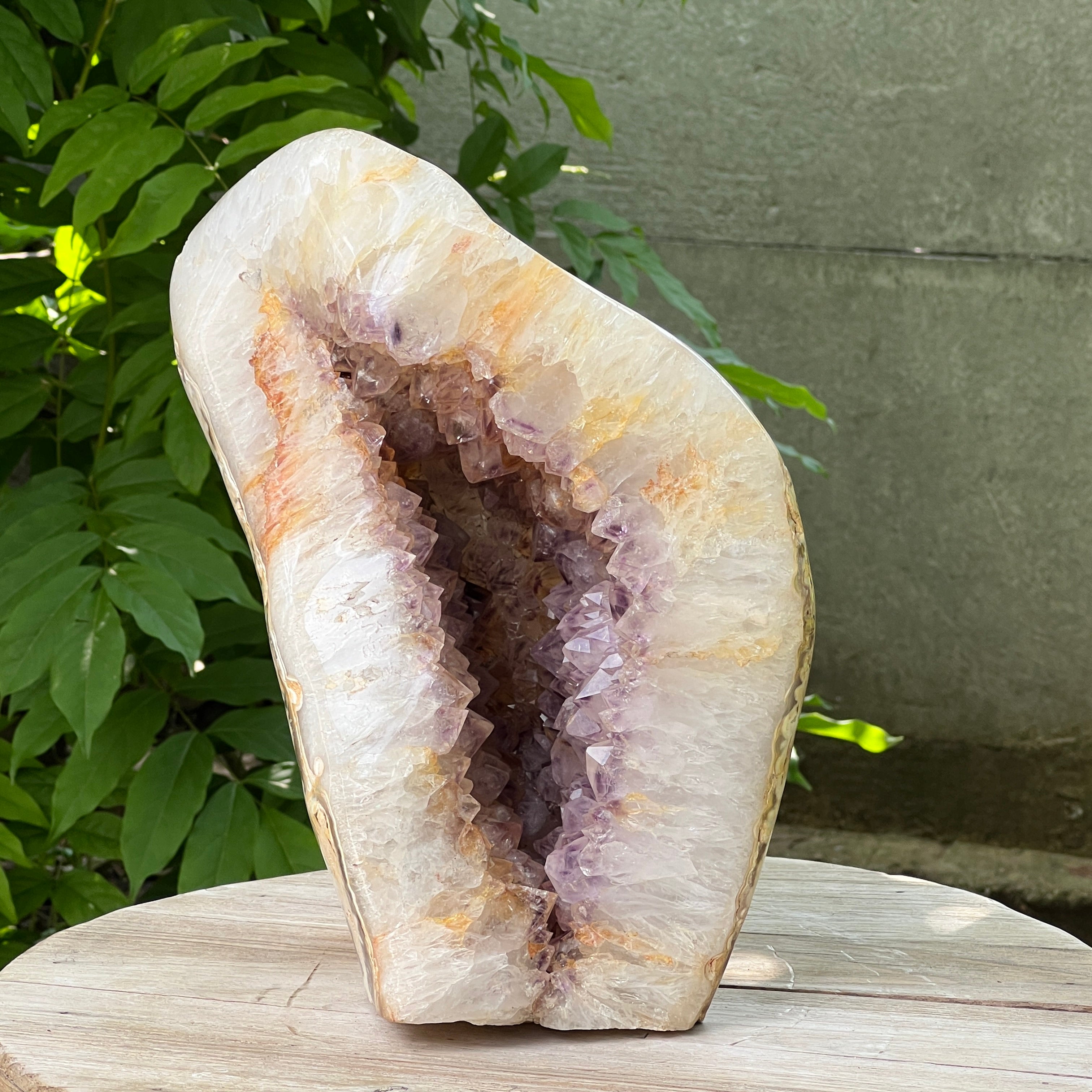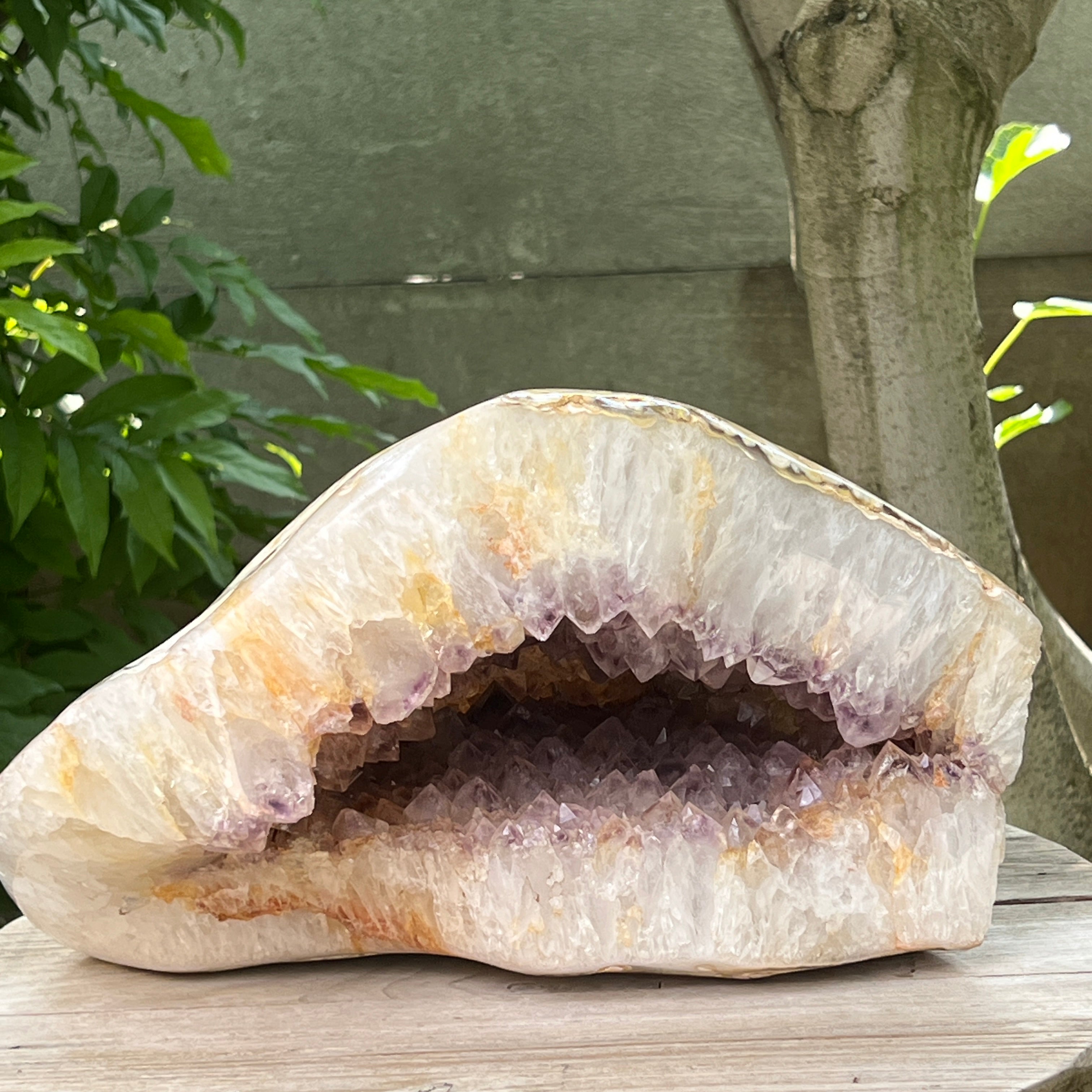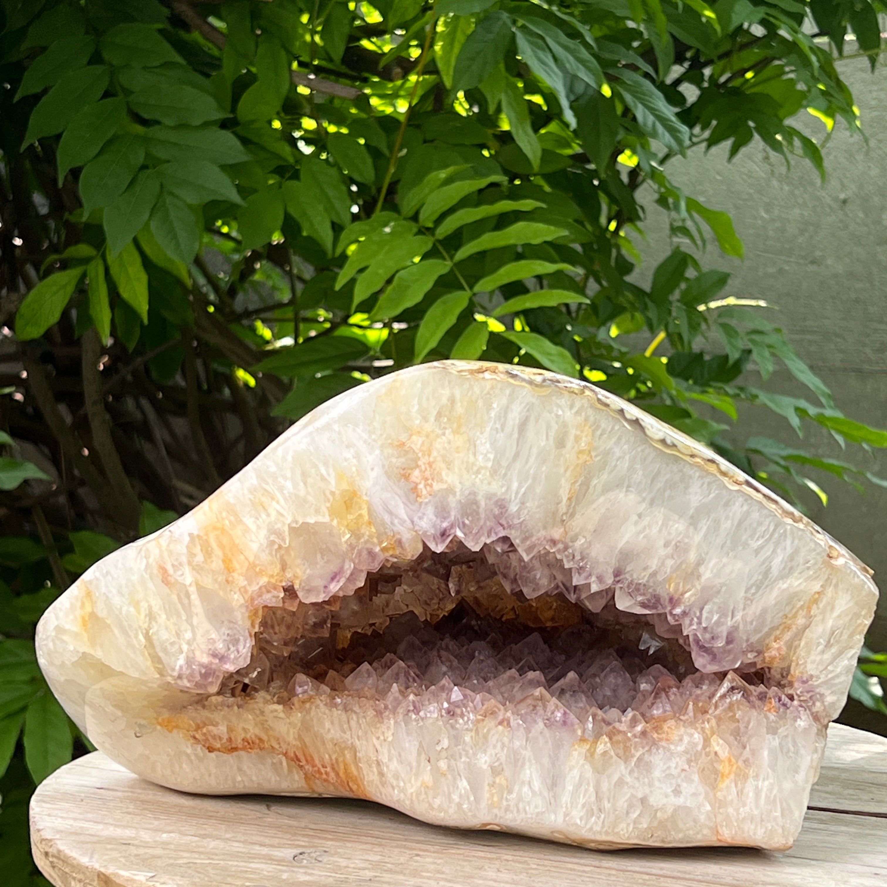Diese spektakuläre Geode kombiniert das tiefe Geheimnis der Amethysten mit der geschichteten Ruhe des Achates und zeigt einen von Zeit und Energie geschnitzten Naturschatz. Jedes Detail seines versteckten Innenraums - helle Amethystkristalle in violetten Farbtönen - wird durch die feine und stabile Kontur des Achats als Herz hervorgehoben, die durch eine Weisheitsrinde geschützt ist.