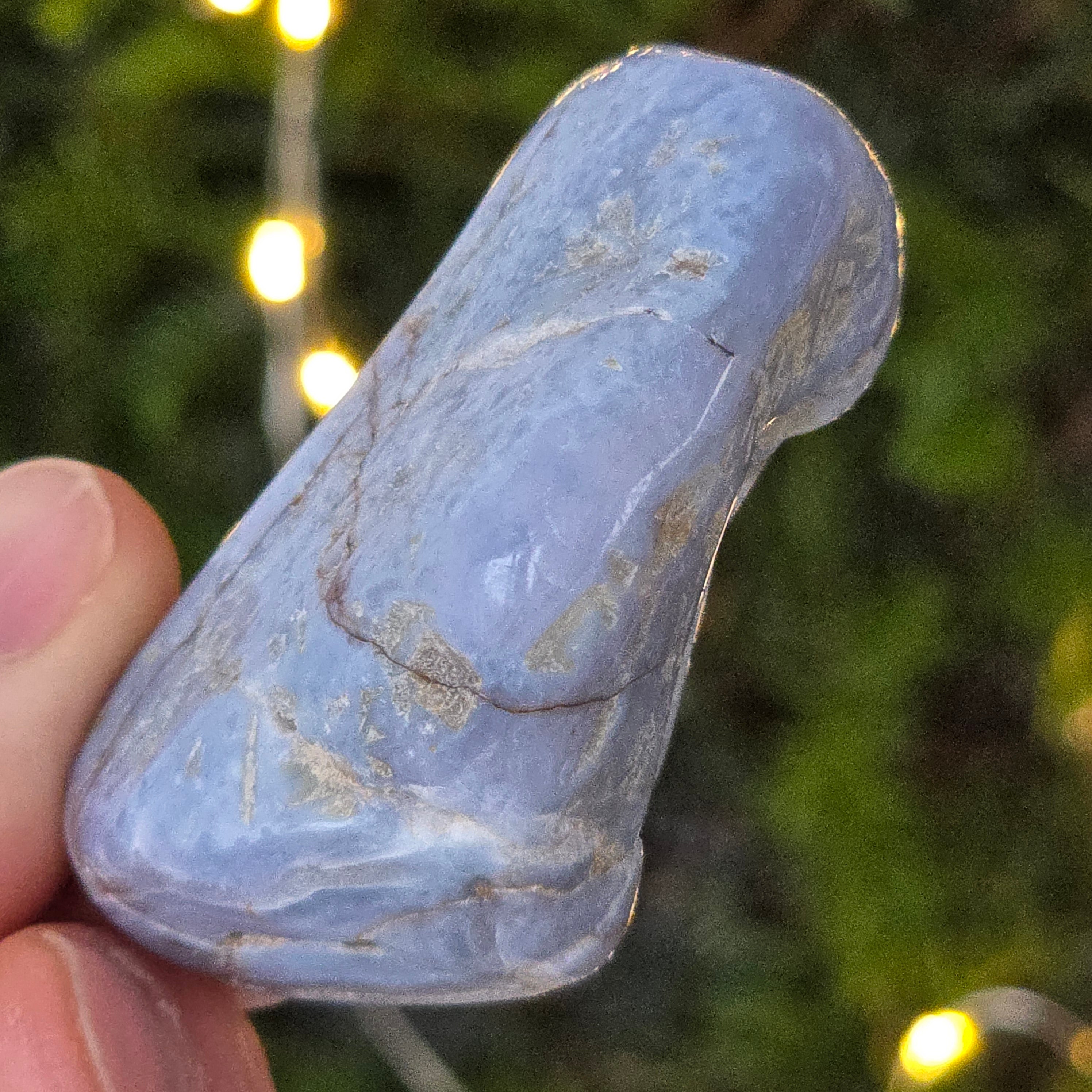 Blaue Chalcedon wird im Allgemeinen mit Kommunikation, Selbstausdruck und Wahrheit in Verbindung gebracht und kann helfen, authentische Kommunikation zu fördern.