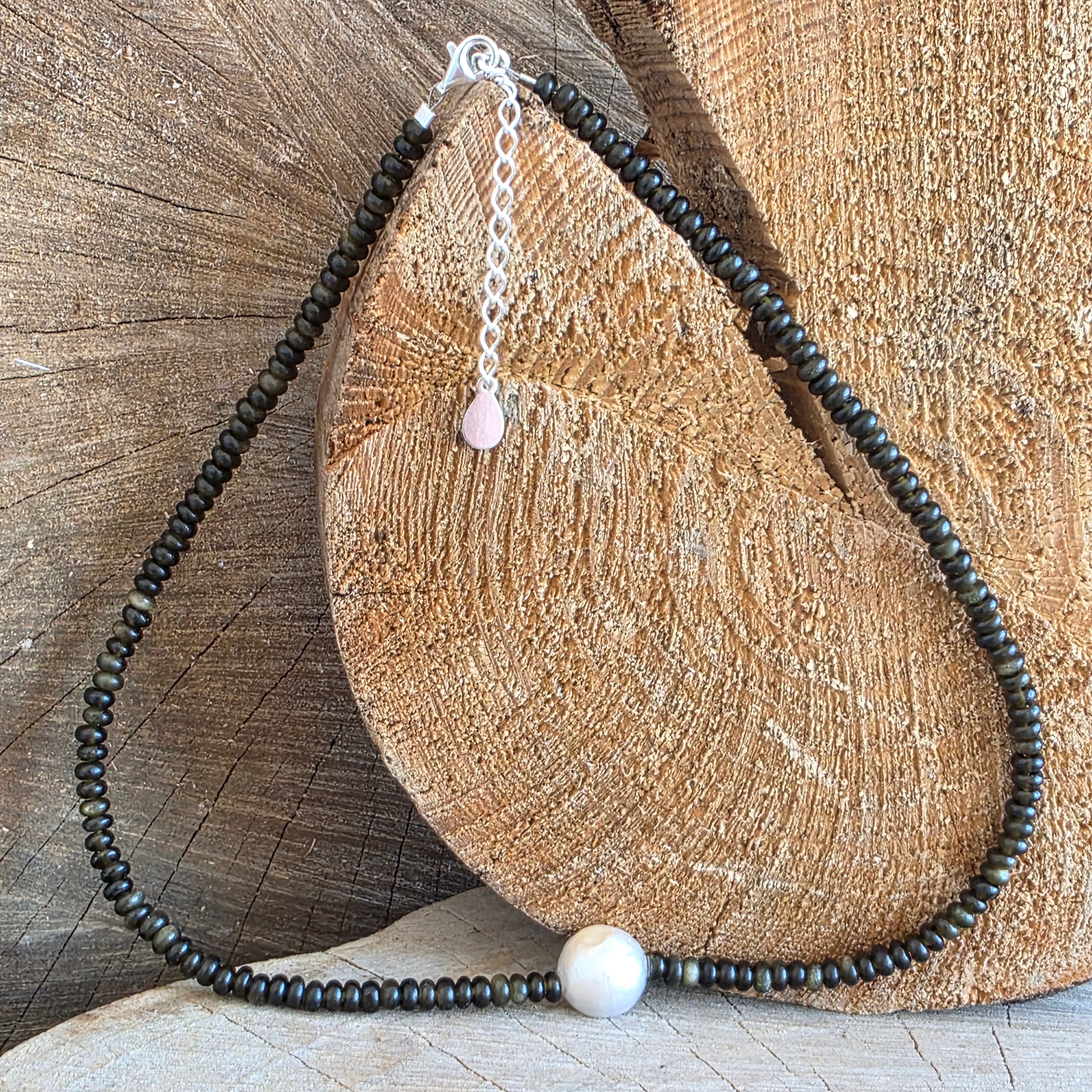 Eine Halskette mit eleganter und geheimnisvoller Ausstrahlung, gefertigt aus 6 mm goldenen Obsidian-Kugeln, die harmonisch um den Hals fallen und eine ausgewogene, fließende Linie bilden. Das tiefschwarze Gestein wird von subtilen goldenen Reflexionen durchzogen, die je nach Licht und Bewegung erscheinen und verschwinden, wodurch dem Schmuckstück Tiefe und Charakter verliehen wird. Die kugelförmige Gestaltung betont den natürlichen Glanz des Obsidians und schafft eine ruhige, aber ausdrucksstarke visuelle Kontinuität.