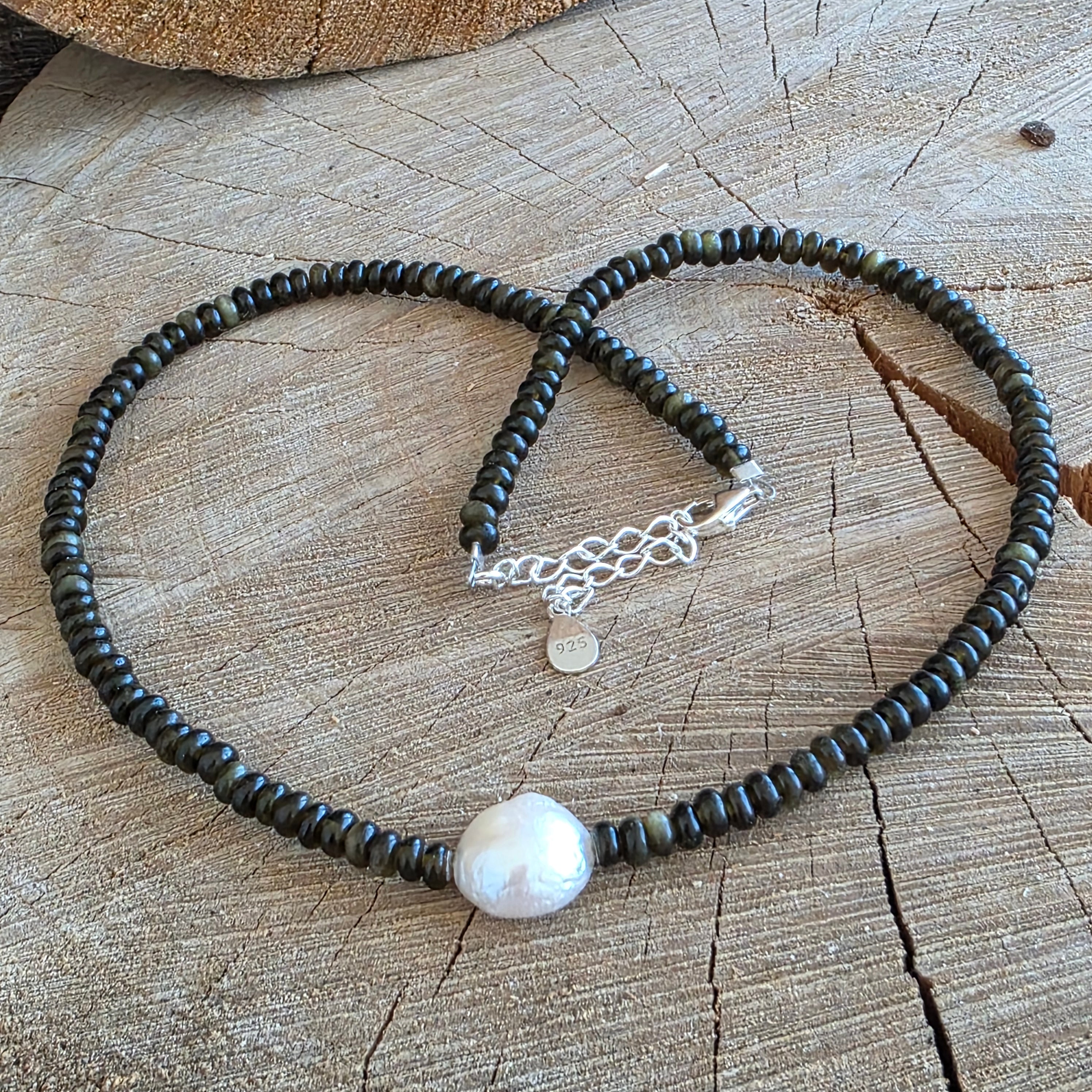 Diese Halskette ist nicht auffällig, sondern ein Schmuckstück mit diskreter und wohldosierter Wirkung. Ein Stück mit Persönlichkeit, geschaffen für diejenigen, die Steine mit starker visueller Struktur, zurückhaltender Eleganz und Schönheit schätzen, die sich durch subtile Kontraste und Tiefe ausdrückt.