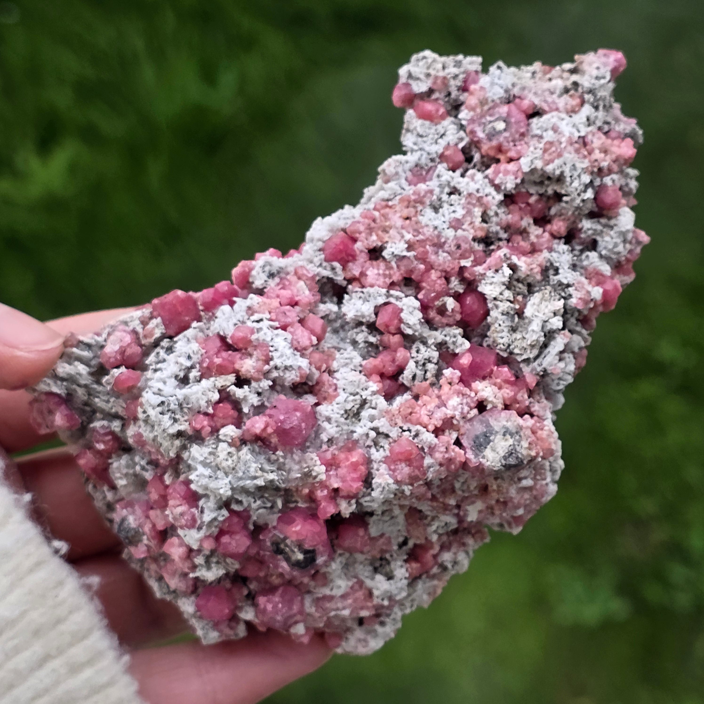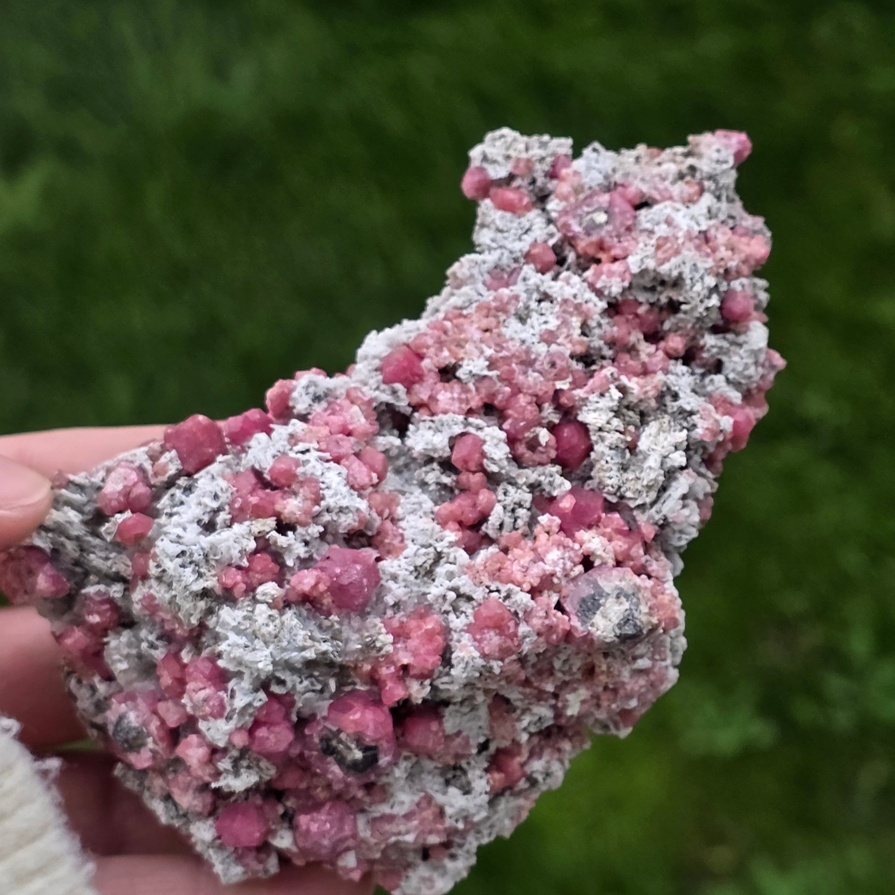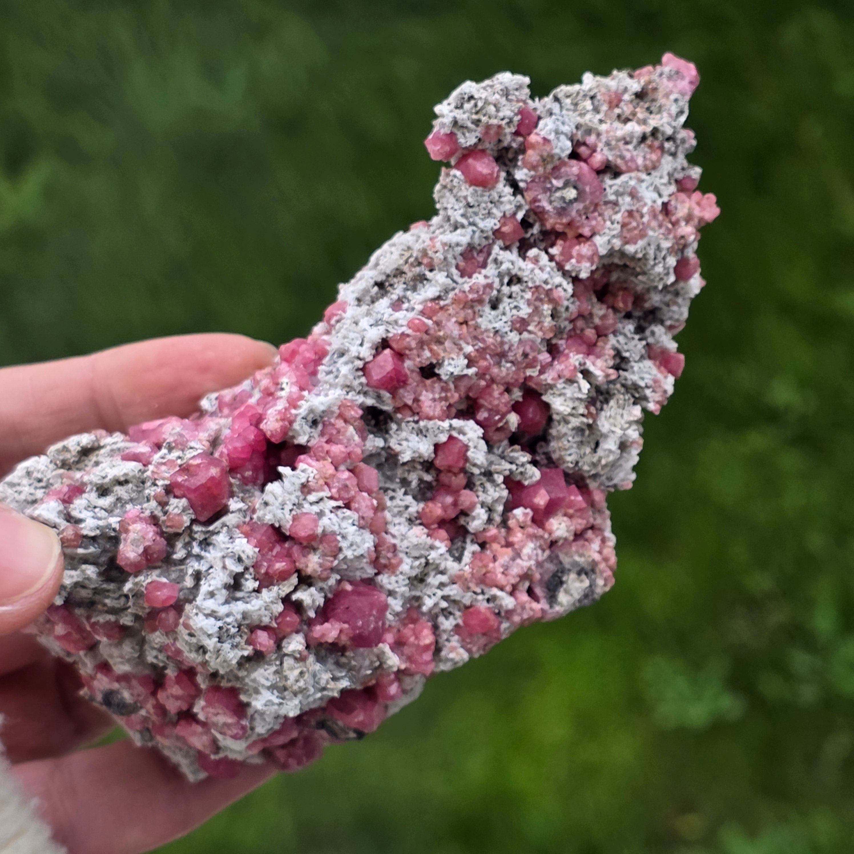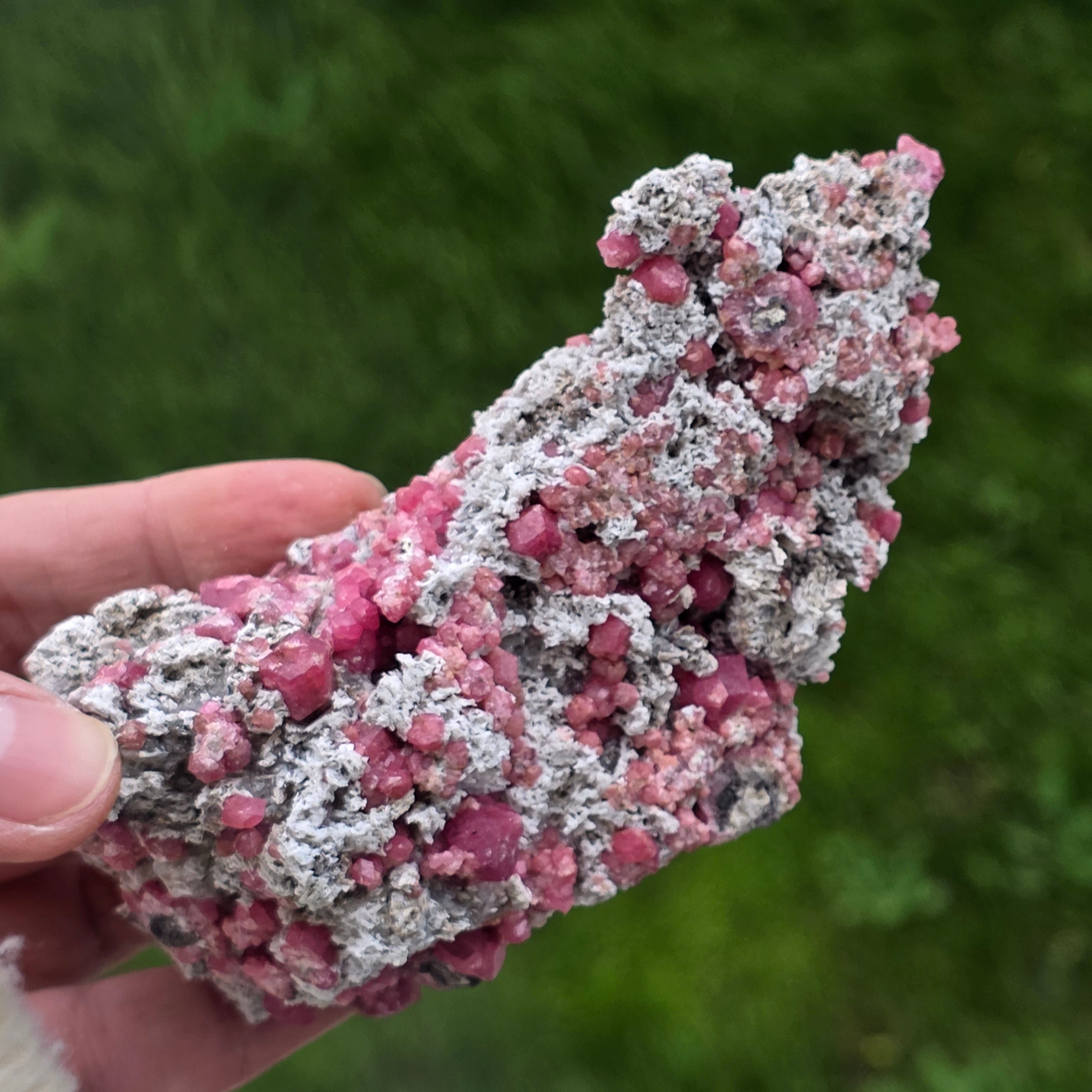 Cristalele de granat roz sunt vizibile direct în matrice, cu forme naturale bine definite, crescute organic în structura rocii. Contrastul dintre nuanțele calde ale granatului și textura brută a matricei oferă specimenului un aspect echilibrat și autentic, specific pieselor destinate colecției. Prezența matricei păstrează contextul de formare al mineralului, sporind atât valoarea estetică, cât și cea mineralogică.
