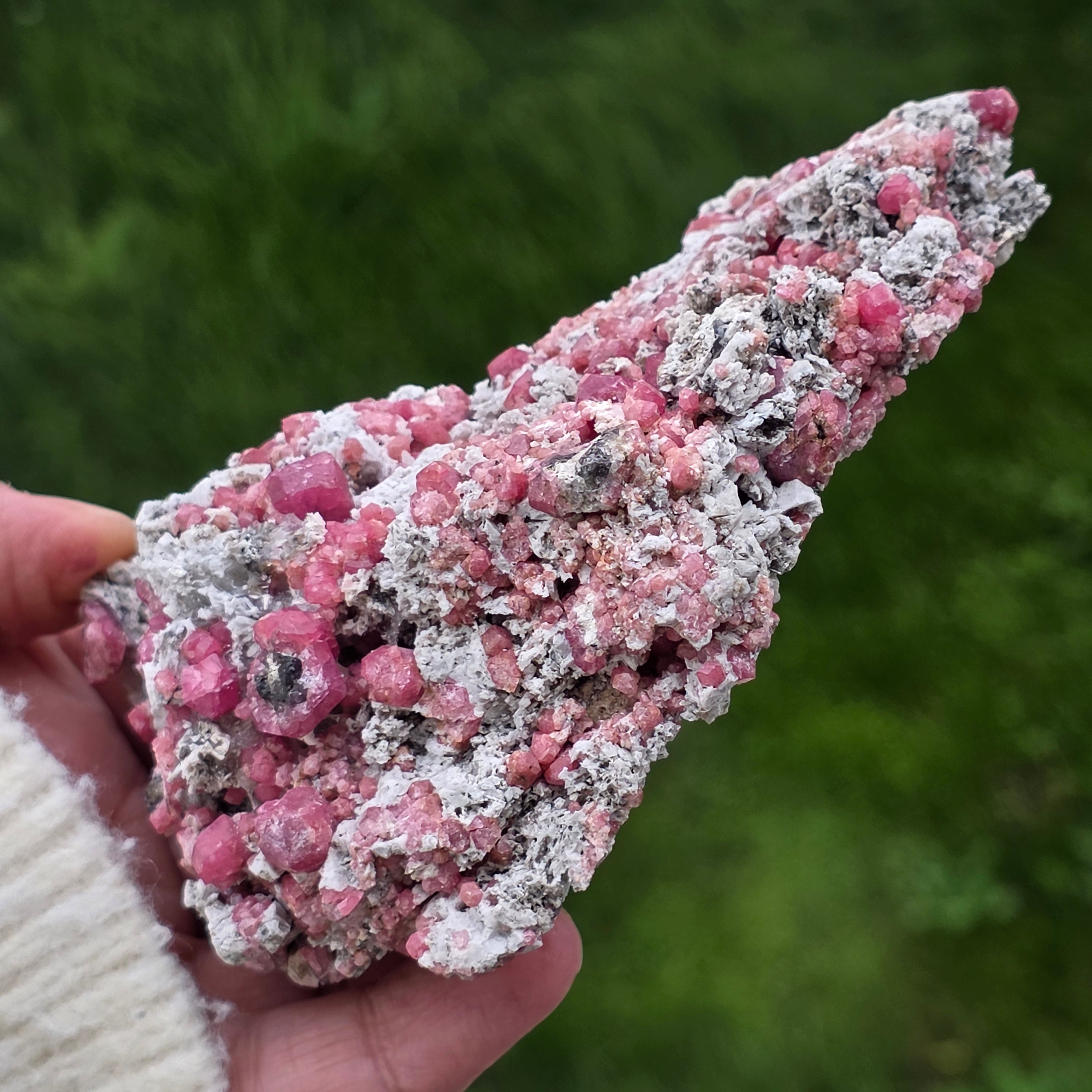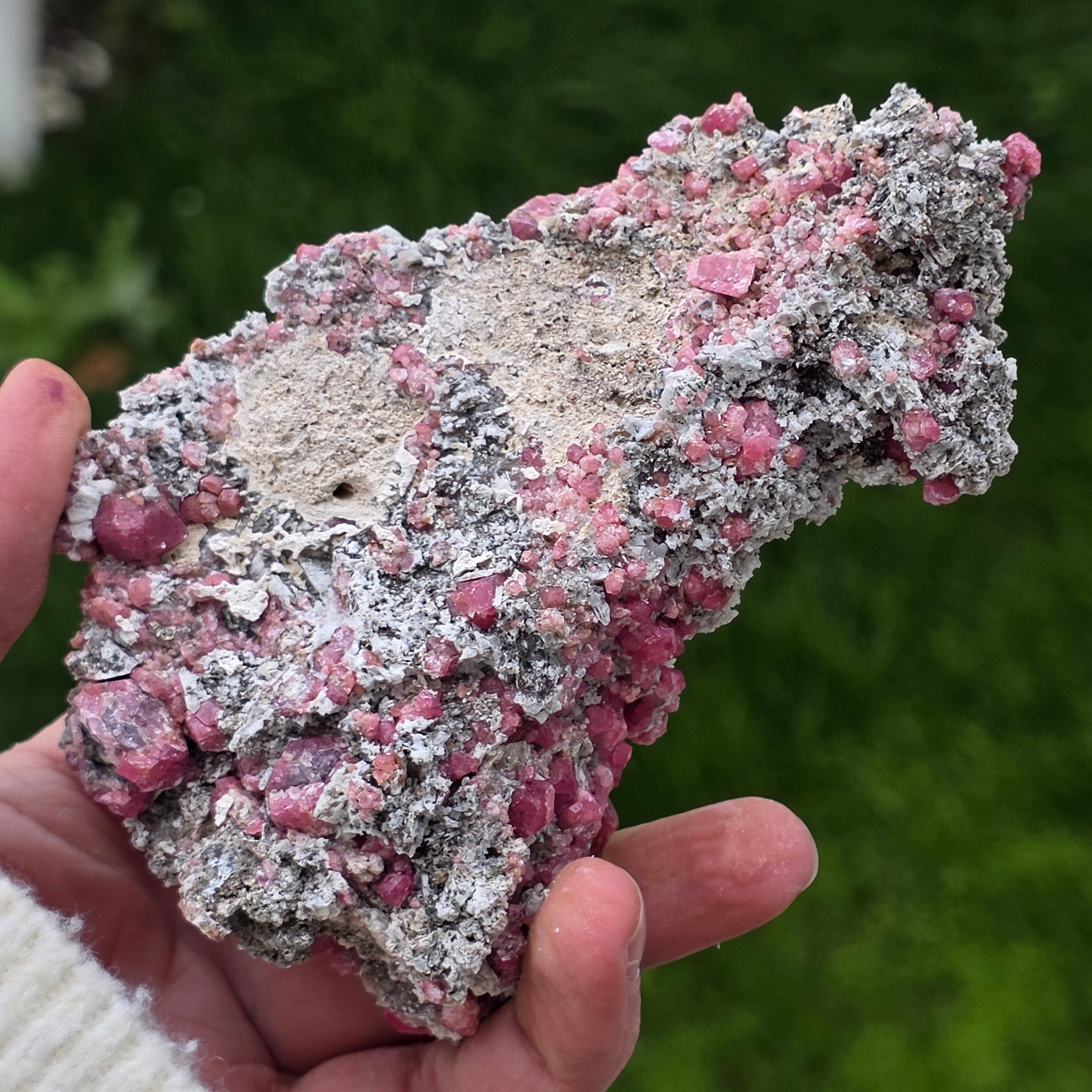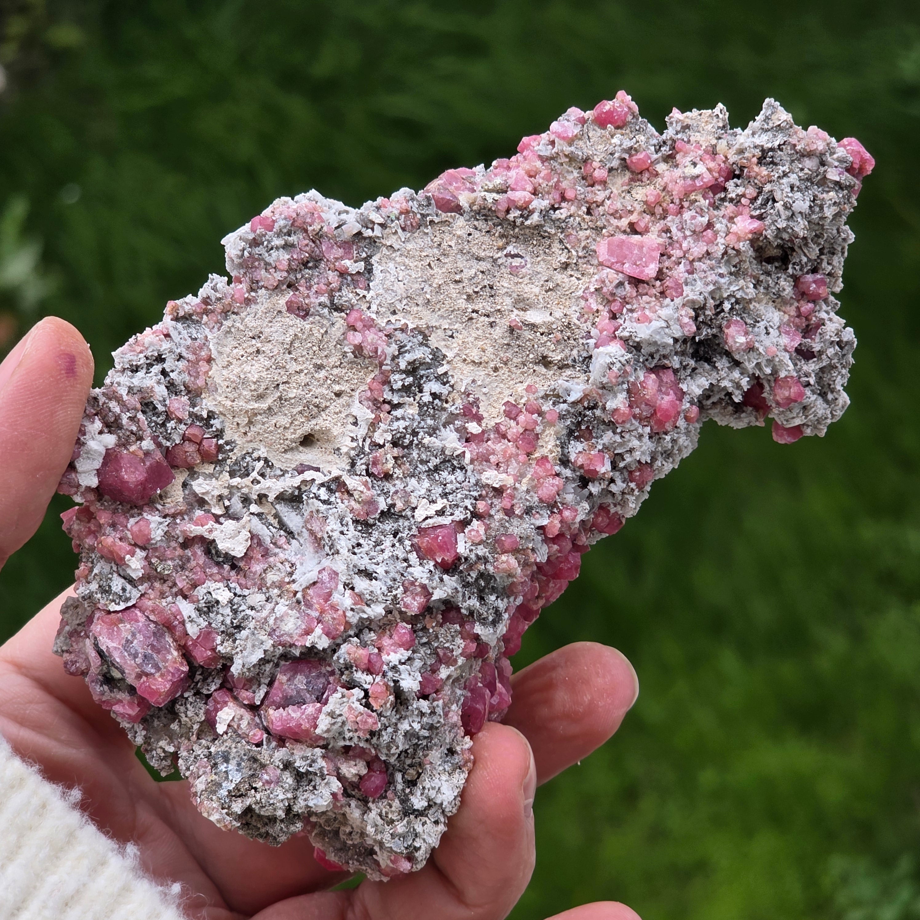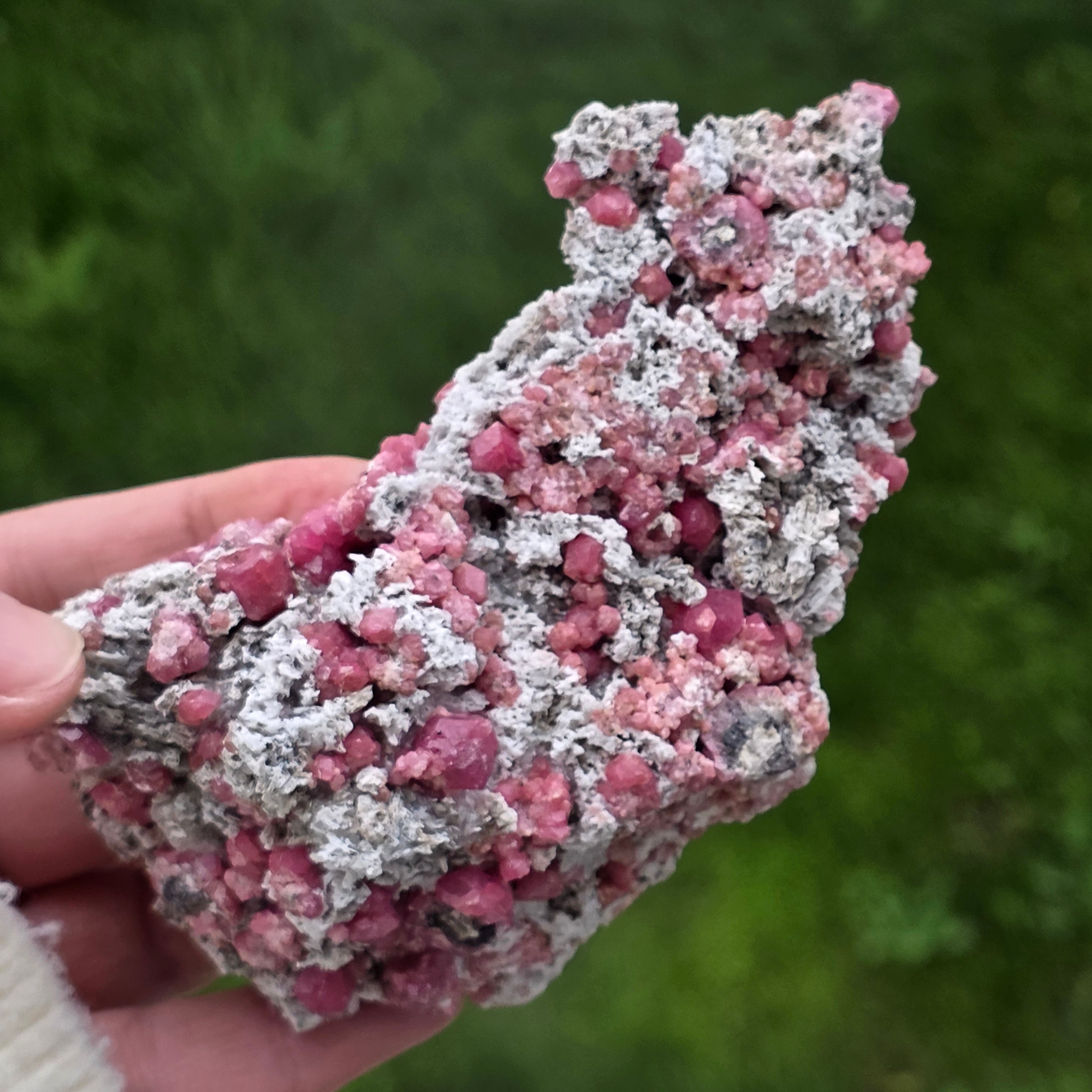 Cristalele de granat roz sunt vizibile direct în matrice, cu forme naturale bine definite, crescute organic în structura rocii. Contrastul dintre nuanțele calde ale granatului și textura brută a matricei oferă specimenului un aspect echilibrat și autentic, specific pieselor destinate colecției. Prezența matricei păstrează contextul de formare al mineralului, sporind atât valoarea estetică, cât și cea mineralogică.