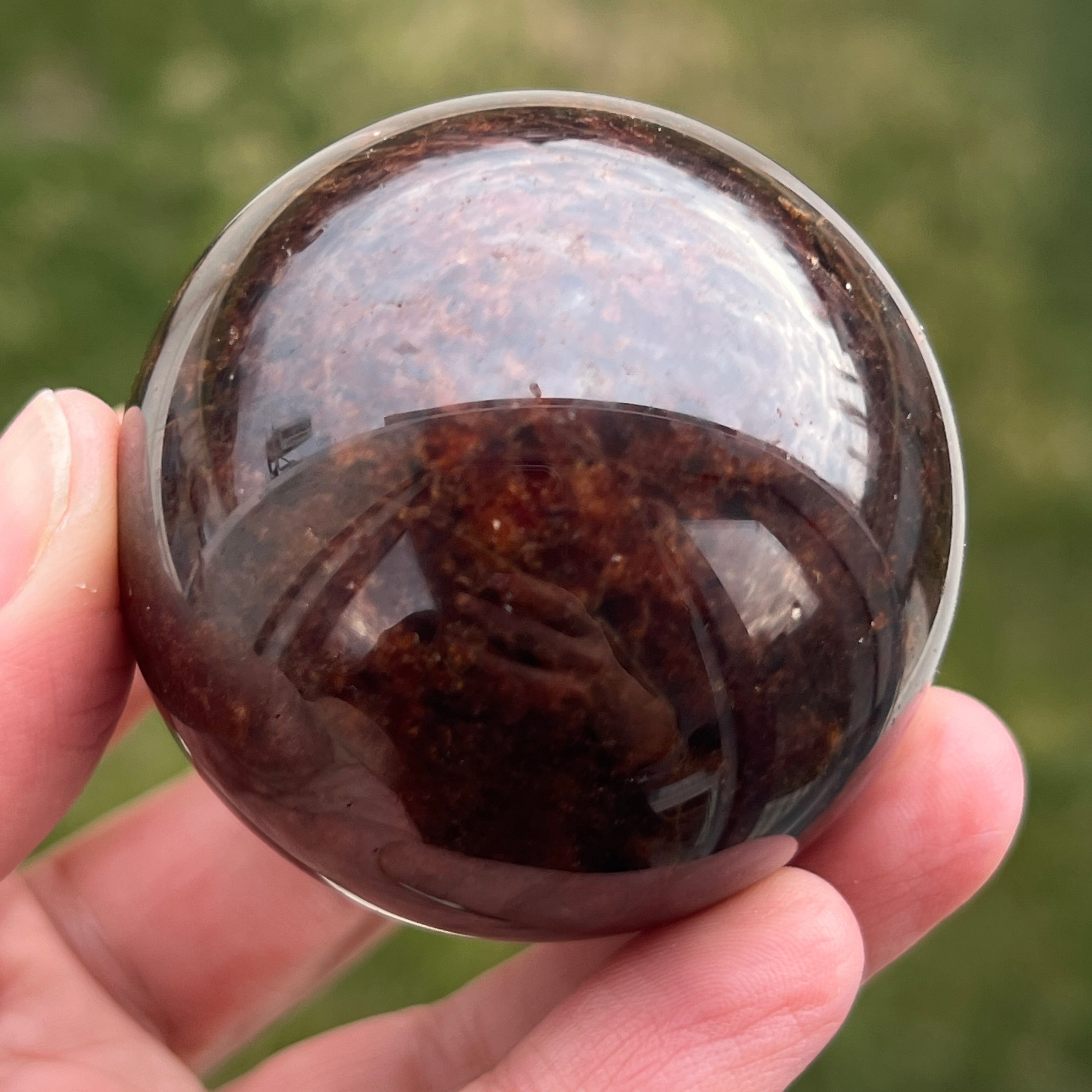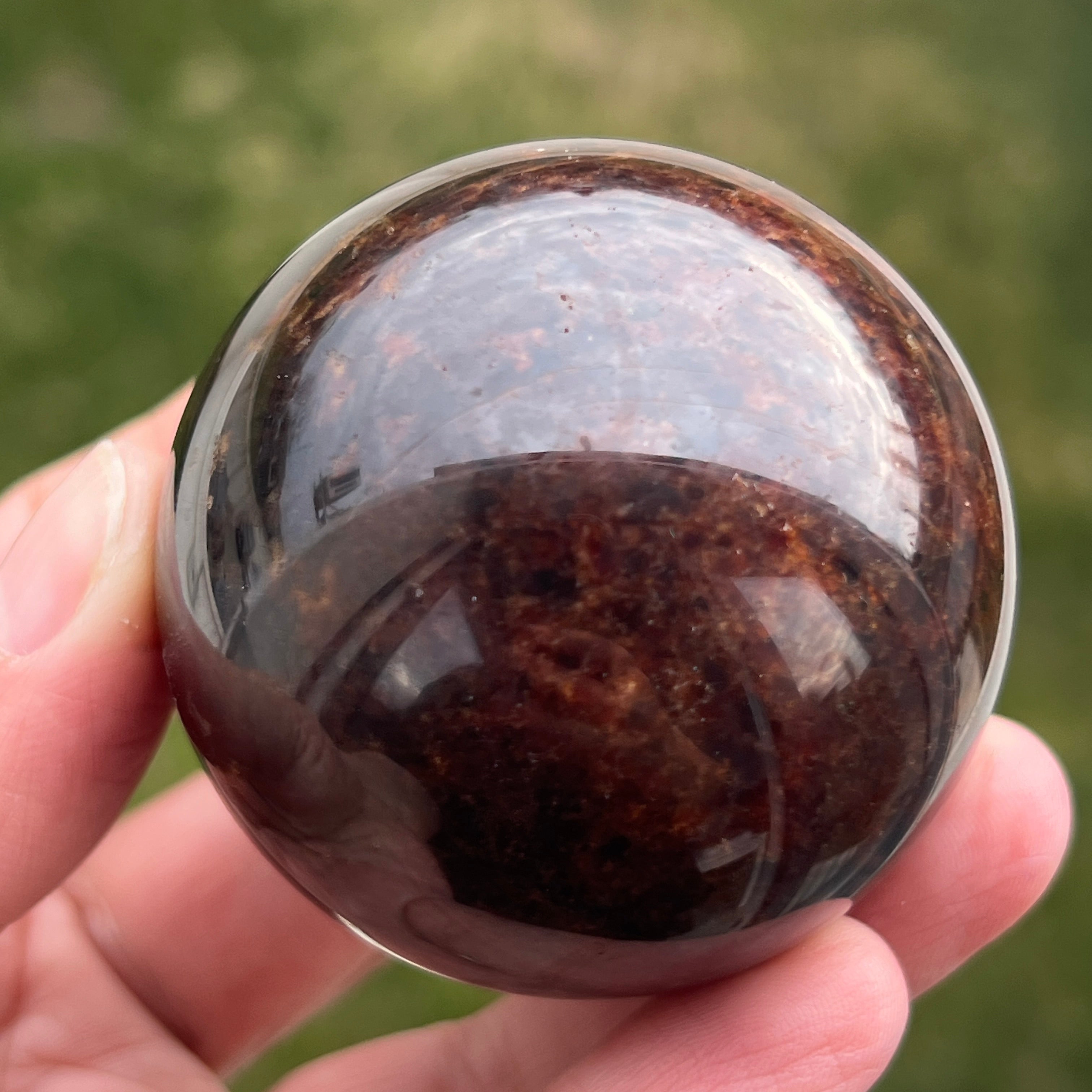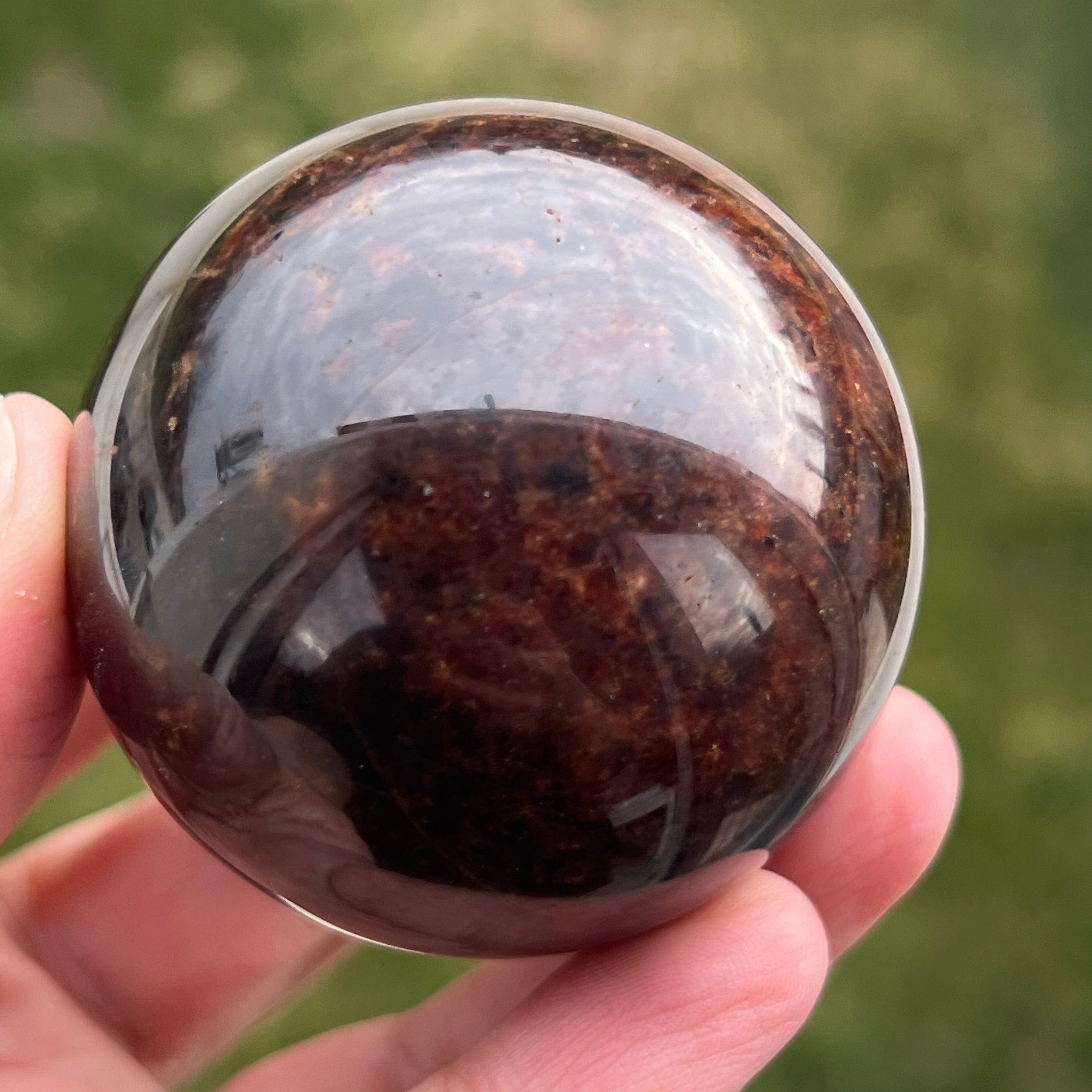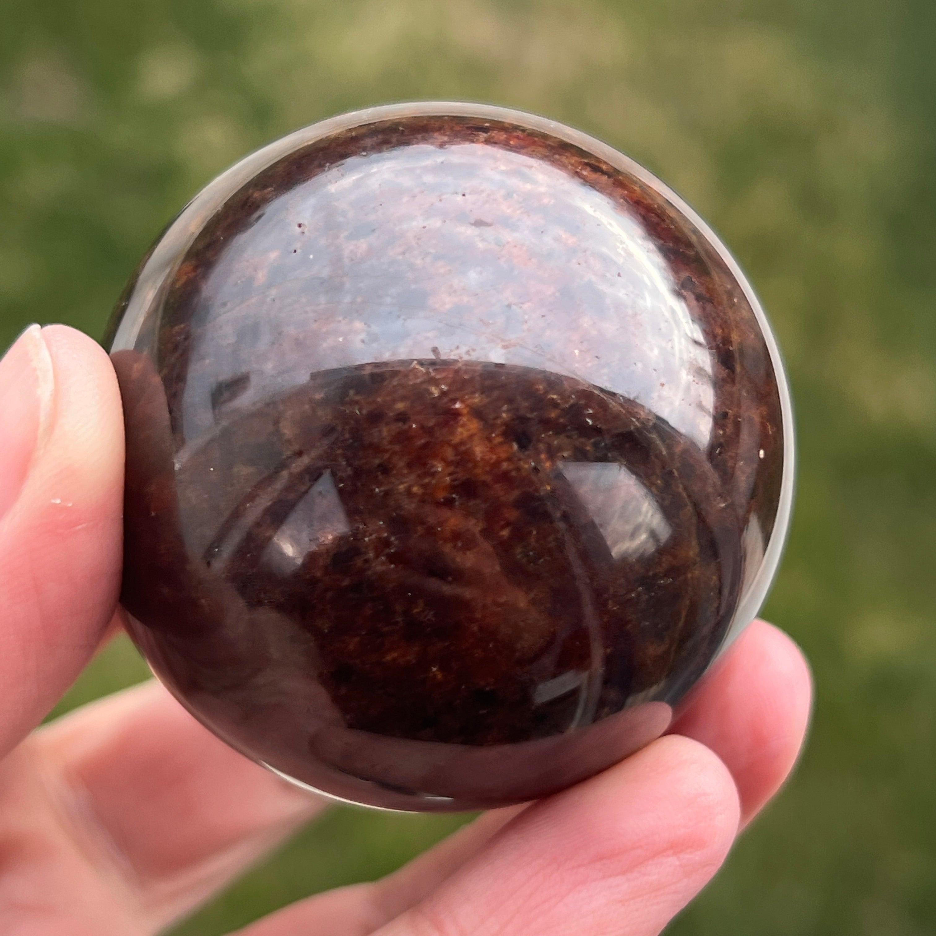 Die Granatkugel besteht aus einem Mineral aus der Gruppe der Silikate, das für seine kompakte Kristallstruktur und seine intensiven Farbtöne von Dunkelrot bis zu tiefen Burgundertönen bekannt ist. Aufgrund seiner Zusammensetzung ist Granat ein hartes und stabiles Material, was es für die Verarbeitung zu Formen wie der Kugel geeignet macht, bei der Textur und Farbe aus allen Blickwinkeln gleichmäßig betrachtet werden können.