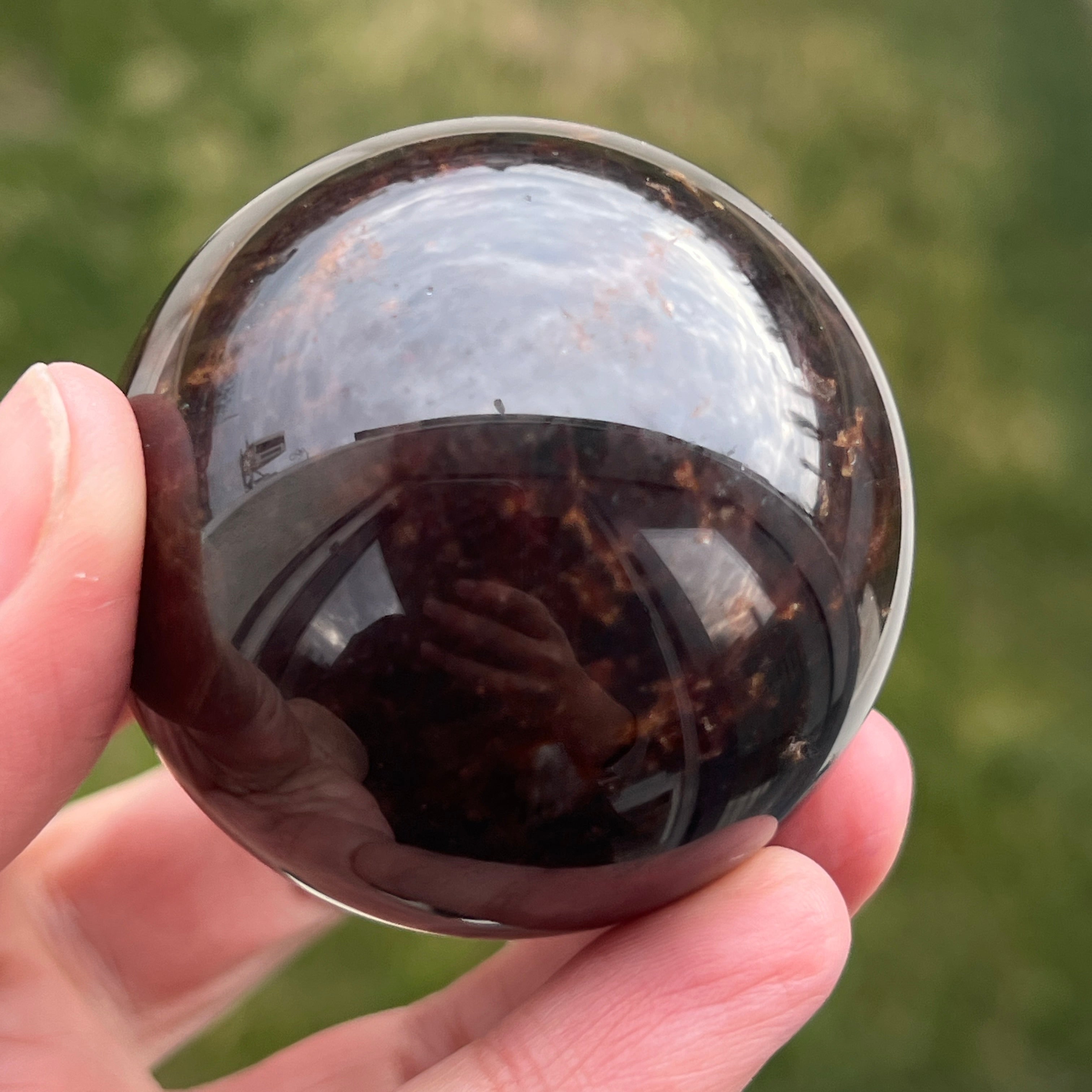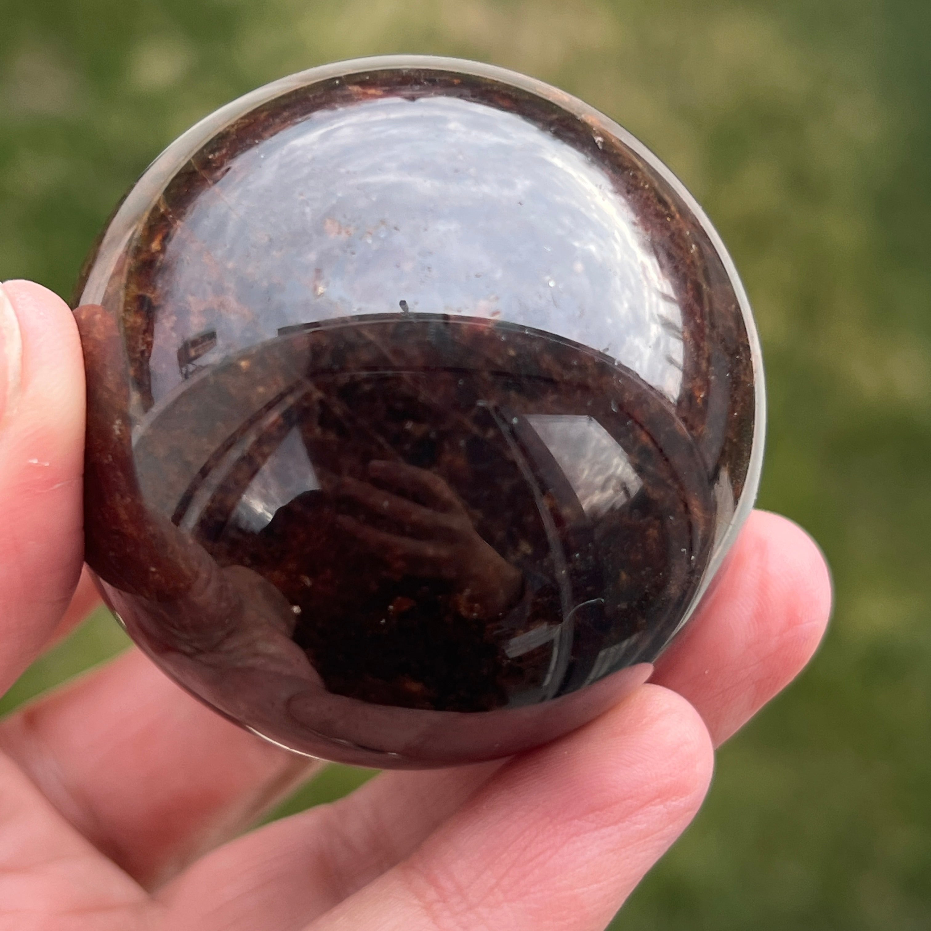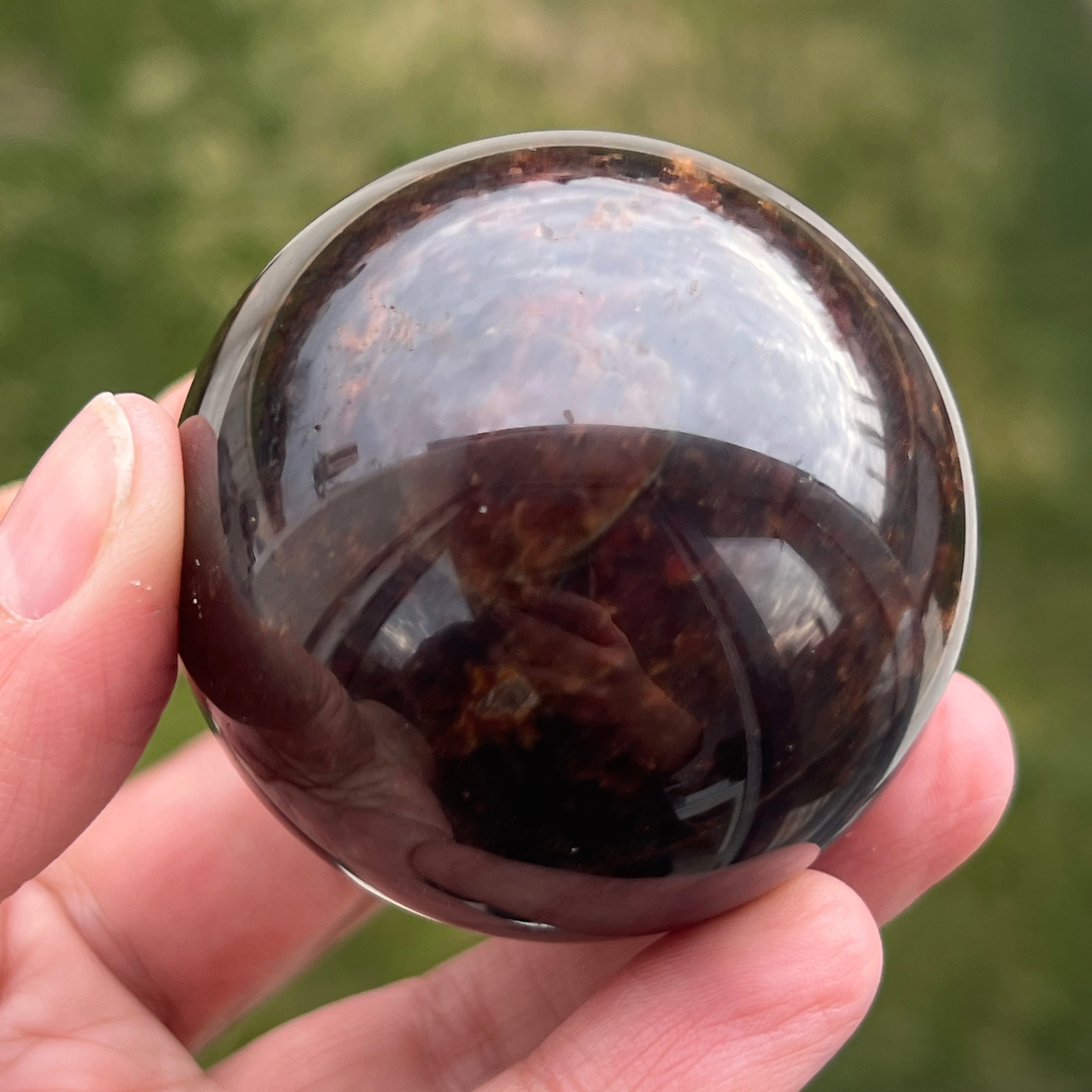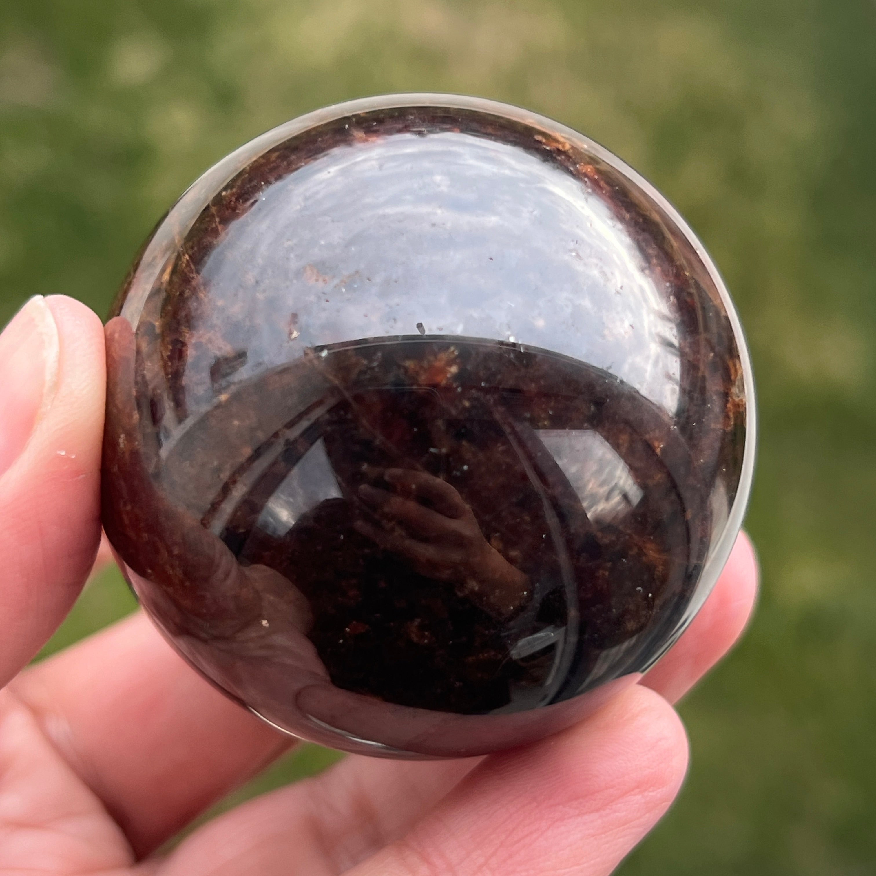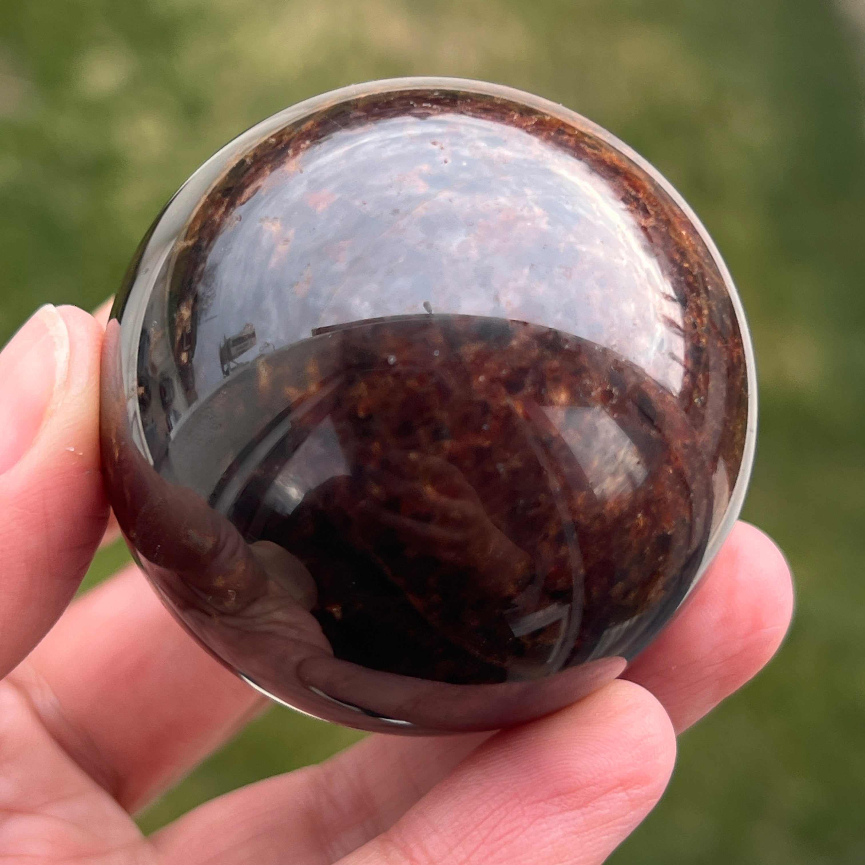 Die Granatkugel besteht aus einem Mineral aus der Gruppe der Silikate, das für seine kompakte Kristallstruktur und seine intensiven Farbtöne von Dunkelrot bis zu tiefen Burgundertönen bekannt ist. Aufgrund seiner Zusammensetzung ist Granat ein hartes und stabiles Material, was es für die Verarbeitung zu Formen wie der Kugel geeignet macht, bei der Textur und Farbe aus allen Blickwinkeln gleichmäßig betrachtet werden können.