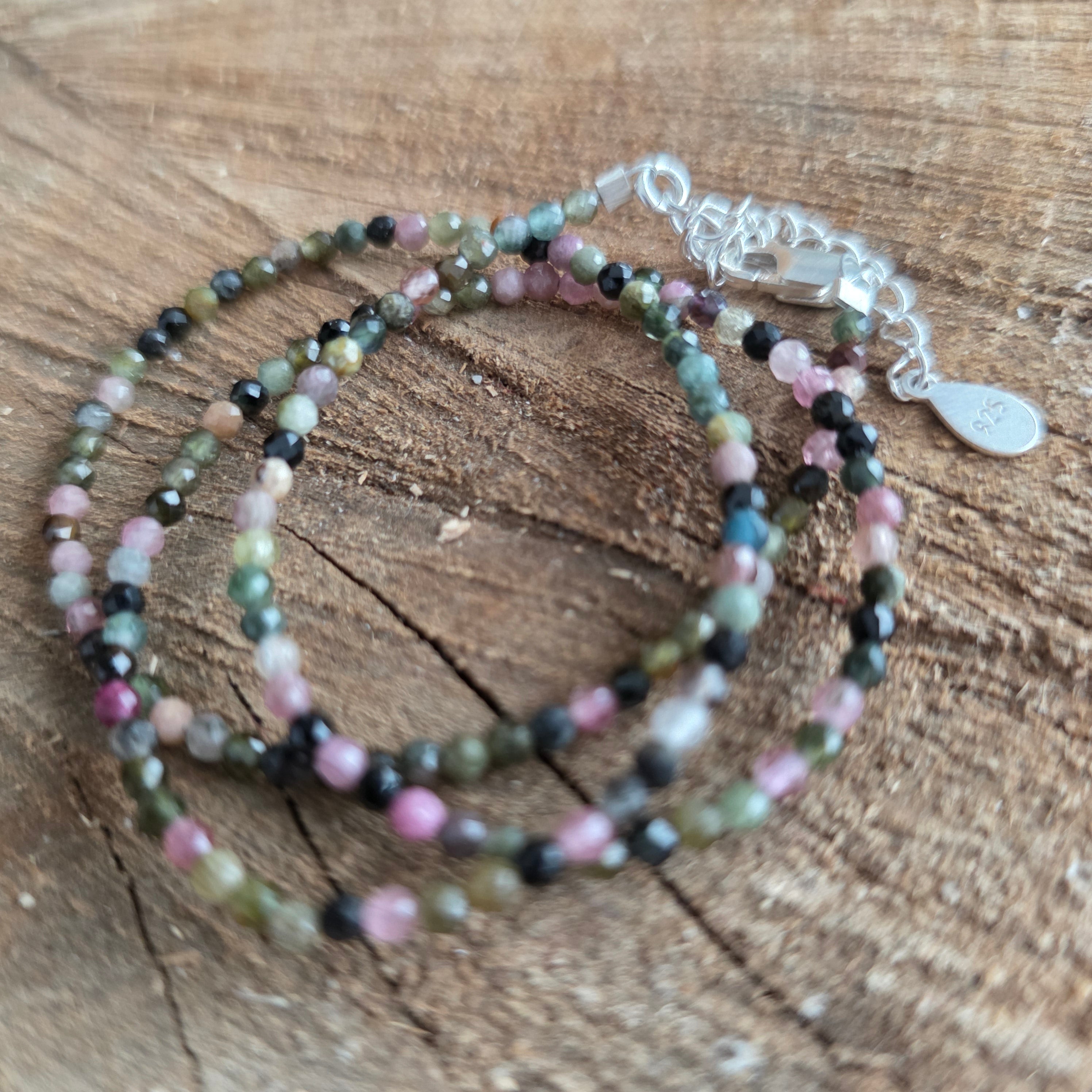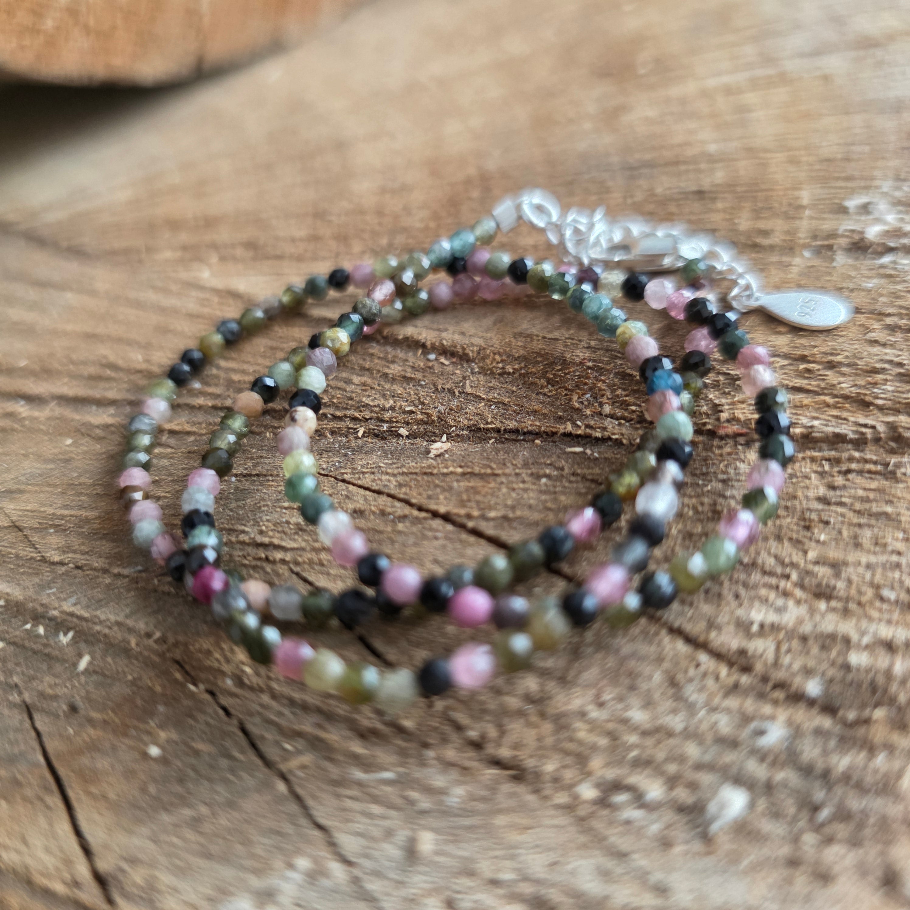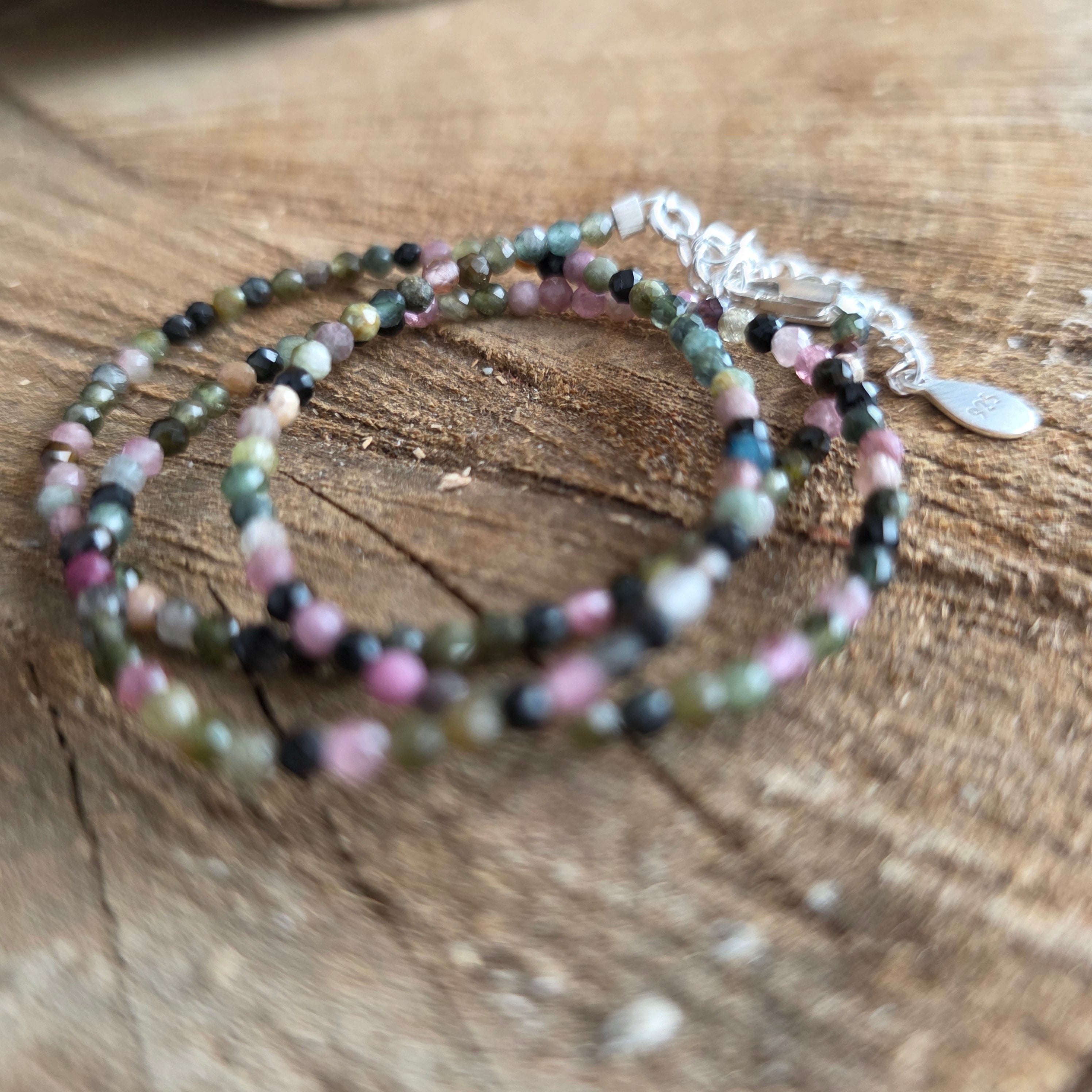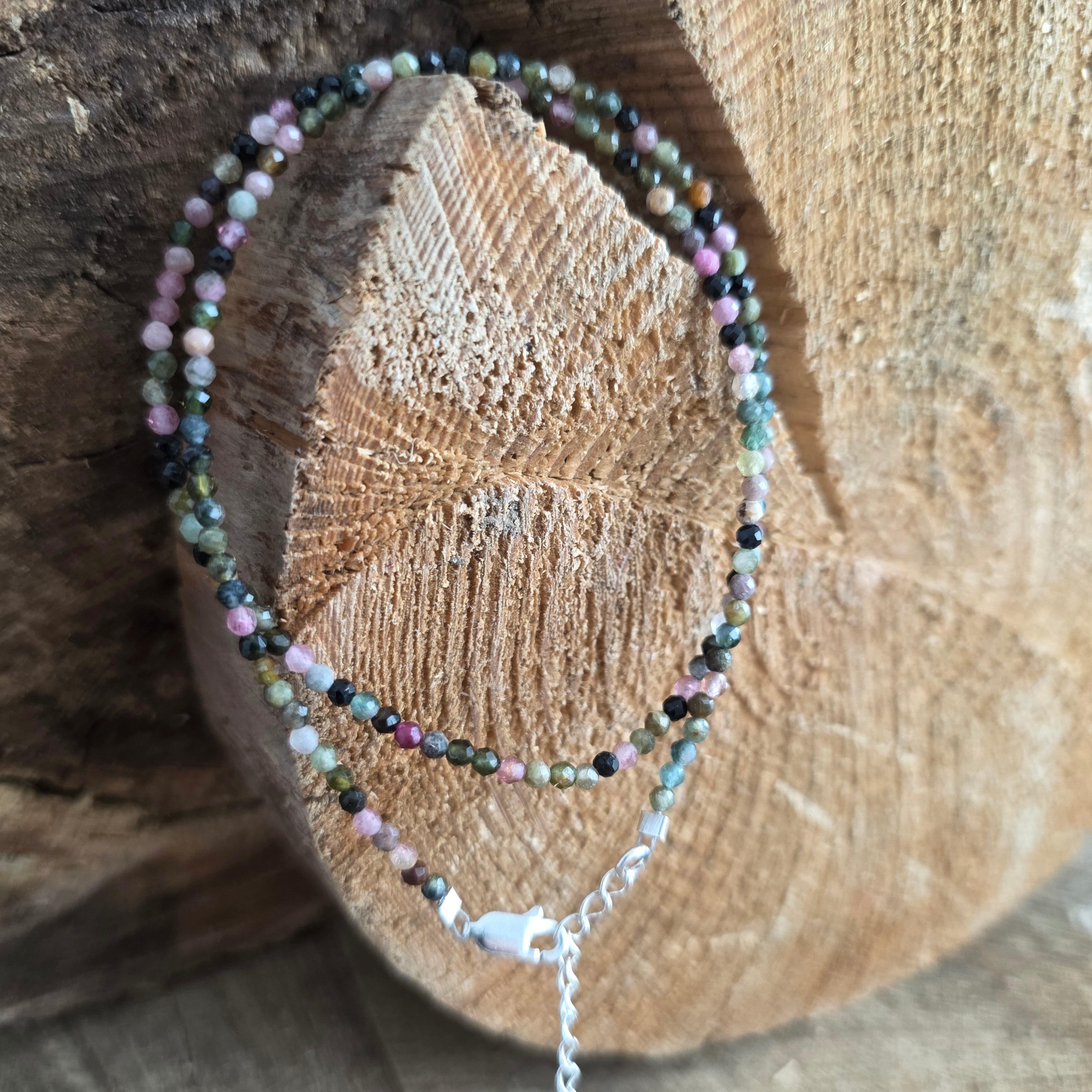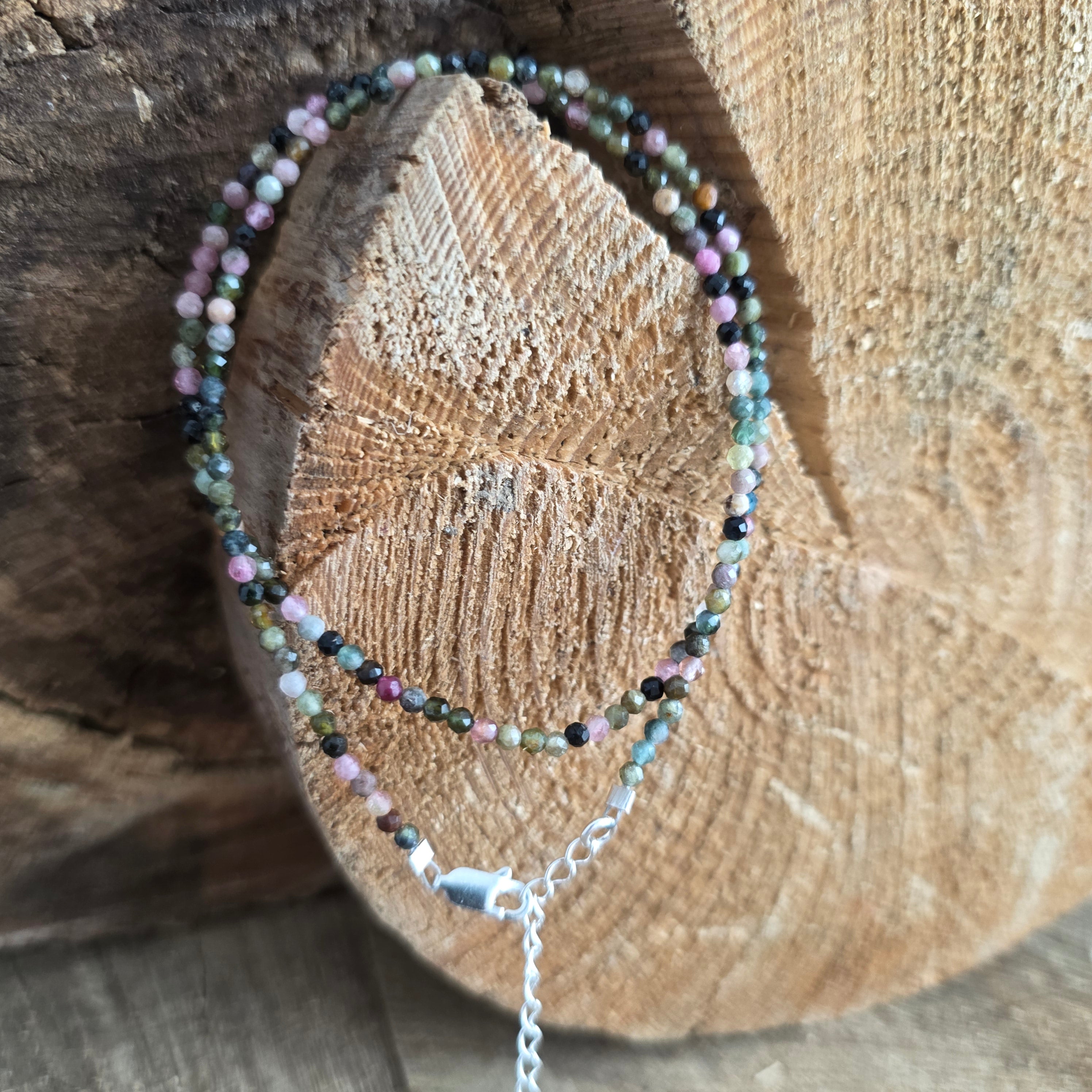 Eine Halskette, die Stärke mit der Schönheit der Vielfalt verbindet. 2 mm facettierter natürlicher Turmalin offenbart eine Symphonie aus erdigen und pastellfarbenen Farben, wie ein Herbstgarten, der im Licht eingefangen wird. Ihre feinen Facetten spiegeln jeden Farbton subtil wider und verleihen der Kette eine Atmosphäre von Raffinesse und voller Vitalität.