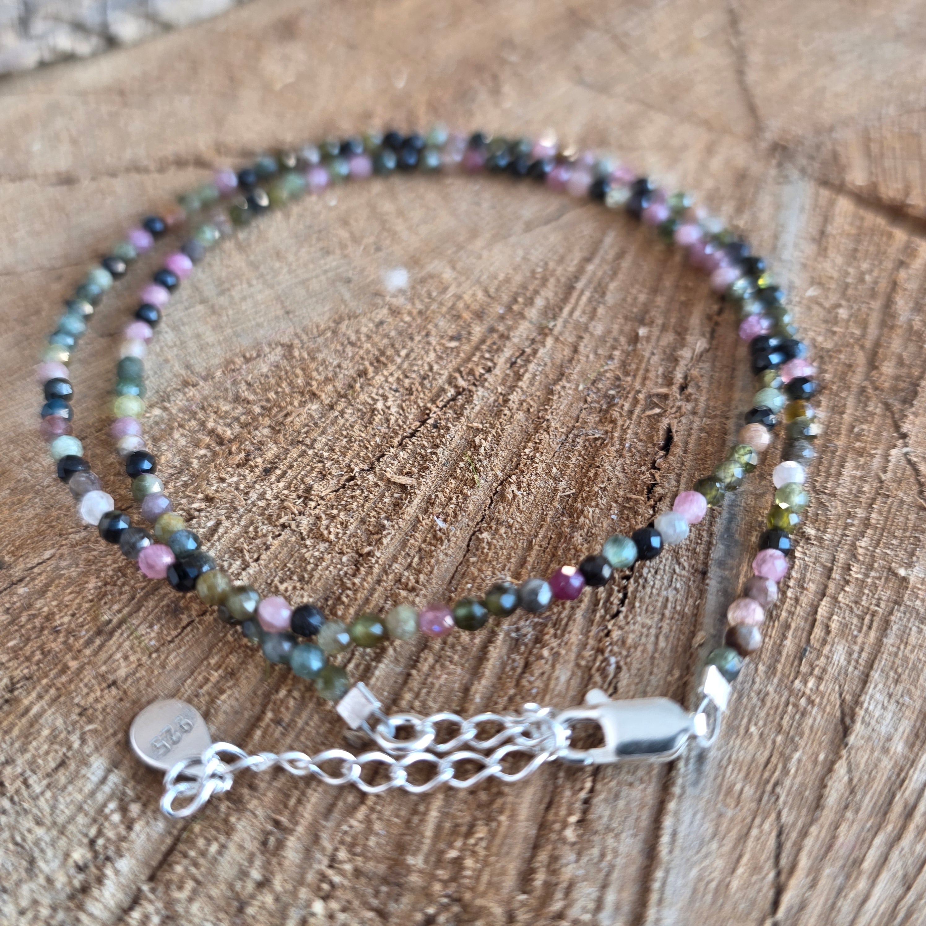 Materialien: natürlicher mehrfarbiger Turmalin (grün, rosa, gelb und ergänzende Töne), facettierte Perlen 2,5 mm, 925 Silber