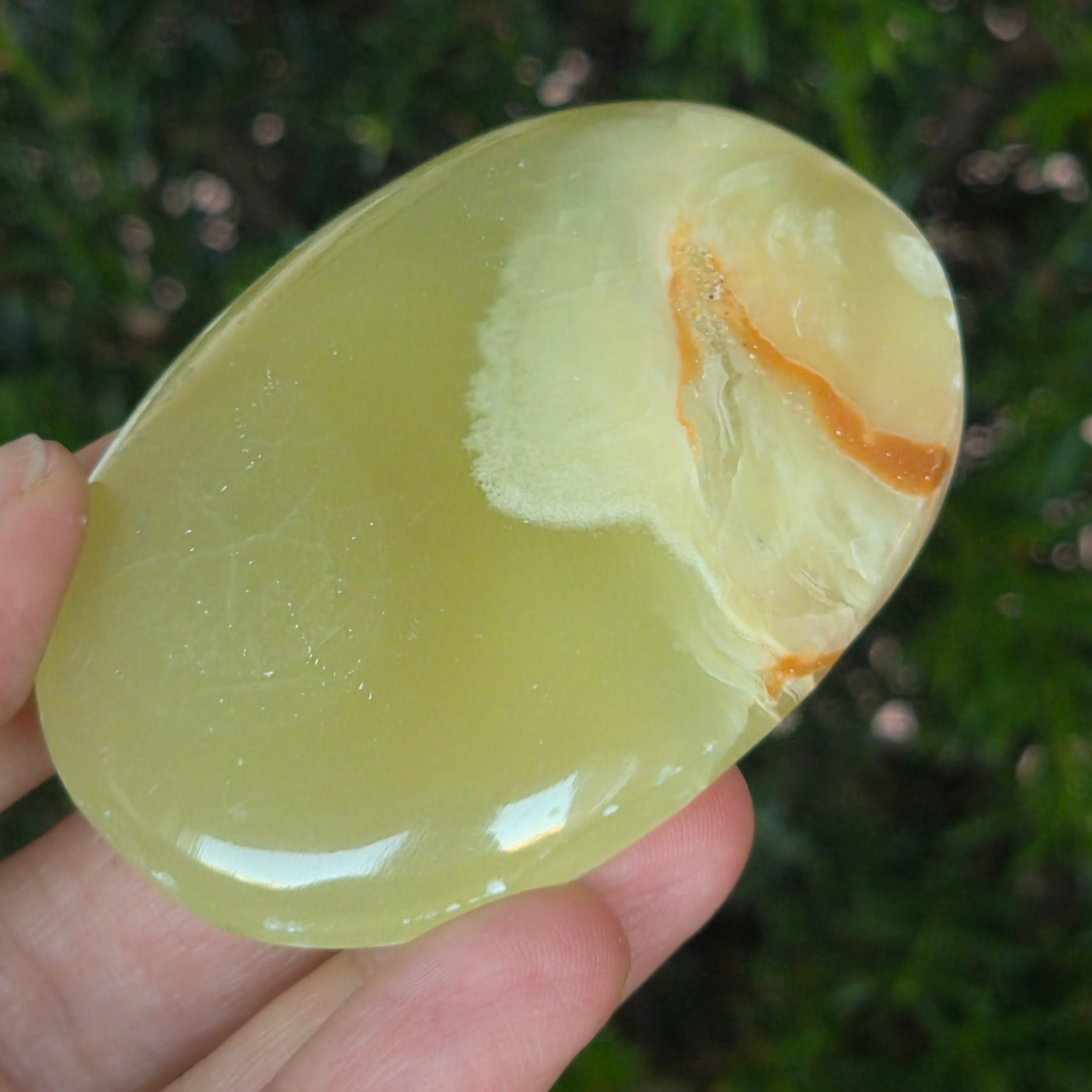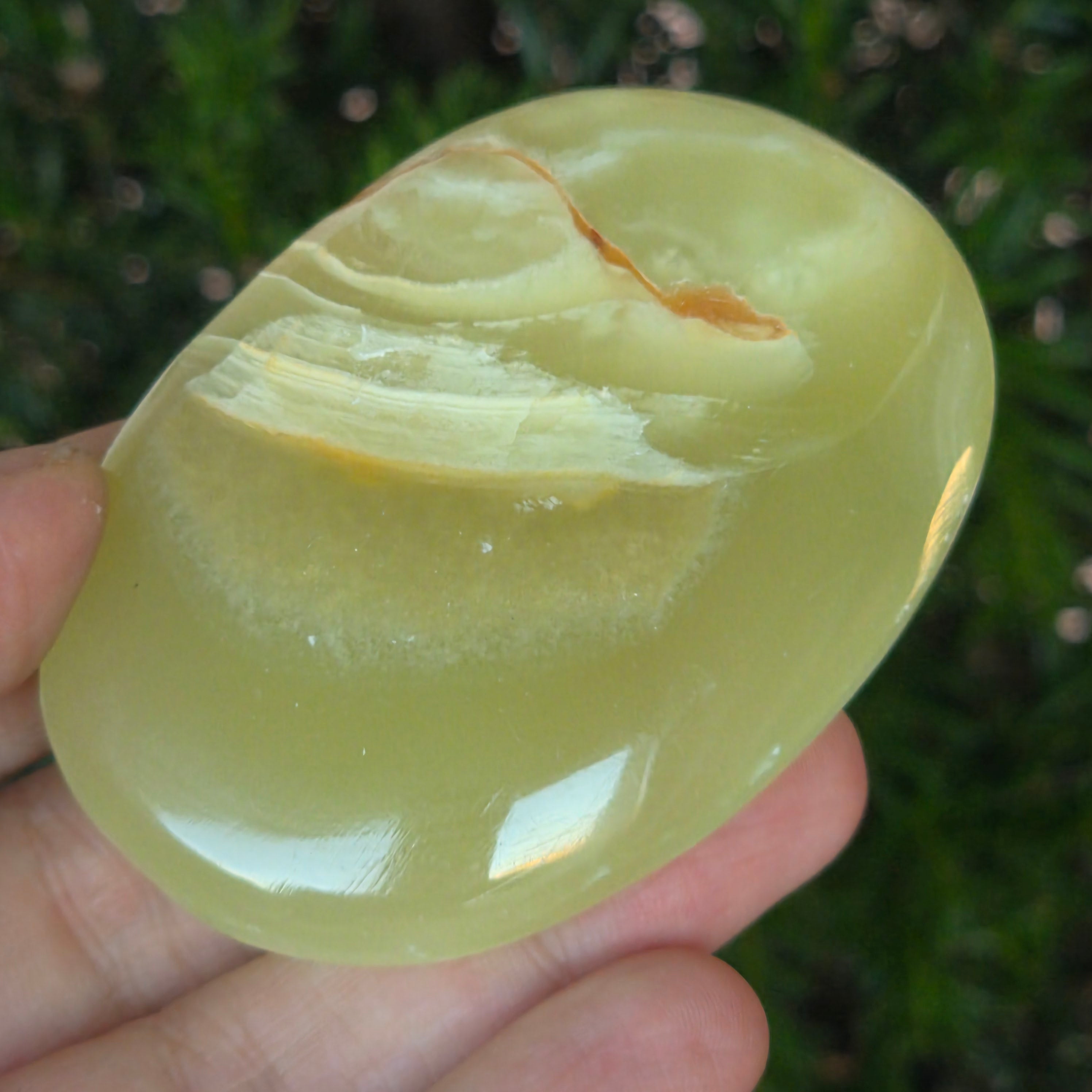 Handgehalten, dieses hier natürlicher grüner Onyx-Palmenstein Es wird zu einem Verbündeten des Gleichgewichts, einer stillen Erinnerung an die Harmonie zwischen Körper und Geist. Es ist ideal für Meditation, Entspannung oder einfach als Dekorationsobjekt mit sanfter und raffinierter Energie.