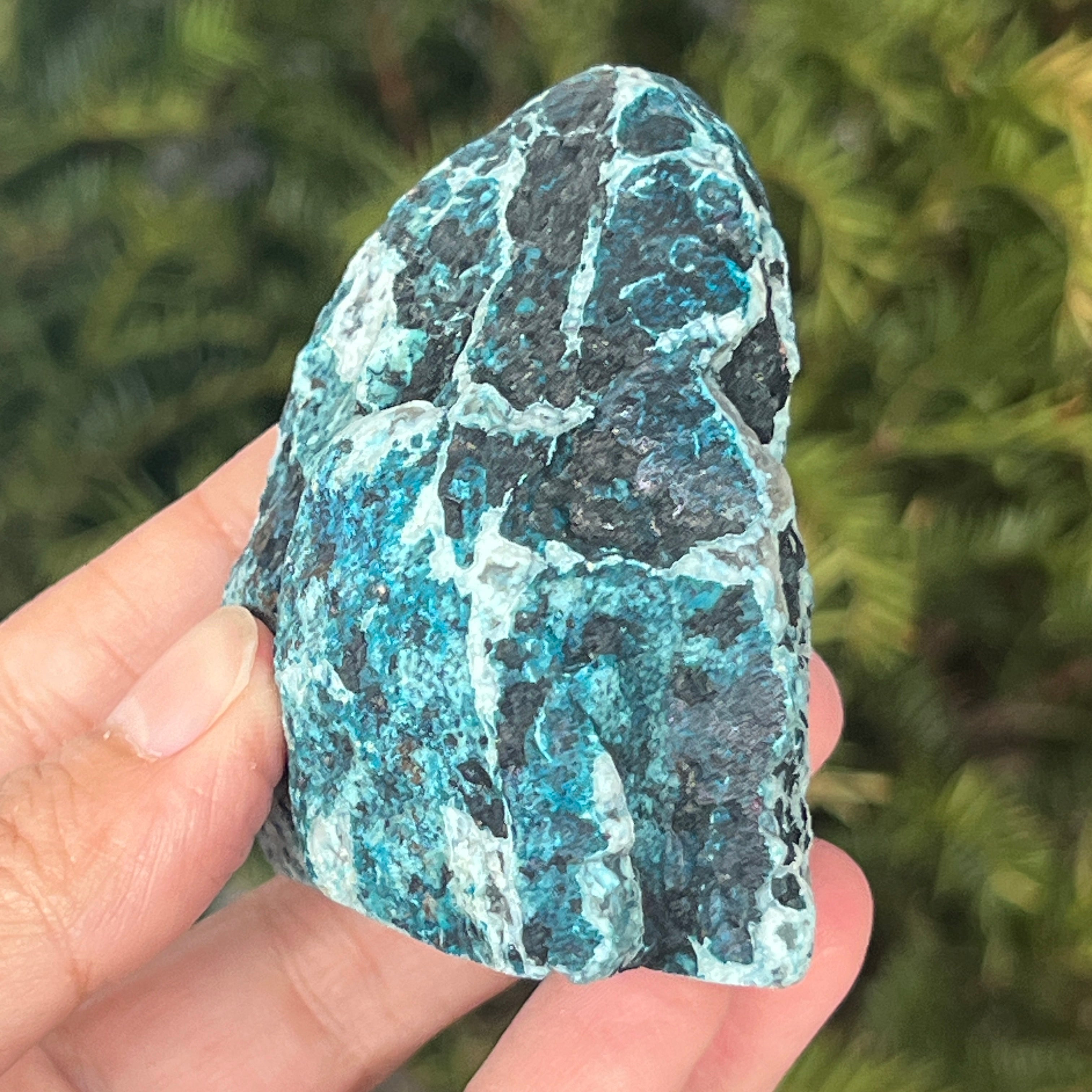 Der grün-blauliche Achat ist eine Calcedon-Varietät mit geschichteter Struktur, die durch aufeinanderfolgende Siliziumablagerungen in geologischen Hohlräumen entsteht. Seine Töne zwischen Grün und Blau betonen die natürlichen Bänder des Achats. Er wird für die Harmonie seiner Farben und die Symbolik geschätzt, die mit innerem Gleichgewicht und emotionaler Ruhe verbunden ist.