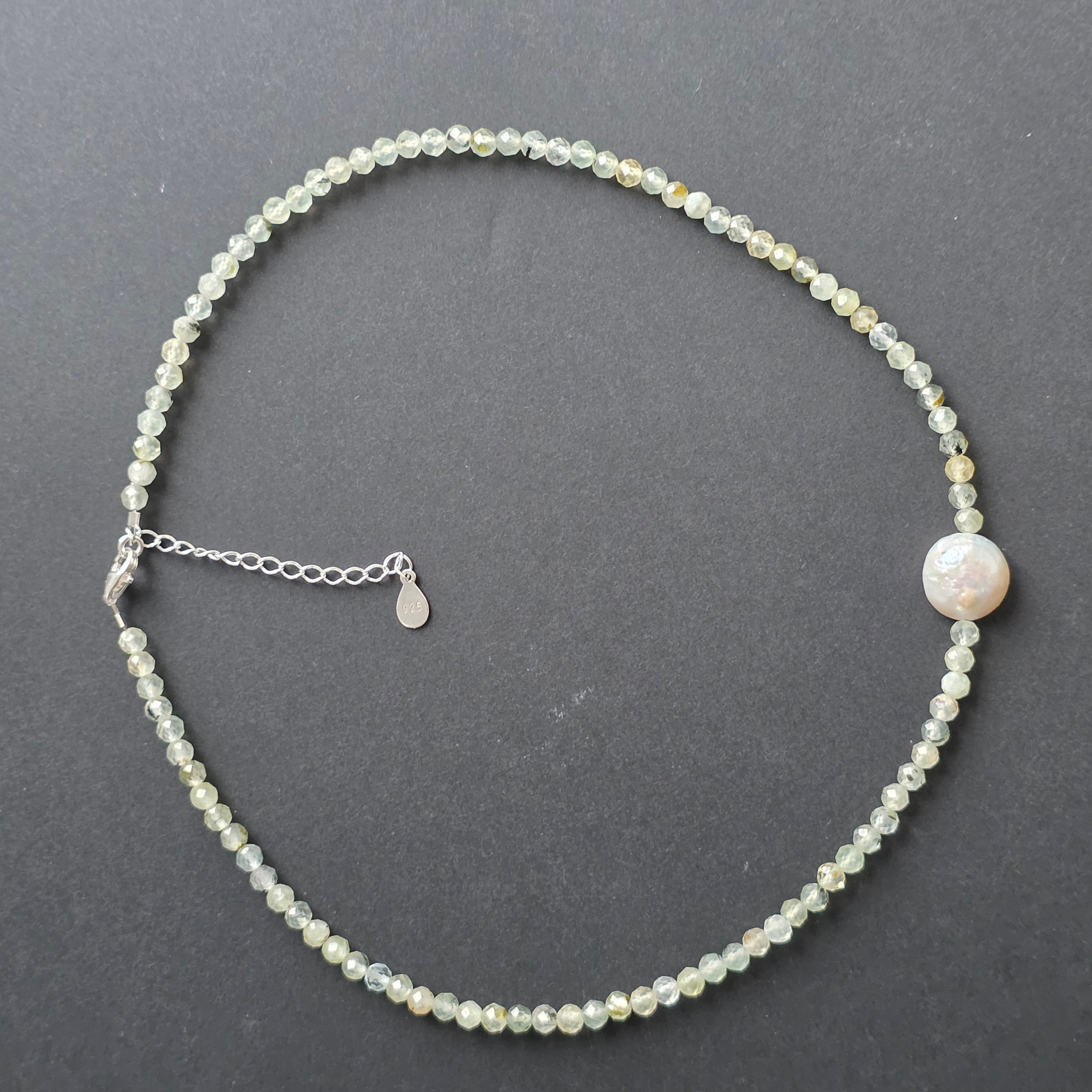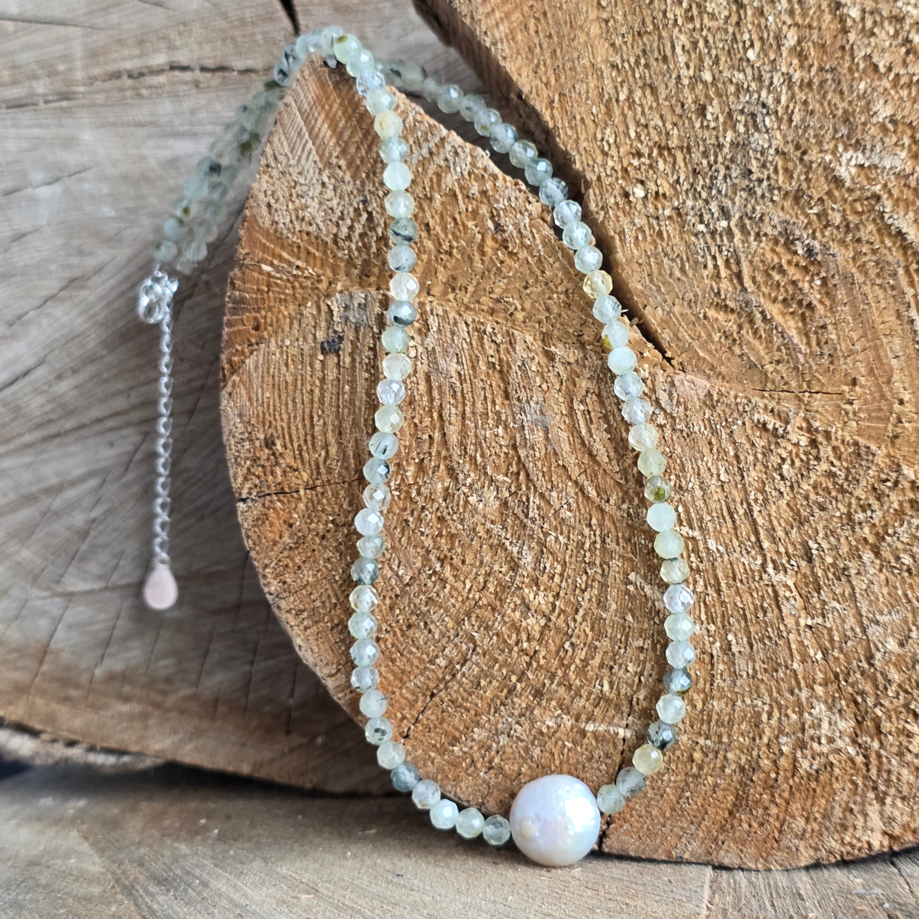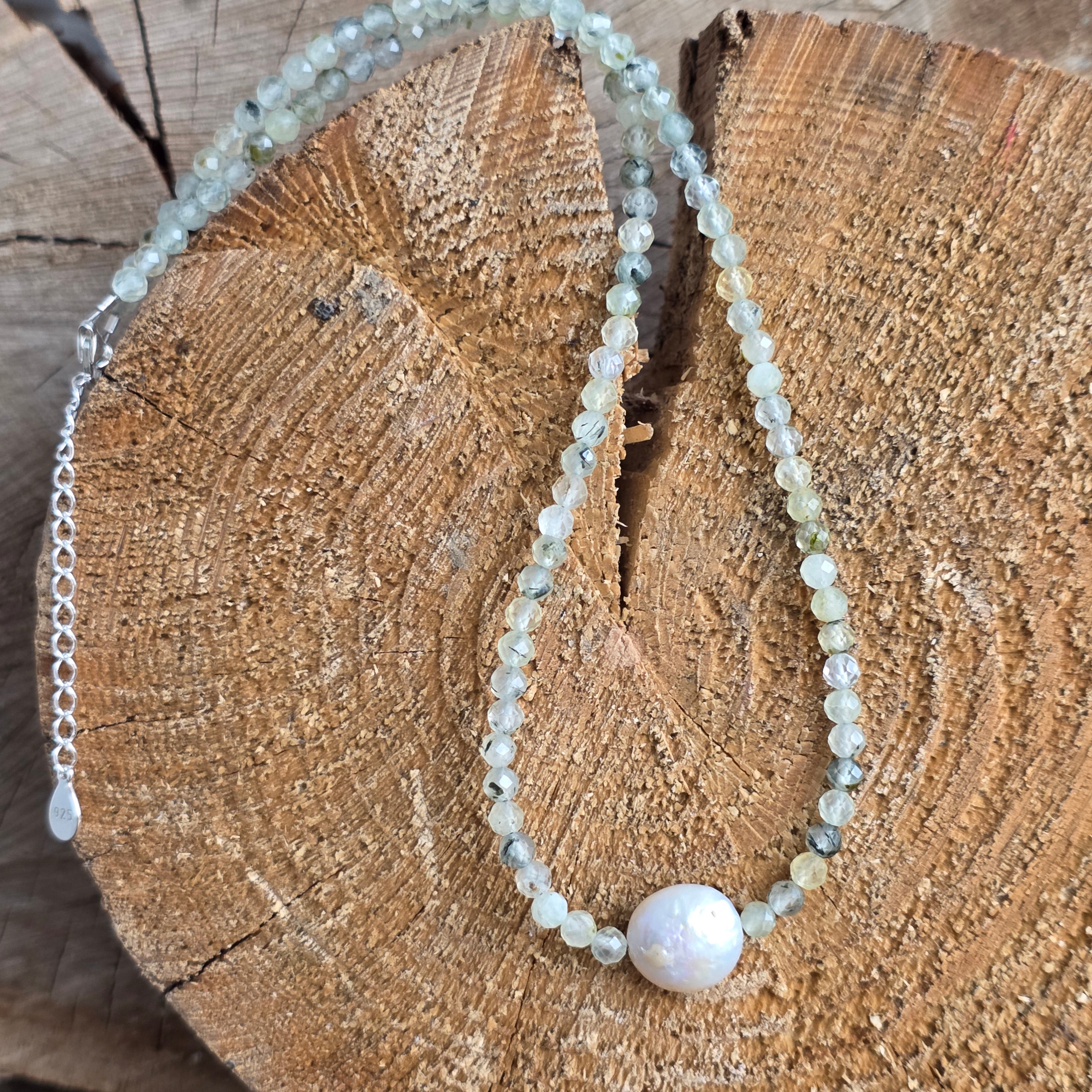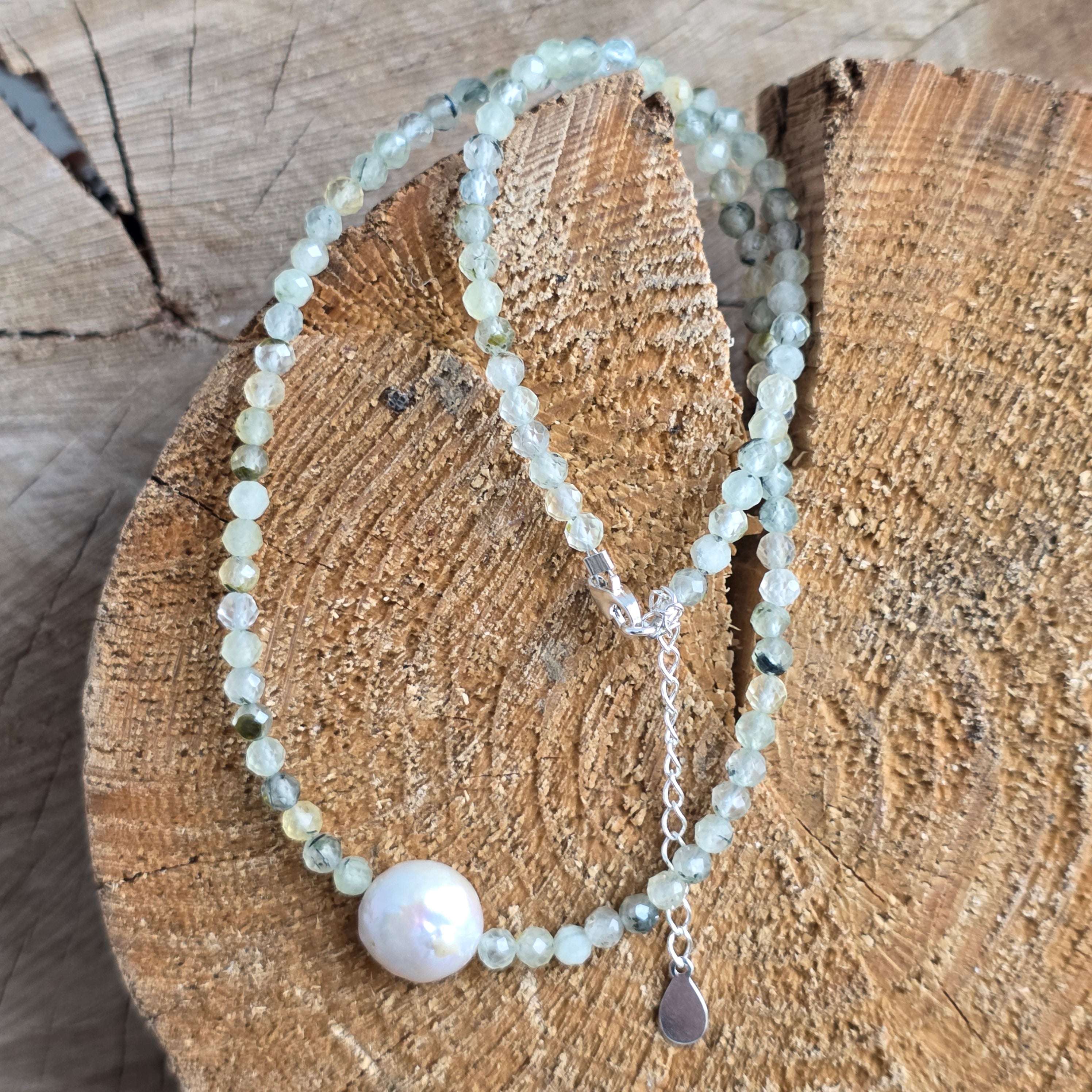 Eine zarte und leuchtende Halskette, gefertigt aus 4 mm facettierten Prehnitkugeln, fein in einem ruhigen und ausgewogenen Rhythmus angeordnet. Im Zentrum der Komposition wird eine natürliche Perle von etwa 1 cm zum Ruhe- und Feinsinnspunkt, die dem Schmuckstück eine Note zeitloser Eleganz verleiht.