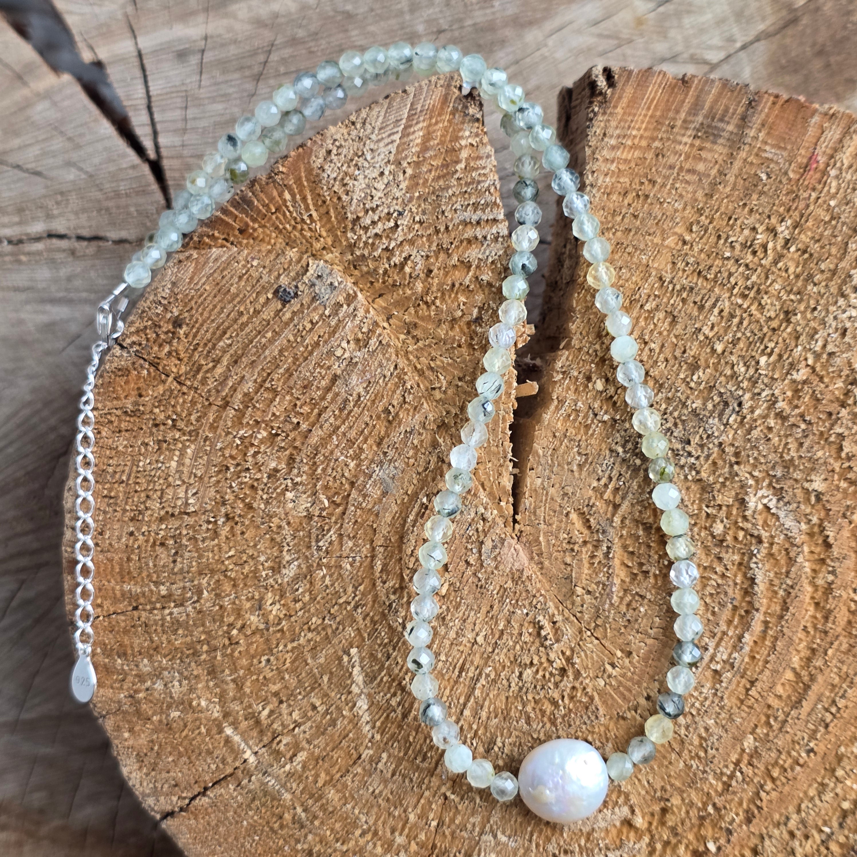Materialien: naturfarbener facettierter Prehnit 4 mm, natürliche Perle Akzent ca. 1 cm, 925 Silber