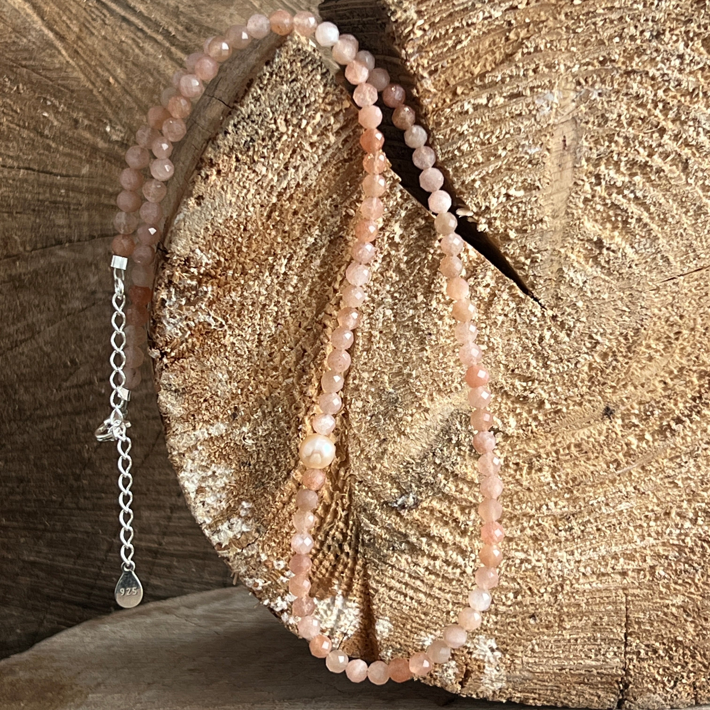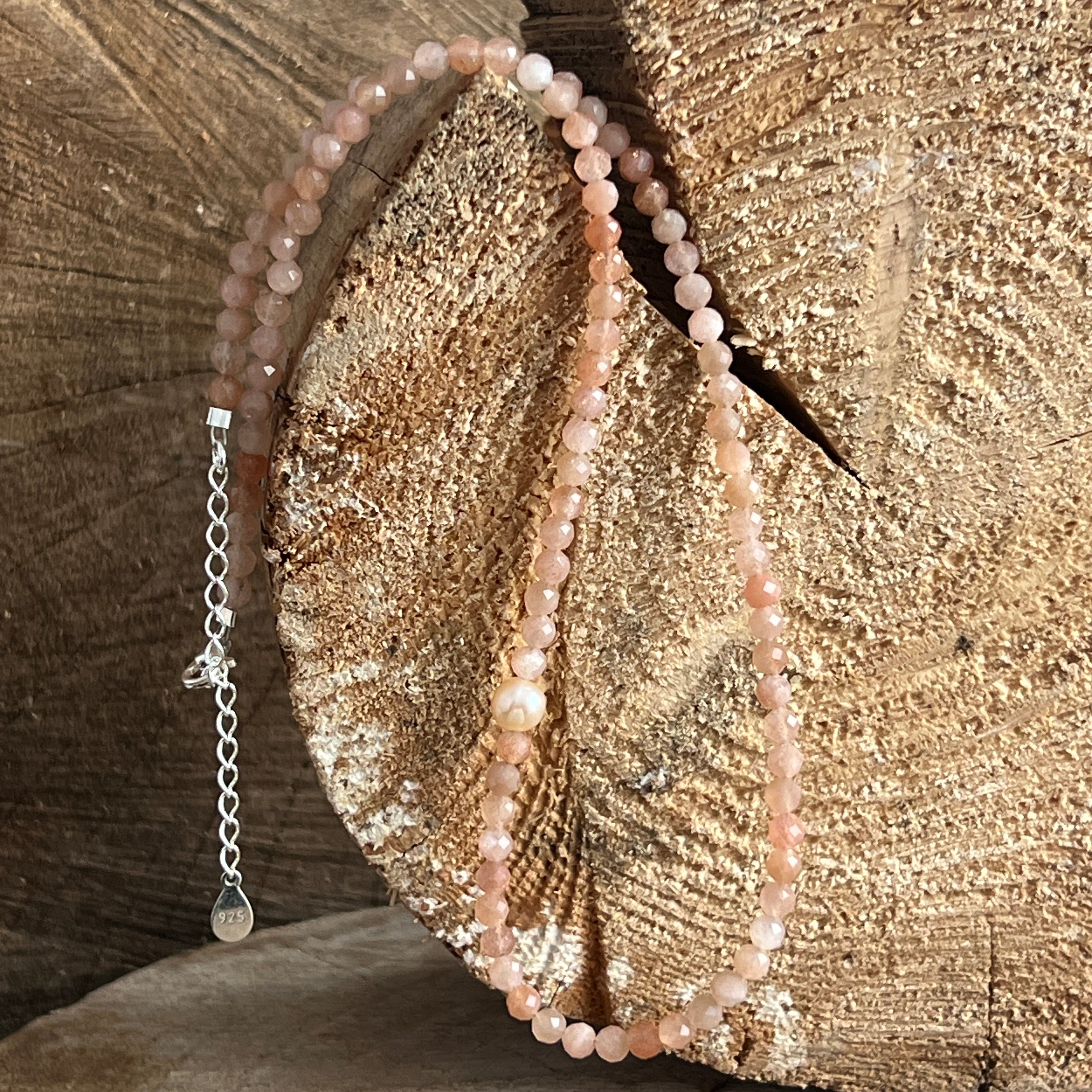 Materialien: facettierter natürlicher Sonnenstein 4 mm, natürliche runde Perlen 6 mm, 925 Silber