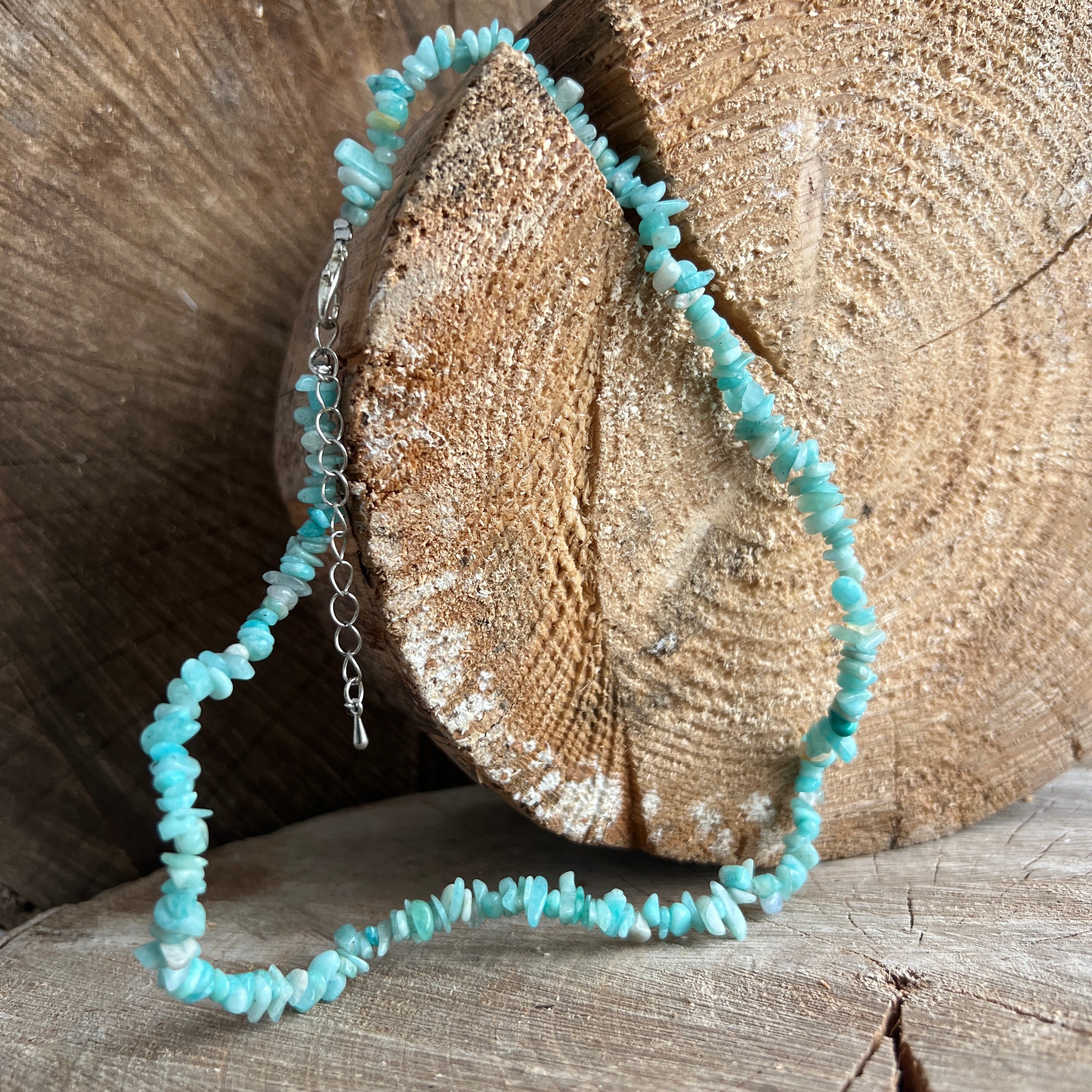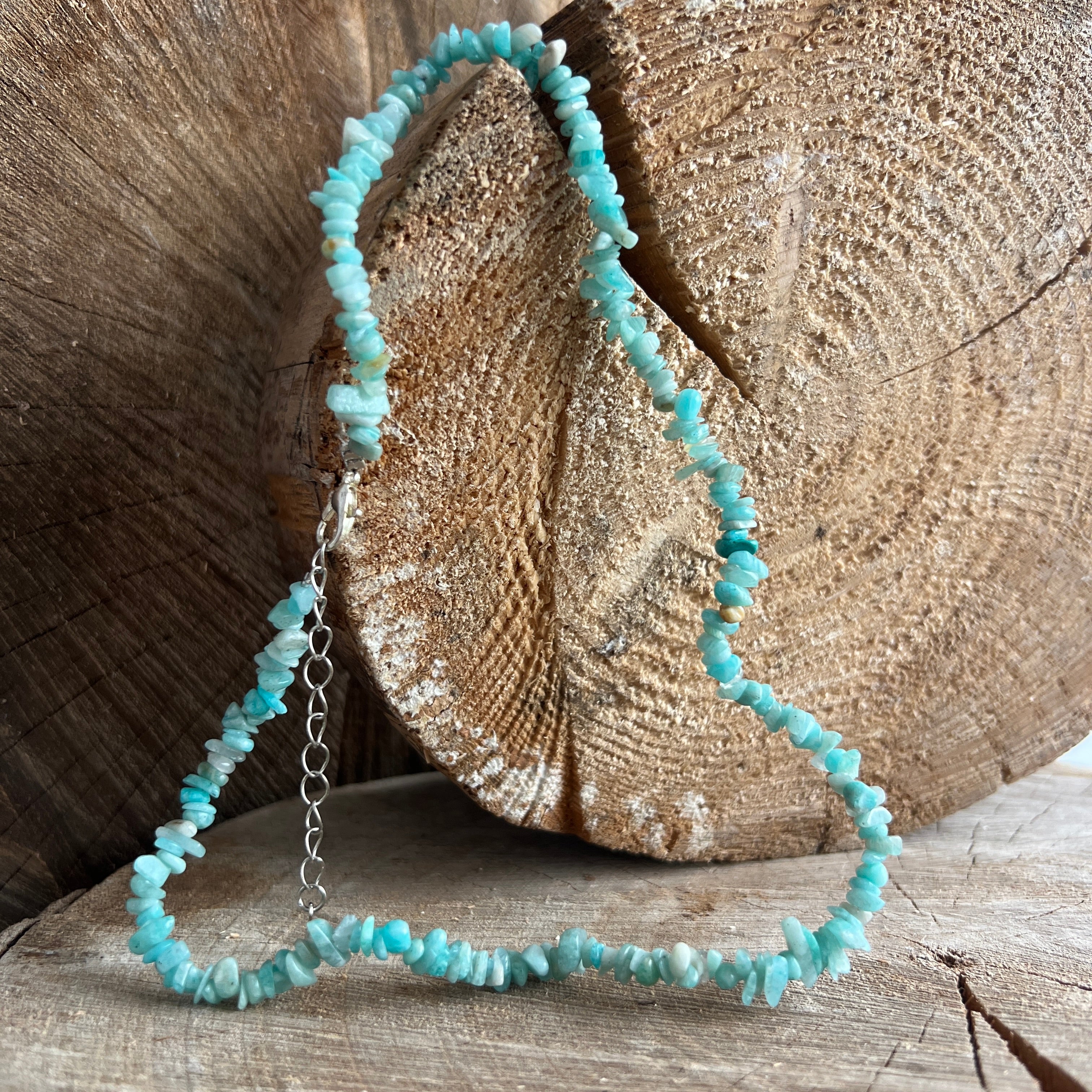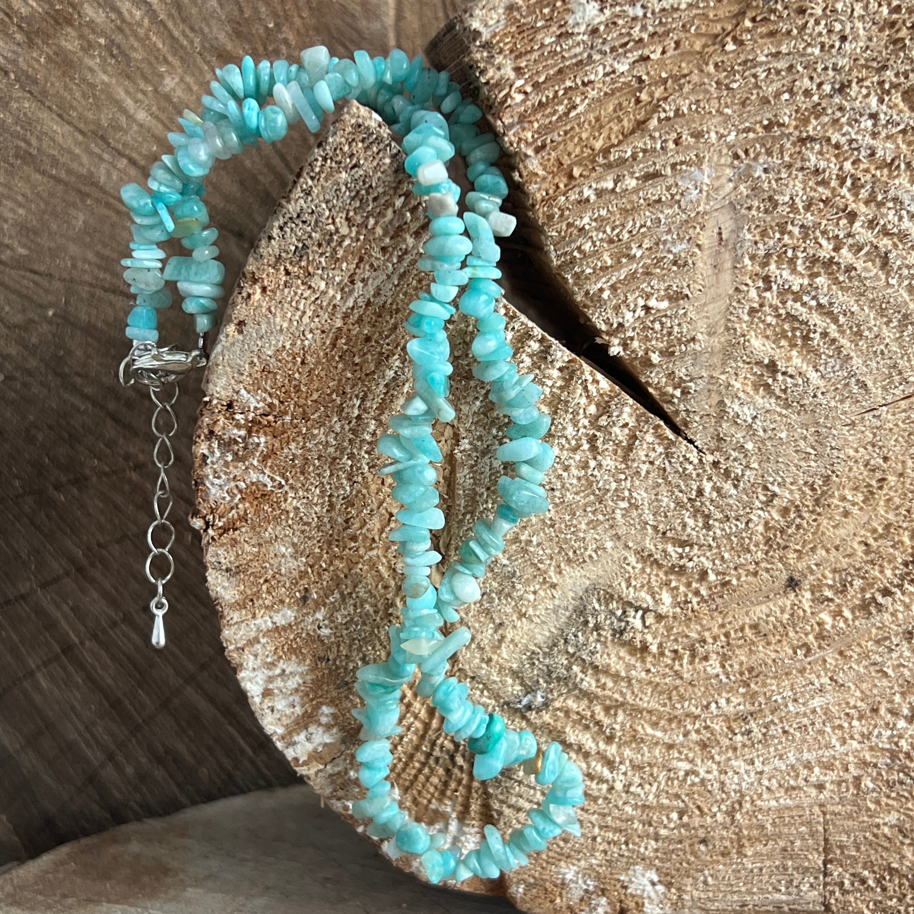 Rasten Sie Ihre Kollektion von Schmuck mit dieser Halskette aus natürlichen Amazonas -Chips an, die auf einer 40 -cm -feinen Kette montiert sind, mit einer Metallverlängerung von 5 cm zur komfortablen Einstellung.