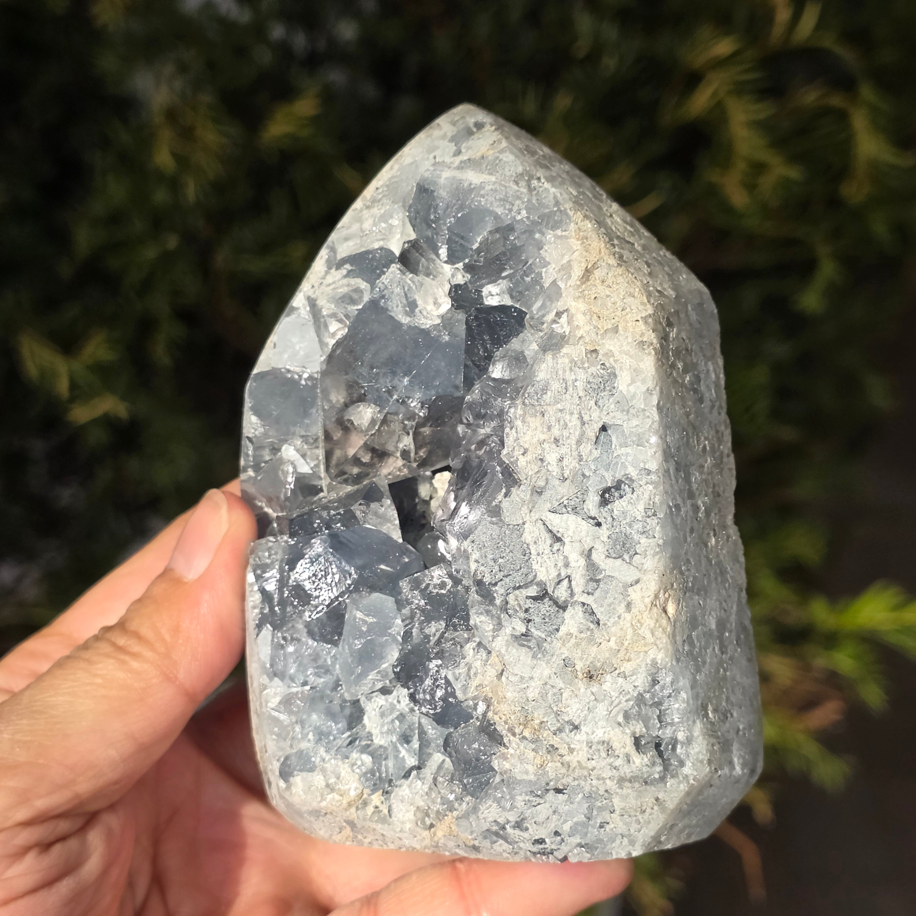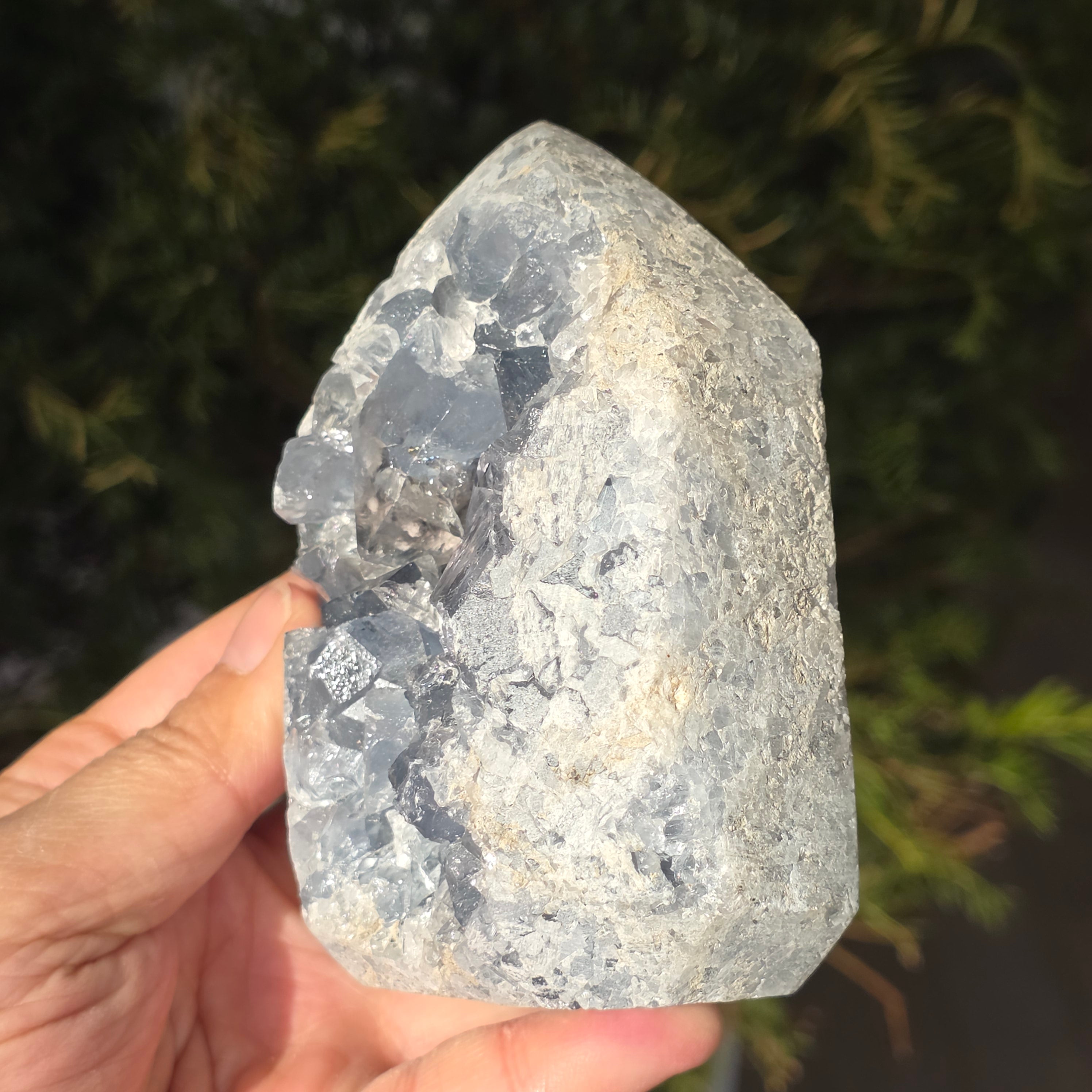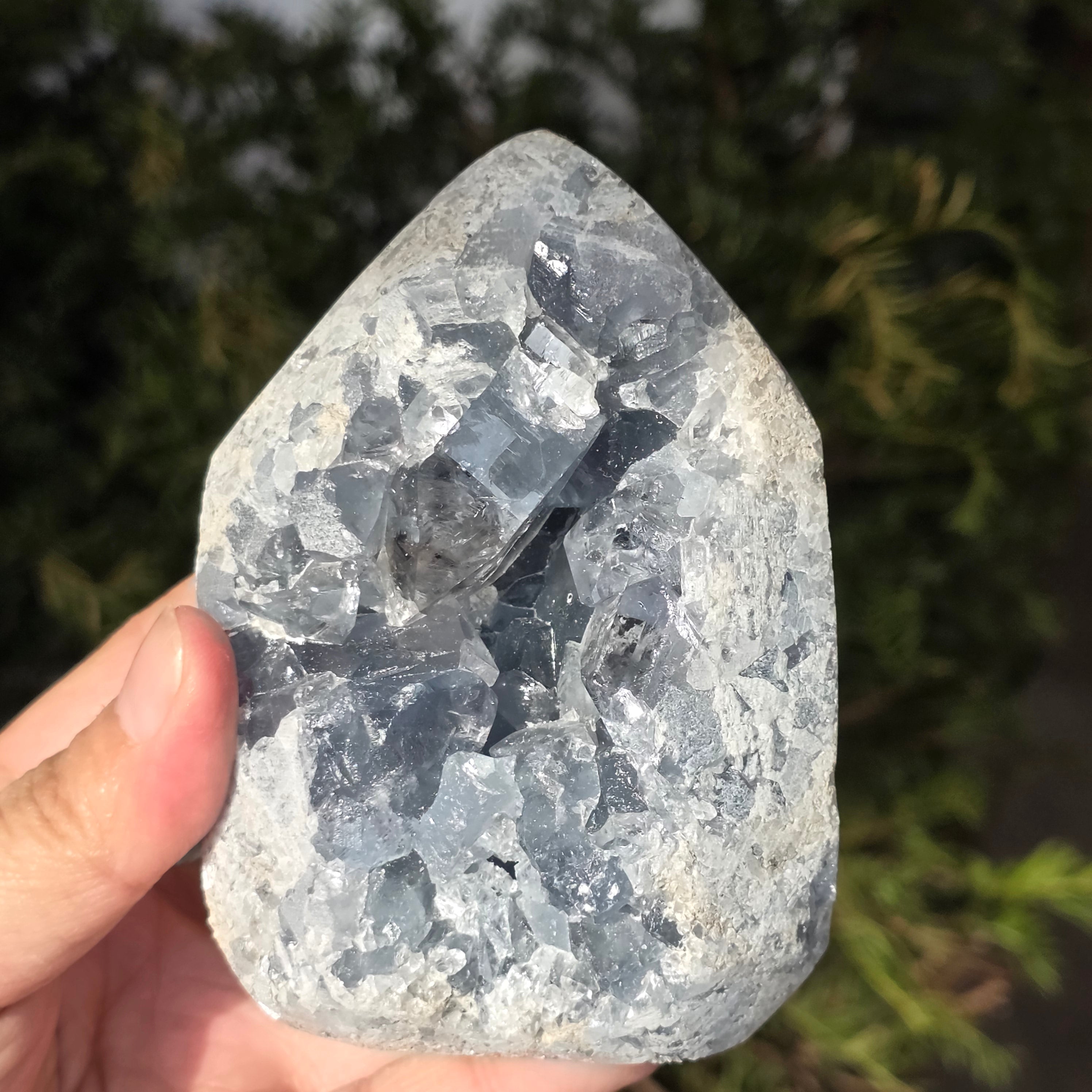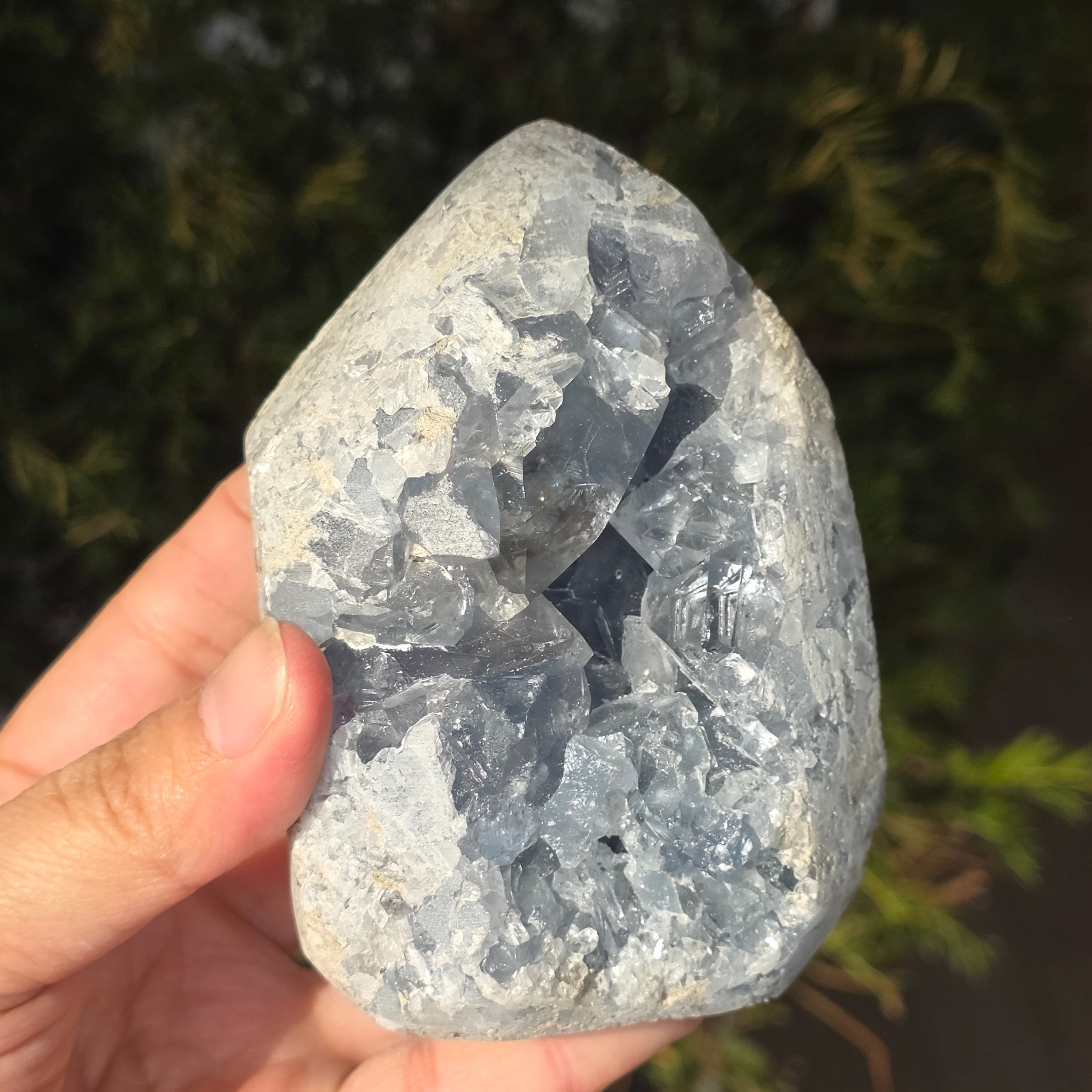 Celestite ist ein halbedel Stein von blauer oder farbloser Farbe, bestehend aus Strontiumsulfat. Sie besitzt beruhigende und entspannende Eigenschaften und wird oft in Meditation und spirituellen Praktiken eingesetzt, um inneren Frieden und geistige Klarheit zu fördern. Celestite ist mit dem Kehlchakra verbunden und kann bei klarer Kommunikation und dem Ausdruck von Emotionen helfen. Es wird auch angenommen, dass es Kreativität, Intuition und übersinnliche Fähigkeiten verbessert.