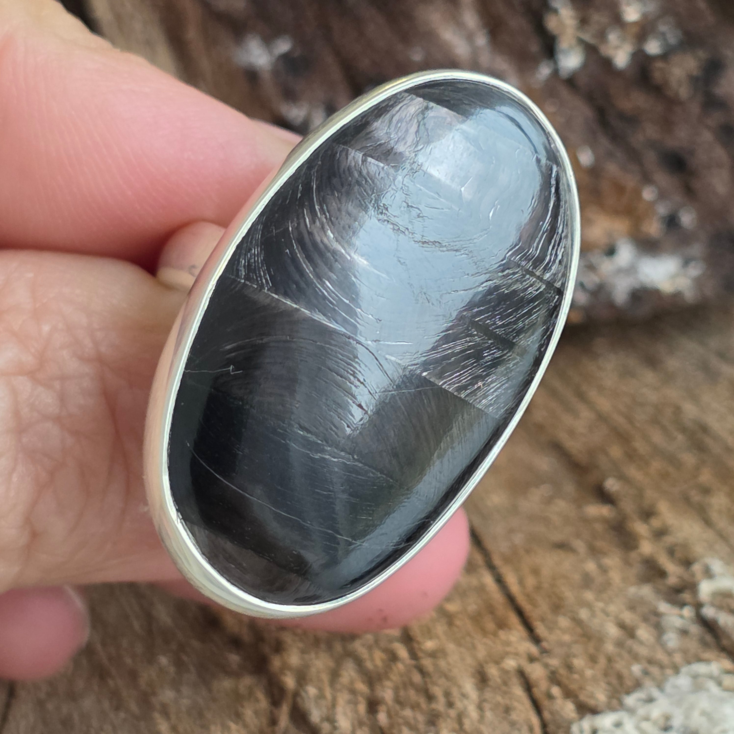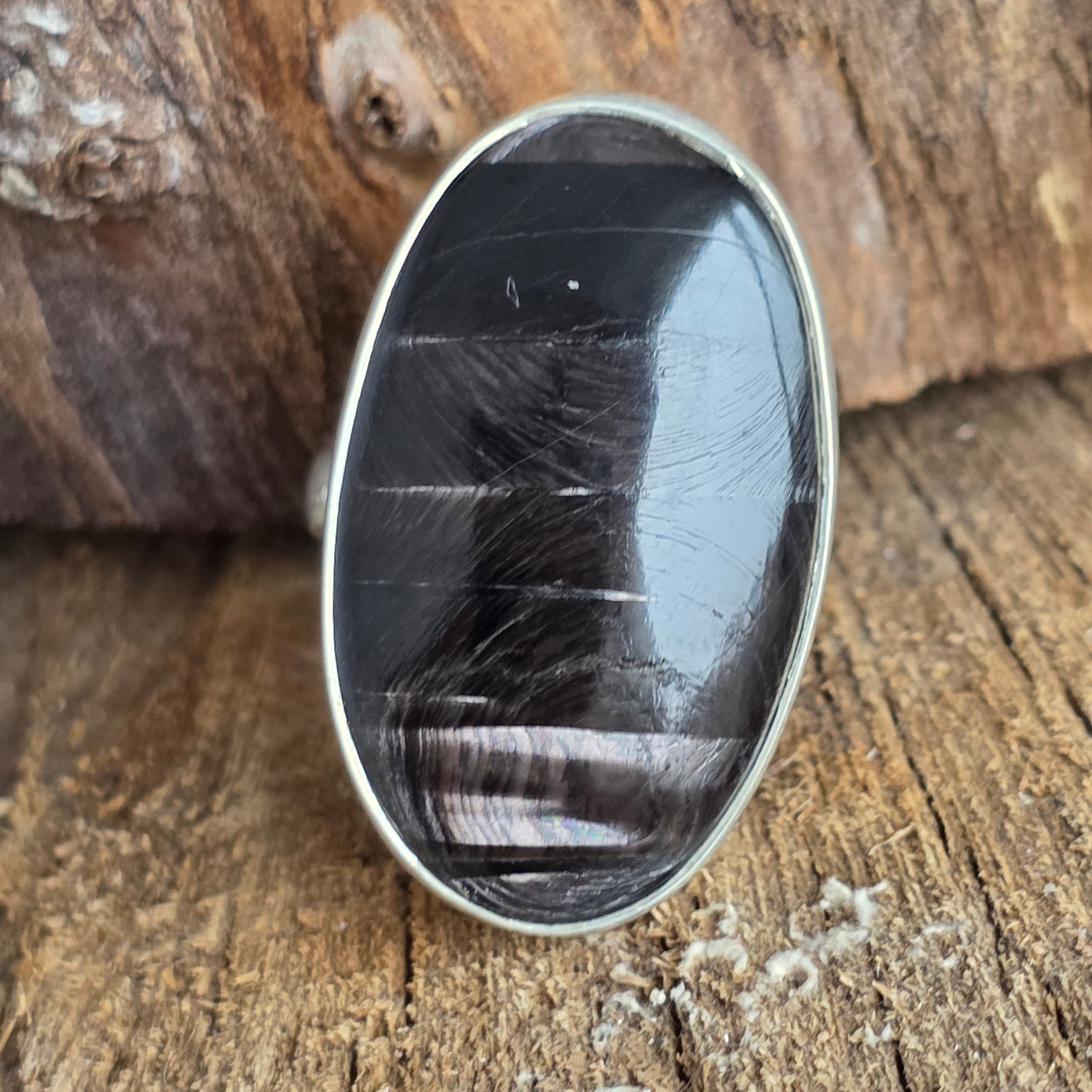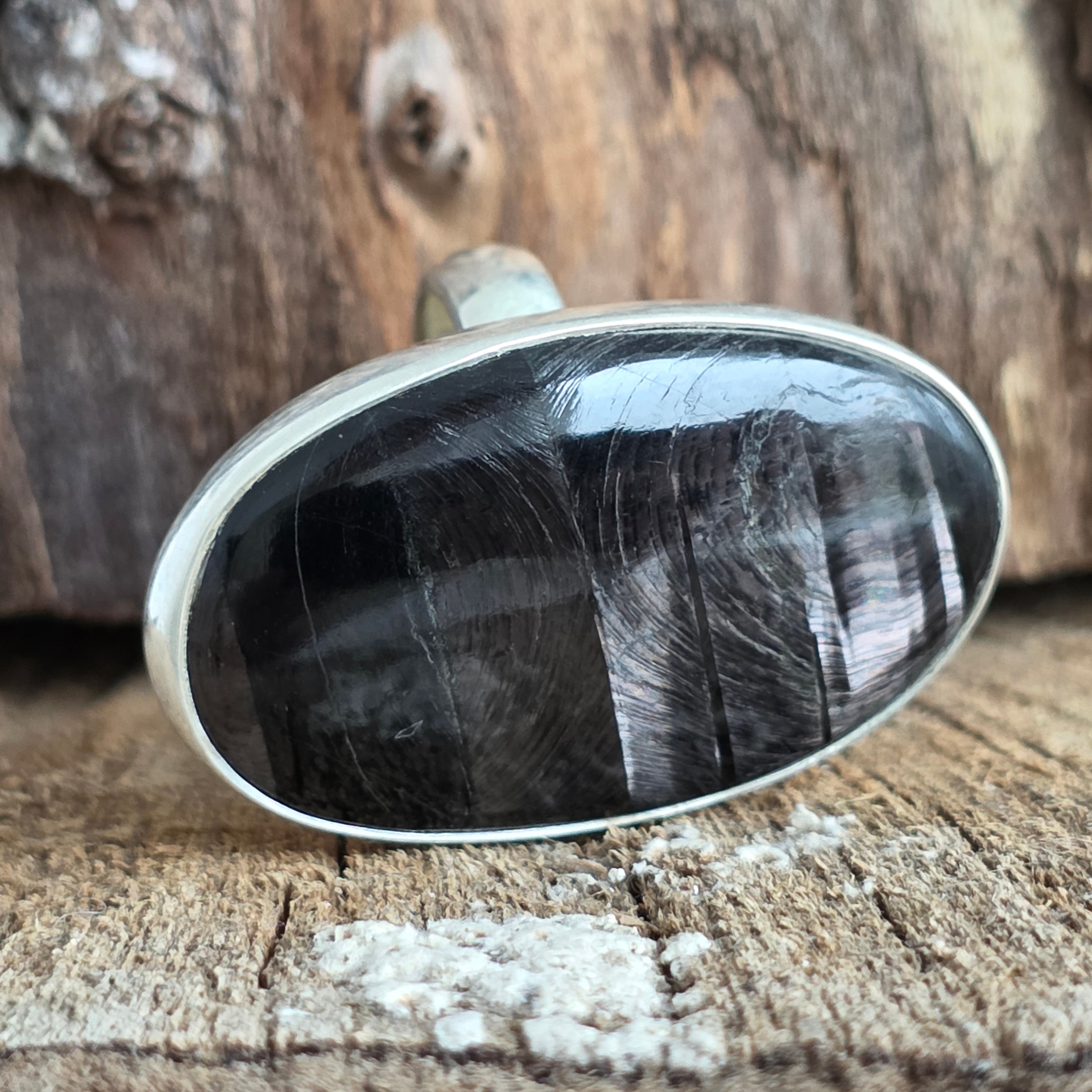 Tragen Sie diesen Ring mit natürlichem Hyperstein, um Ihrem Leben Klarheit, Ausgeglichenheit und Eleganz zu verleihen – ein seltenes und einzigartiges Juwel, von der Natur geschaffen und in Silber veredelt.