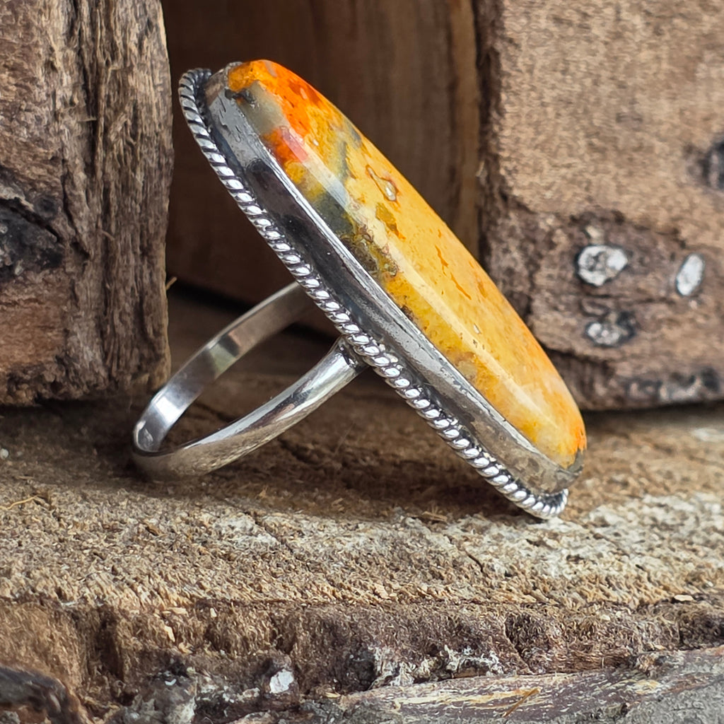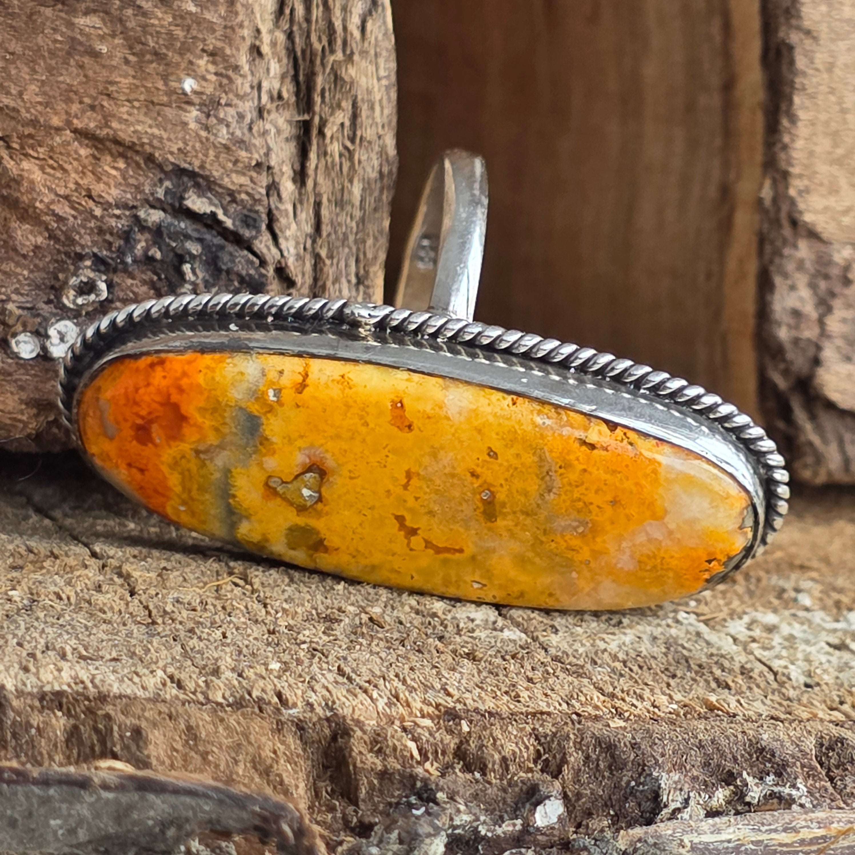 Ein spektakulärer Ring aus 925er Silber mit einem beeindruckenden Stein Hummeljaspis, bekannt für seine lebendige Mischung aus Gelb-, Orange- und Goldgrautönen. Das Modell Drahtarbeiten Die Handarbeit umrahmt den Stein zart und betont seine warmen Farbtöne und seine natürliche Textur.