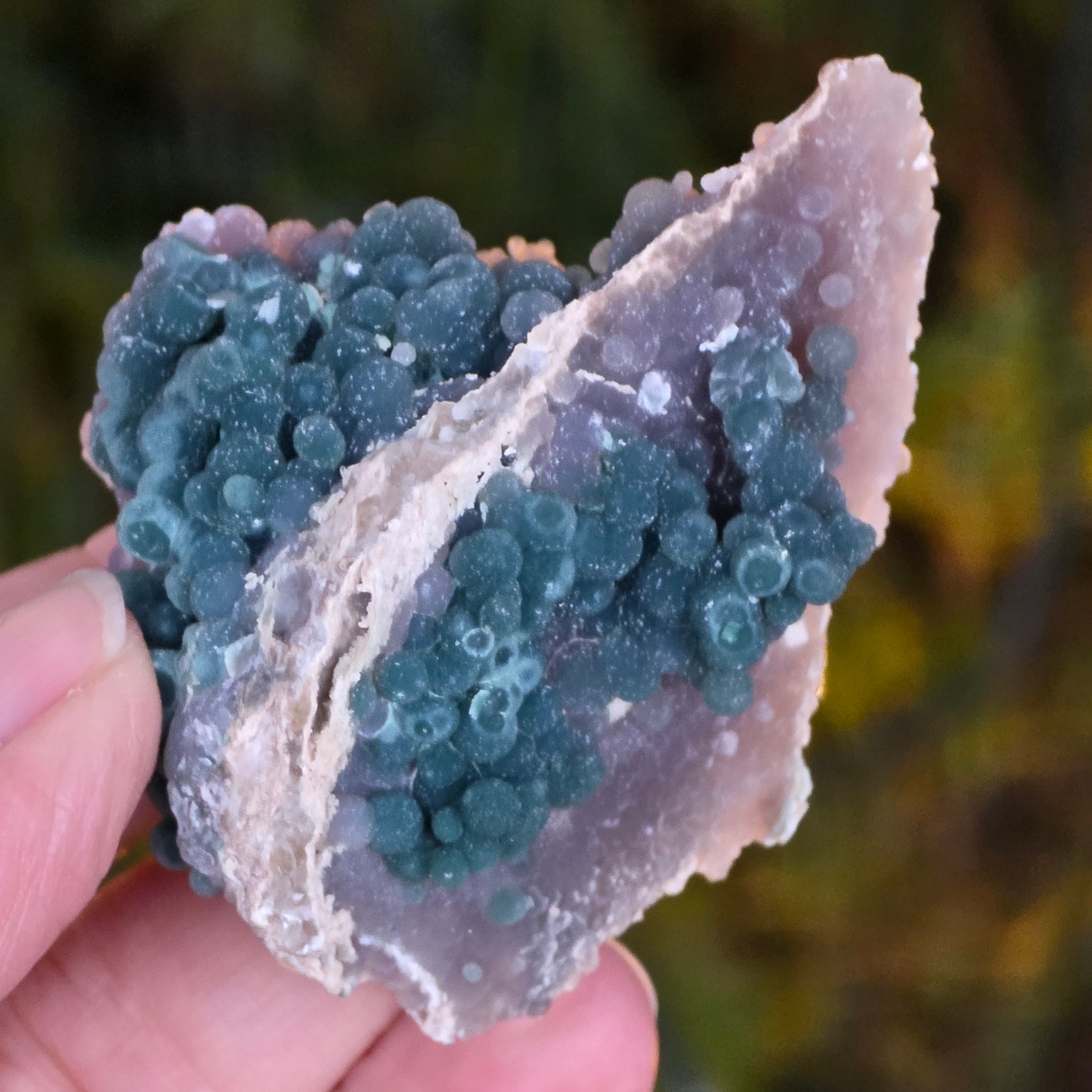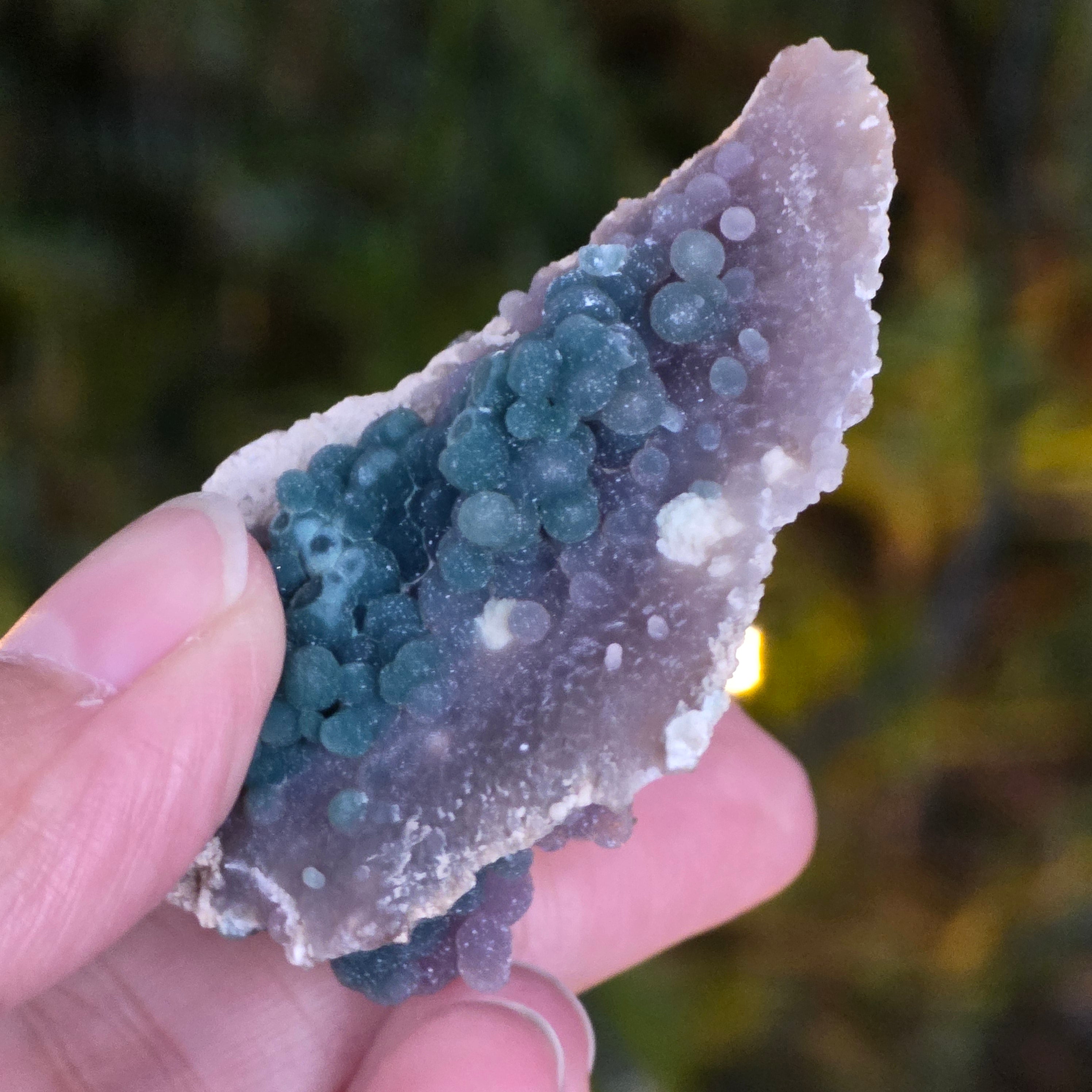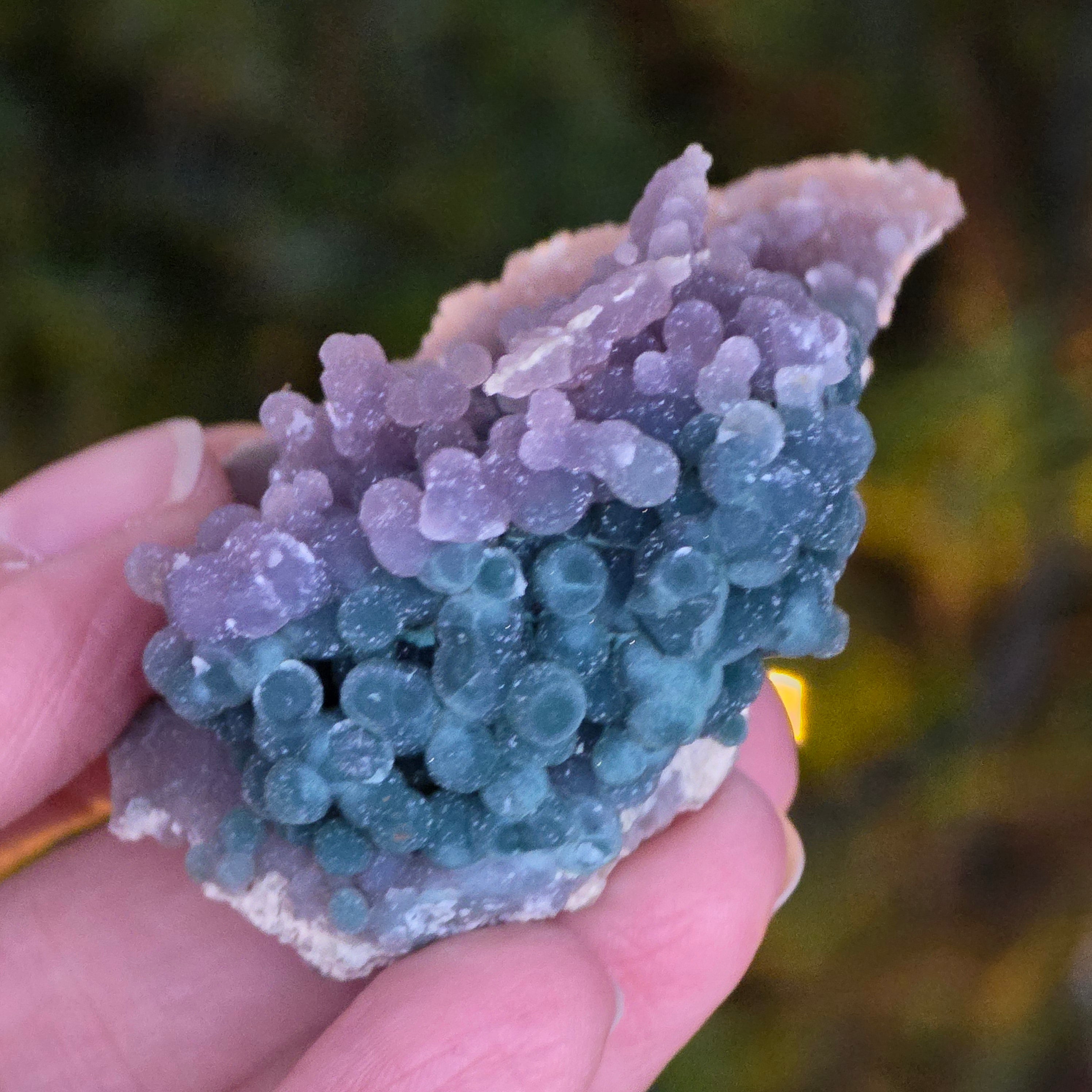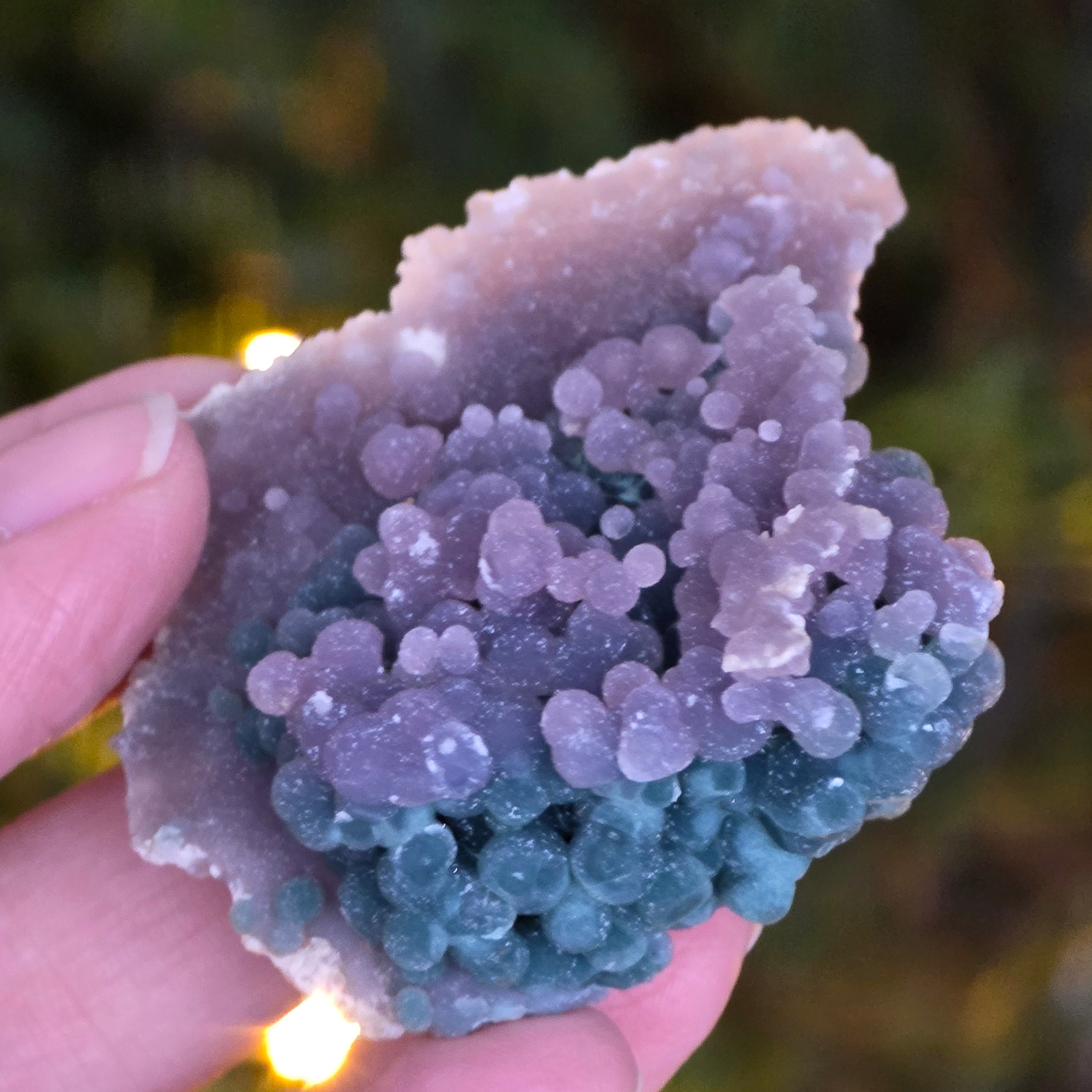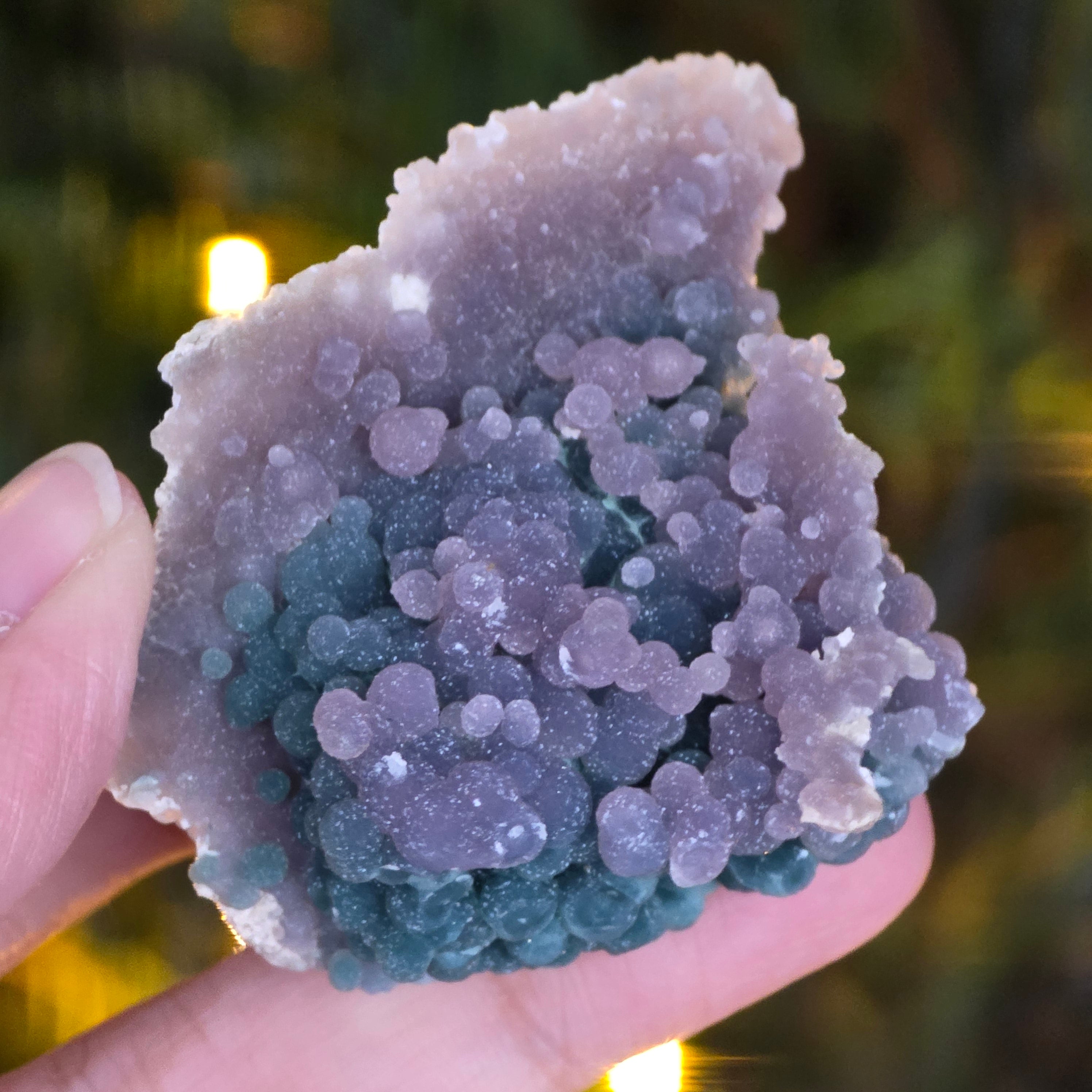 Traubenachat zeichnet sich durch seine einzigartigen Muster aus, die an Trauben erinnern. Diese Muster können normalerweise kugel- oder elliptisch geformt sein und regelmäßig oder zufällig auf der Oberfläche des Steins angeordnet sein. Die Farbe des Traubenachats kann von Violett-, Rosa-, Blau-, Grün- und Brauntönen bis zu neutraleren Nuancen wie Grau und Weiß variieren.