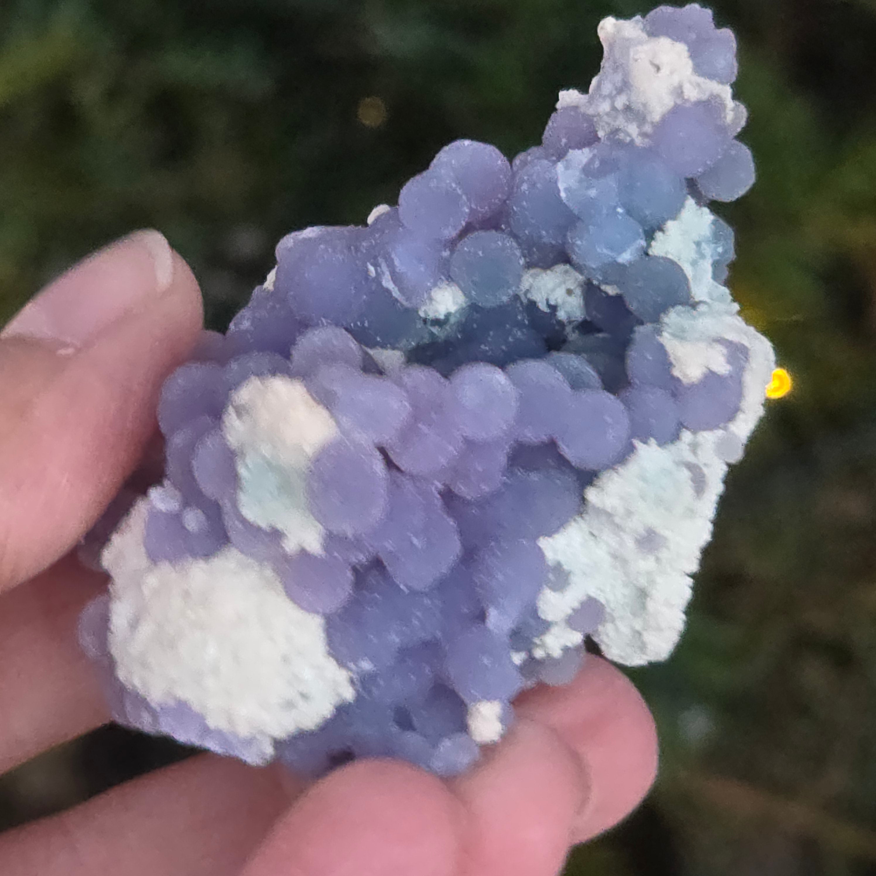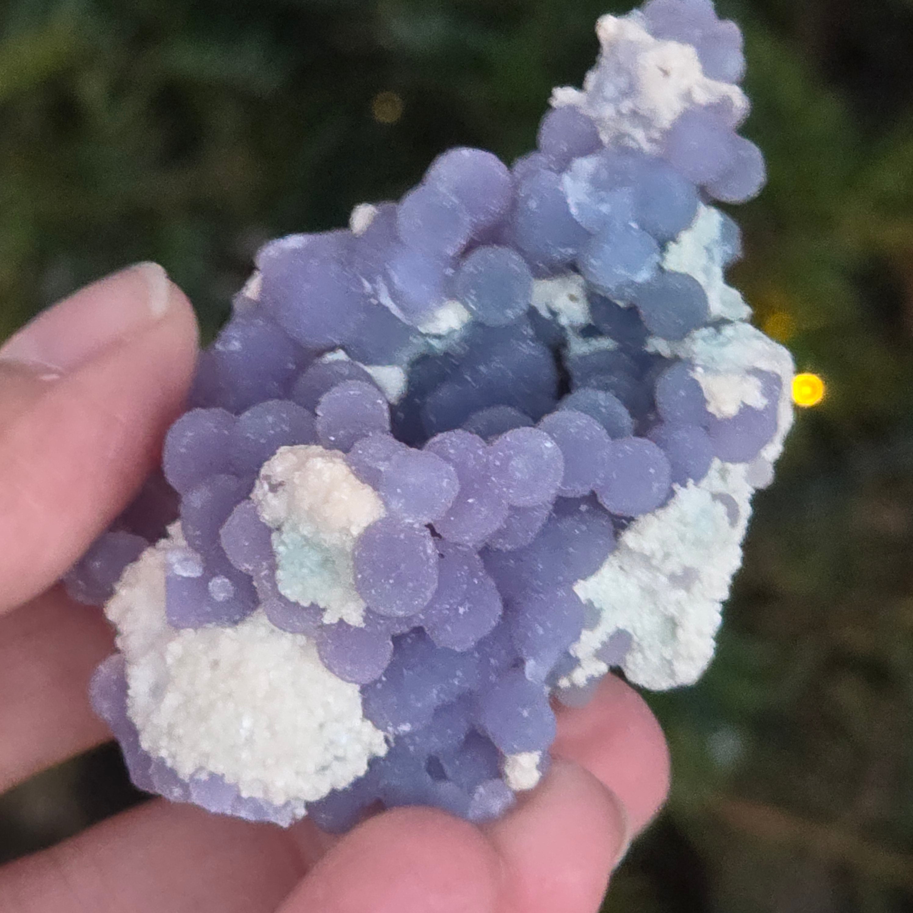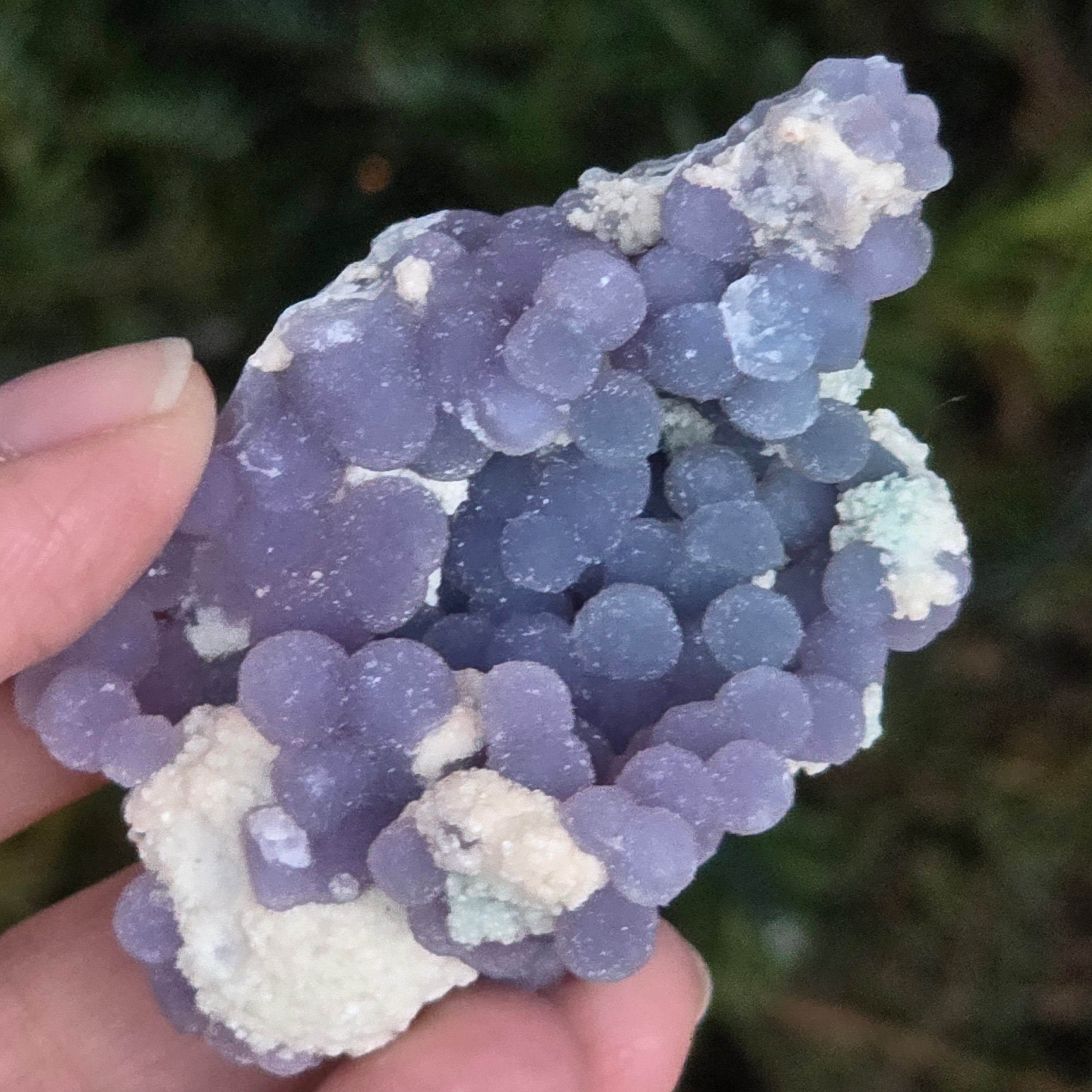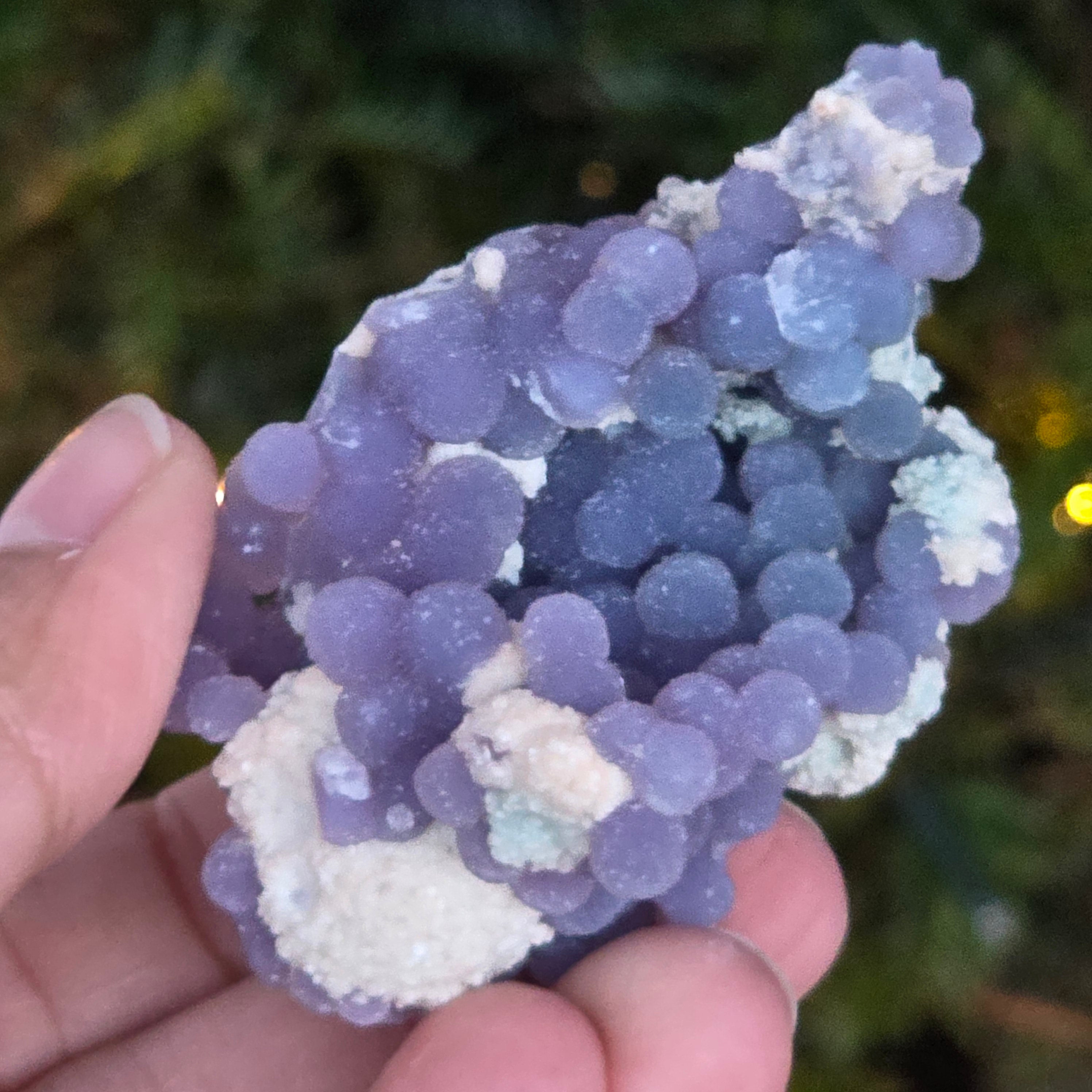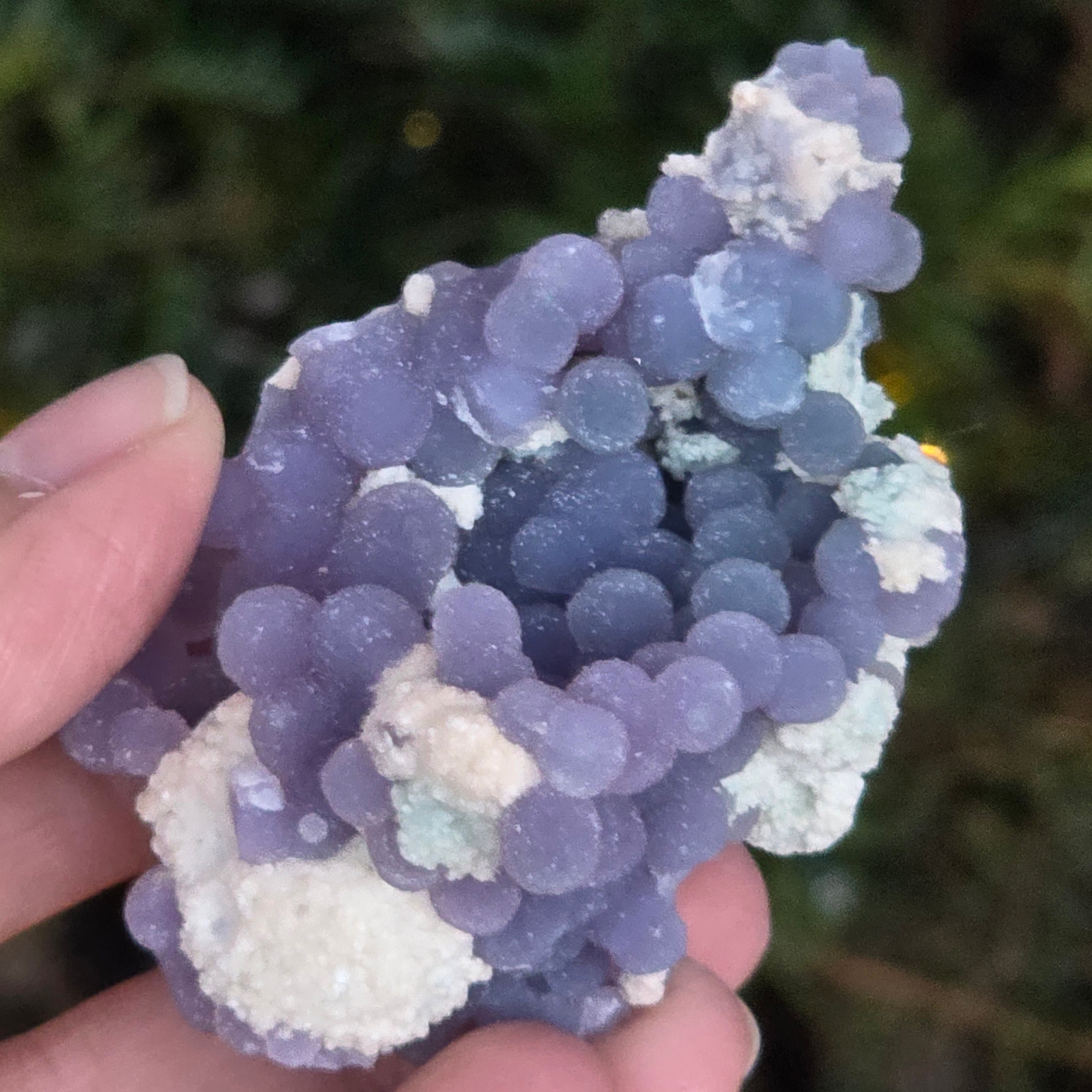 Traubenachat zeichnet sich durch seine einzigartigen Muster aus, die an Trauben erinnern. Diese Muster können normalerweise kugel- oder elliptisch geformt sein und regelmäßig oder zufällig auf der Oberfläche des Steins angeordnet sein. Die Farbe des Traubenachats kann von Violett-, Rosa-, Blau-, Grün- und Brauntönen bis zu neutraleren Nuancen wie Grau und Weiß variieren.
