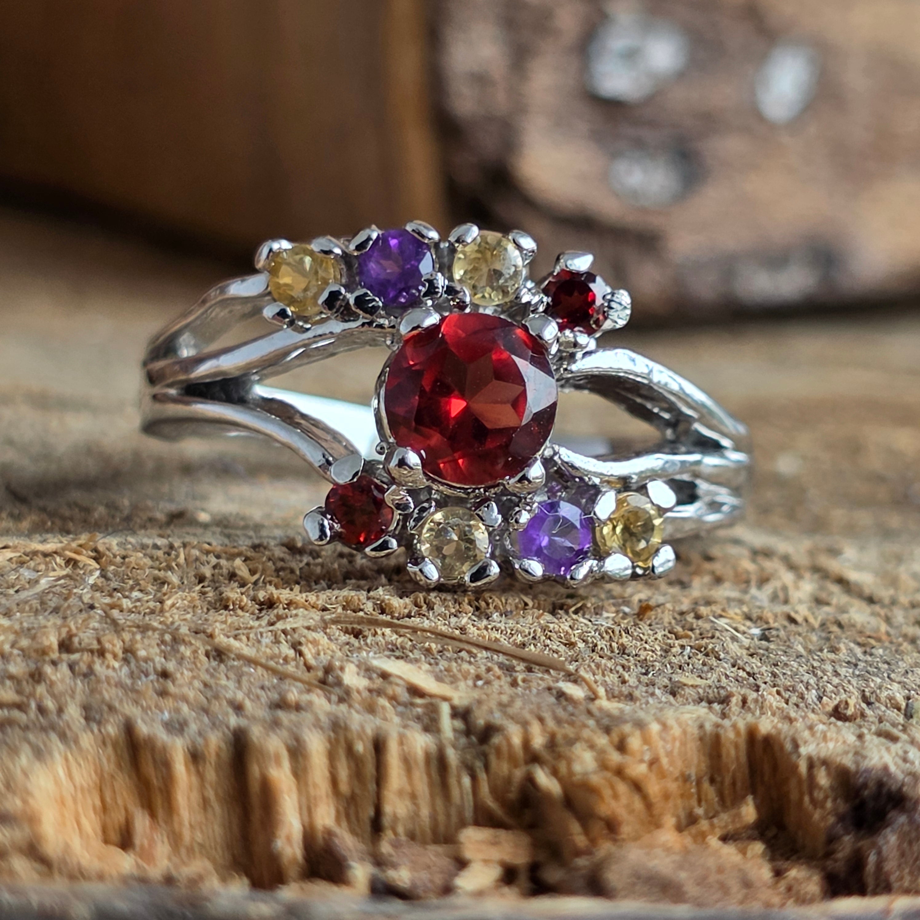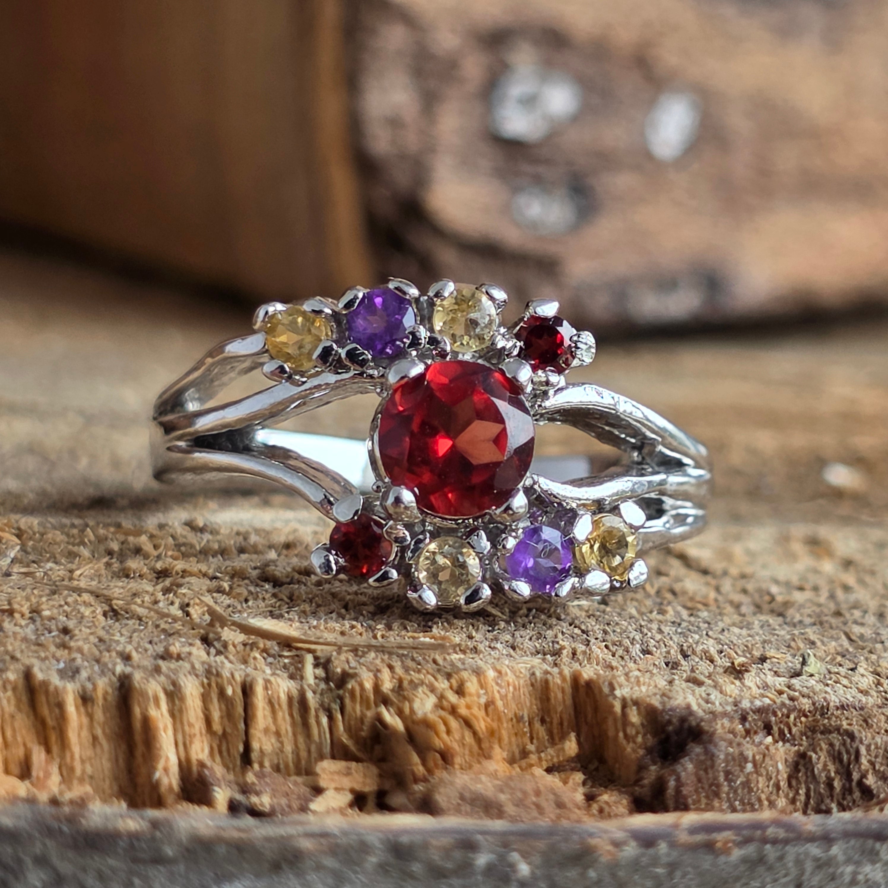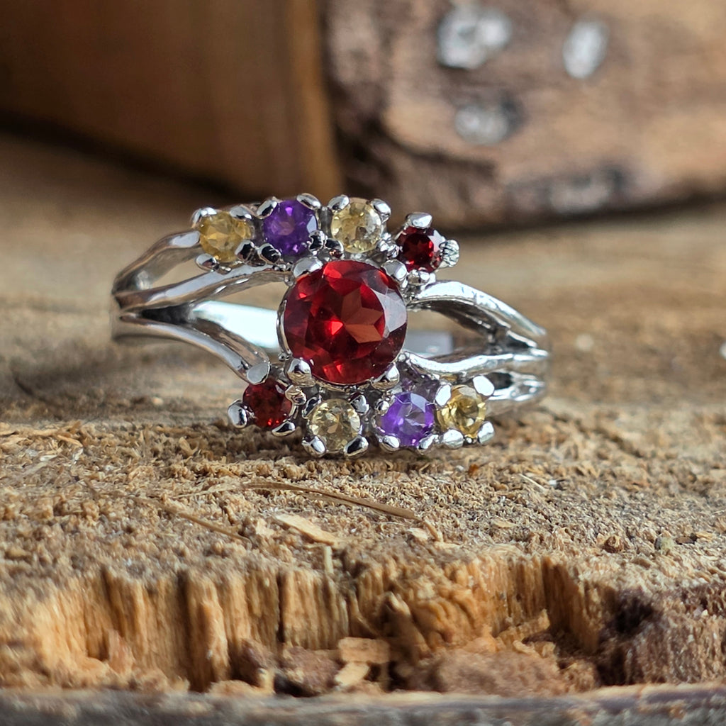 Inelul Trio Amethyst, Garnet & Citrine este o piesă luminoasă, potrivită celor care iubesc contrastul dintre calm și intensitate, dintre rațiune și emoție – un talisman al echilibrului interior și al bucuriei de a fi.