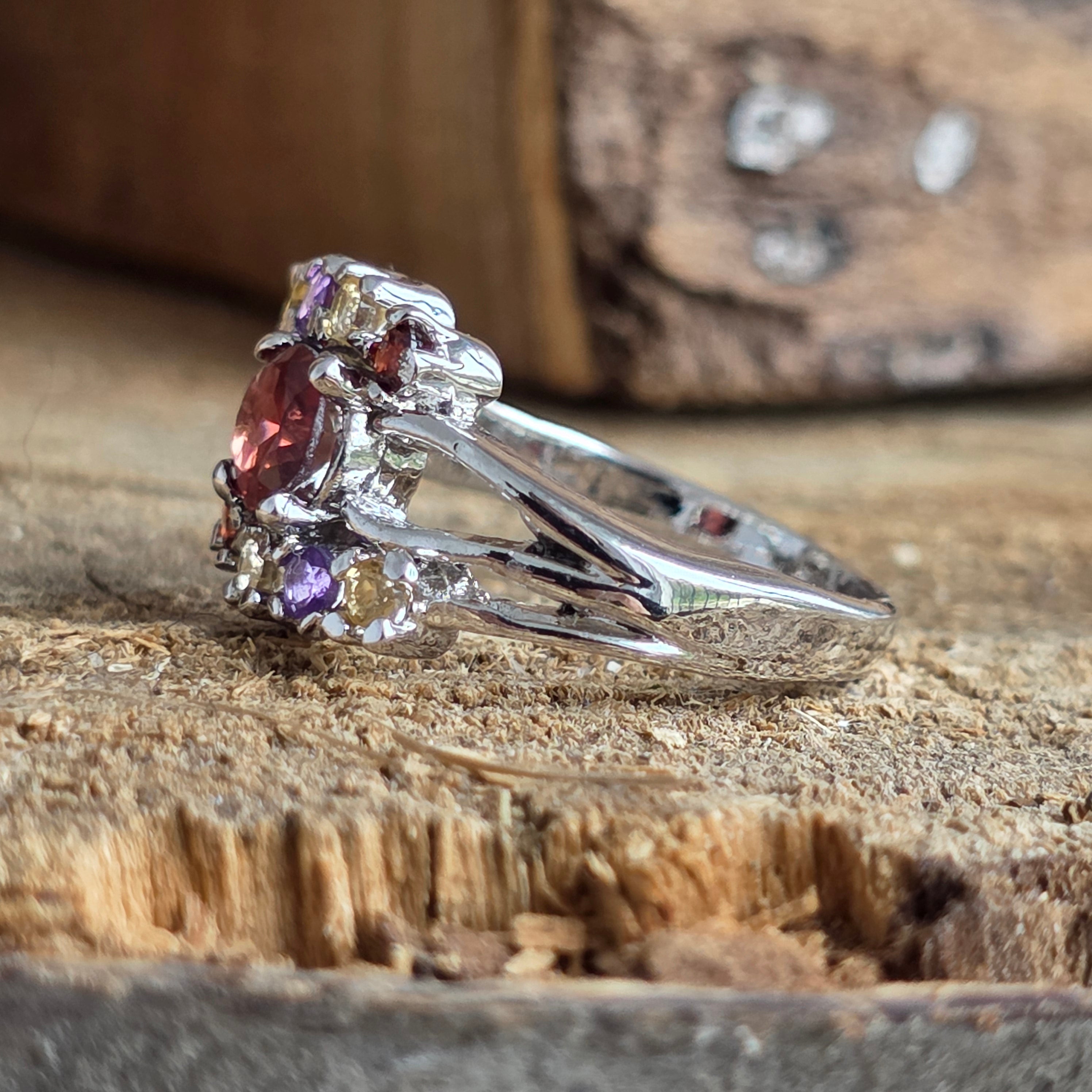 Împreună, aceste pietre formează un trio perfect – o simfonie de culori între violet, roșu și auriu, așezate cu grație într-o montură din argint 925.