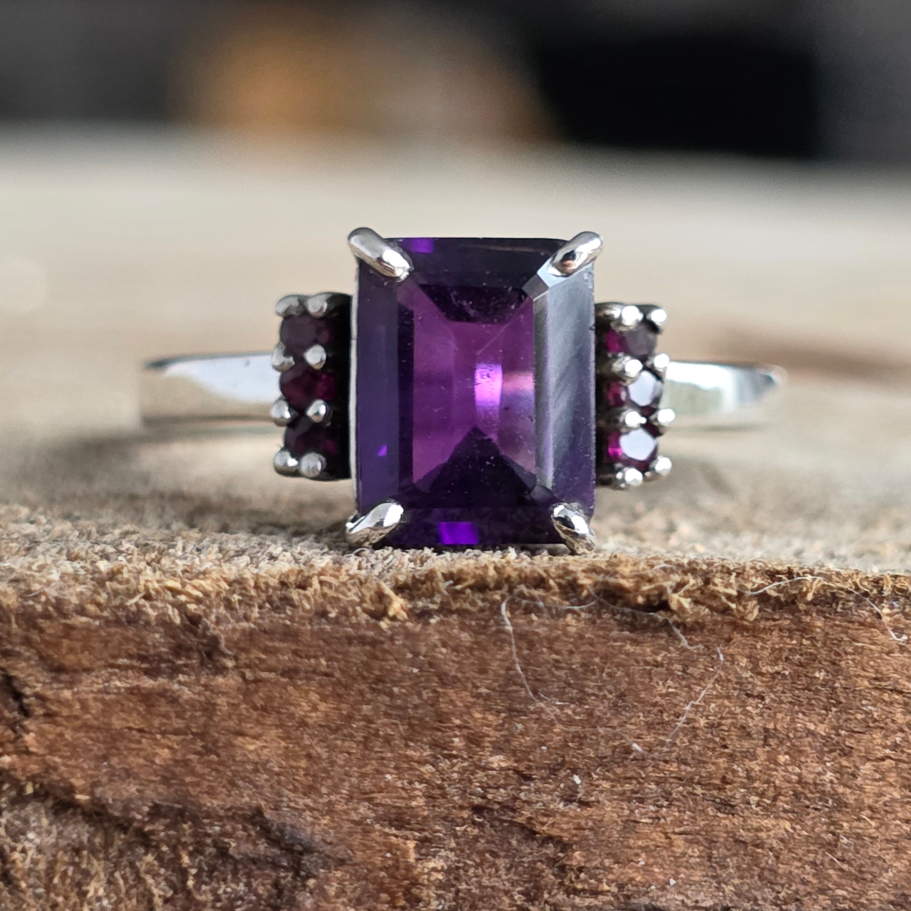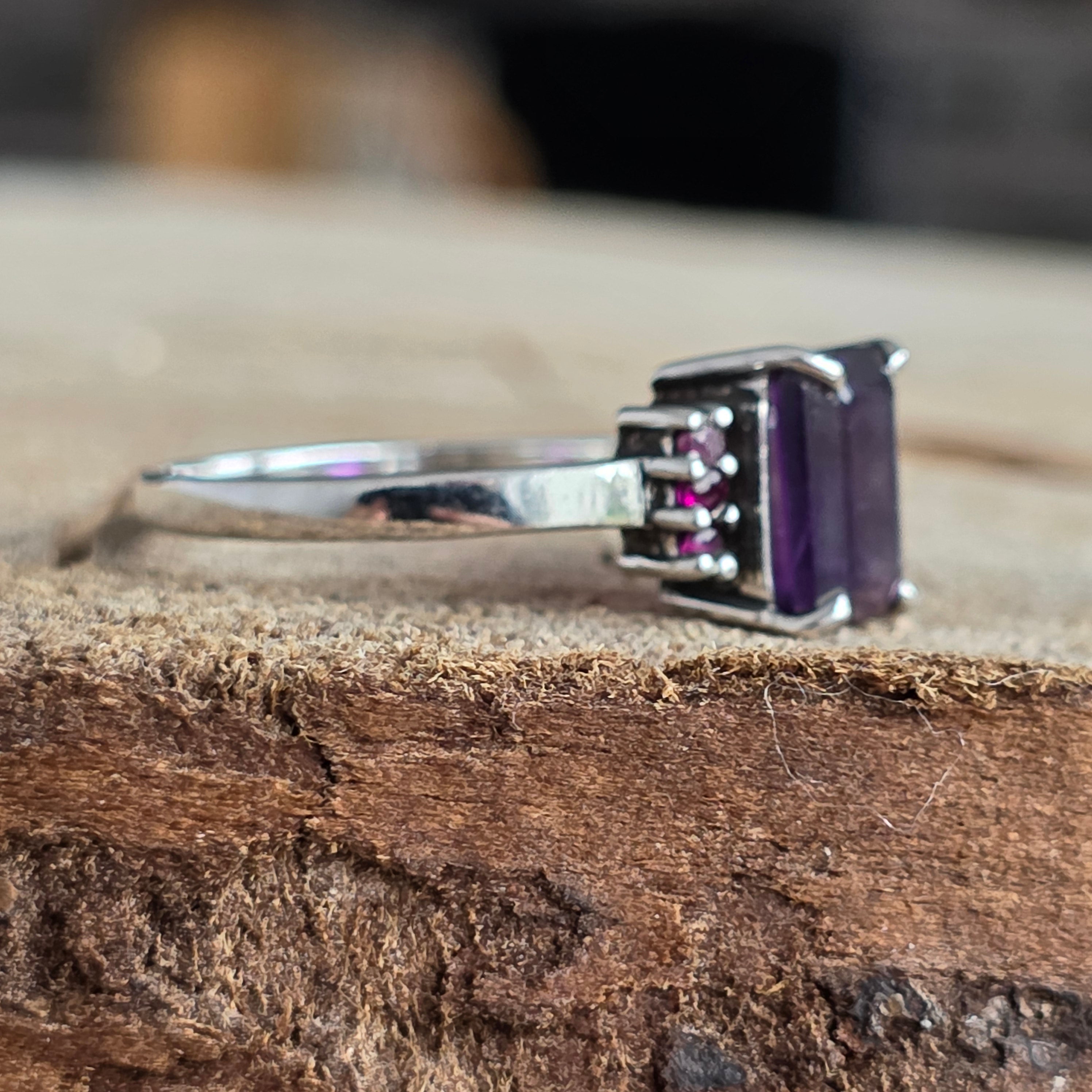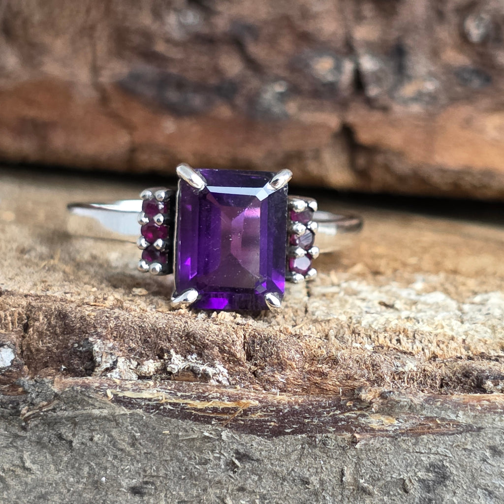 Un echilibru perfect între forță și rafinament – acest inel din argint 925 combină noblețea ametistului natural cu intensitatea pasională a rubinului.