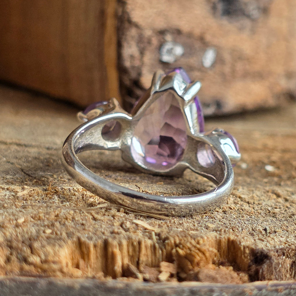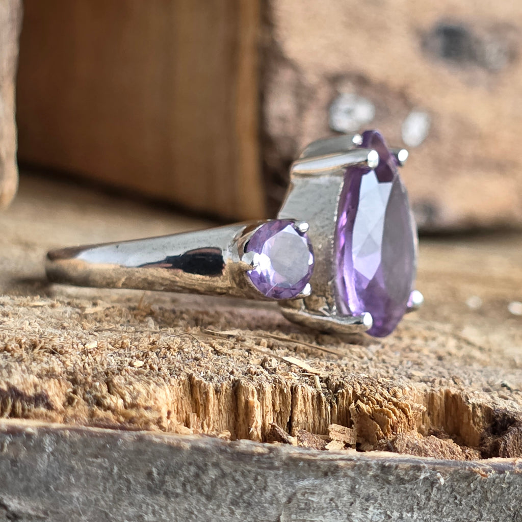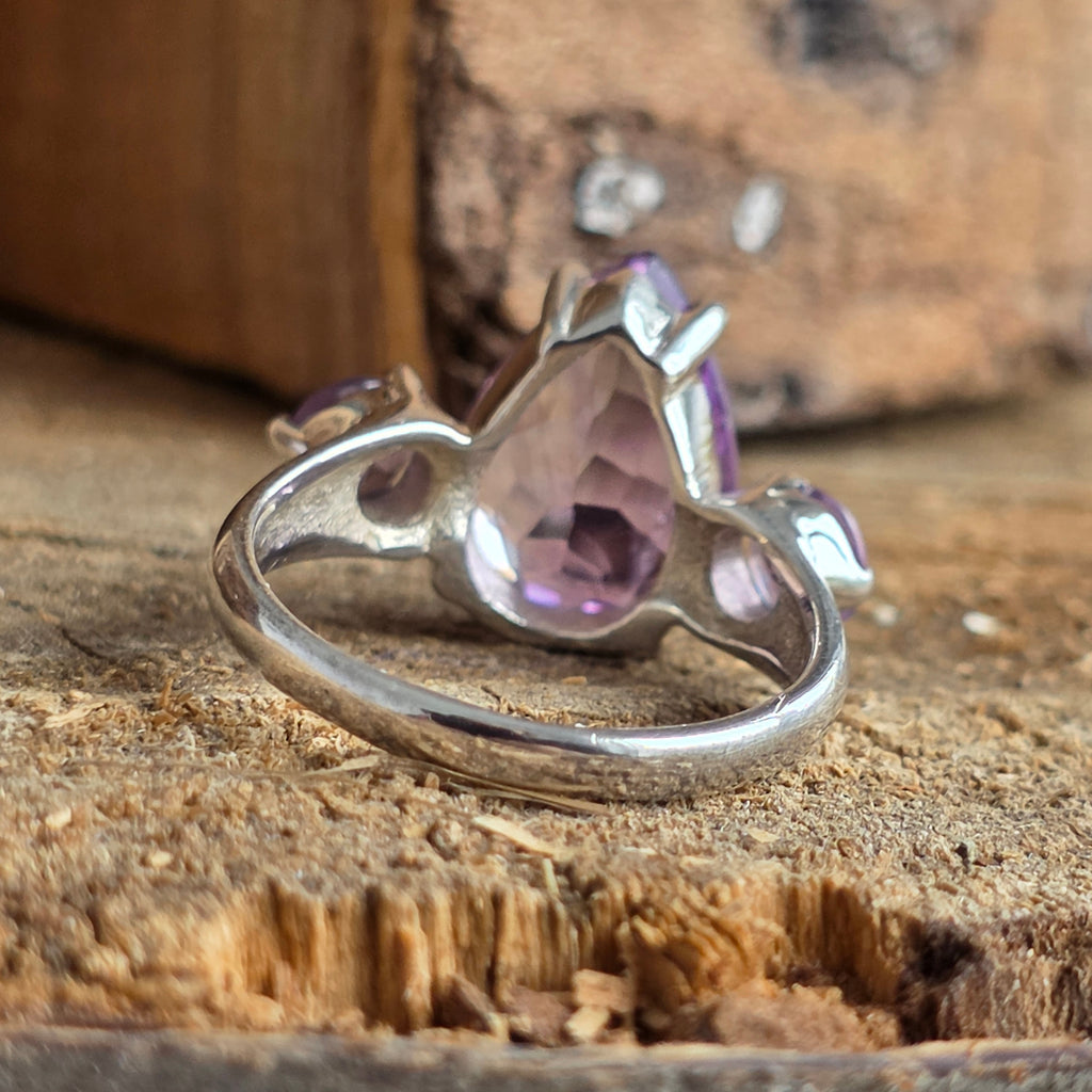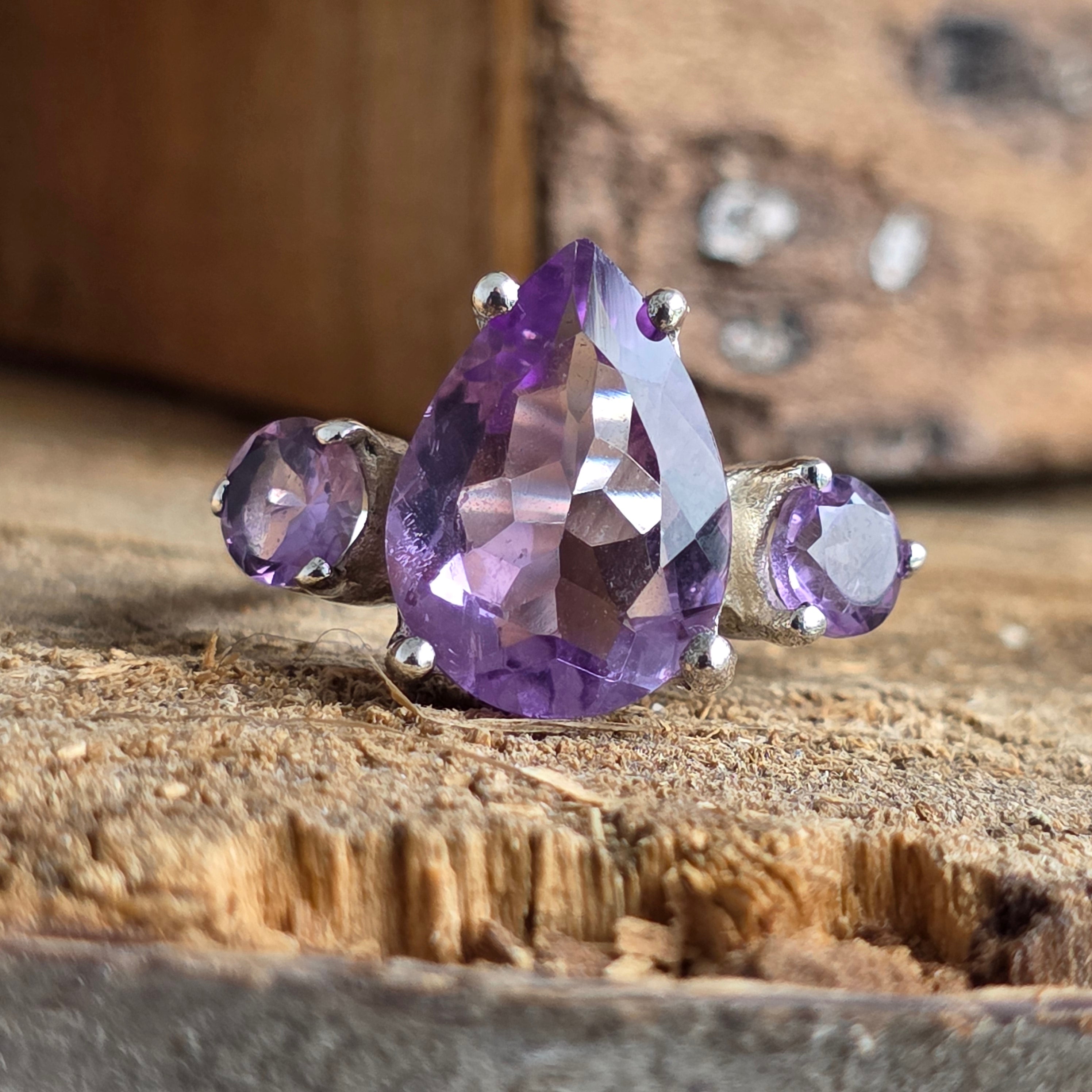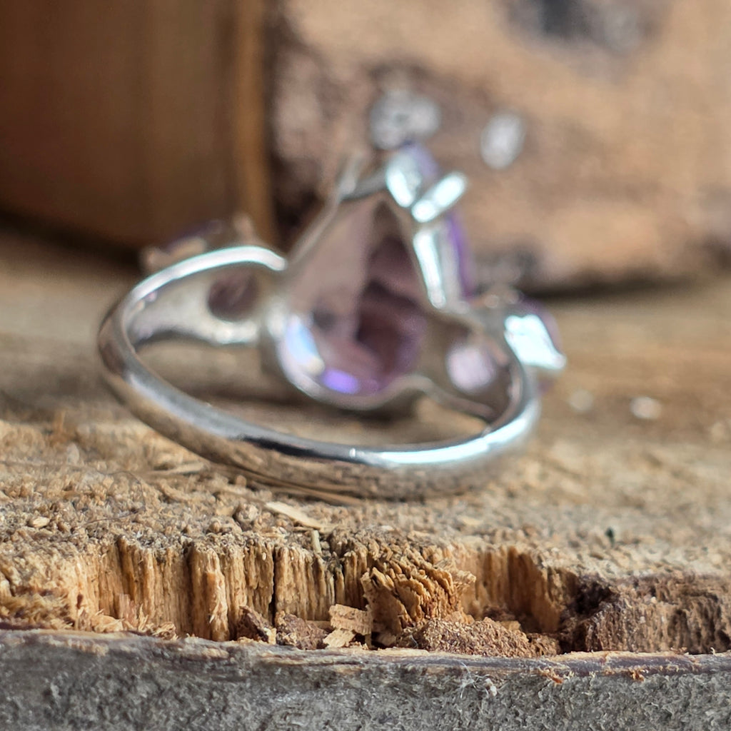 Reflexele sale violet par să capteze lumina într-un joc subtil de transparență și forță, în timp ce montura elegantă cu trei pietre adaugă o notă de rafinament atemporal.