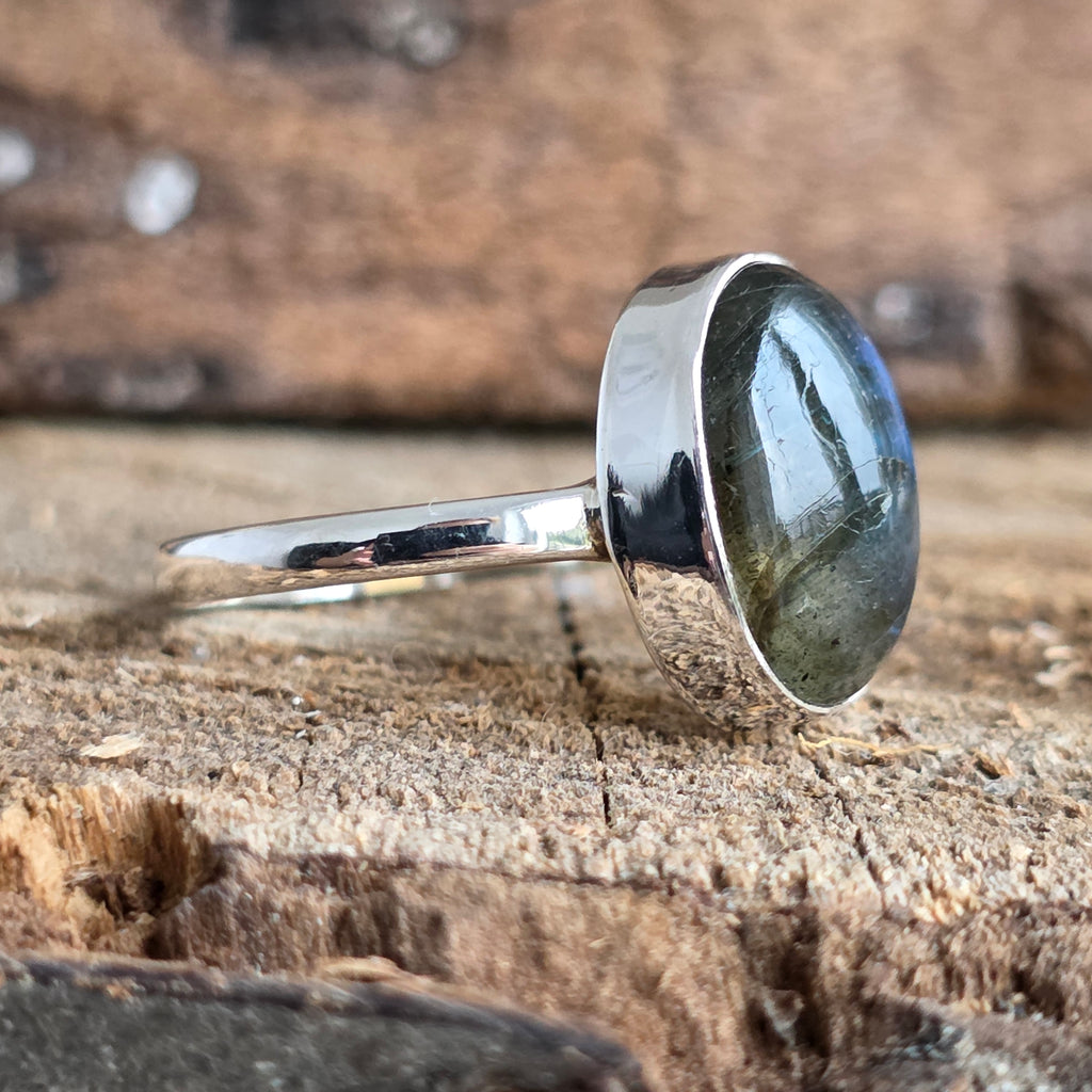 Un inel elegant din argint 925 cu labradorit natural, o piatră fascinantă cunoscută pentru irizațiile sale albastre și gri-aurii care par să danseze sub lumină. Designul minimalist pune în valoare frumusețea naturală a pietrei, oferindu-i o strălucire misterioasă și rafinată.