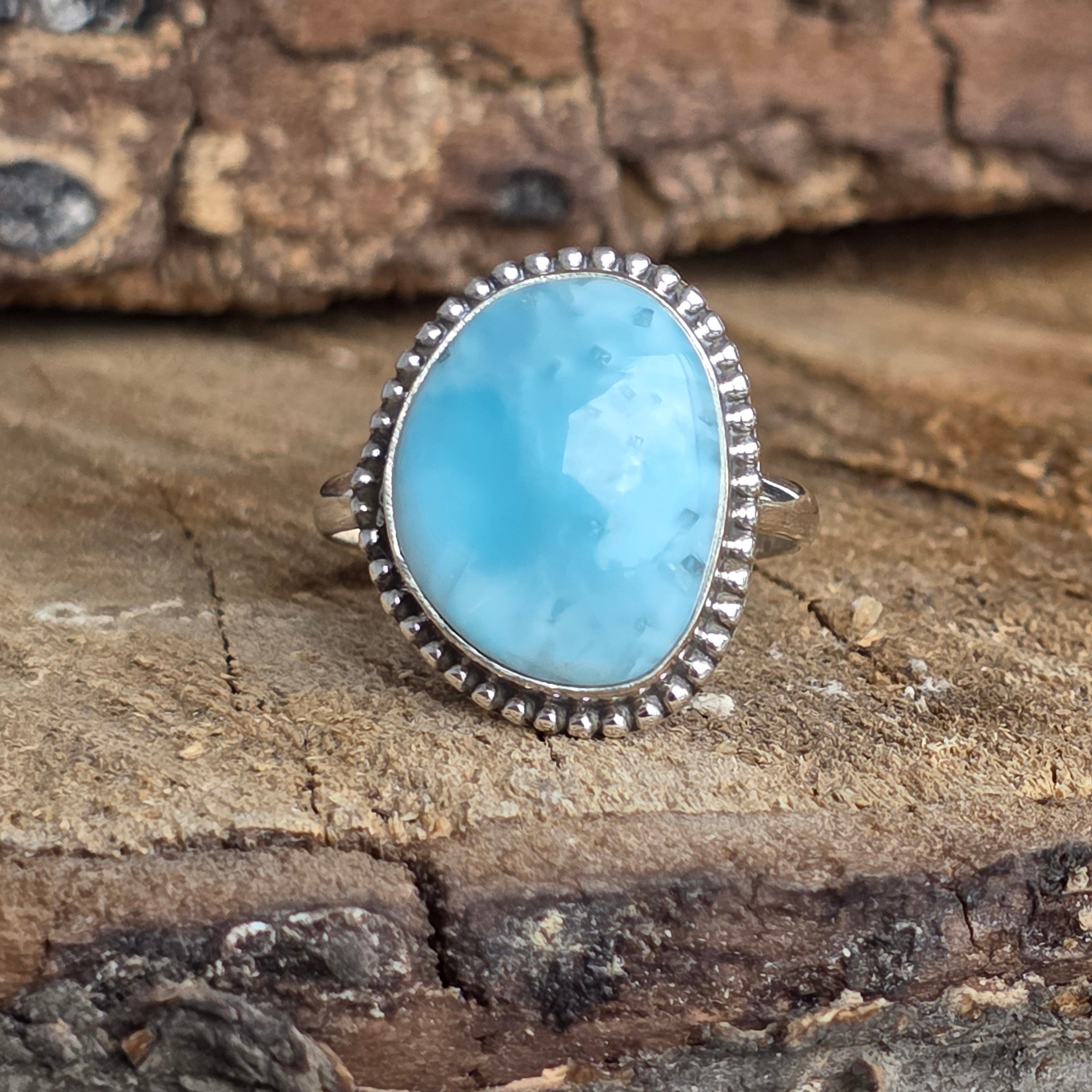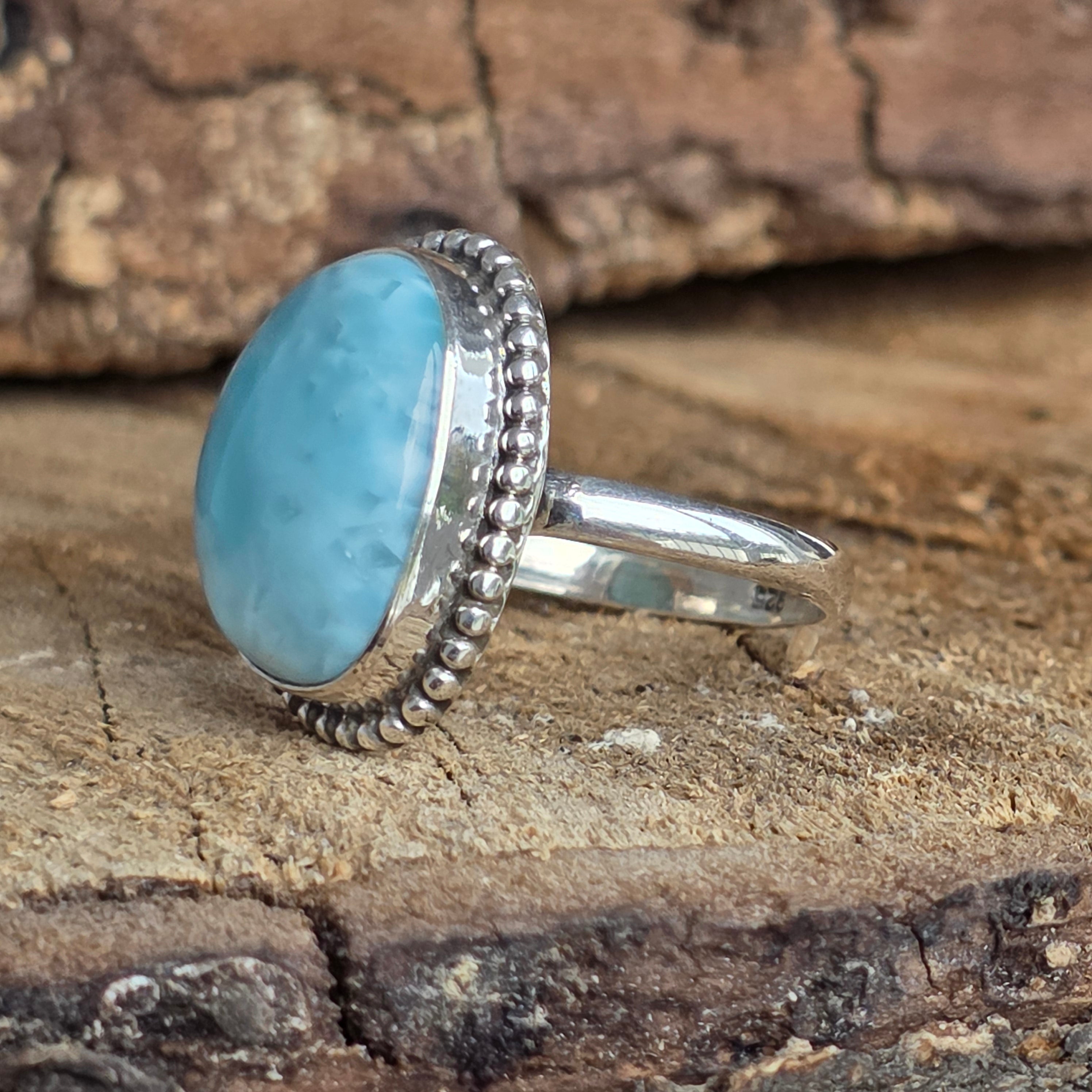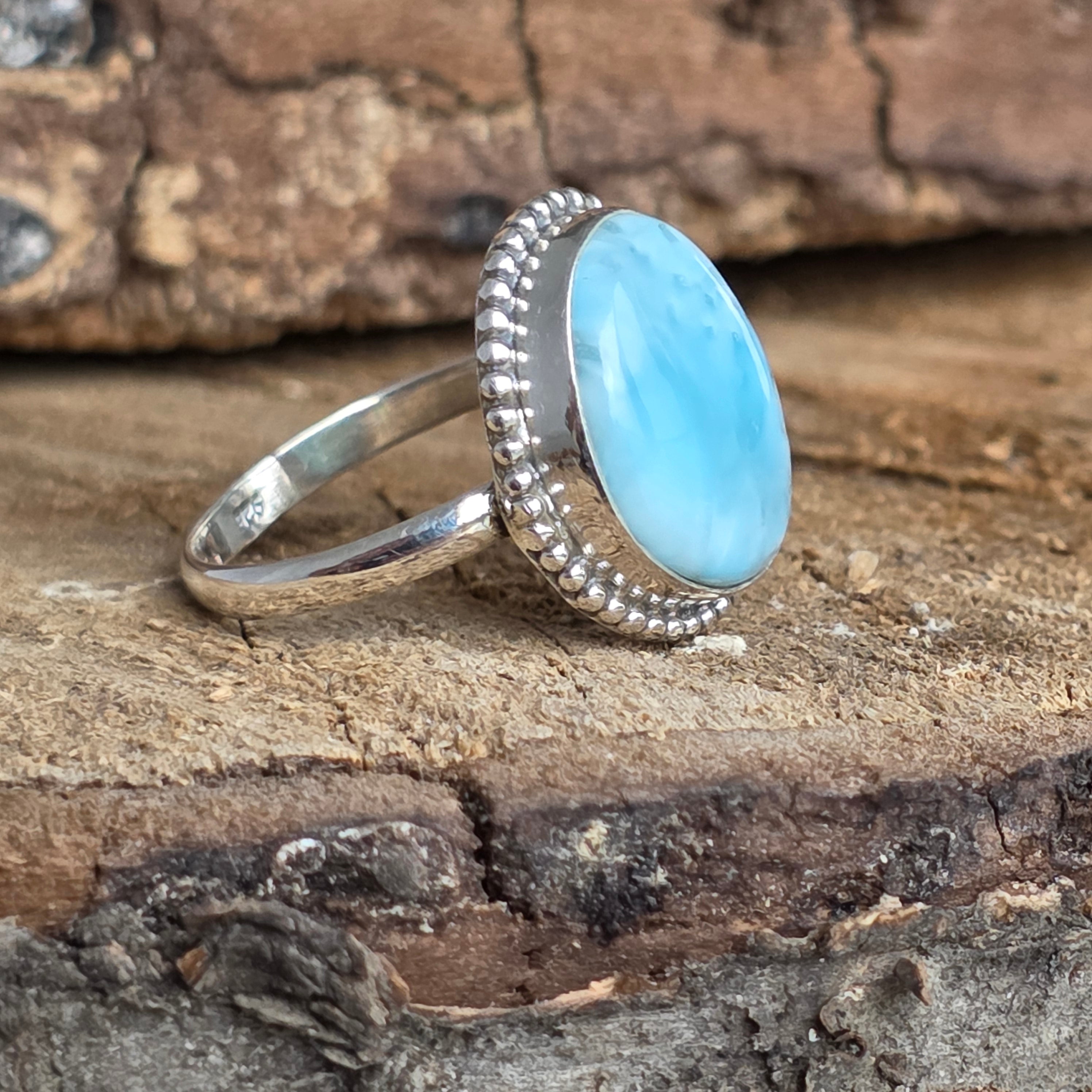 Un inel elegant din argint 925, cu larimar natural în nuanțe de albastru deschis, asemenea valurilor line din Caraibe. Detaliile rawa work din jurul pietrei creează un contrast subtil și rafinat, conferind bijuteriei un aer clasic și prețios.
