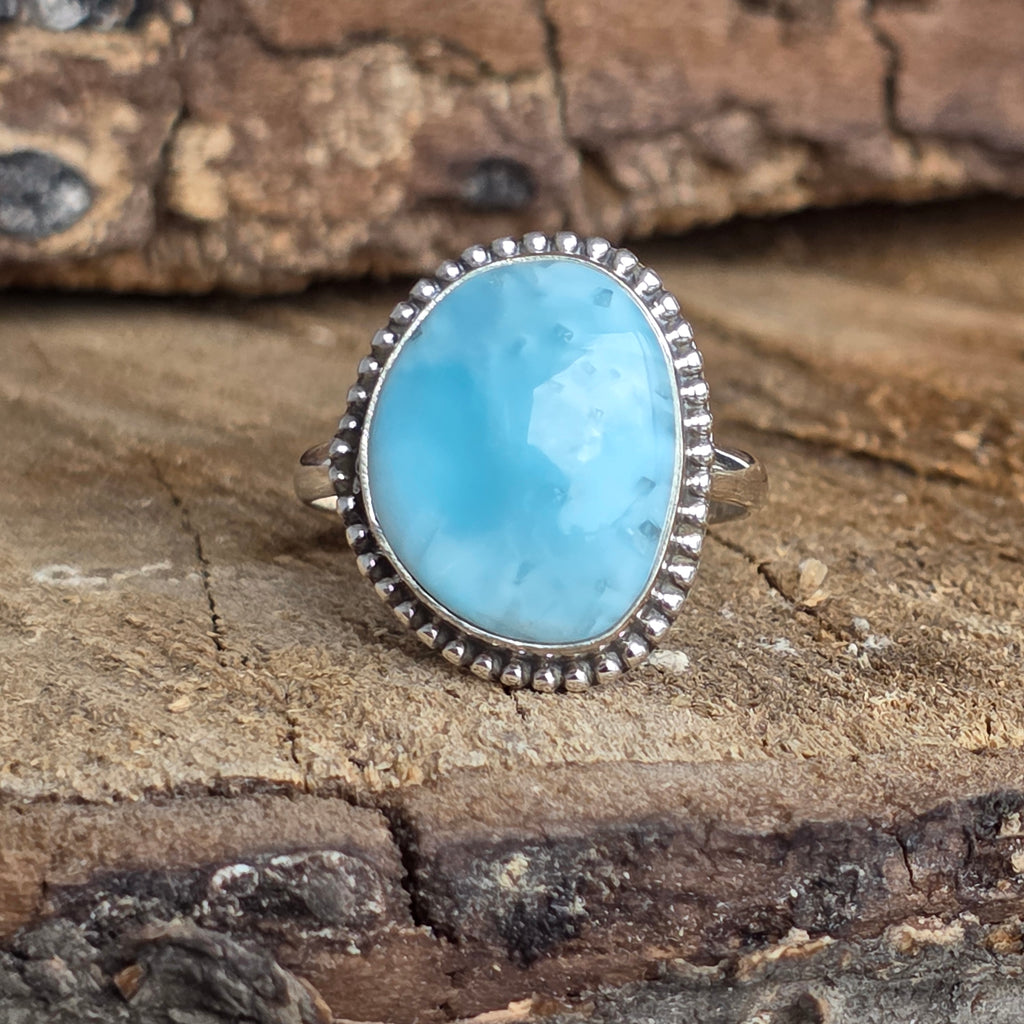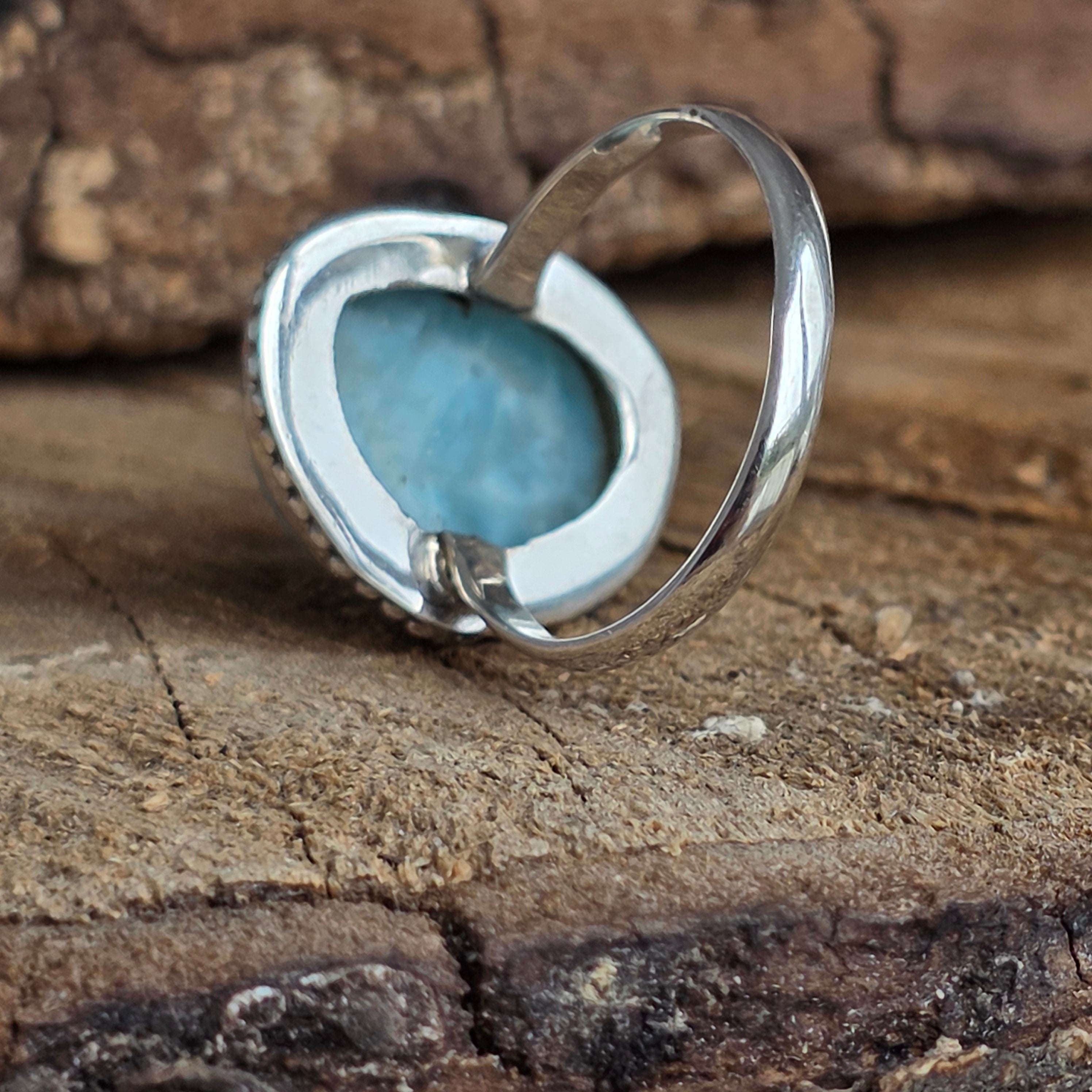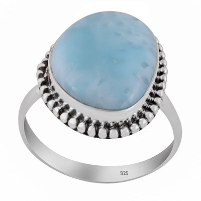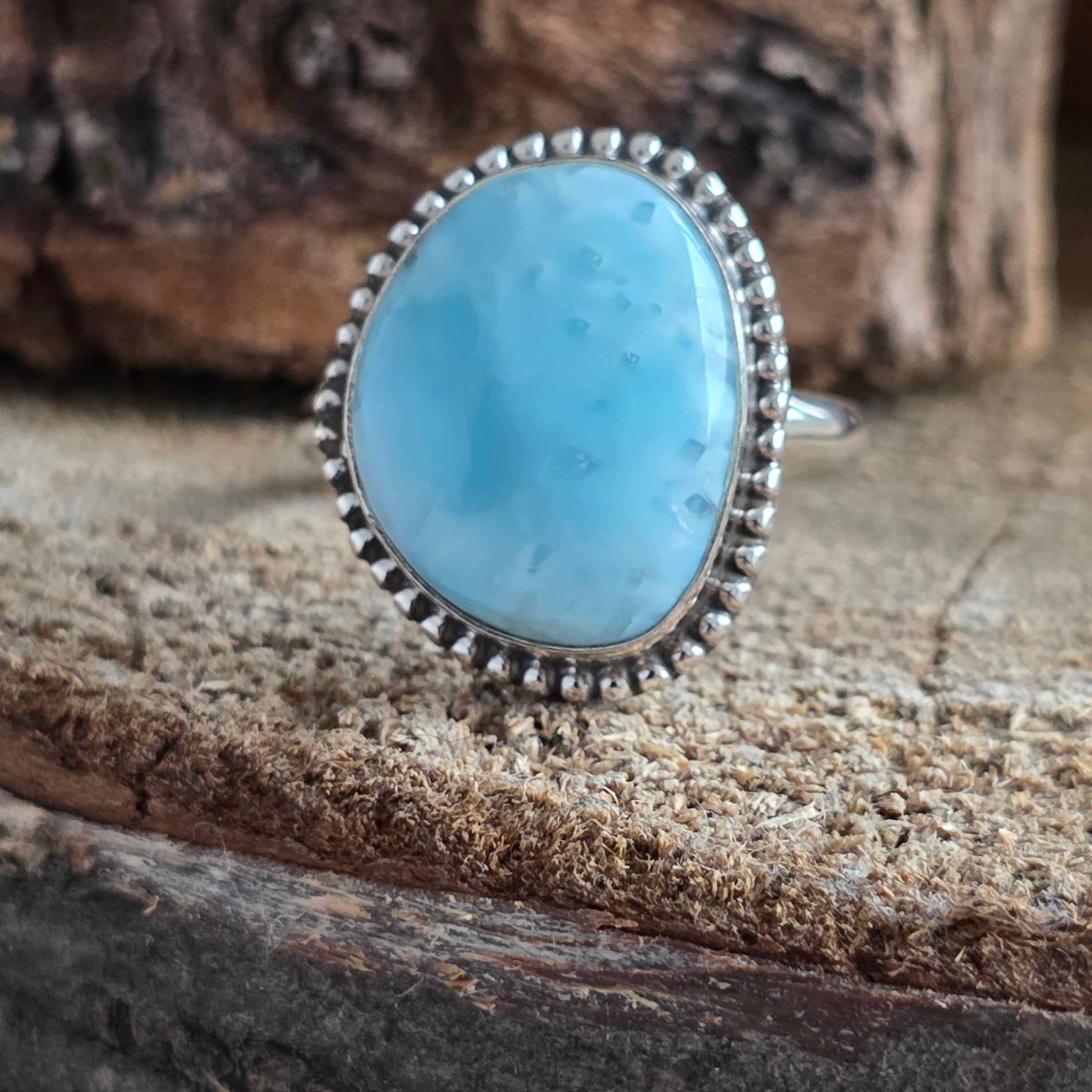 Un inel elegant din argint 925, cu larimar natural în nuanțe de albastru deschis, asemenea valurilor line din Caraibe. Detaliile rawa work din jurul pietrei creează un contrast subtil și rafinat, conferind bijuteriei un aer clasic și prețios.