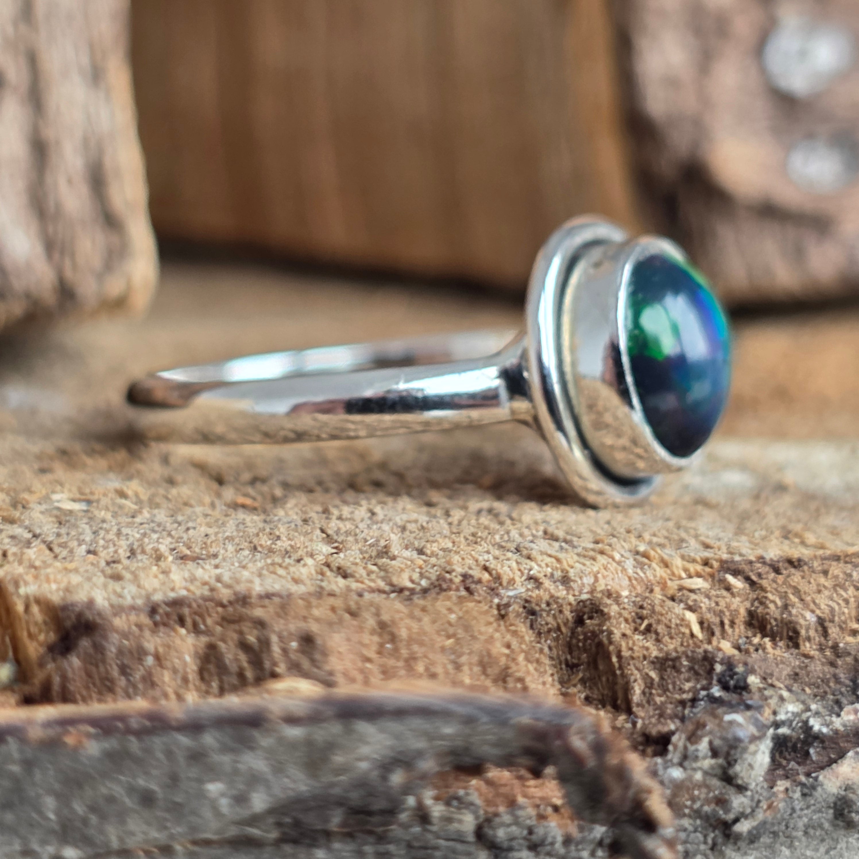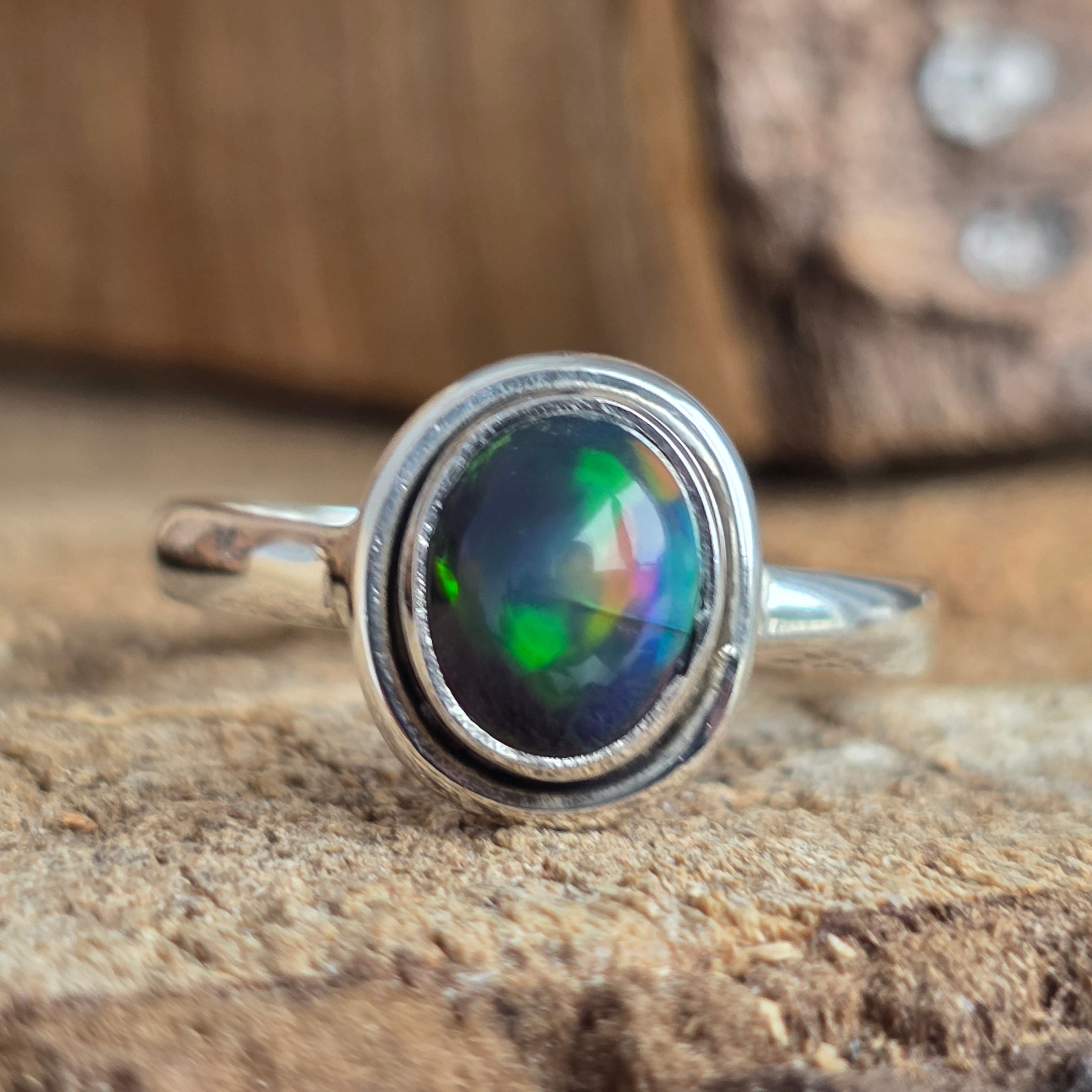 Un inel elegant și rafinat, realizat din argint 925, cu o piatră naturală de opal etiopian, cunoscută pentru reflexele sale irizante în nuanțe de verde, roșu și albastru. Designul minimalist plain wire setting permite pietrei să fie în centrul atenției, captând lumina din orice unghi.