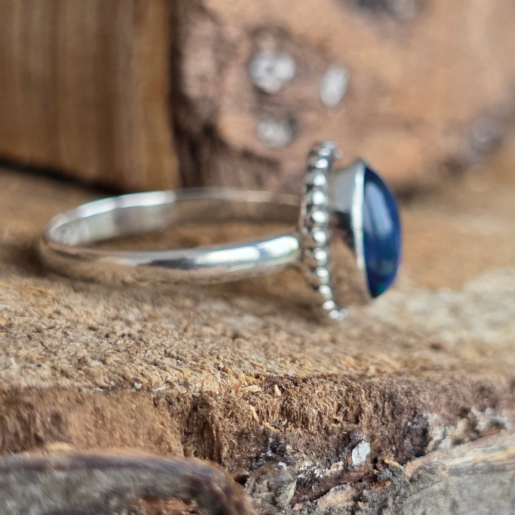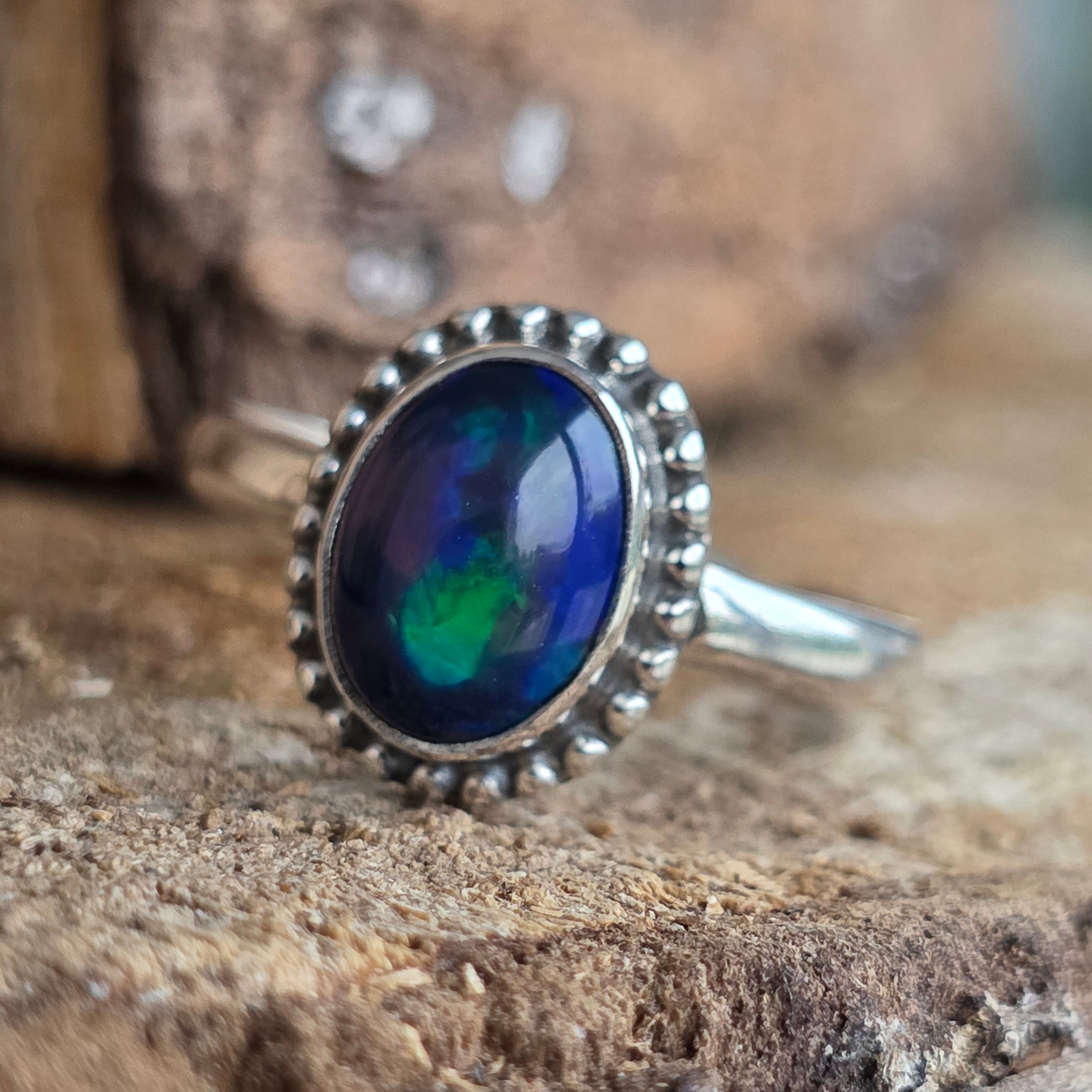 Un inel elegant și rafinat, realizat din argint 925, cu o piatră naturală de opal etiopian, cunoscută pentru reflexele sale irizante în nuanțe de verde, roșu și albastru. Designul minimalist plain wire setting permite pietrei să fie în centrul atenției, captând lumina din orice unghi.