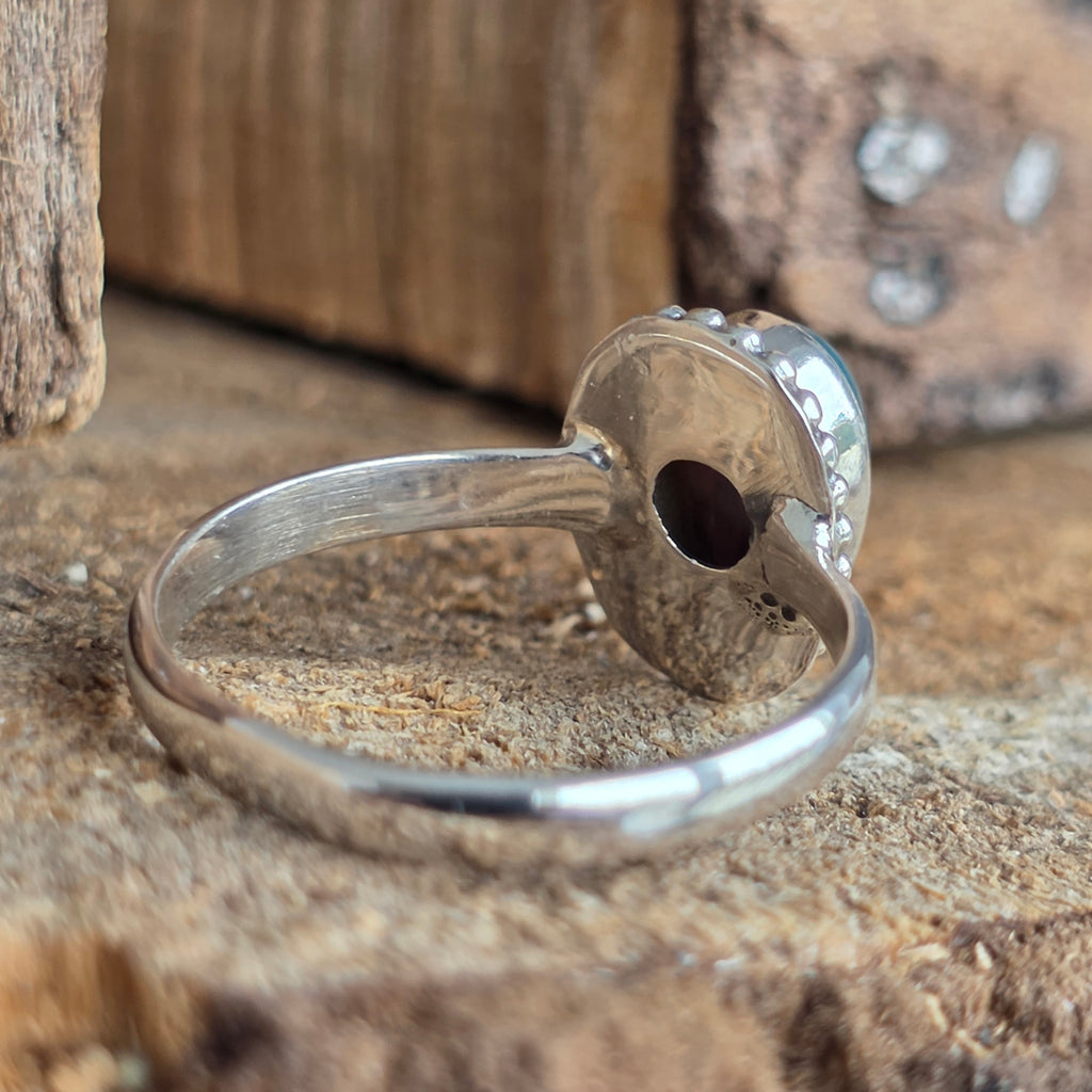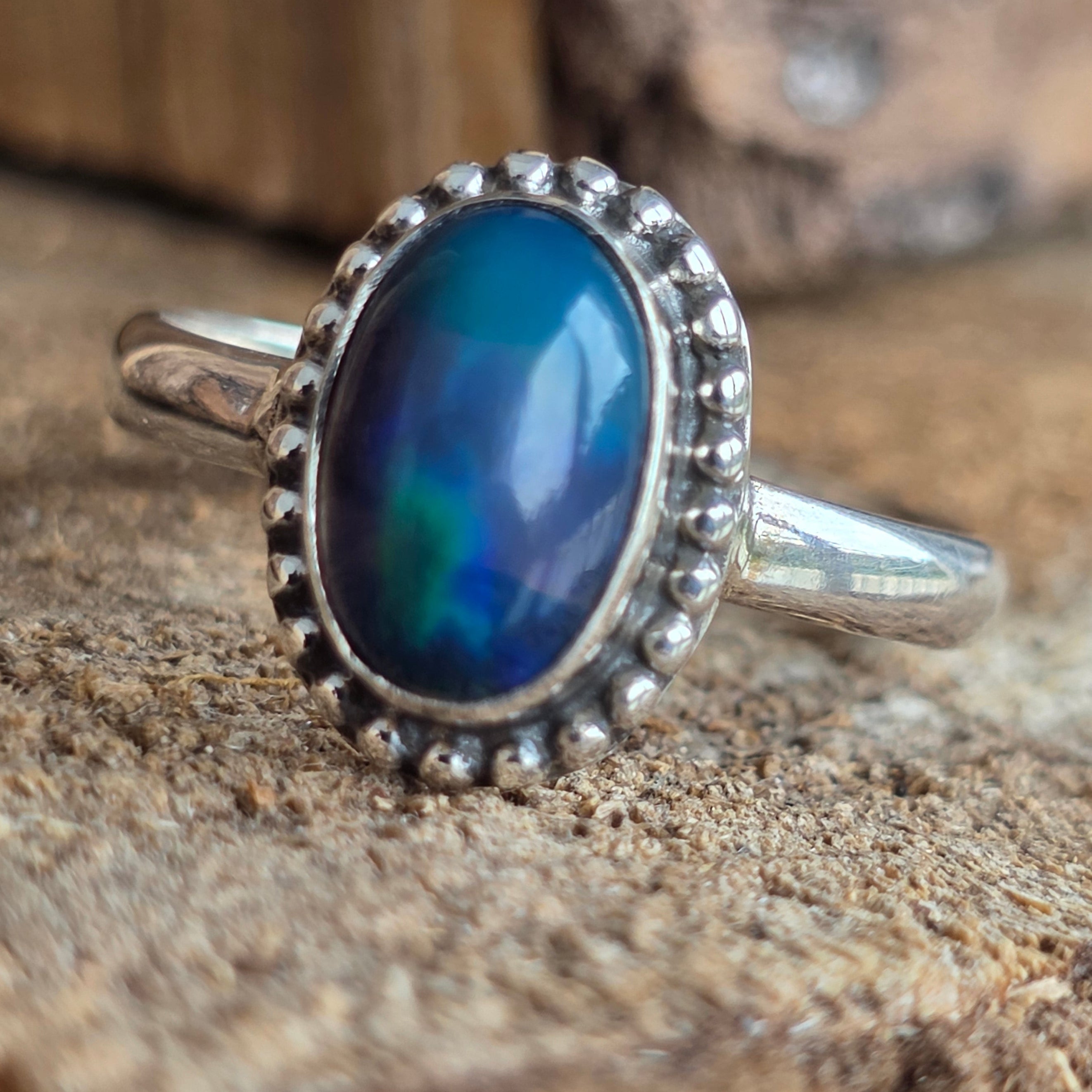 Un inel elegant și rafinat, realizat din argint 925, cu o piatră naturală de opal etiopian, cunoscută pentru reflexele sale irizante în nuanțe de verde, roșu și albastru. Designul minimalist plain wire setting permite pietrei să fie în centrul atenției, captând lumina din orice unghi.