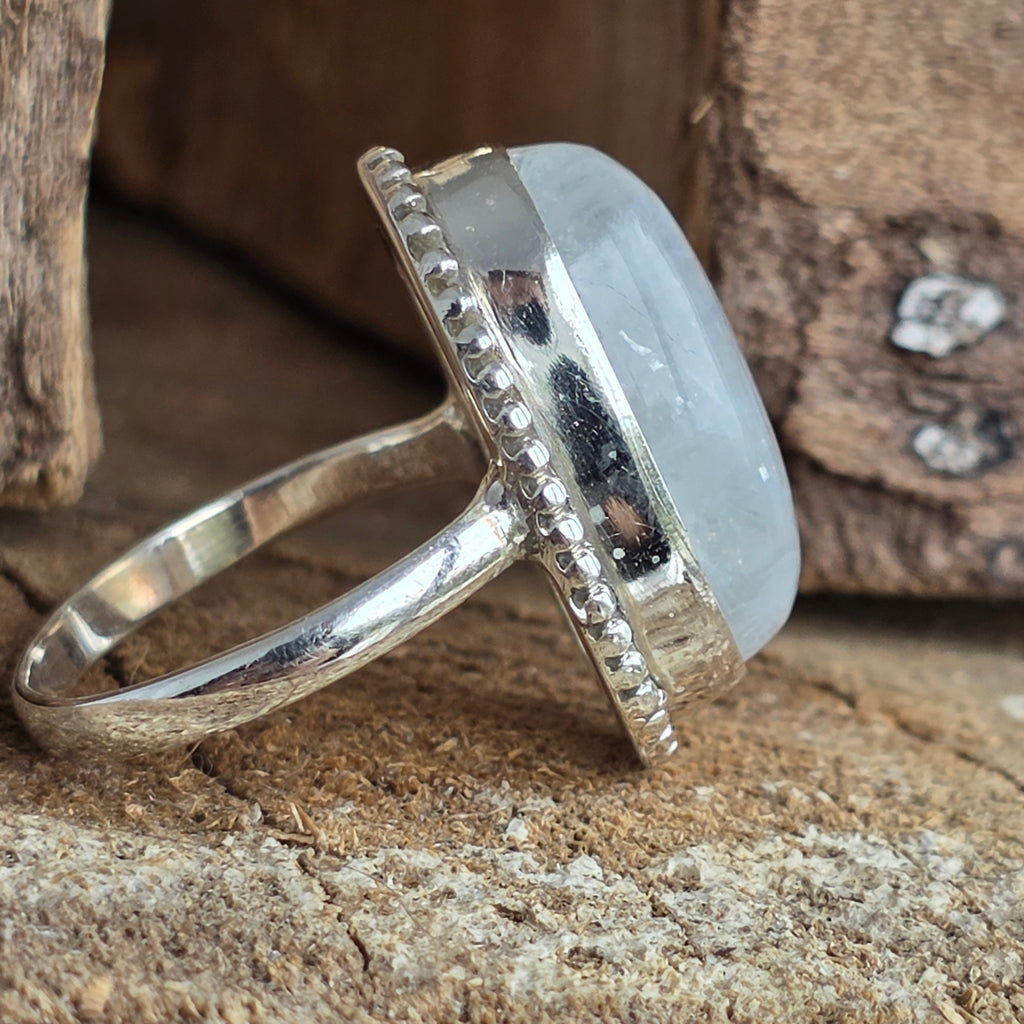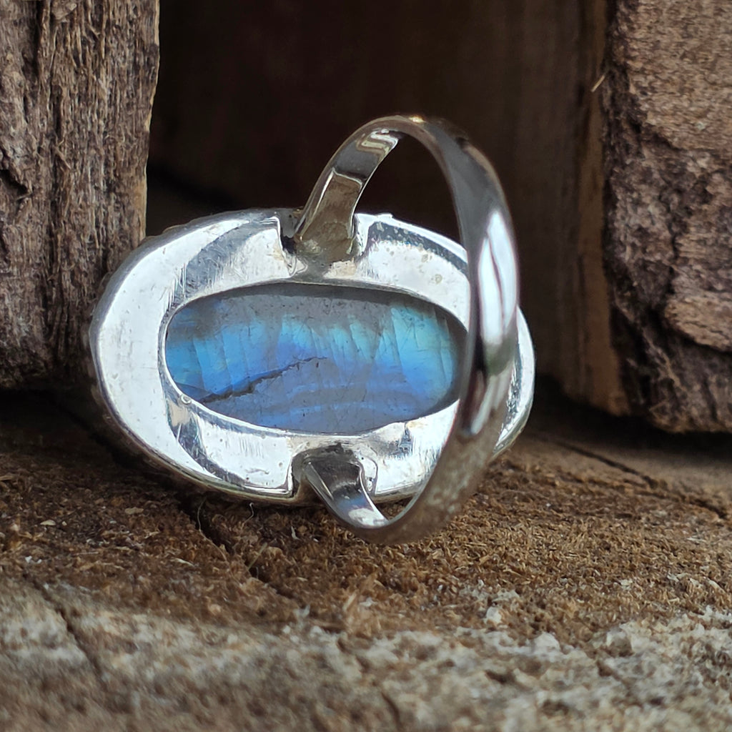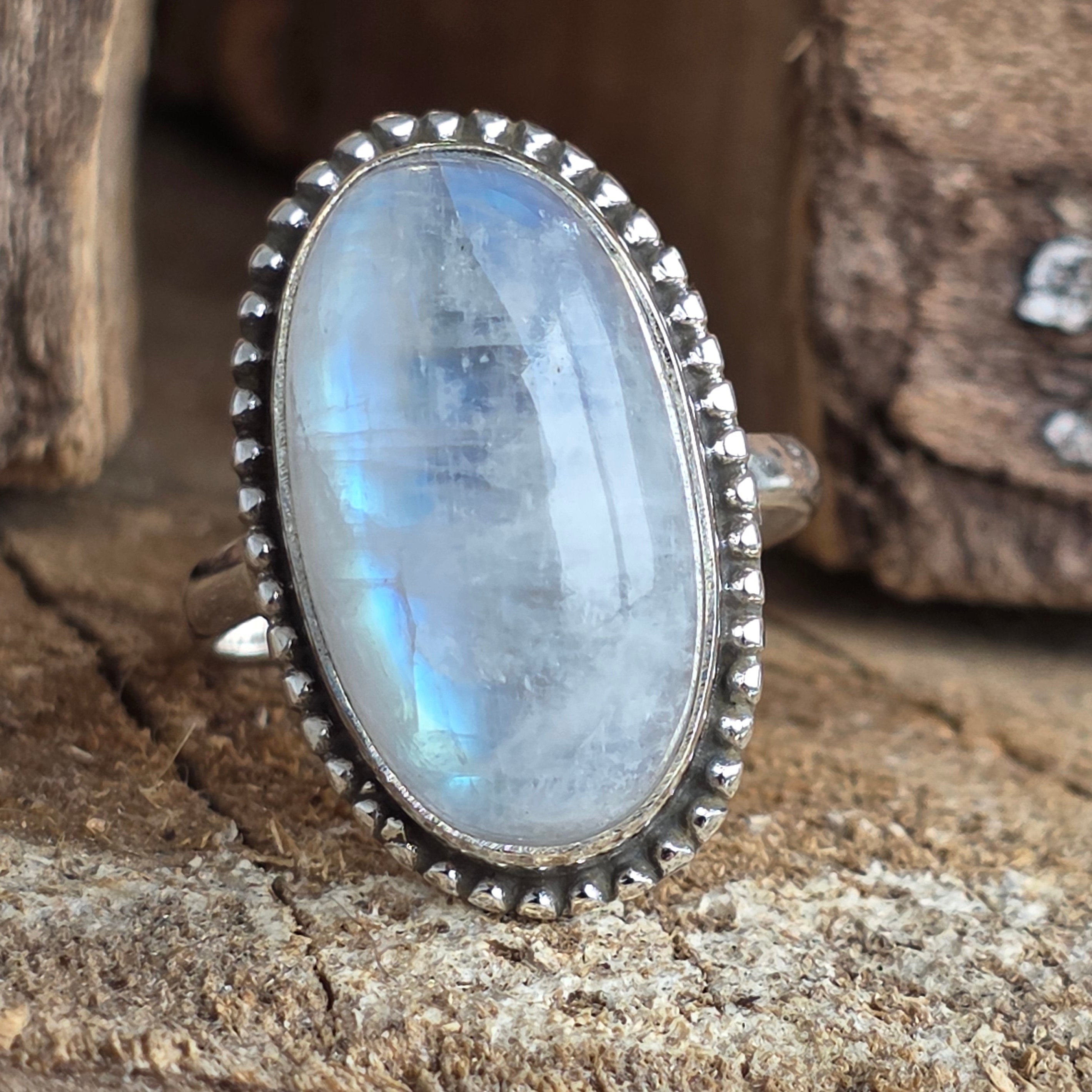 Un inel rafinat din argint 925, cu piatră lunii curcubeu naturală – o bijuterie ce emană lumină, calm și feminitate. Reflexele albastre iridescente par să plutească sub suprafața pietrei, aducând un efect vizual hipnotizant.