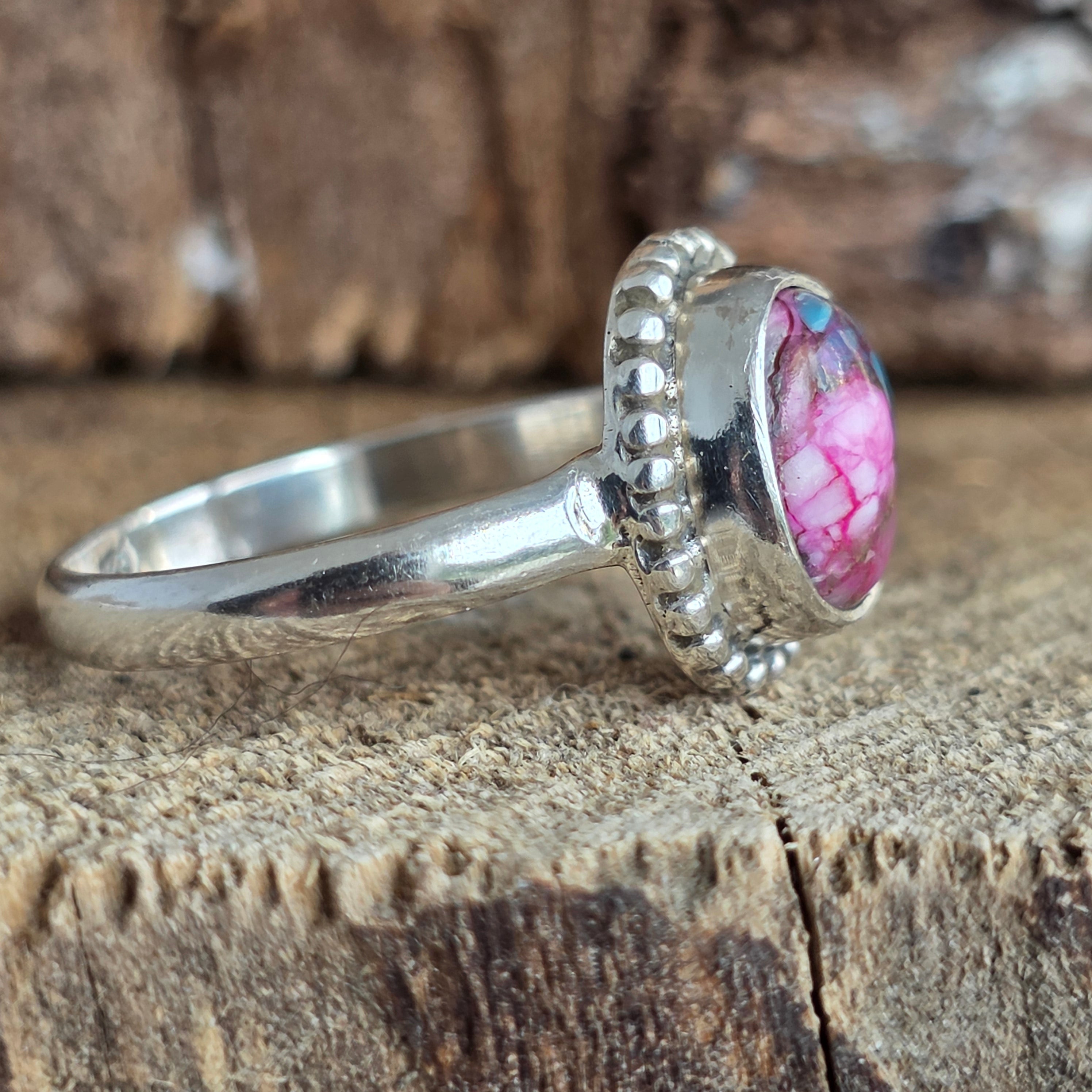 Un inel delicat, dar cu o prezență vibrantă – lucrat manual din argint 925 și înnobilat cu o piatră Pink Dahlia Copper Turquoise, ce îmbină nuanțe vii de fucsia, roz intens, albastru turcoaz și reflexe calde de cupru.