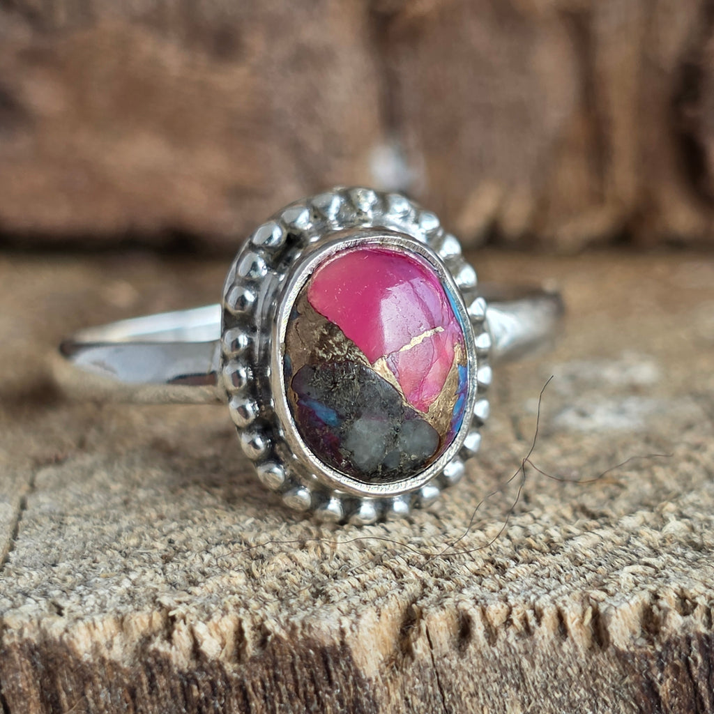 Un inel delicat, dar cu o prezență vibrantă – lucrat manual din argint 925 și înnobilat cu o piatră Pink Dahlia Copper Turquoise, ce îmbină nuanțe vii de fucsia, roz intens, albastru turcoaz și reflexe calde de cupru.