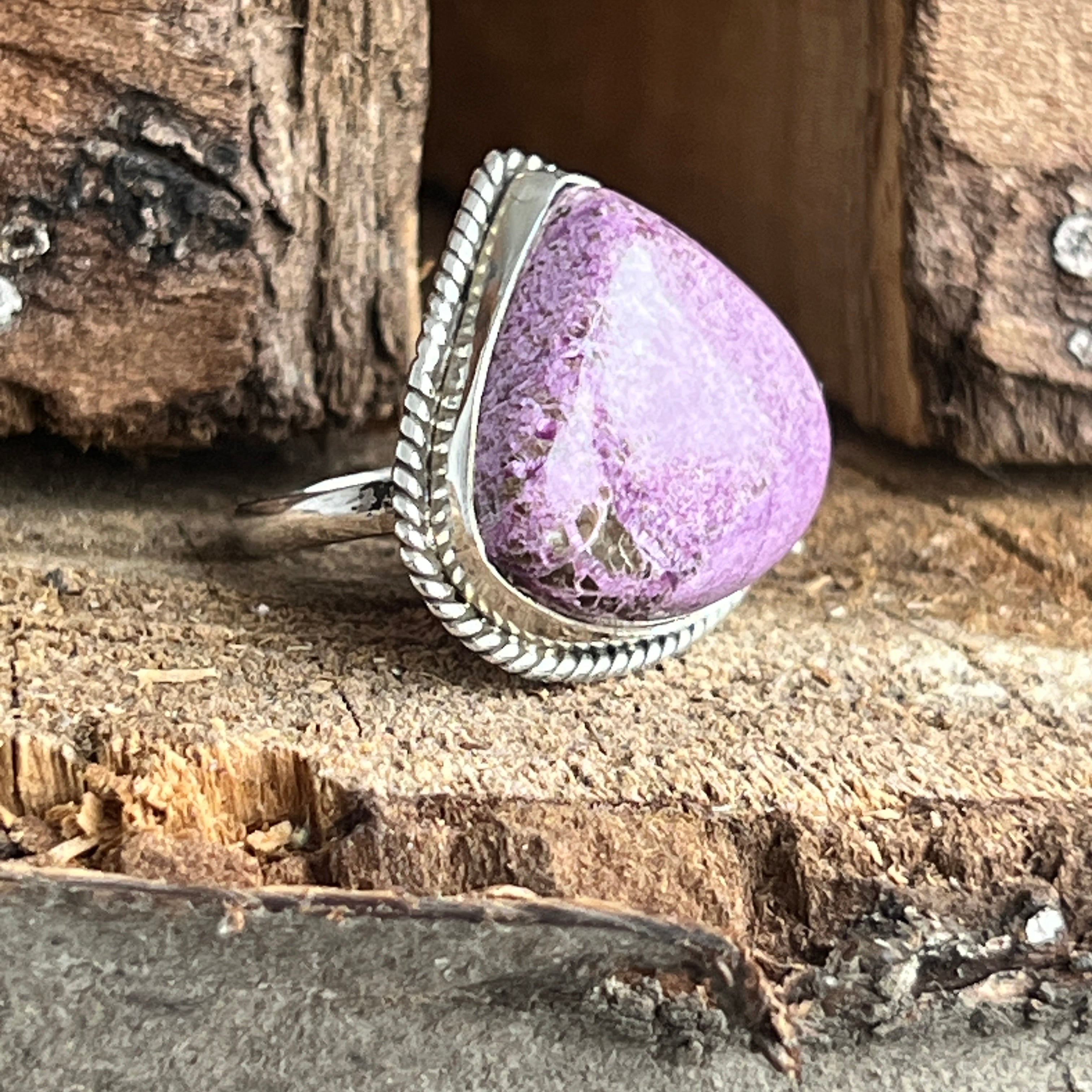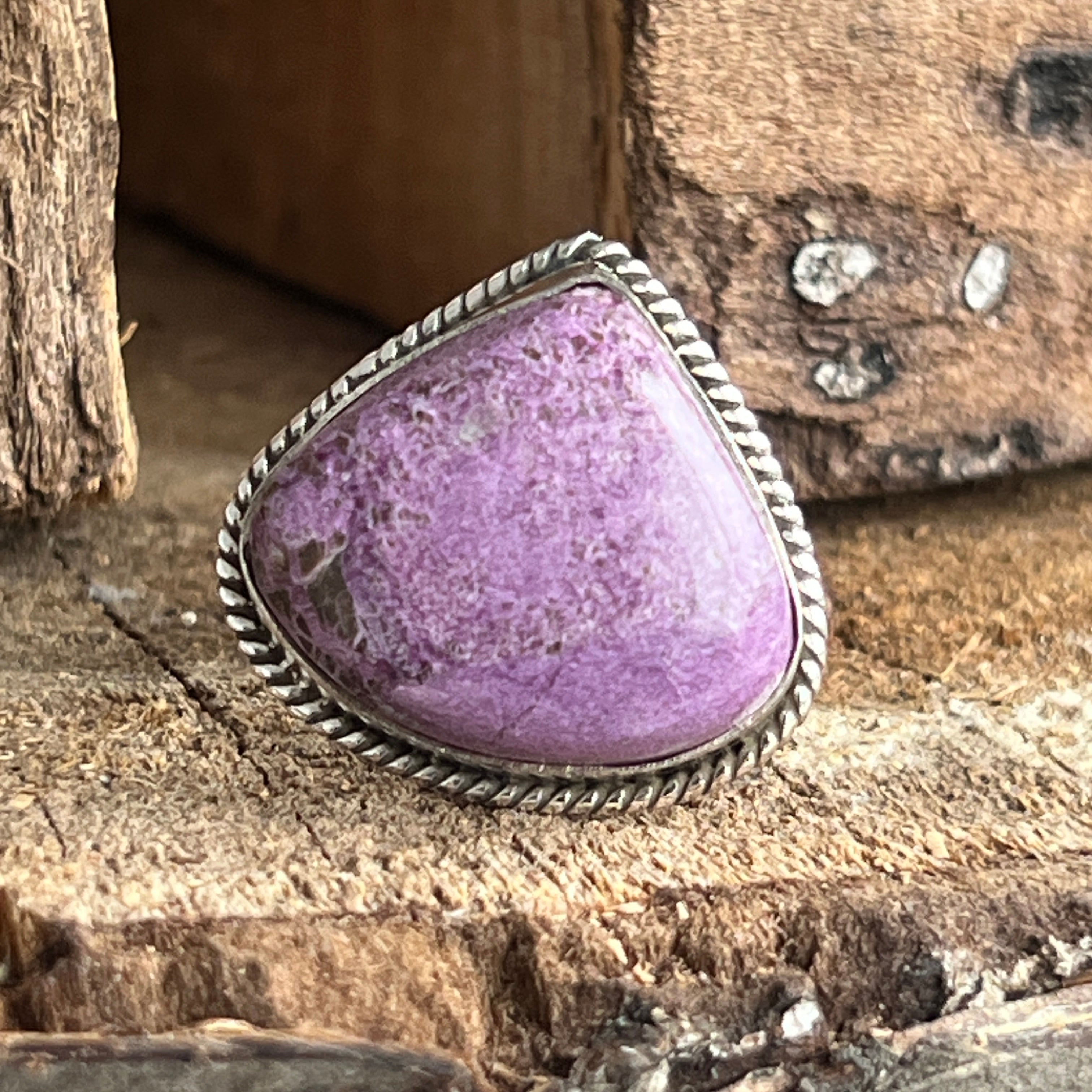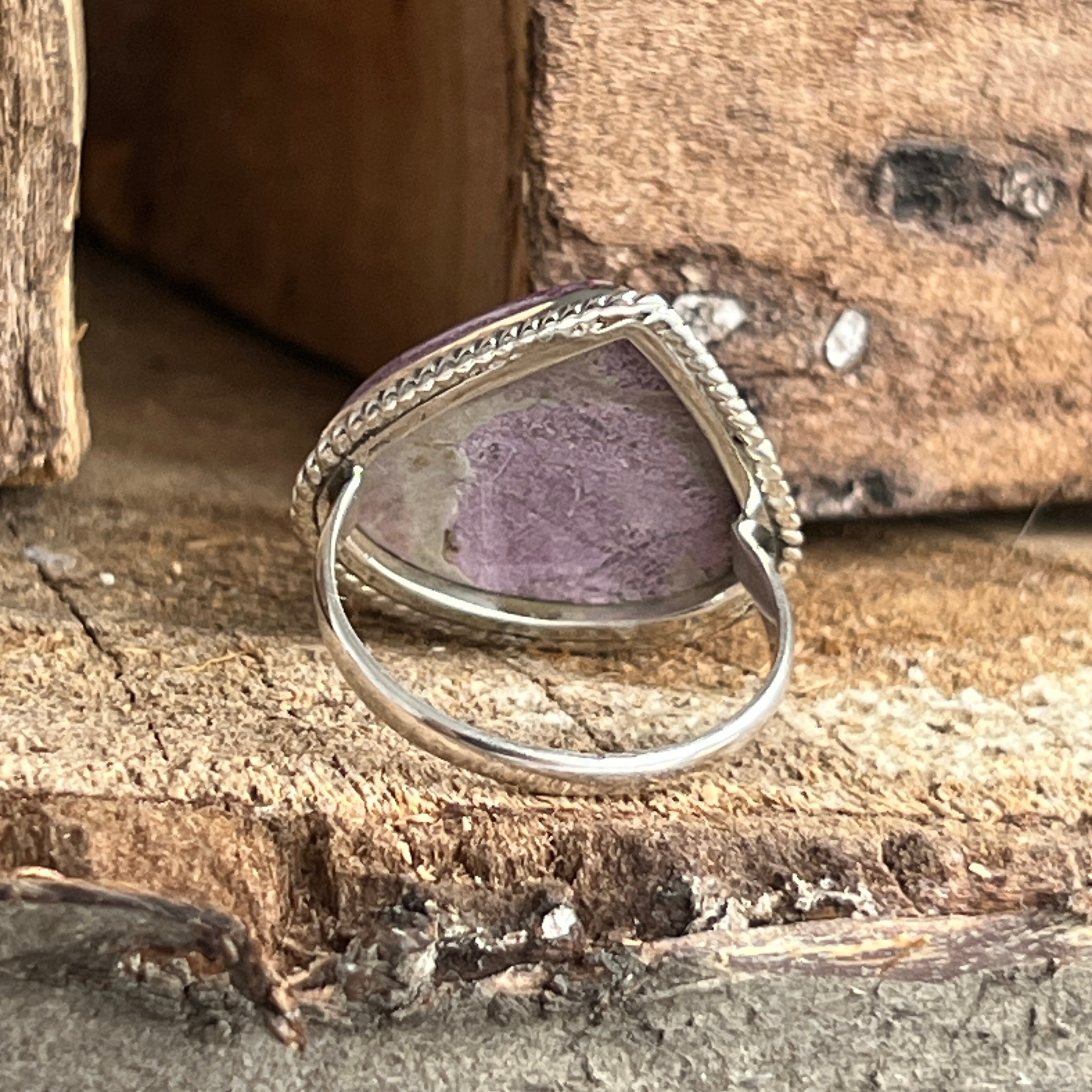 Un inel elegant și expresiv, realizat manual din argint 925 și decorat cu o piatră naturală de Purpurit, cu nuanțe de violet intens și reflexe mate specifice acestei pietre rare. Designul twisted wire încadrează piatra cu finețe, punând în valoare textura sa brută și autentică.