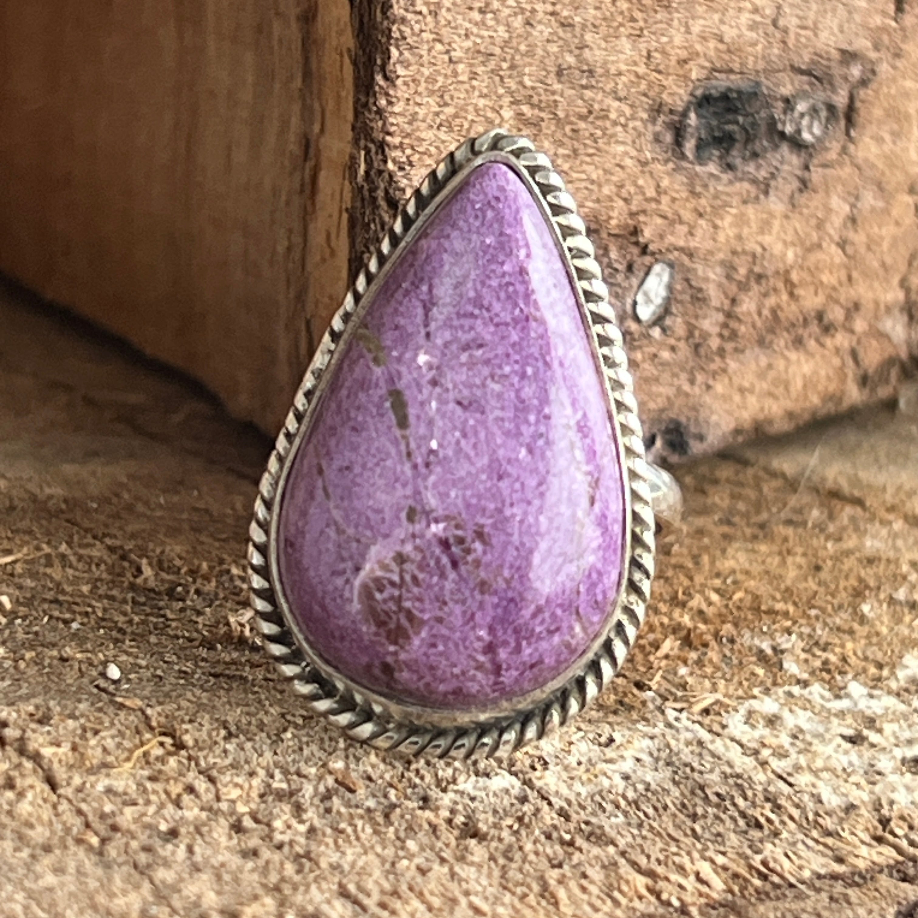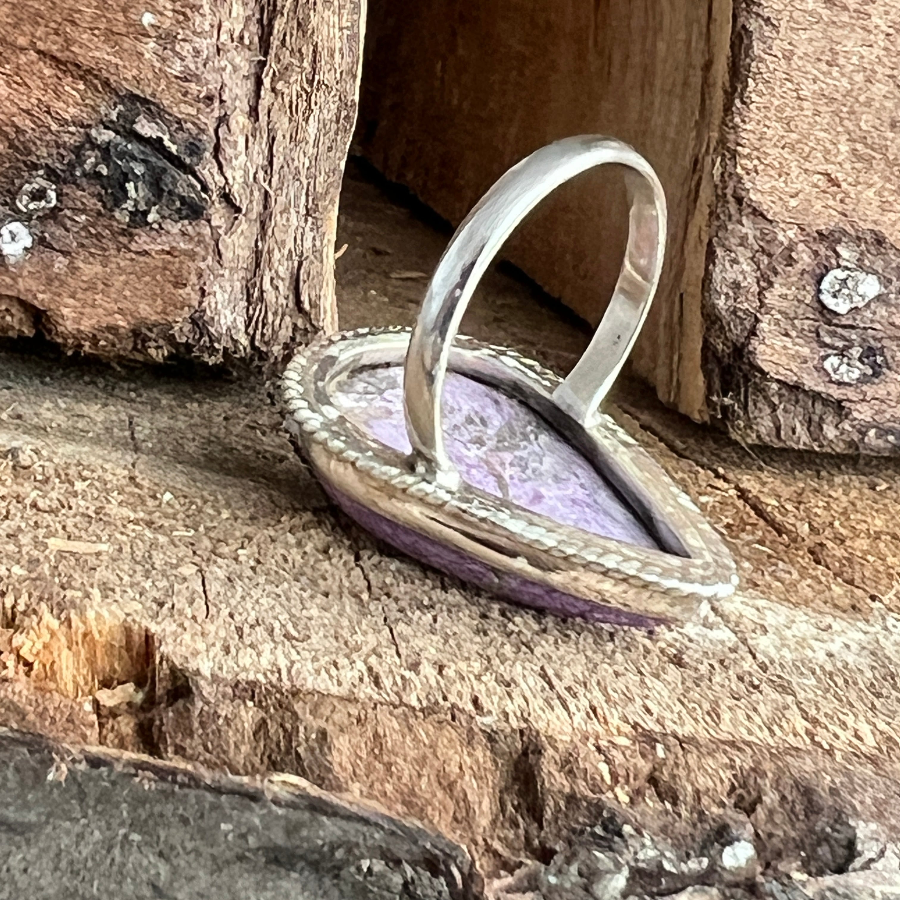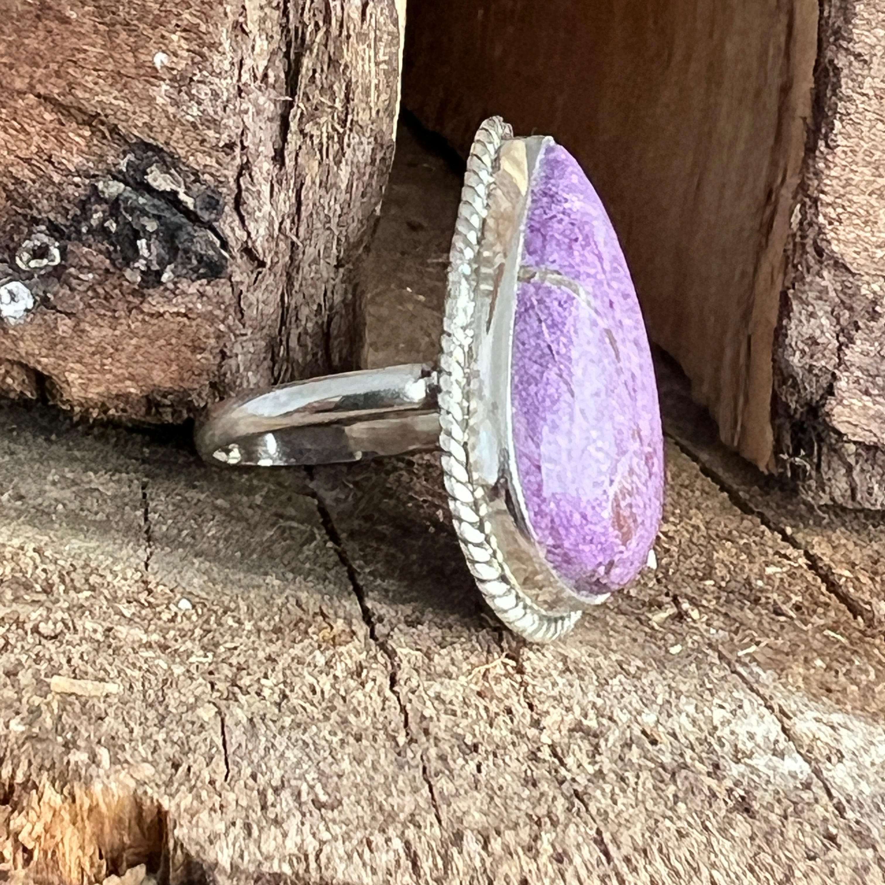 Un inel elegant și expresiv, realizat manual din argint 925 și decorat cu o piatră naturală de Purpurit, cu nuanțe de violet intens și reflexe mate specifice acestei pietre rare. Designul twisted wire încadrează piatra cu finețe, punând în valoare textura sa brută și autentică.