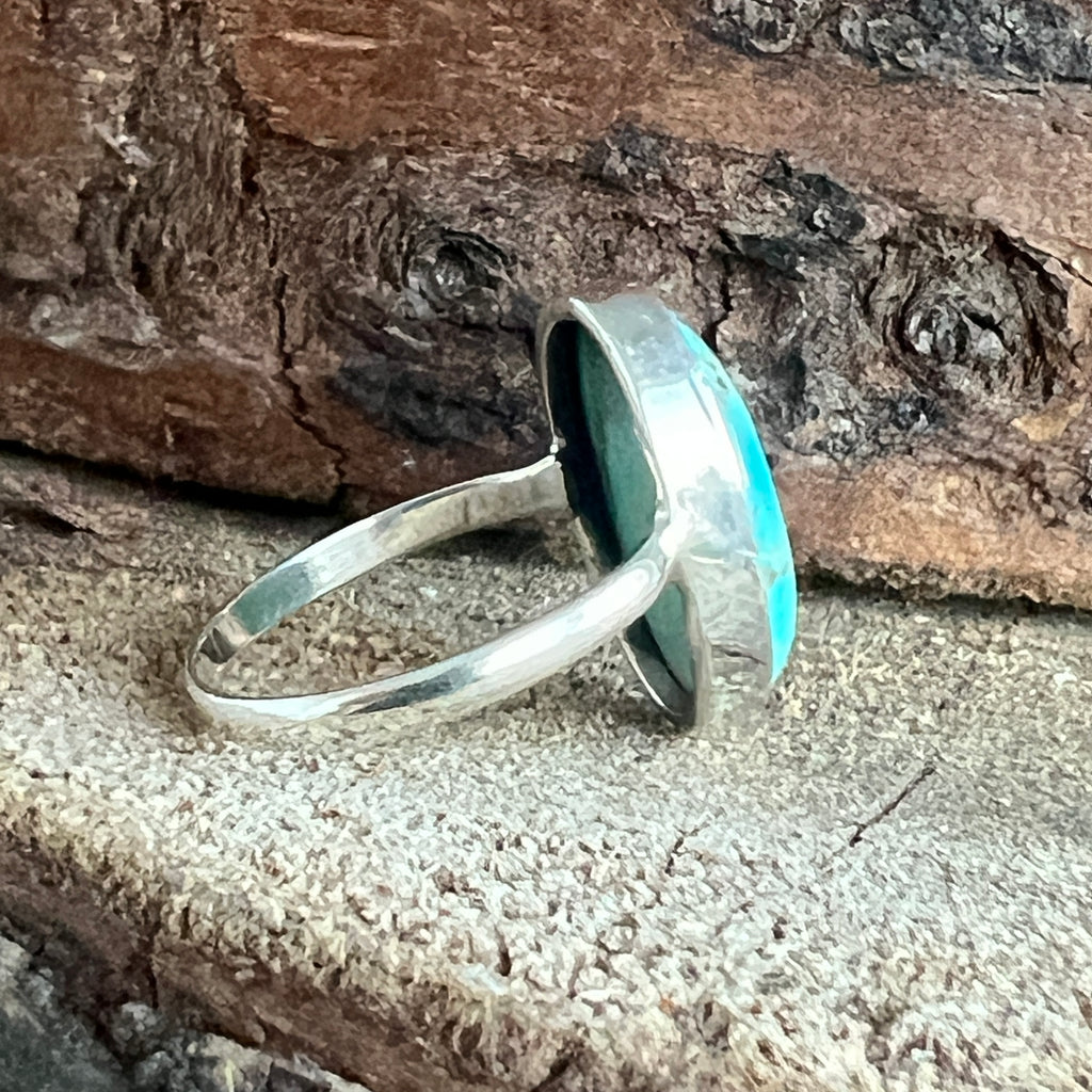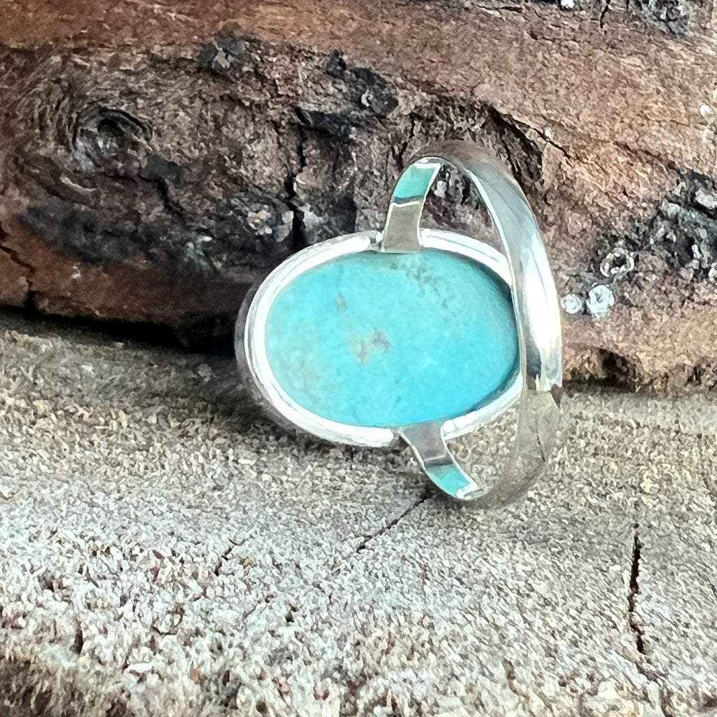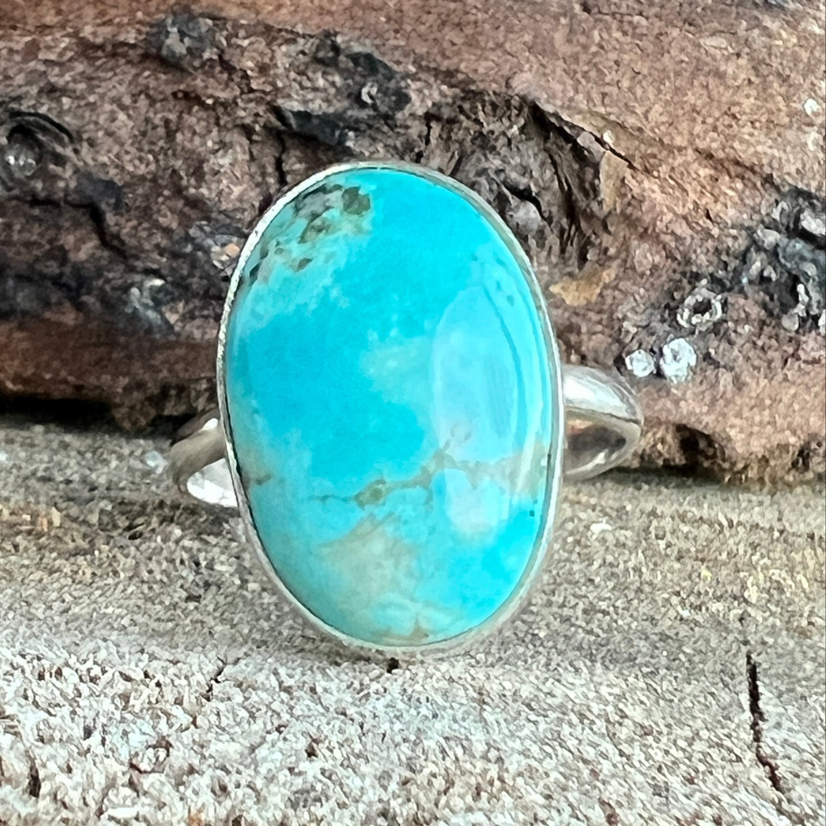 Un inel elegant din argint 925, cu o piatră naturală de turcoaz cu nuanțe variind între albastru cer și verde acvatic, străbătută de vene fine maronii și gri. Designul minimalist tip plain collet lasă întreaga atenție pietrei, punând în valoare frumusețea ei organică și textura autentică.