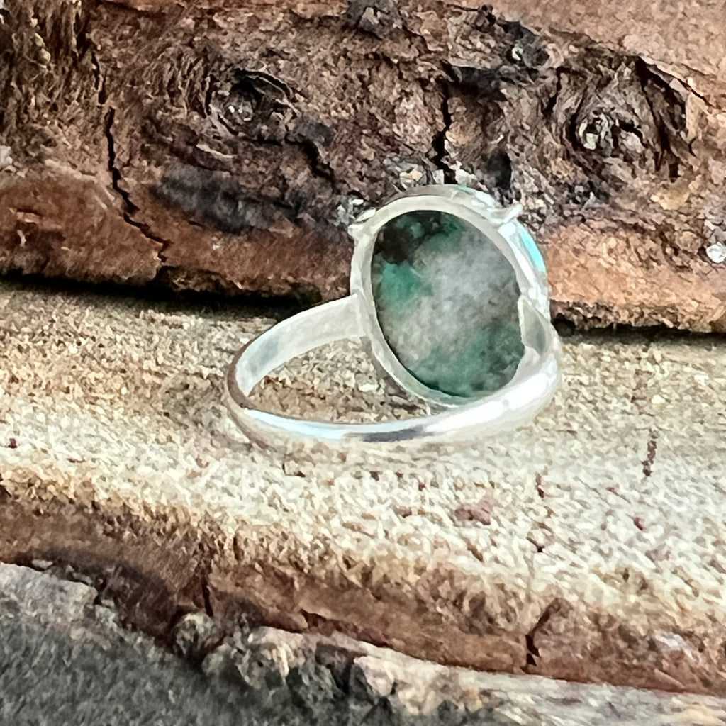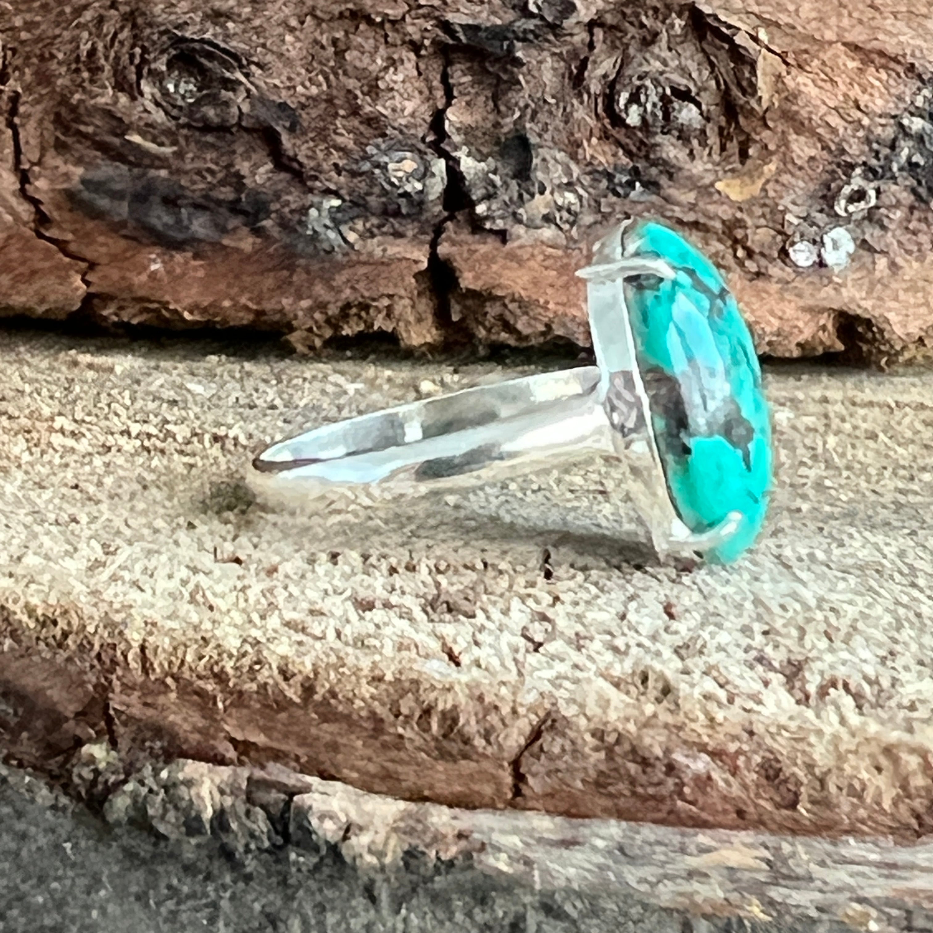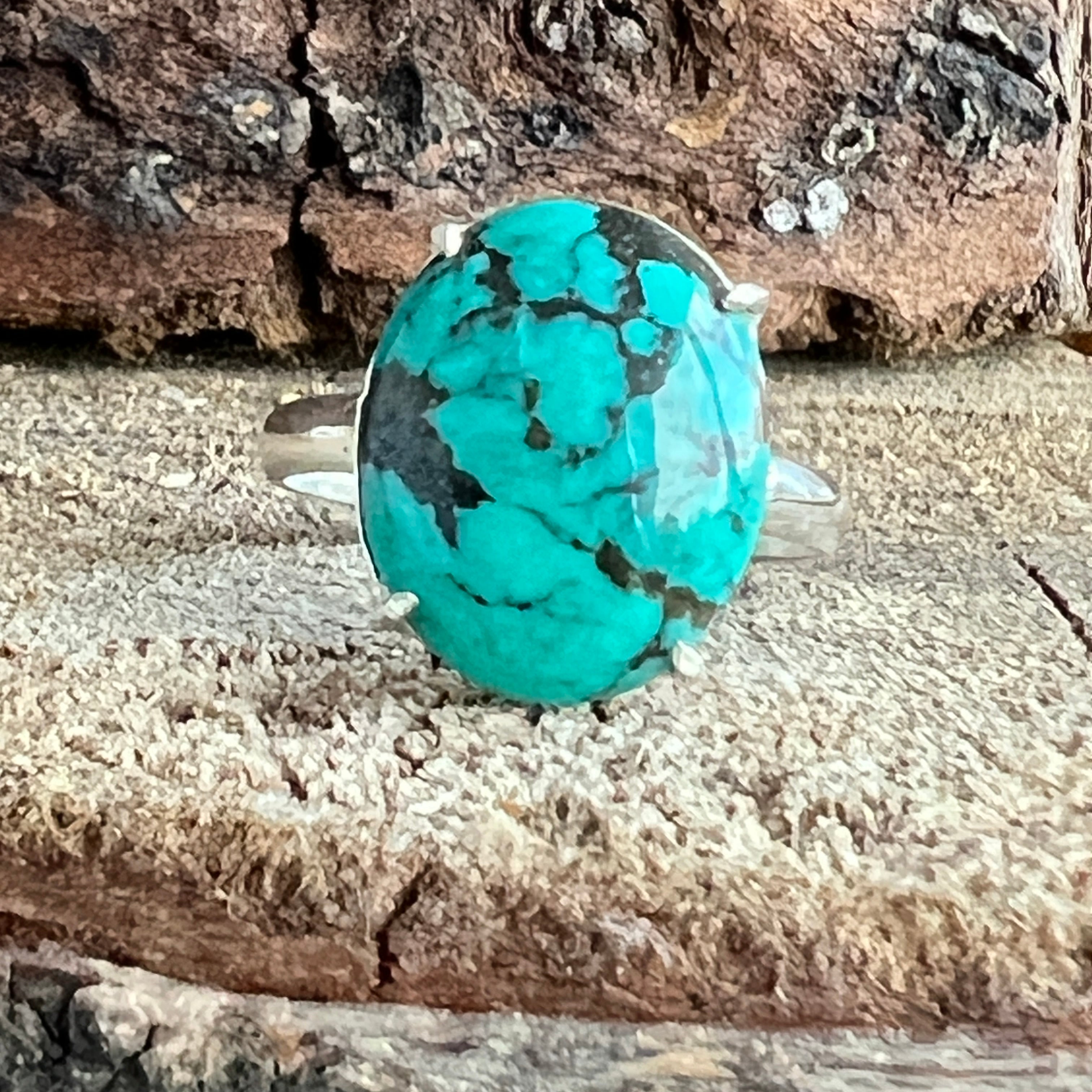Un inel elegant din argint 925, cu o piatră naturală de turcoaz cu nuanțe variind între albastru cer și verde acvatic, străbătută de vene fine maronii și gri. Designul minimalist tip plain collet lasă întreaga atenție pietrei, punând în valoare frumusețea ei organică și textura autentică.