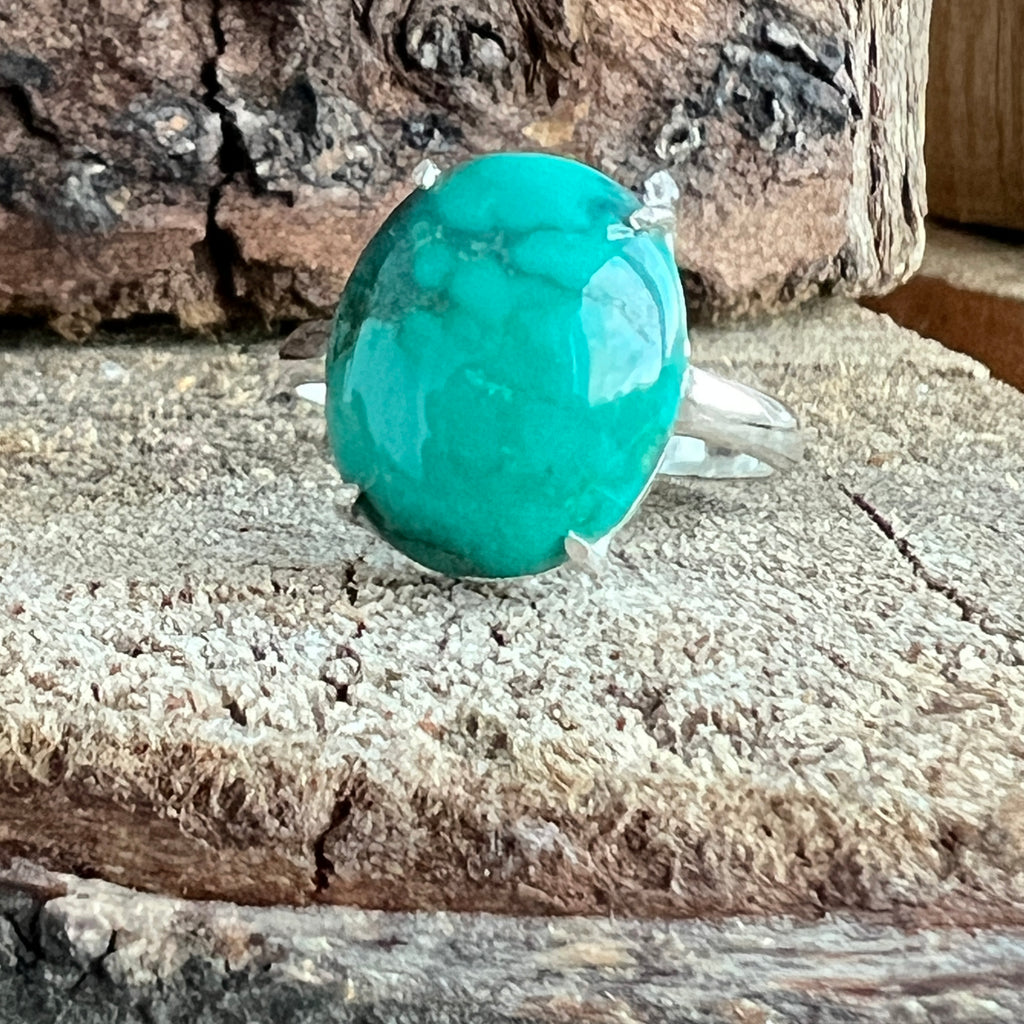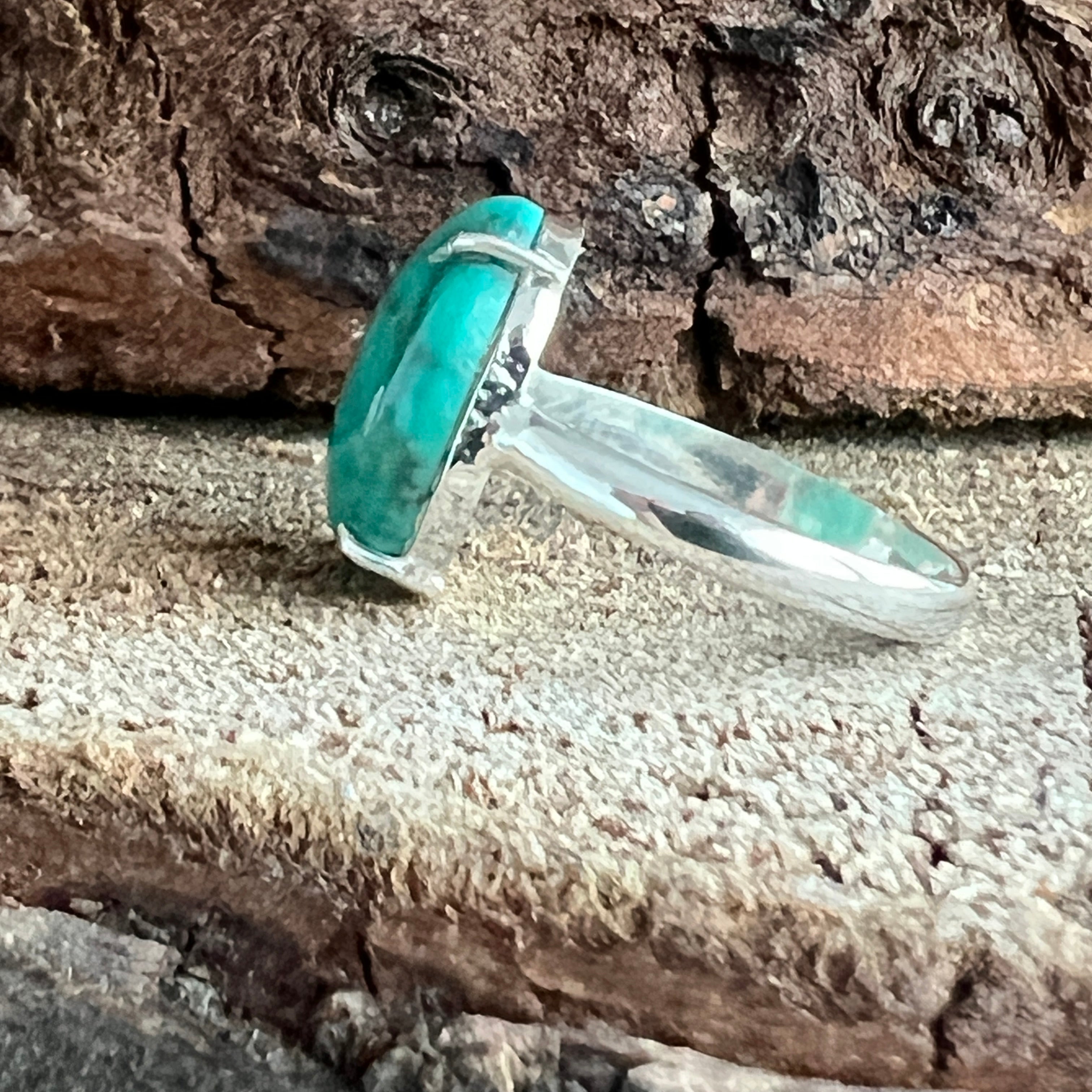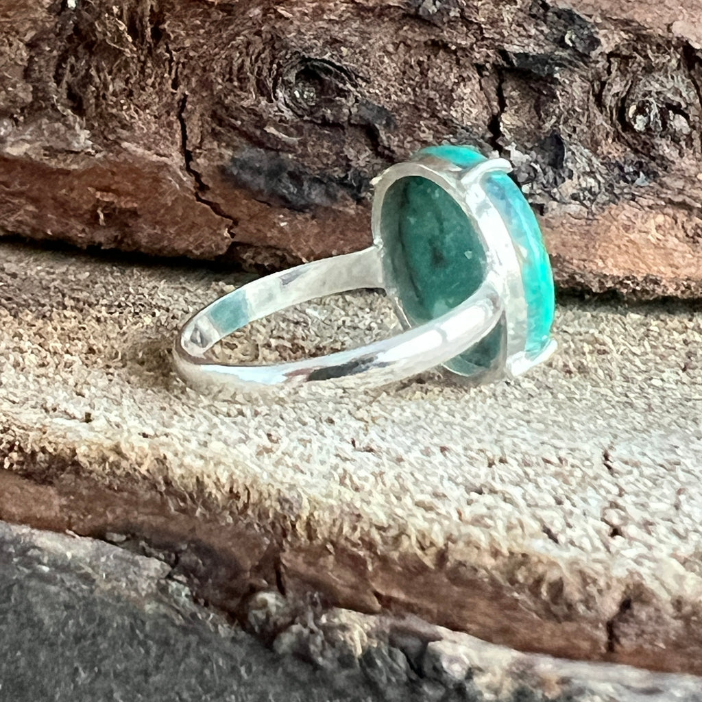 Un inel elegant din argint 925, cu o piatră naturală de turcoaz cu nuanțe variind între albastru cer și verde acvatic, străbătută de vene fine maronii și gri. Designul minimalist tip plain collet lasă întreaga atenție pietrei, punând în valoare frumusețea ei organică și textura autentică.